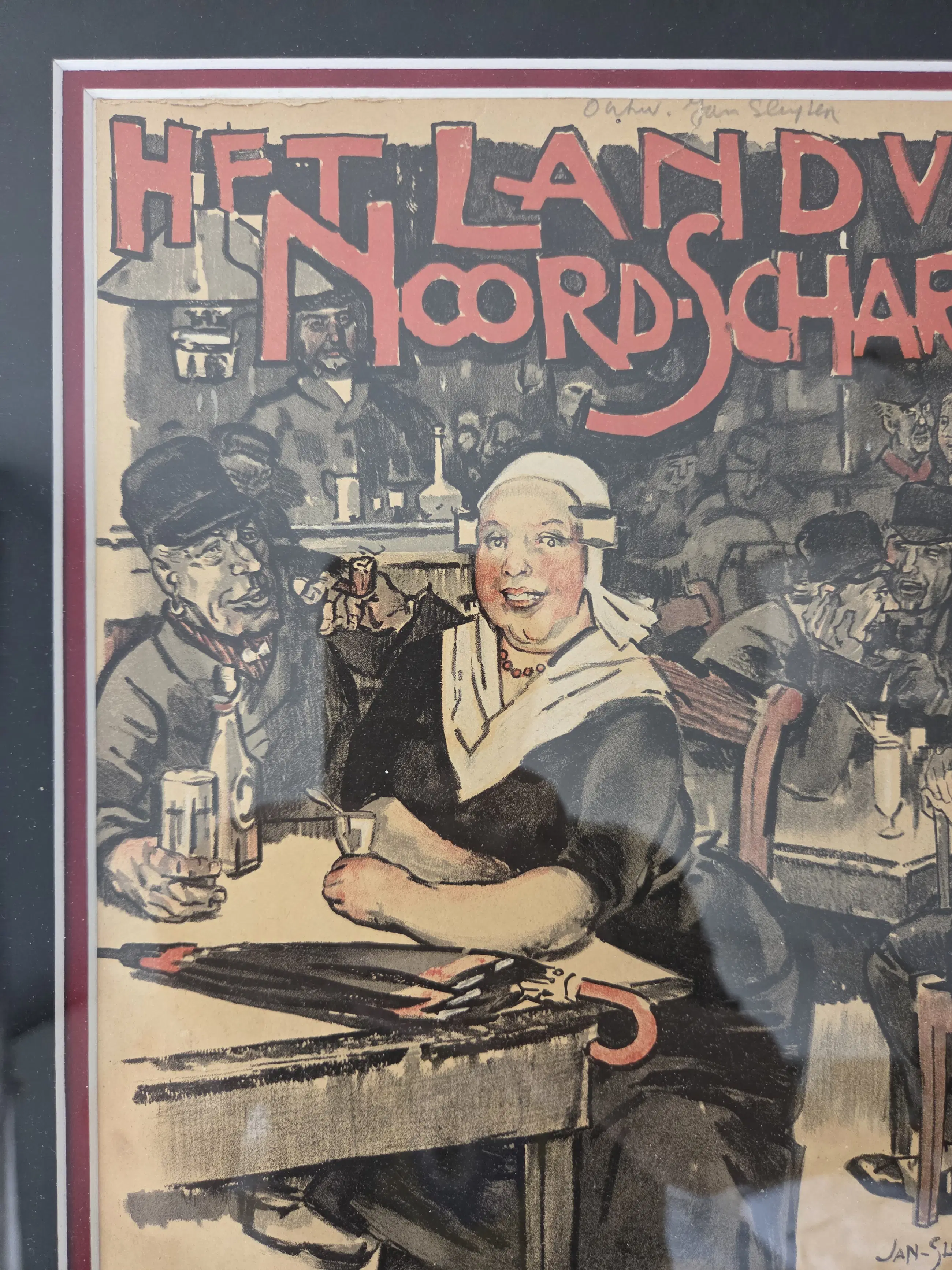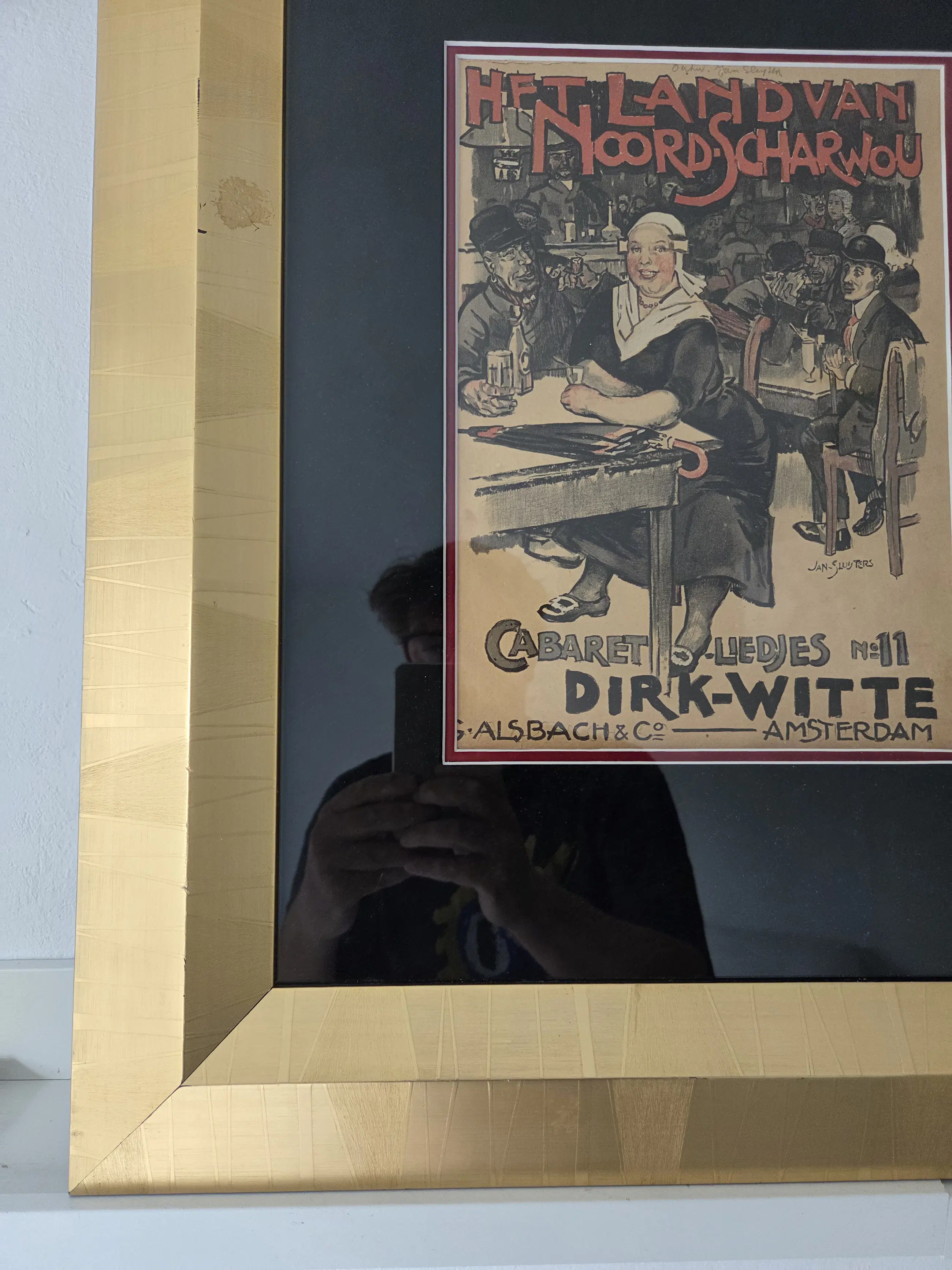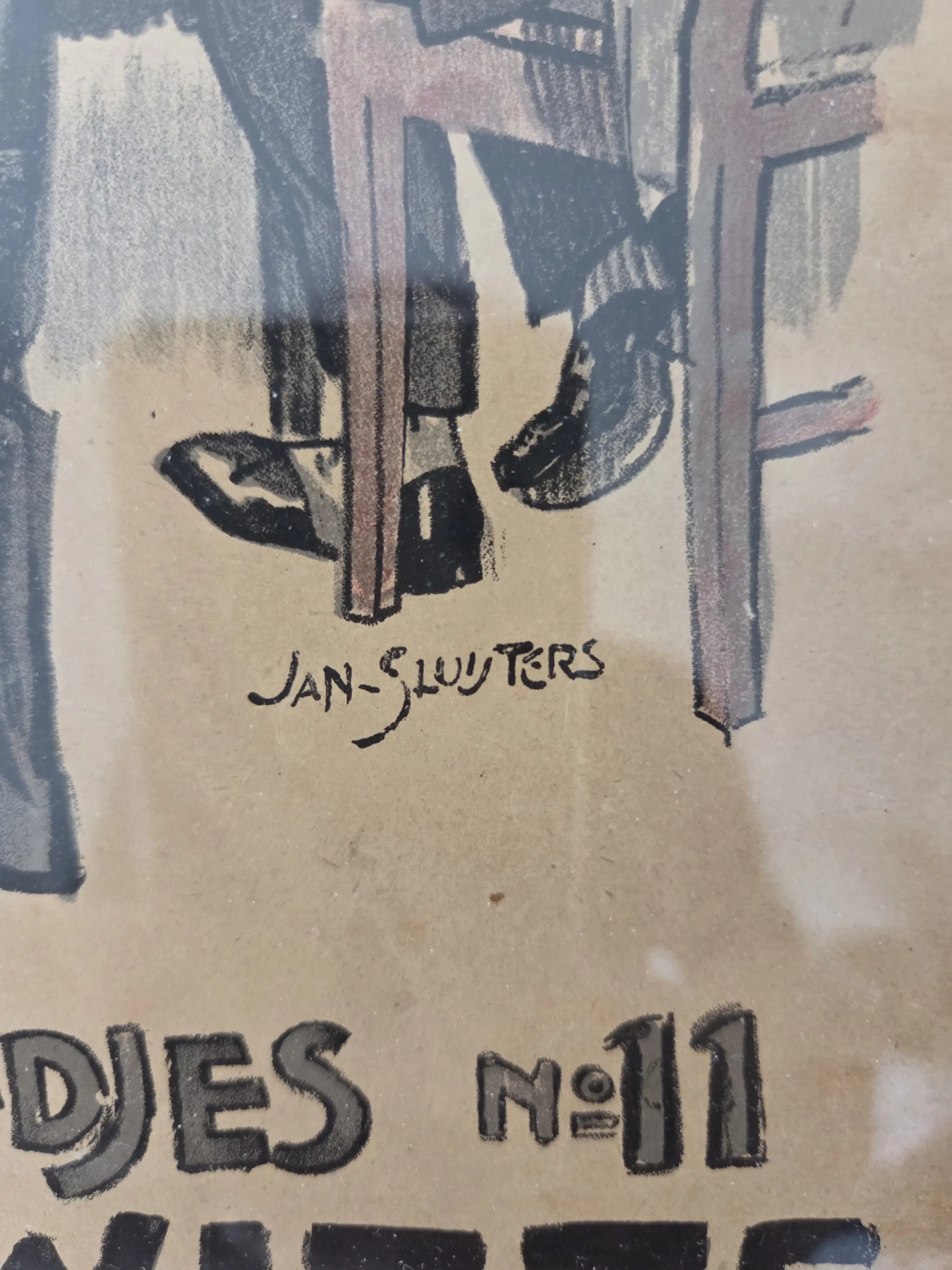 Vrolijk werk. Drukgesigneerd. Algemeen goede staat. Zeer bijzonder ingelijst in lijst met bladgoud. Lijst met paar gebruikssporen. Niet echt storend. Zie foto's voor eigen oordeel kwaliteit.