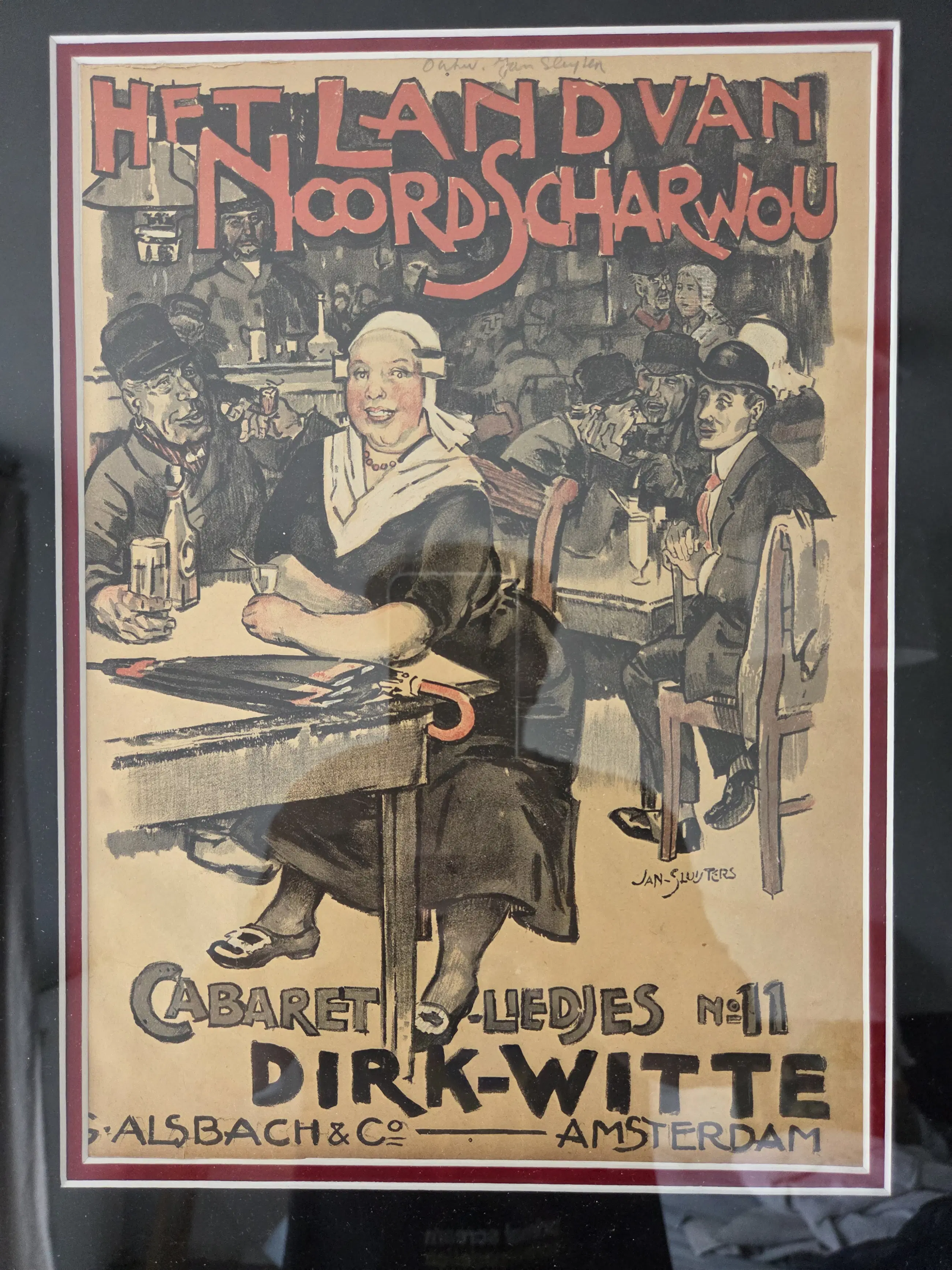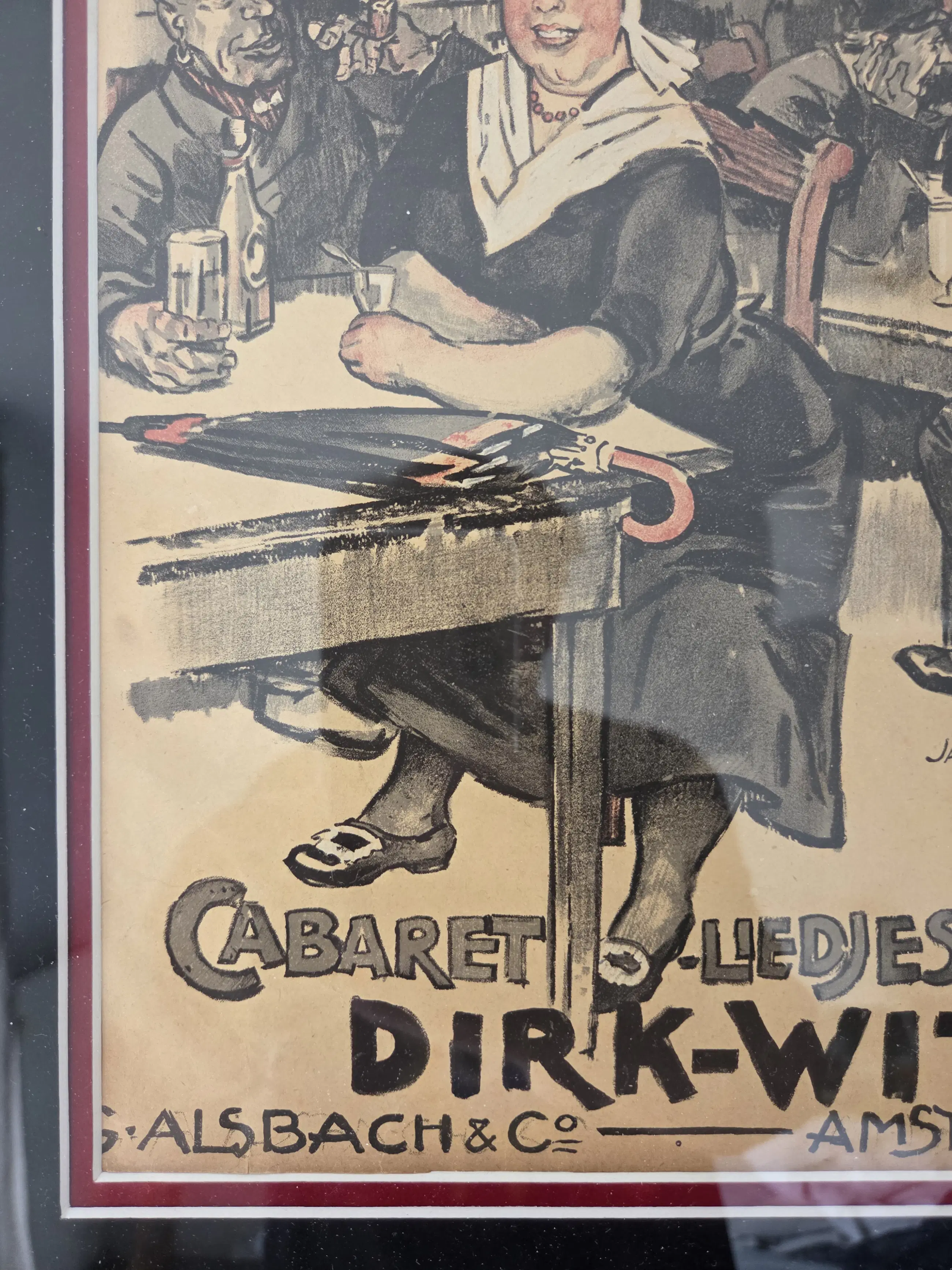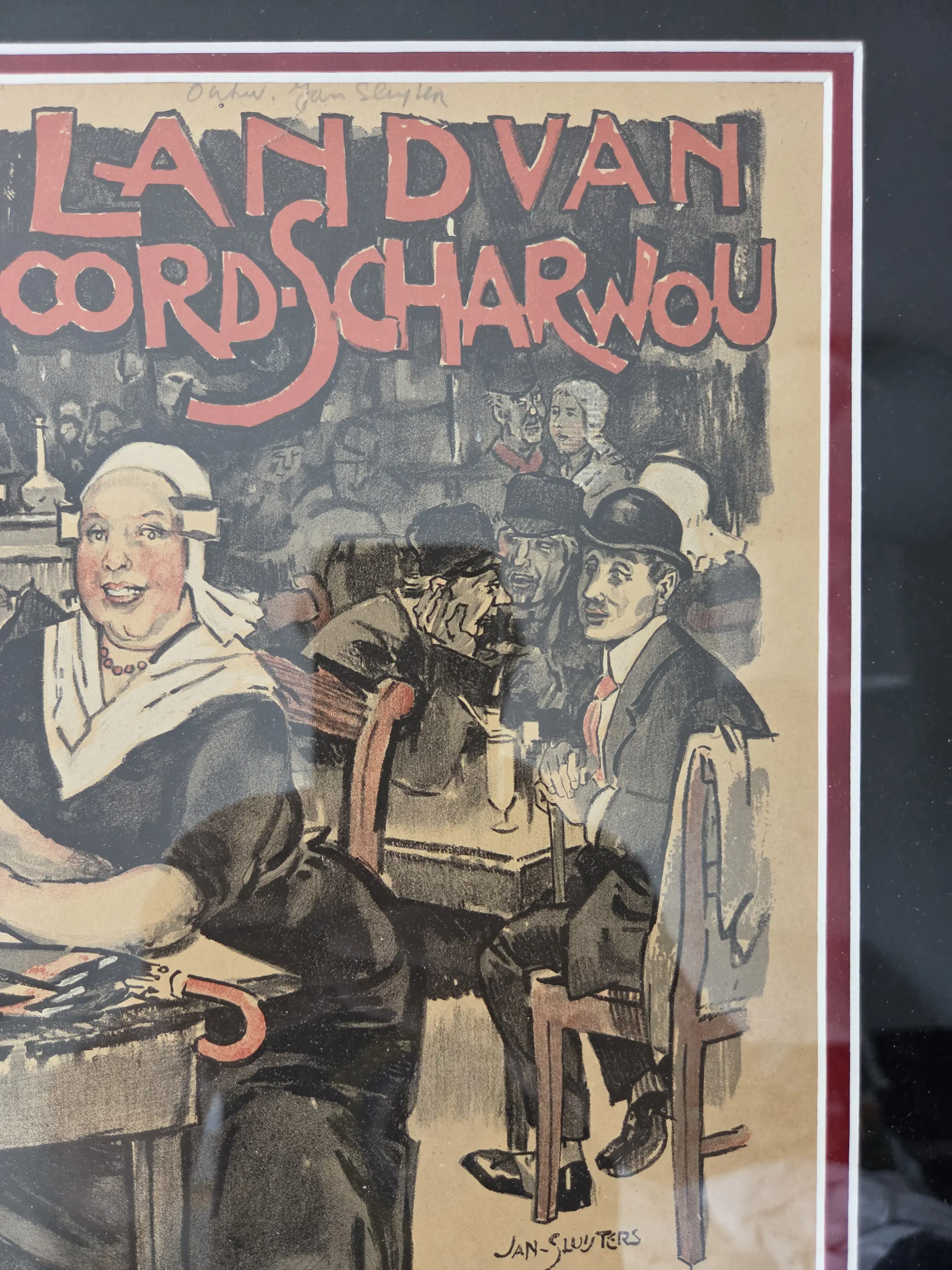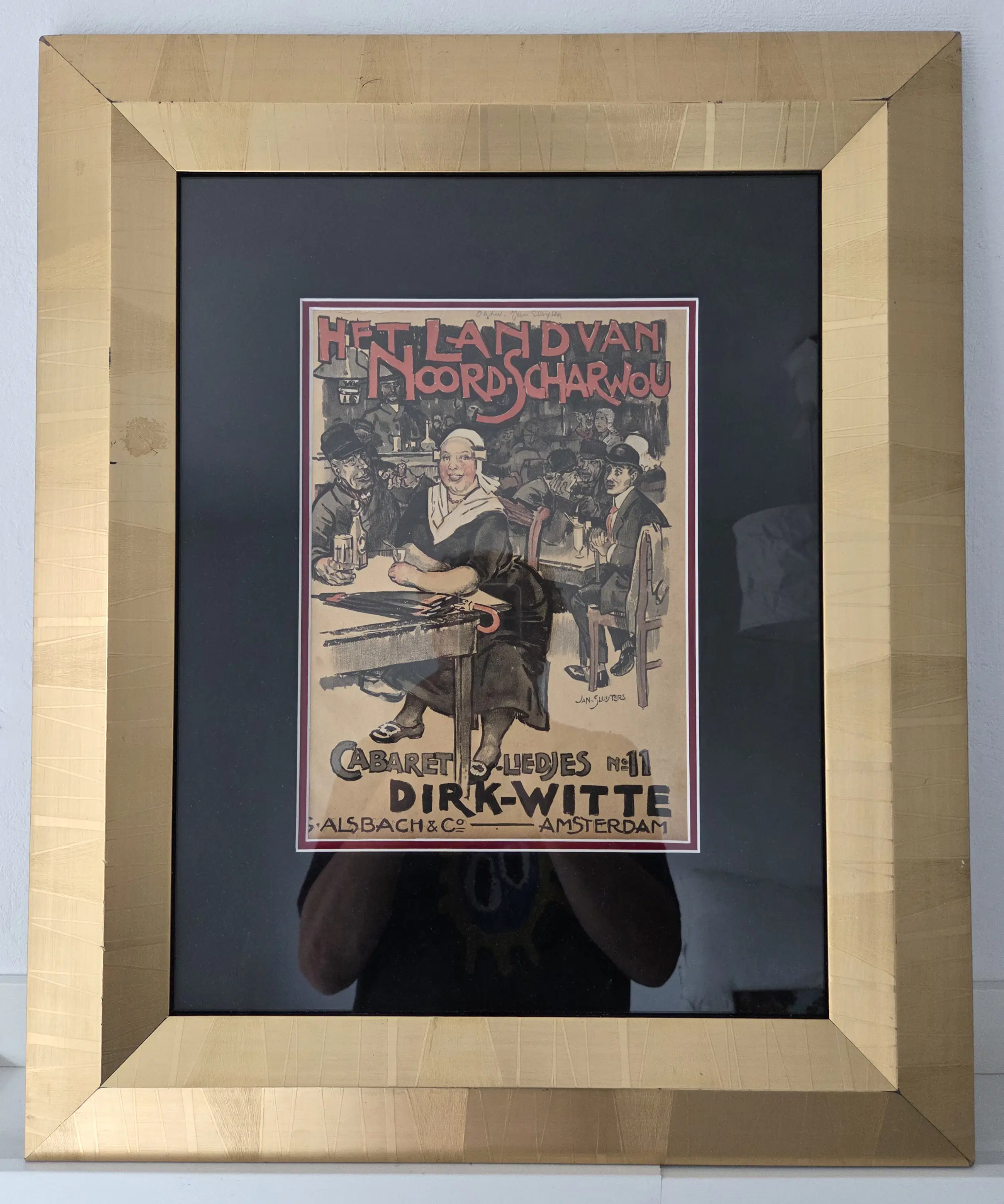 Vrolijk werk. Drukgesigneerd. Algemeen goede staat. Zeer bijzonder ingelijst in lijst met bladgoud. Lijst met paar gebruikssporen. Niet echt storend. Zie foto's voor eigen oordeel kwaliteit.
