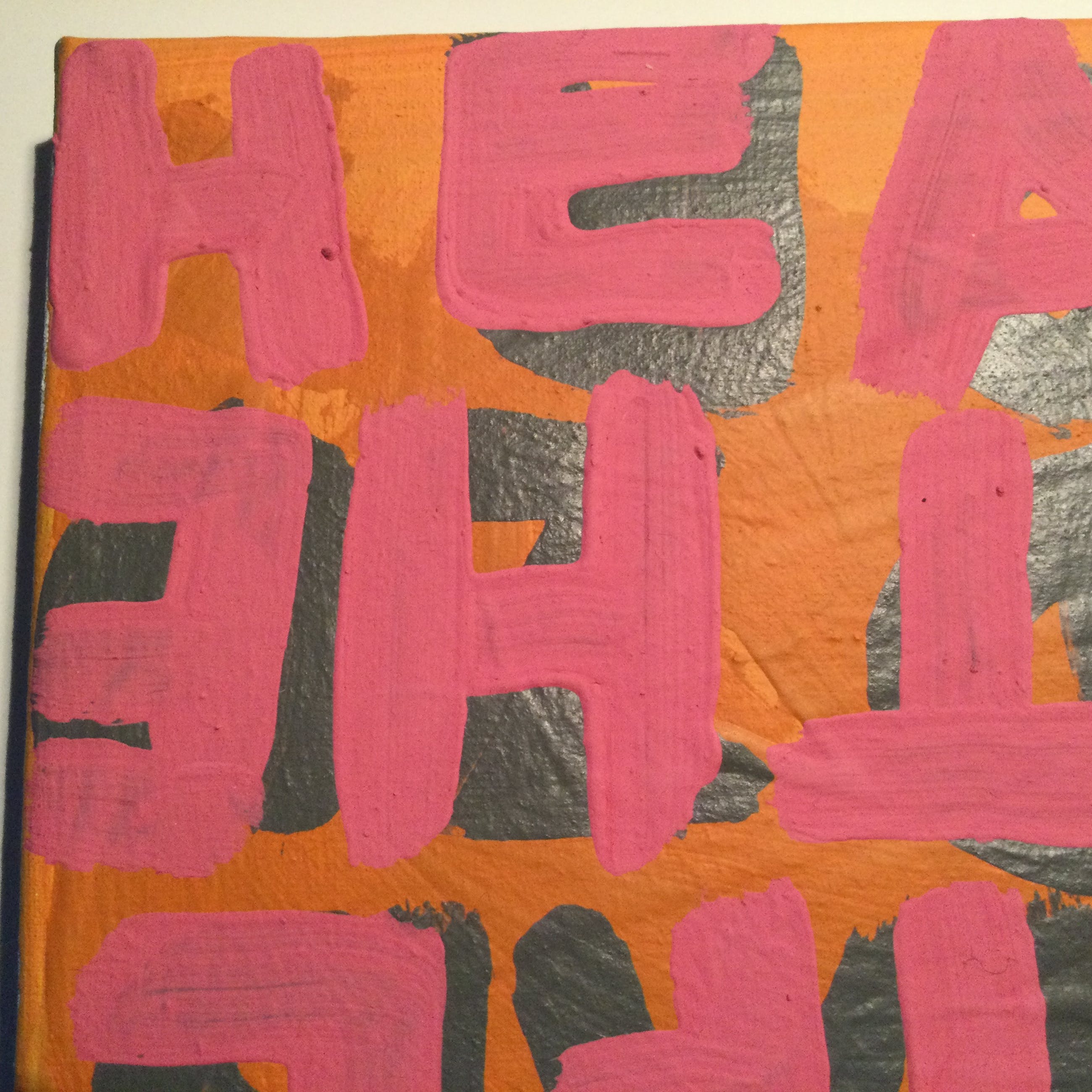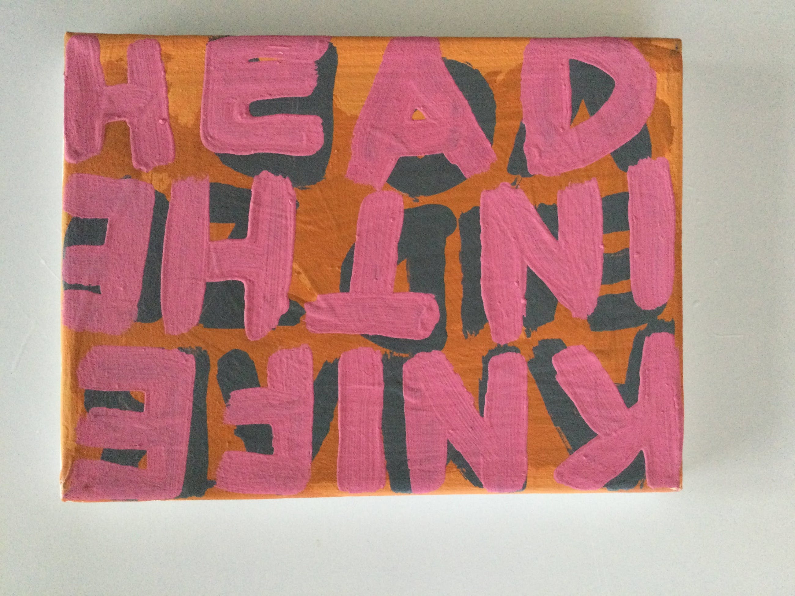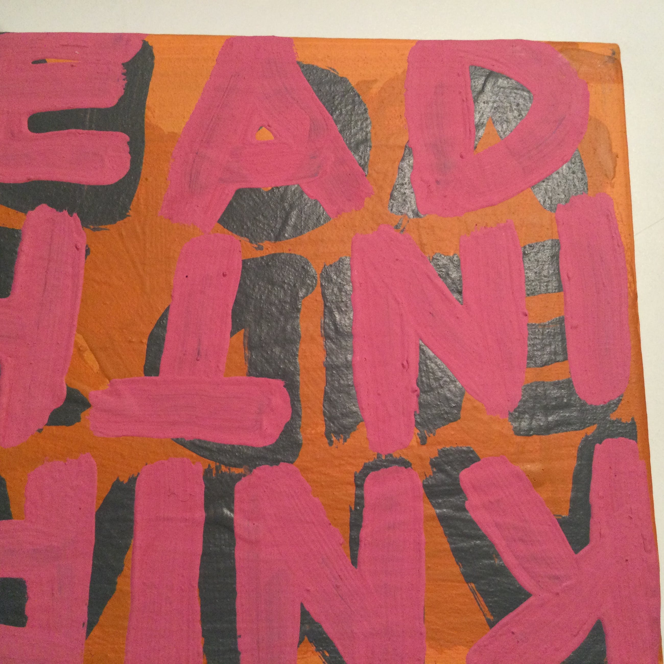 Jan Smejkal speelt met taal,woorden, zinnen en flarden ervan. Hij plaatst ze leesbaar of onleesbaar op het doek. Ook vaak meerdere letters over elkaar heen. De tekst is dan nog moeilijk te ontcijferen. Volgens mij staat onder deze tekst nog: Am Abend ...