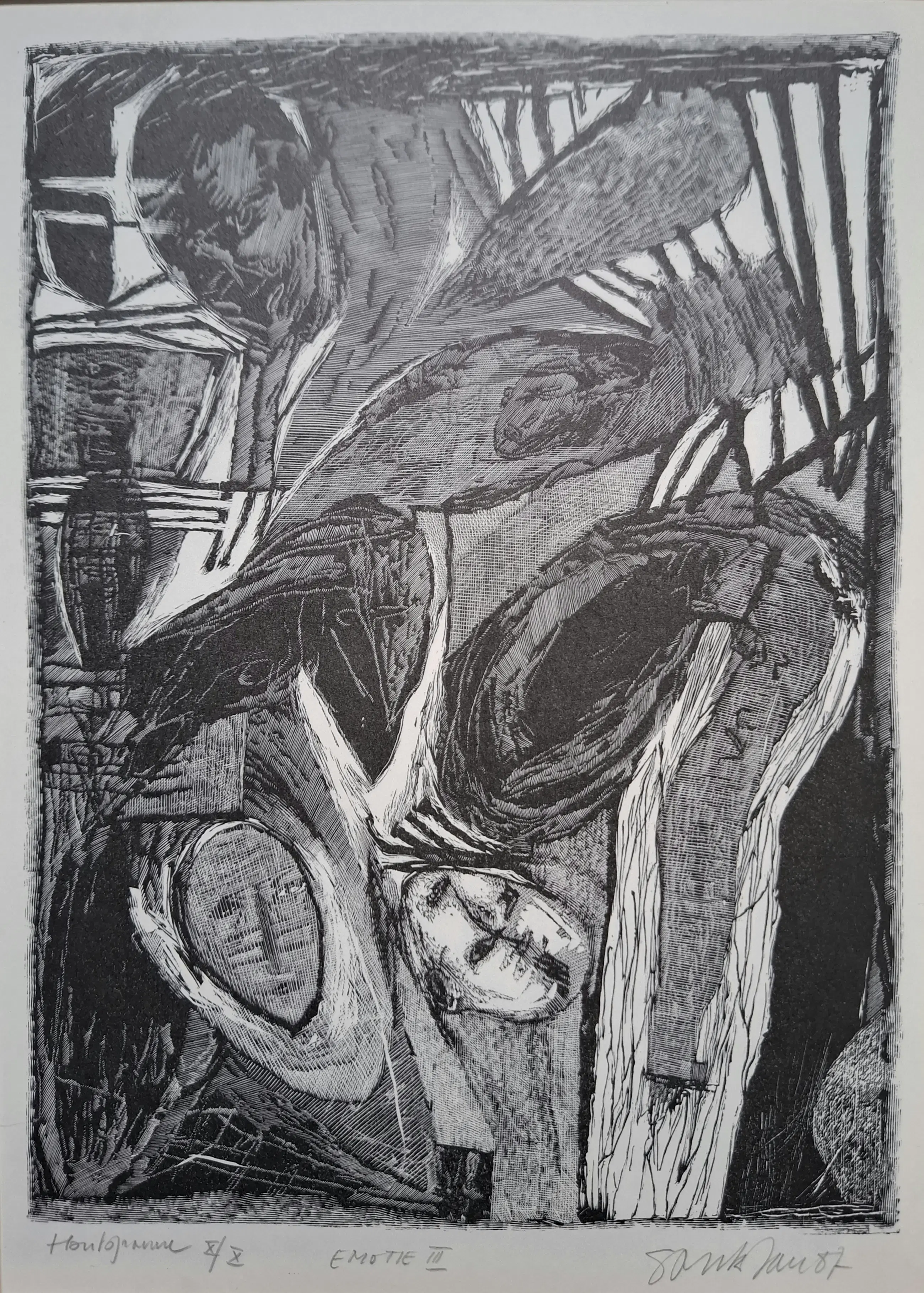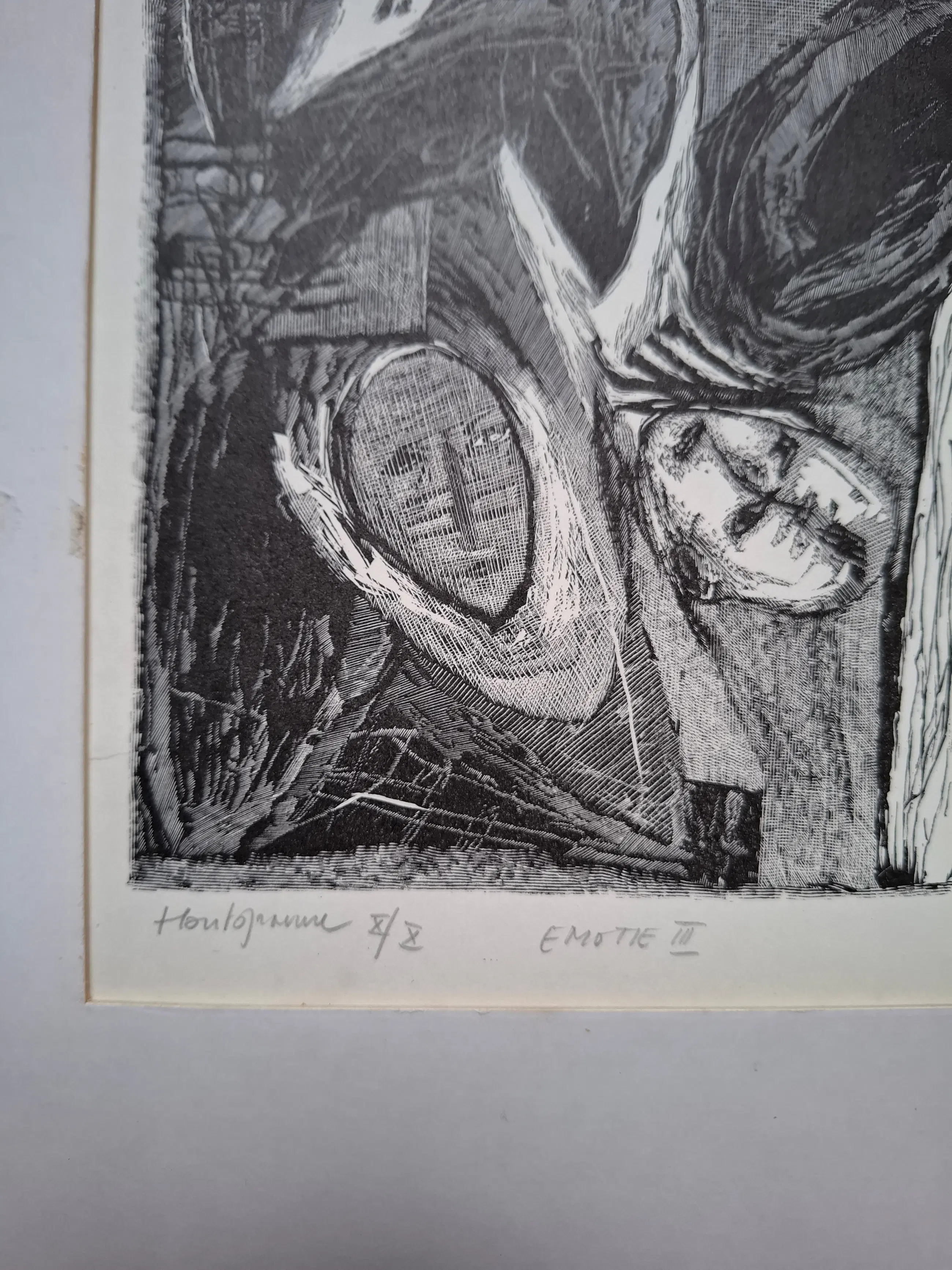 Dit werk maakt deel uit van de "Emotie"-serie, bestaande uit vier afzonderlijke gravures (Emotie I tot en met IV), gemaakt door de Belgische kunstenaar Jan Smitz.