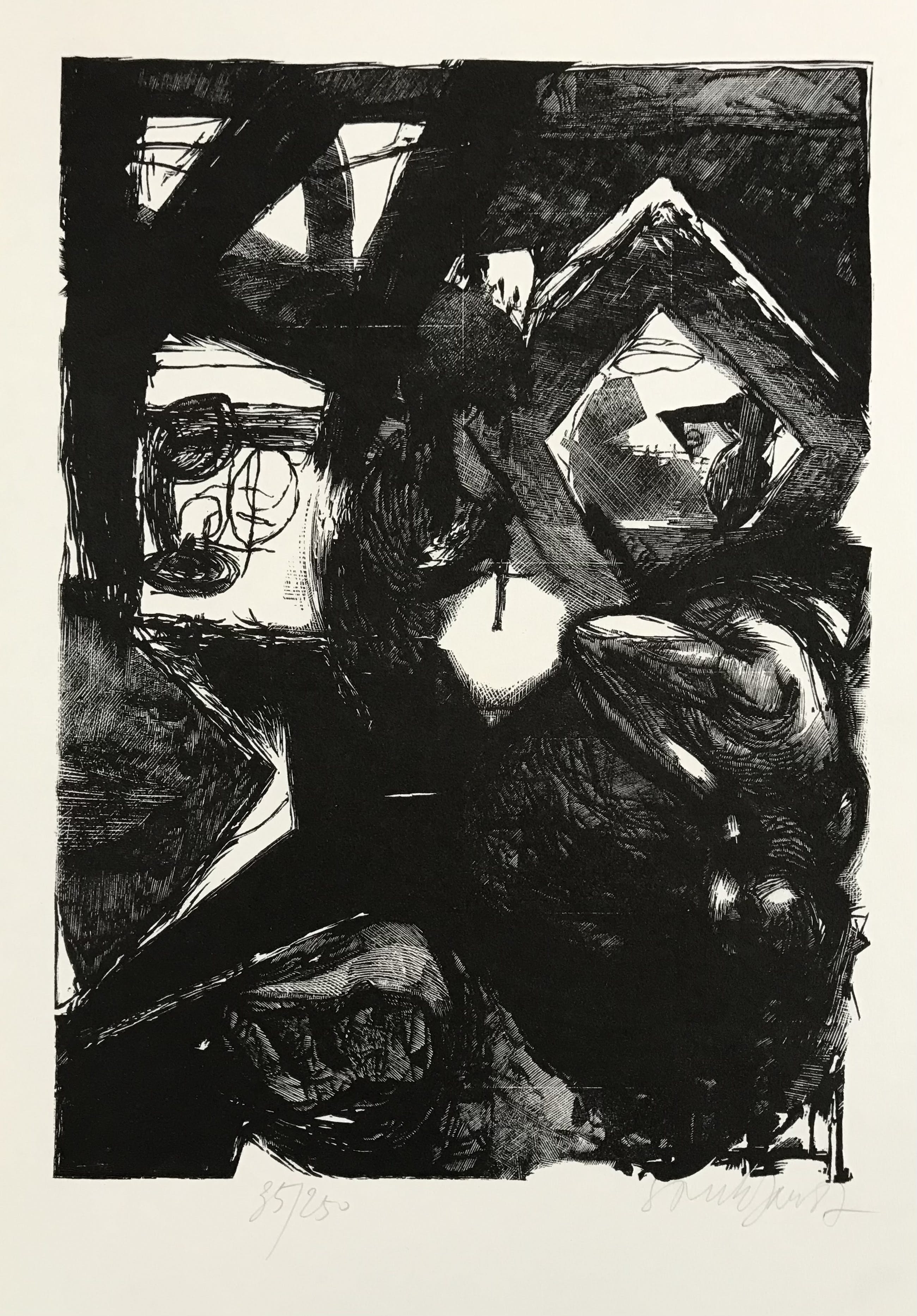 Jan Smitz. Litho. 1987. Uitgegeven in opdracht van Groep Van Roey, in het najaar van 1987 als nieuwjaarswens. De prent is gedrukt op papier "simili japon" door de kunstenaar zelf. Litho in originele map van Groep Van Roey. Conditie; zeer goed. Zie foto's.