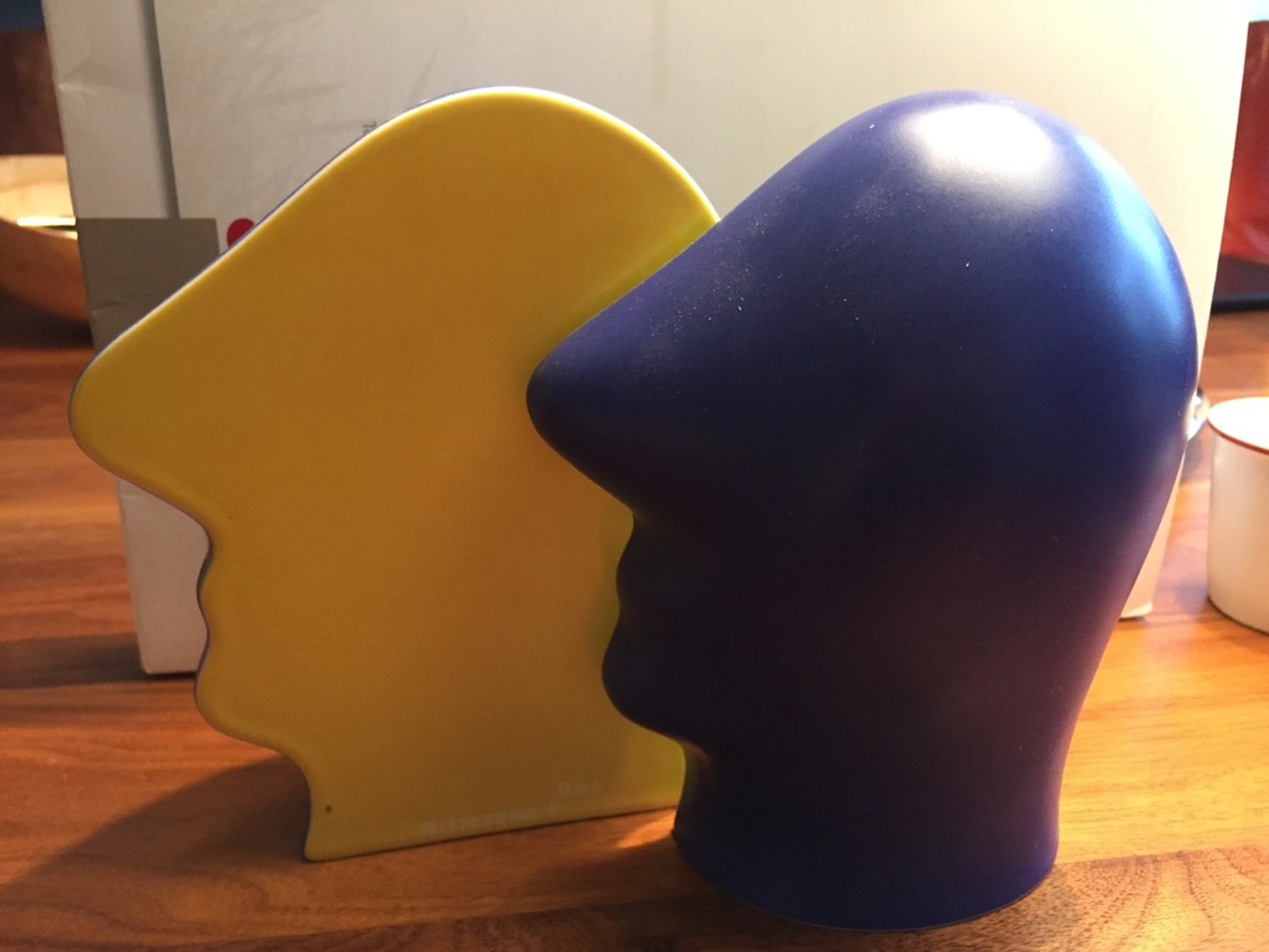 Twee halve hoofden/koppen die samen een compleet beeld vormen van het menselijk hoofd. Keramiek in de kleuren blauw-groen-geel; typerend water, natuur en zon.