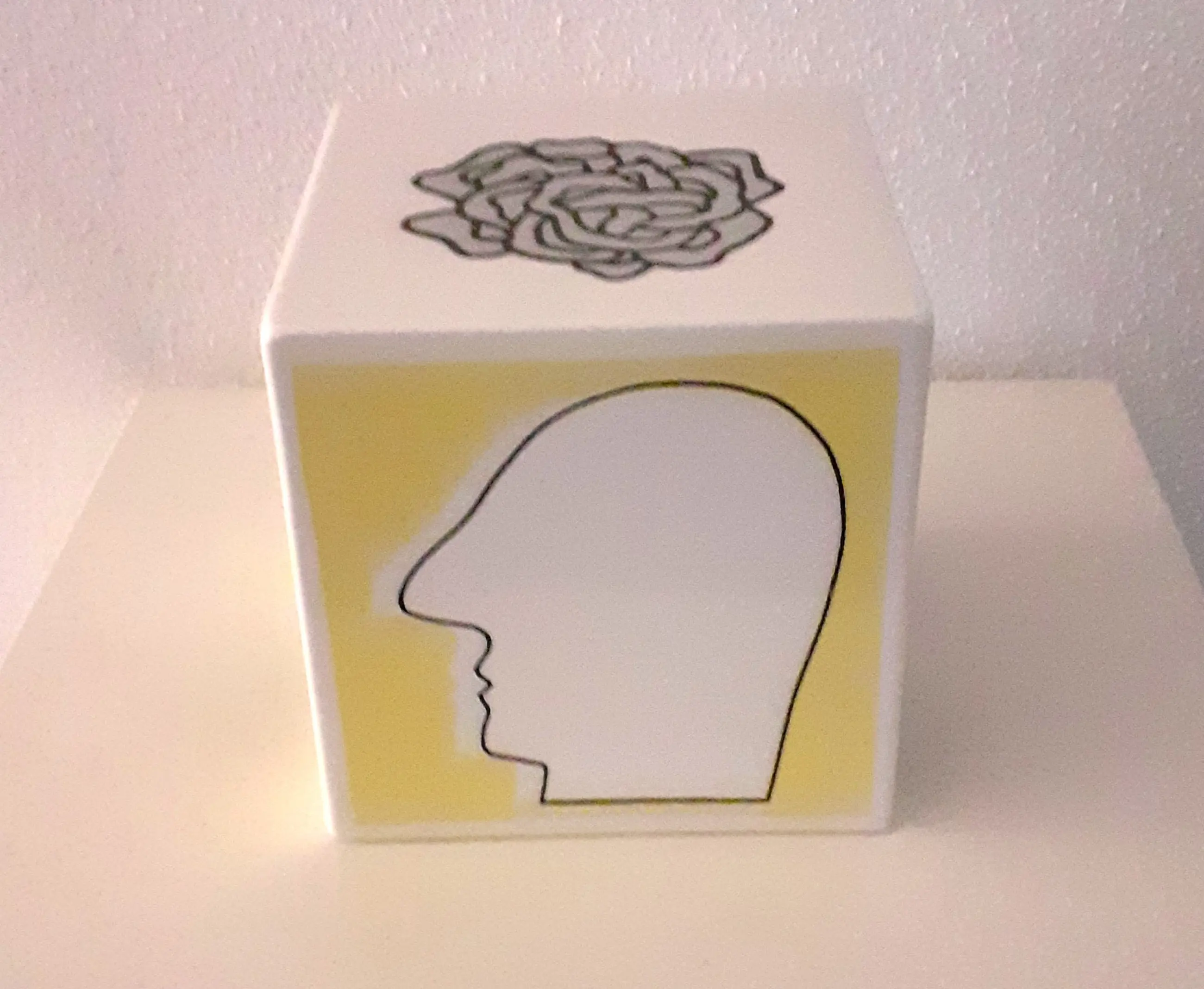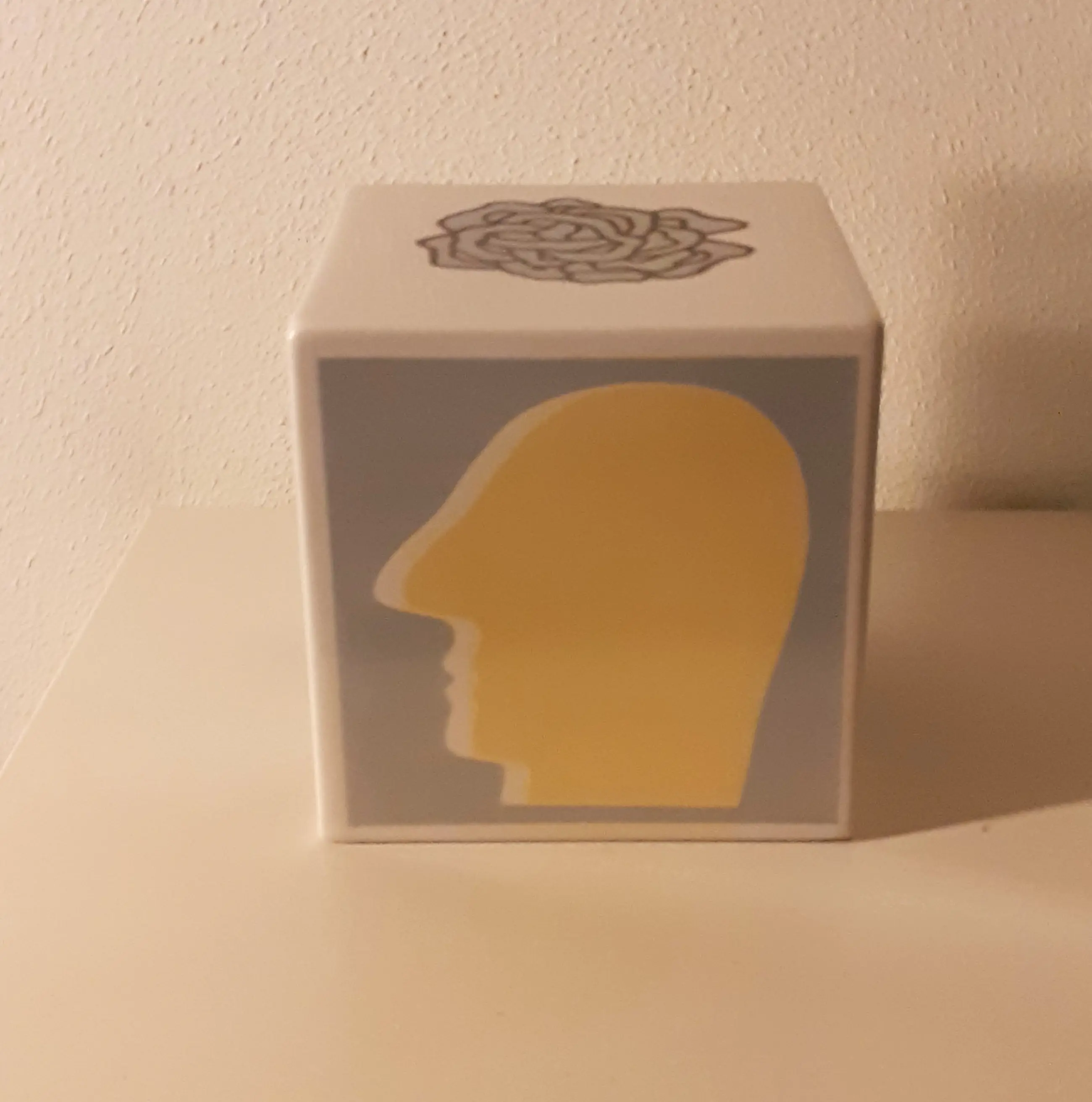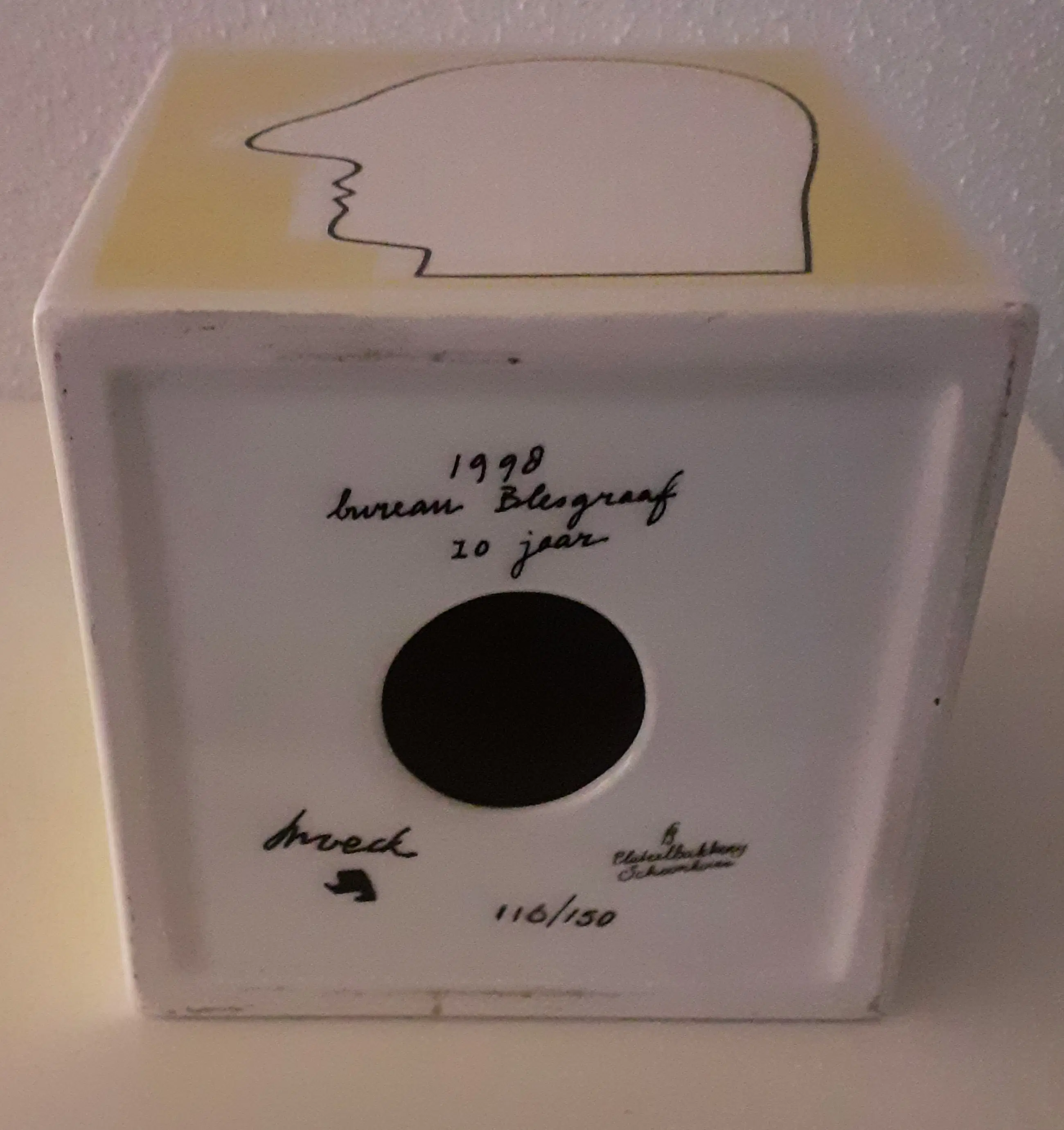 Kubus keramiek in kleine oplage van 250 stuks gemaakt voor Bureau Blesgraaf (10 jarig bestaan). Genummerd (116/150) en gesigneerd. Gemaakt door Schoonhoven keramiek.