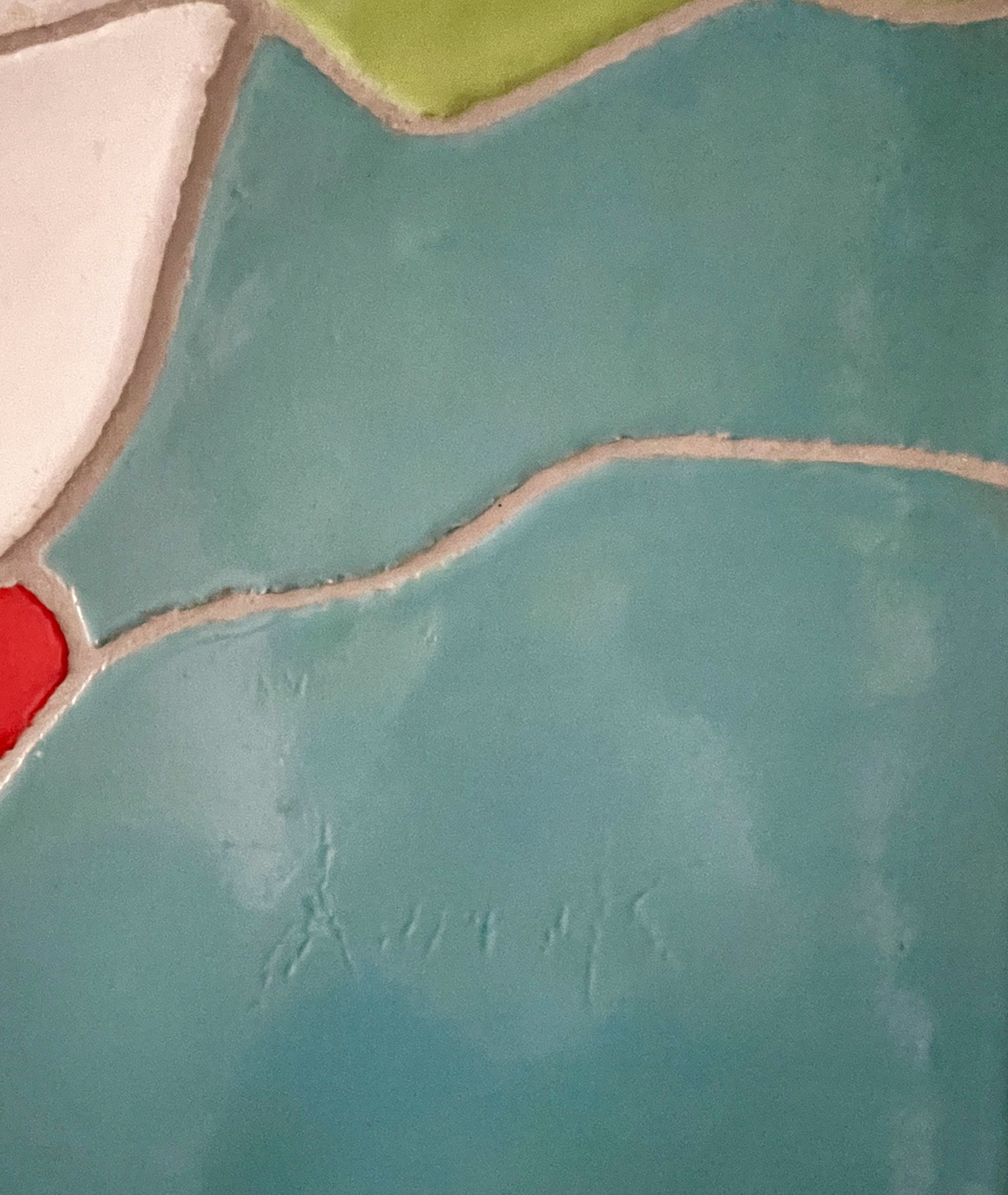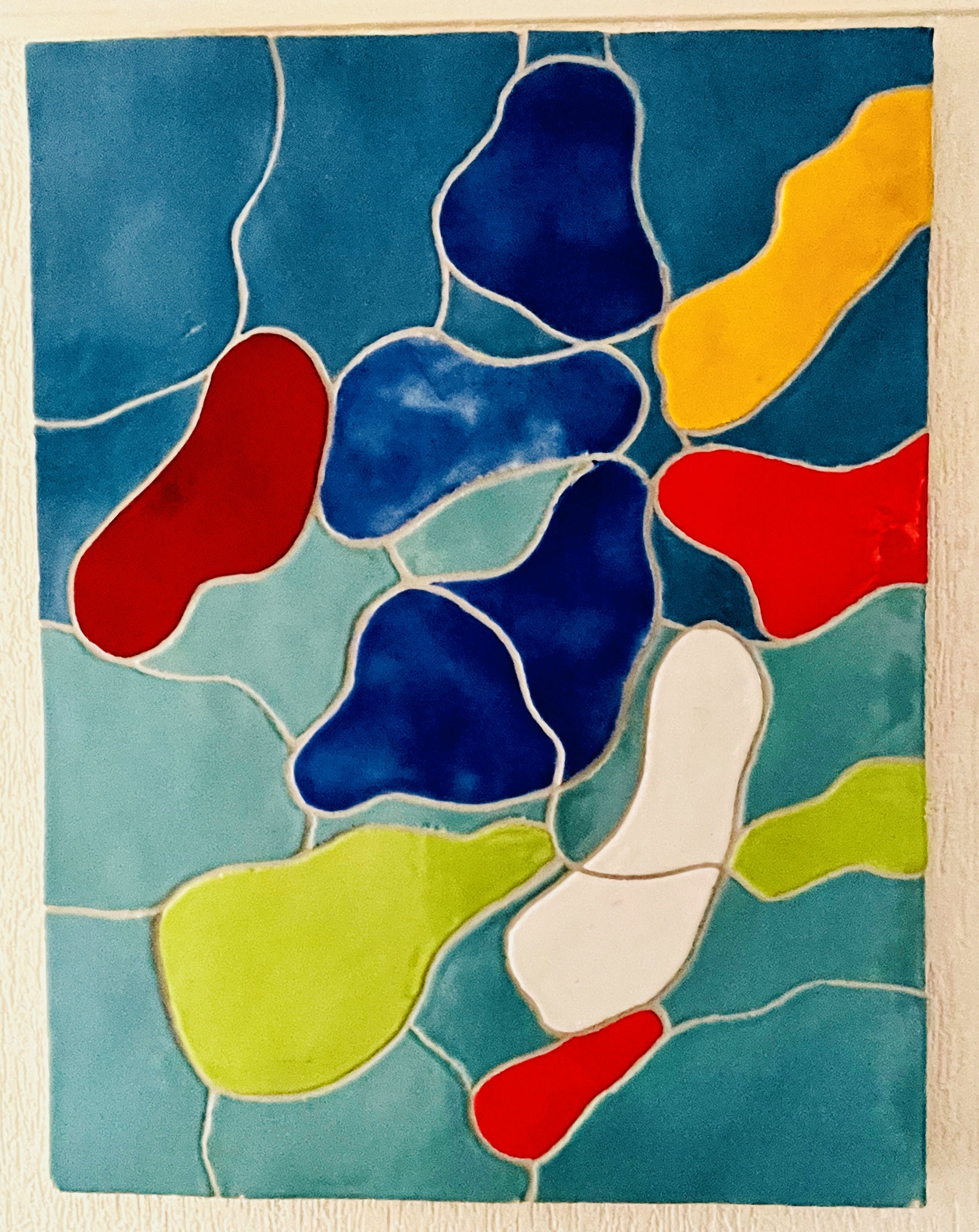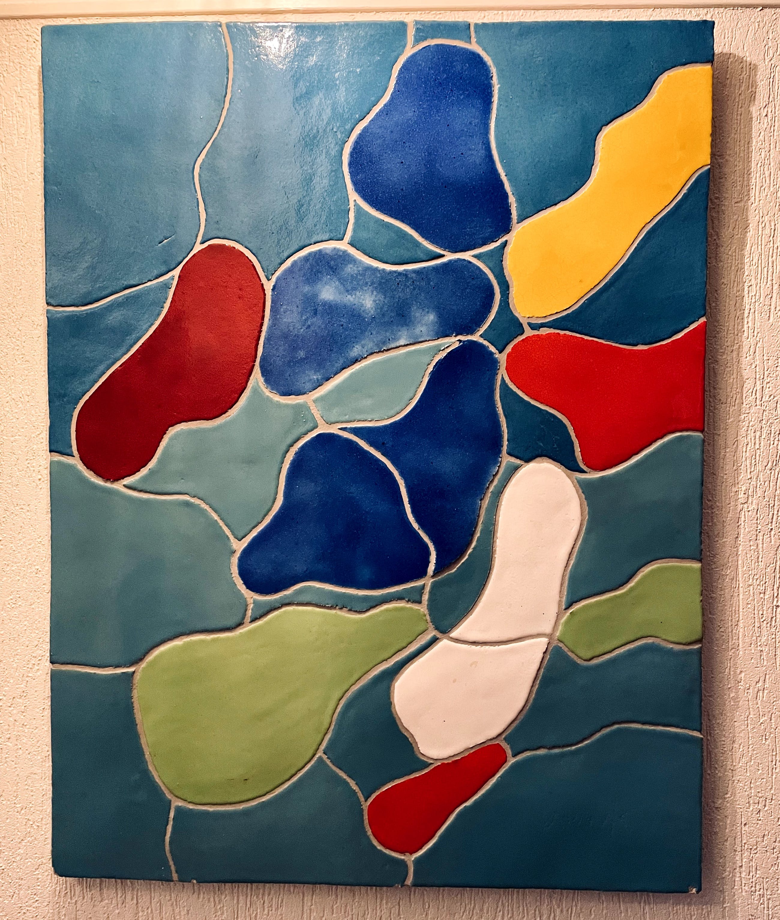 Door Jan Snoeck gerealiseerd in keramisch atelier Struktuur 68 in Den Haag, het is het middelste deel van een drieluik voor een nieuw schip van de Holland Amerika Lijn. Jan heeft destijds een ander ontwerp voor het schip gekozen, en ik heb het deel dat ik nu aanbied in 1995 van Jan overgenomen (ik werkte al sinds 1983 bij Struktuur 68). De keramiek is door Jan in het atelier geglazuurd, en de stukken zijn gekit op een watervaste afgeschuinde plaat van 2 cm, de keramiekdikte is 2,5 cm en gevoegd. N.B.: het paneel hangt in een smalle gang waardoor het erg moeilijk is goede foto's wat kleur betreft te maken. Het zijn de primaire CoBrA kleuren die Jan Snoeck veelvuldig gebruikte. Op de foto zijn aan de onderrand een paar kleine beschadigingen te zien (schilfertjes keramiek eraf) die door Struktuur 68 kunnen worden bijgewerkt.