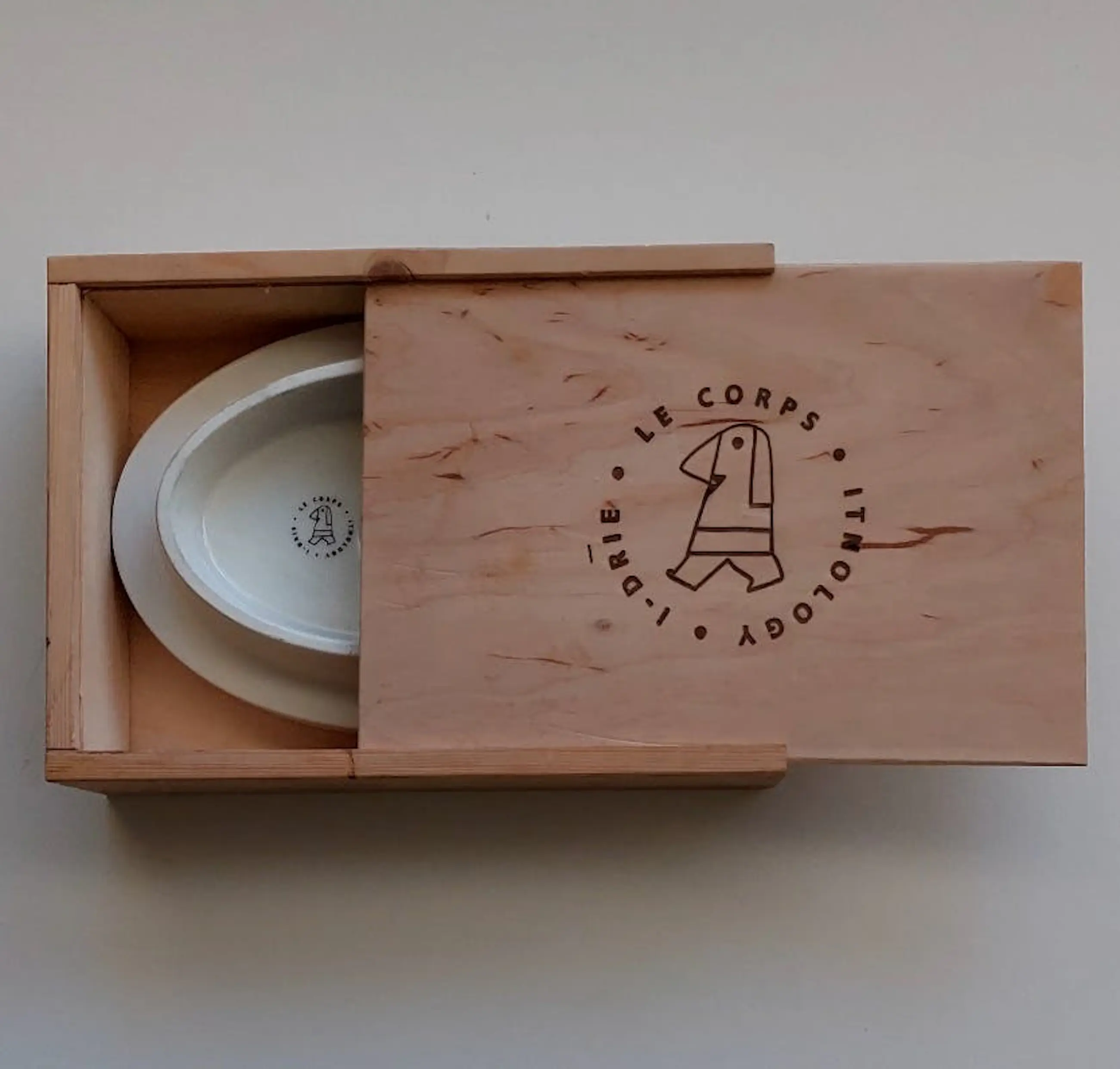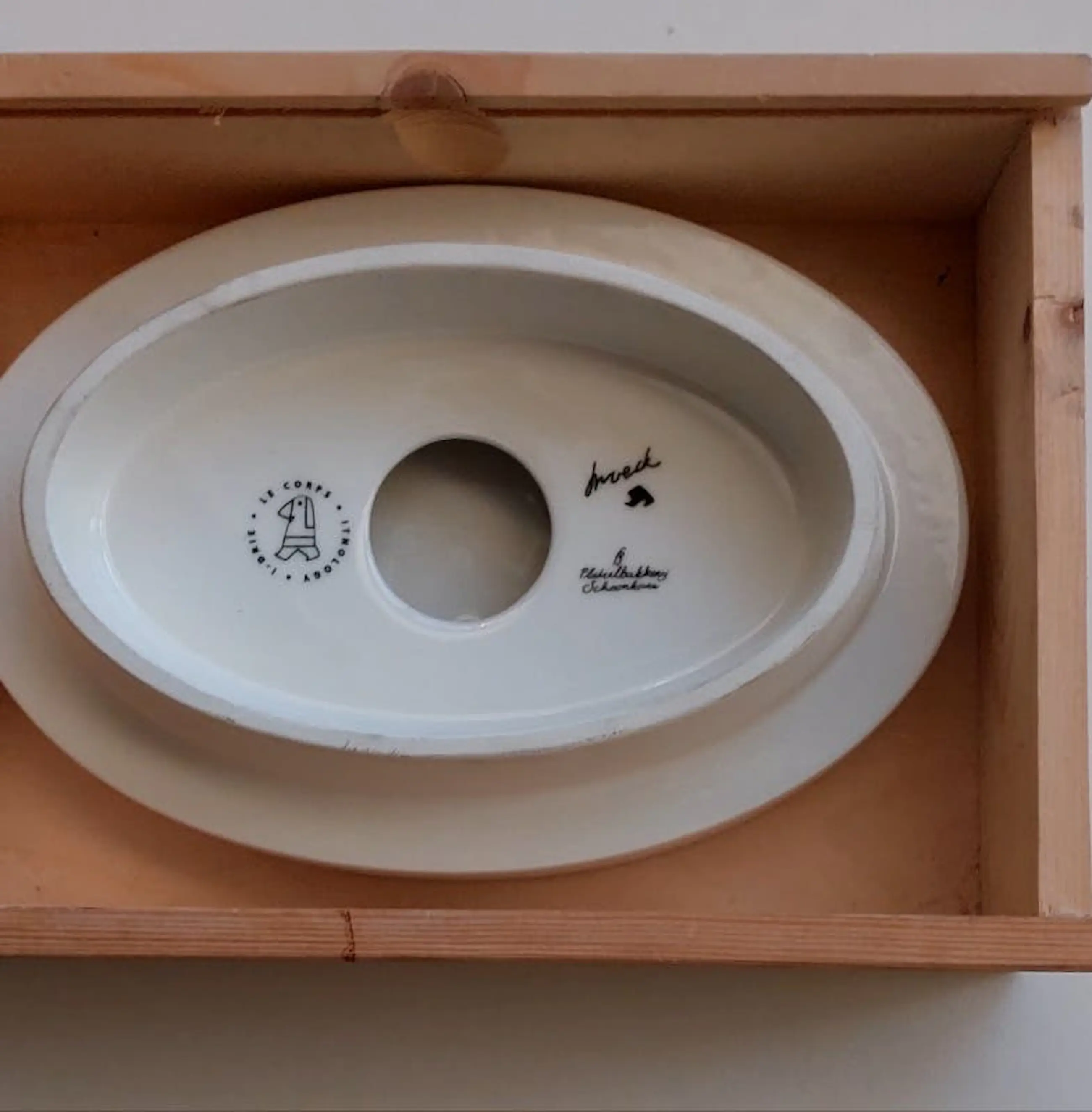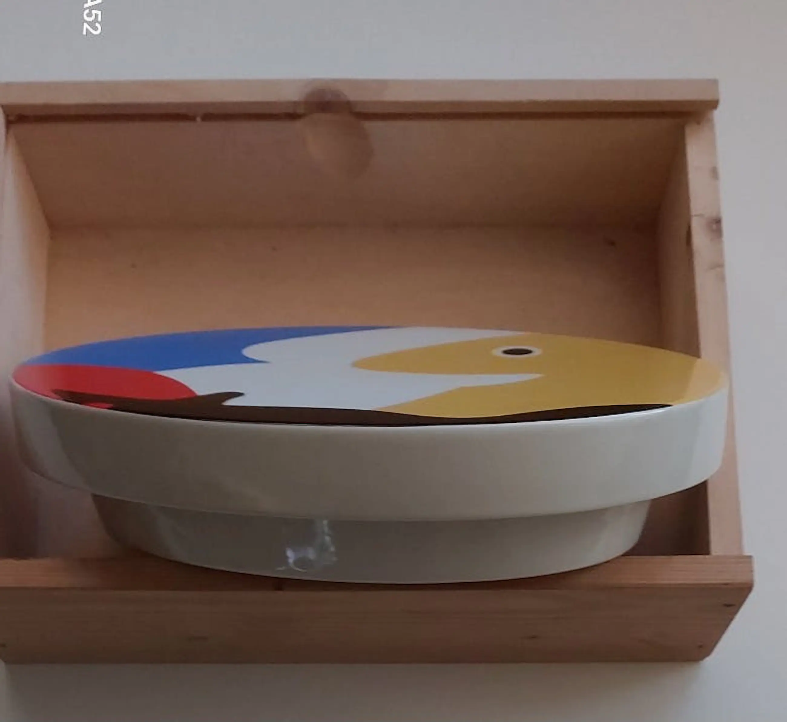 Gemaakt in Schoonhoven, gemerkt aan de onderzijde. in originele houten kistje. De opgegeven maten zijn die van het kistje. De onderzetter past daar precies in.