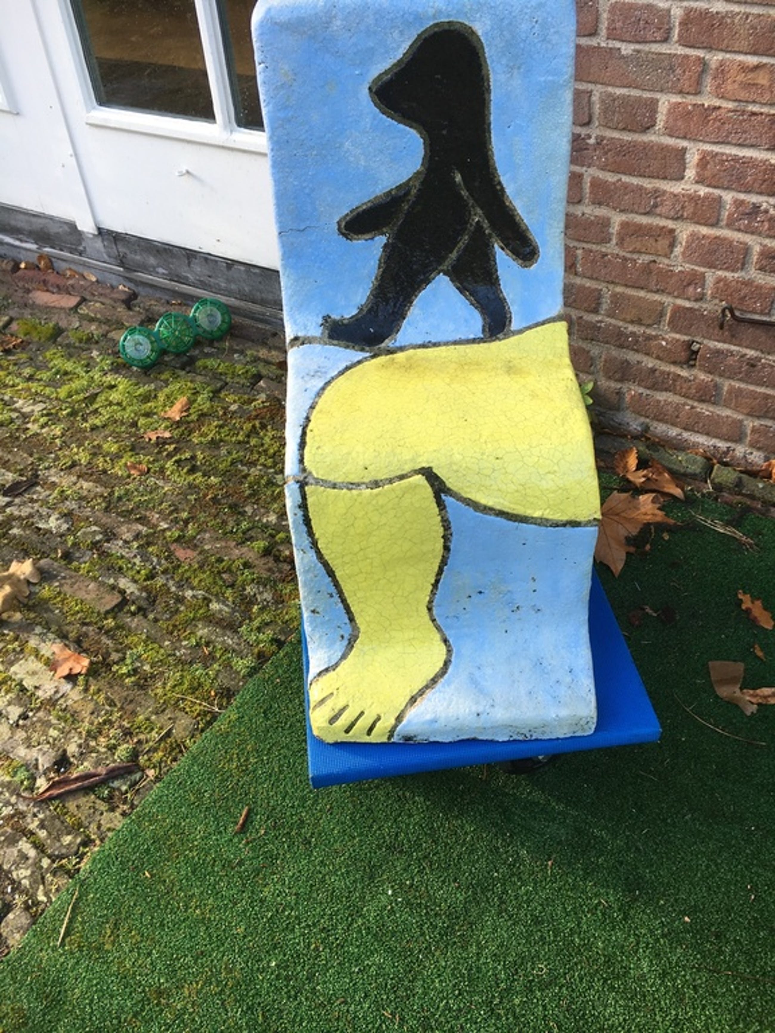 Stoel beton en keramisch in blauw, geel, zwart.