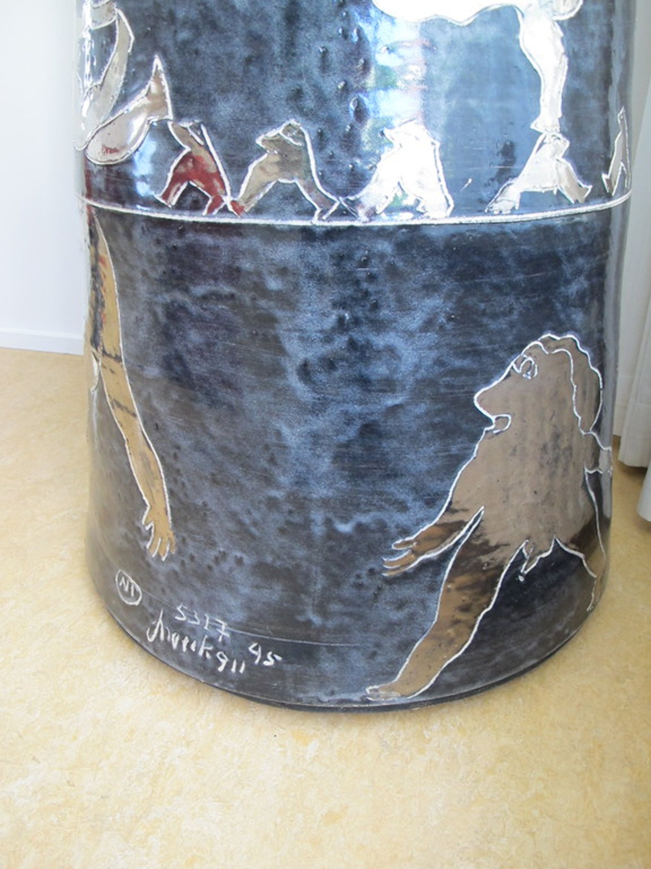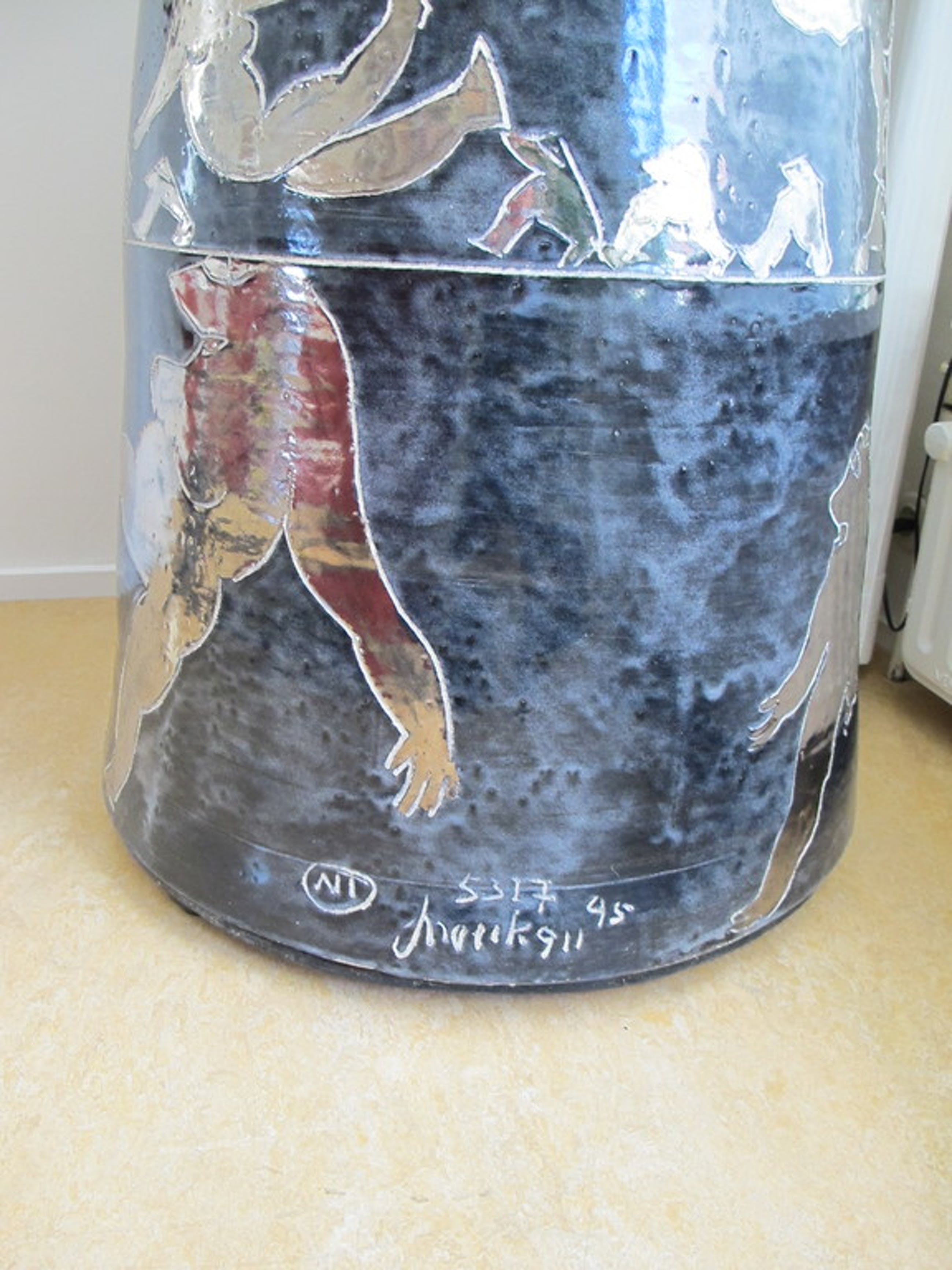 Prachtige zwarte obelisk van geglazuurd keramiek van Jan Snoeck met vrolijke dansende gouden figuren.
