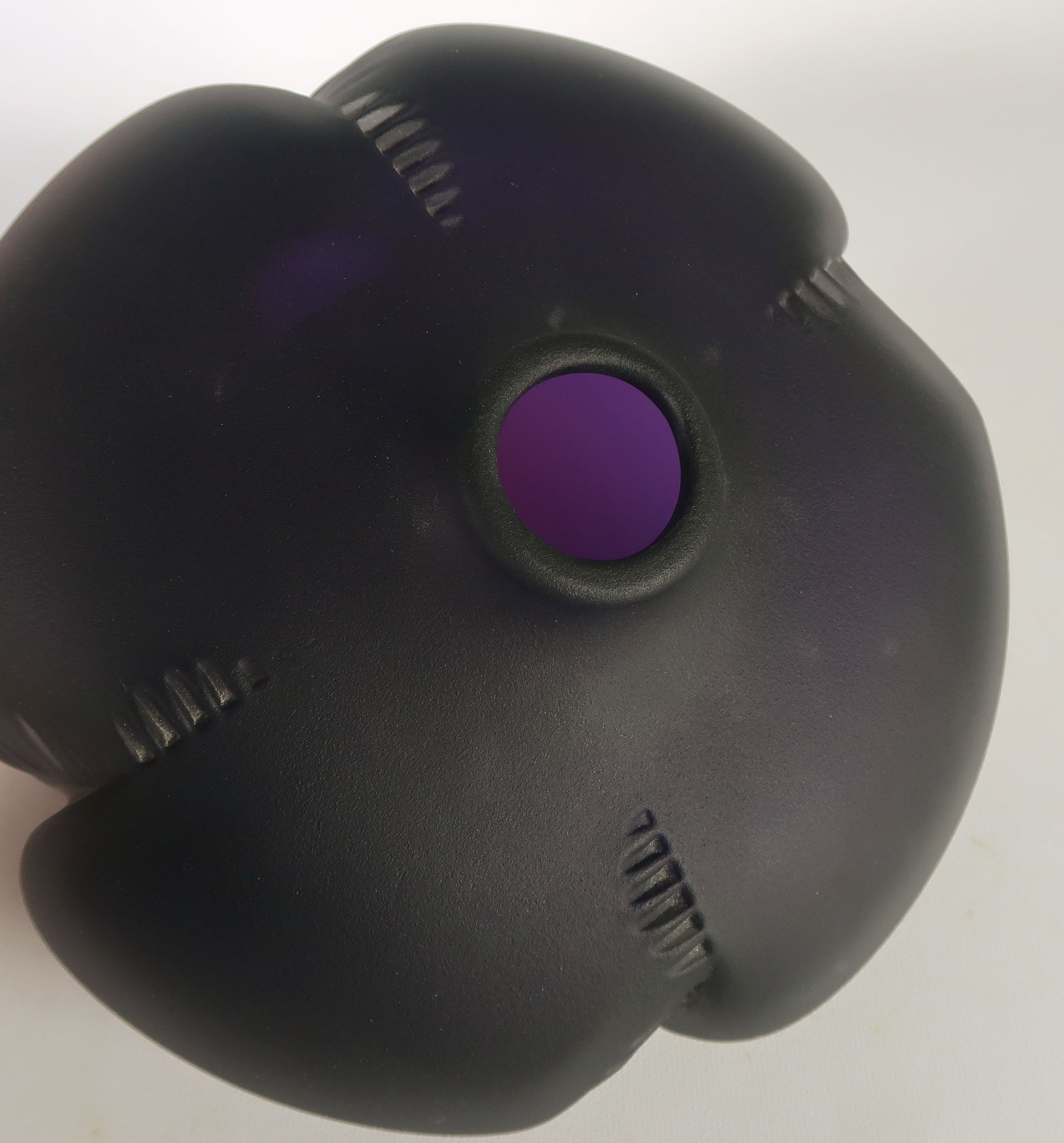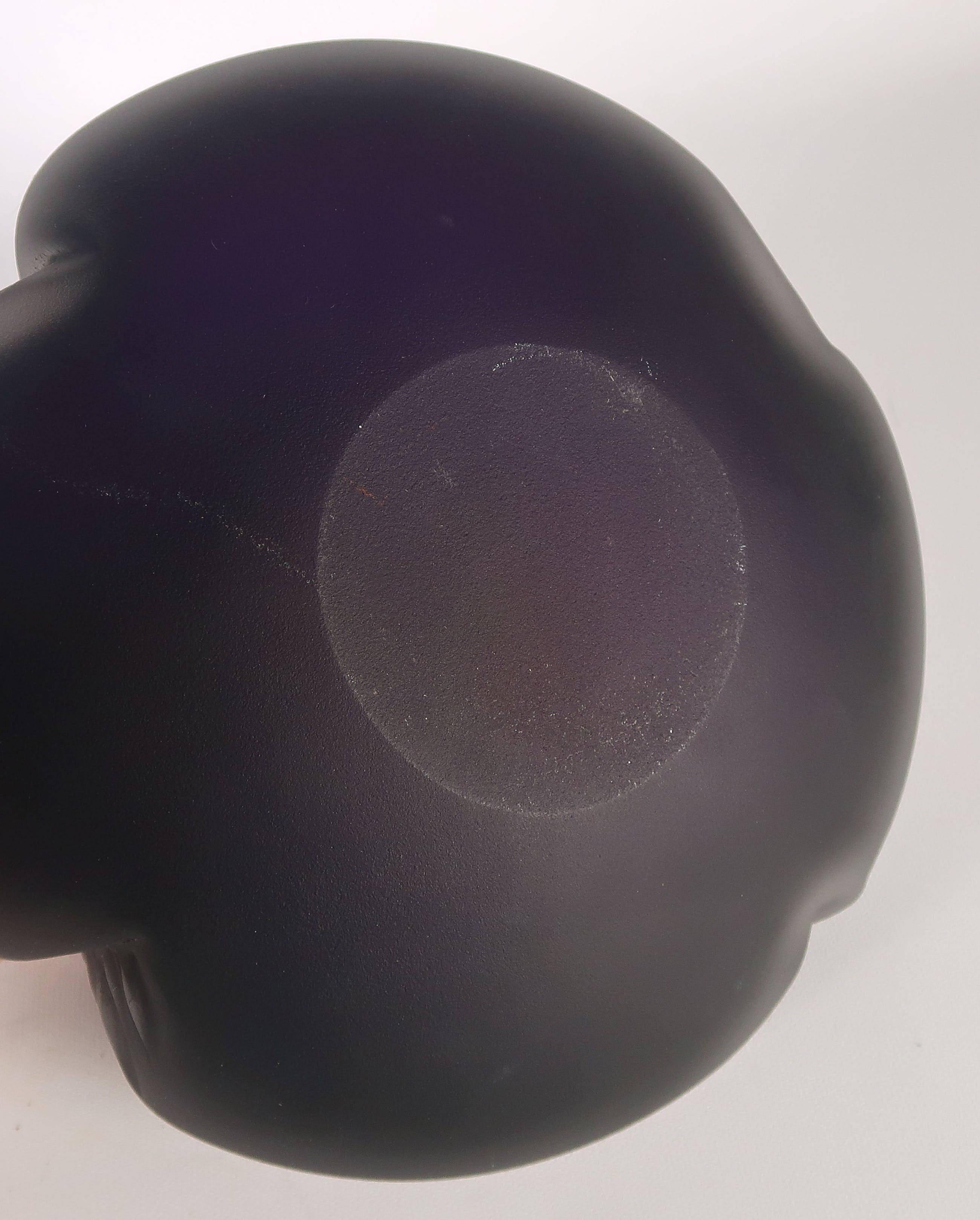 Mat donkerpaarse bolvormige vaas. De vaas is aan de onderzijde gesigneerd met: ''J Sostek 2011''.