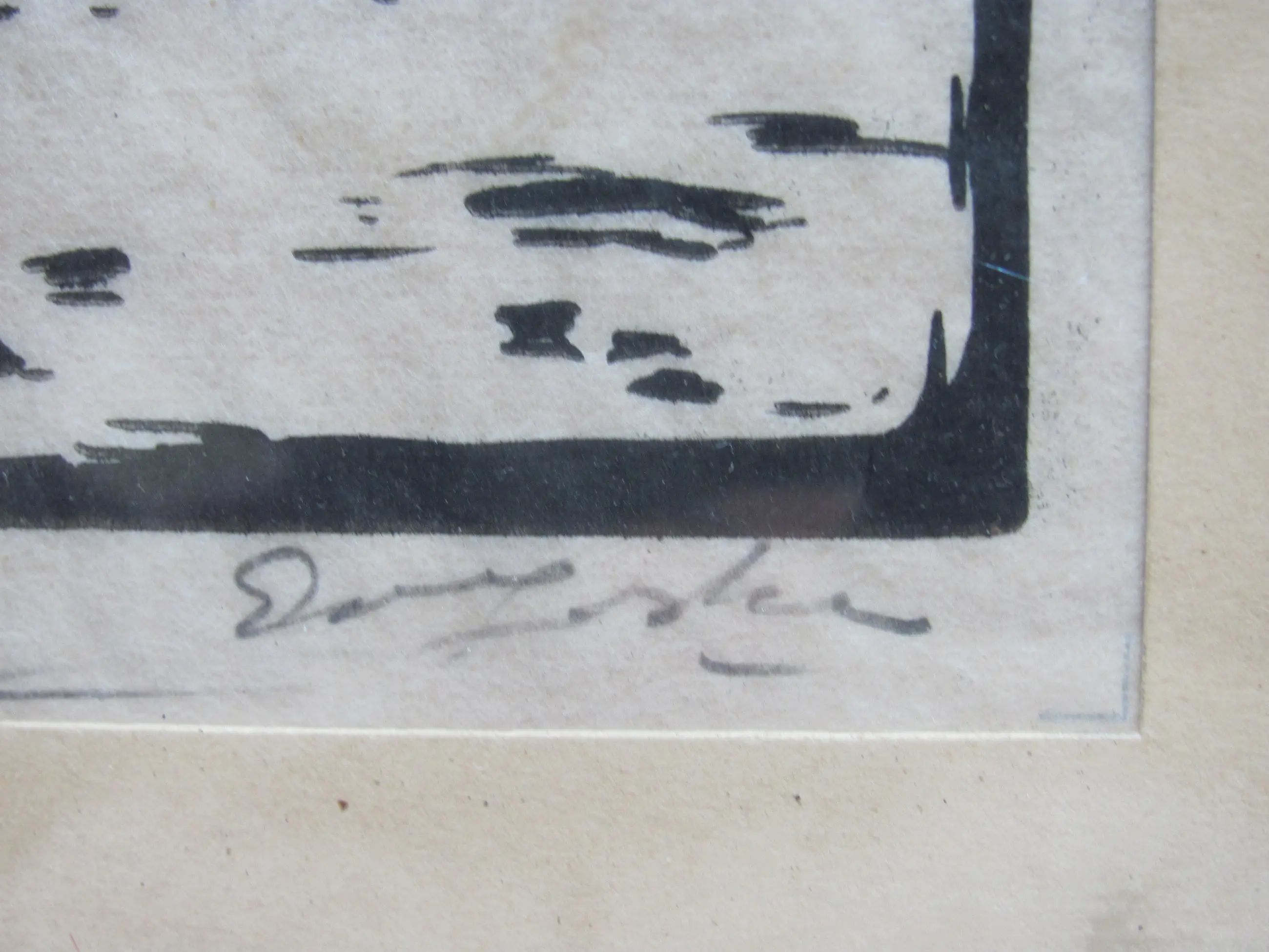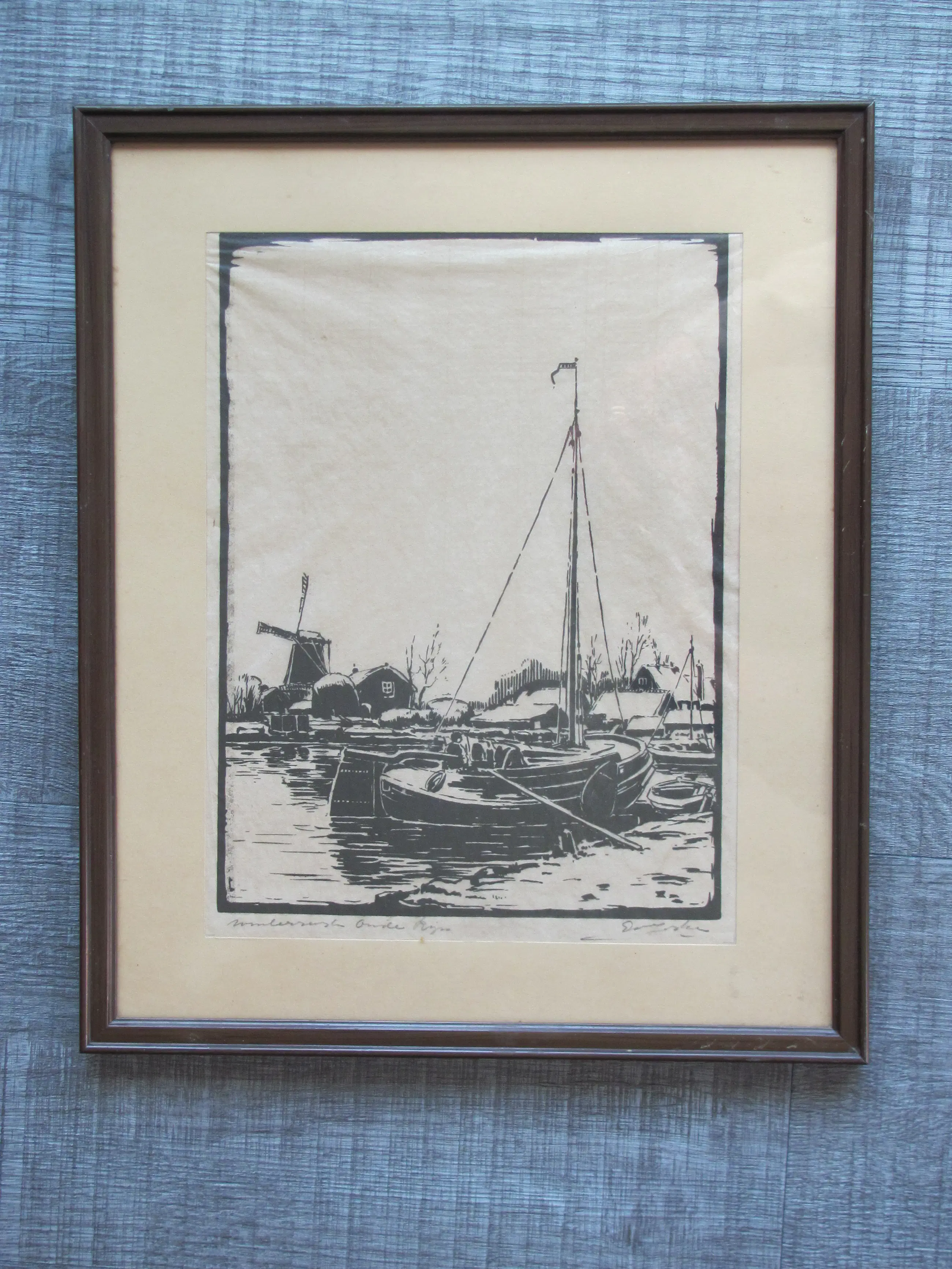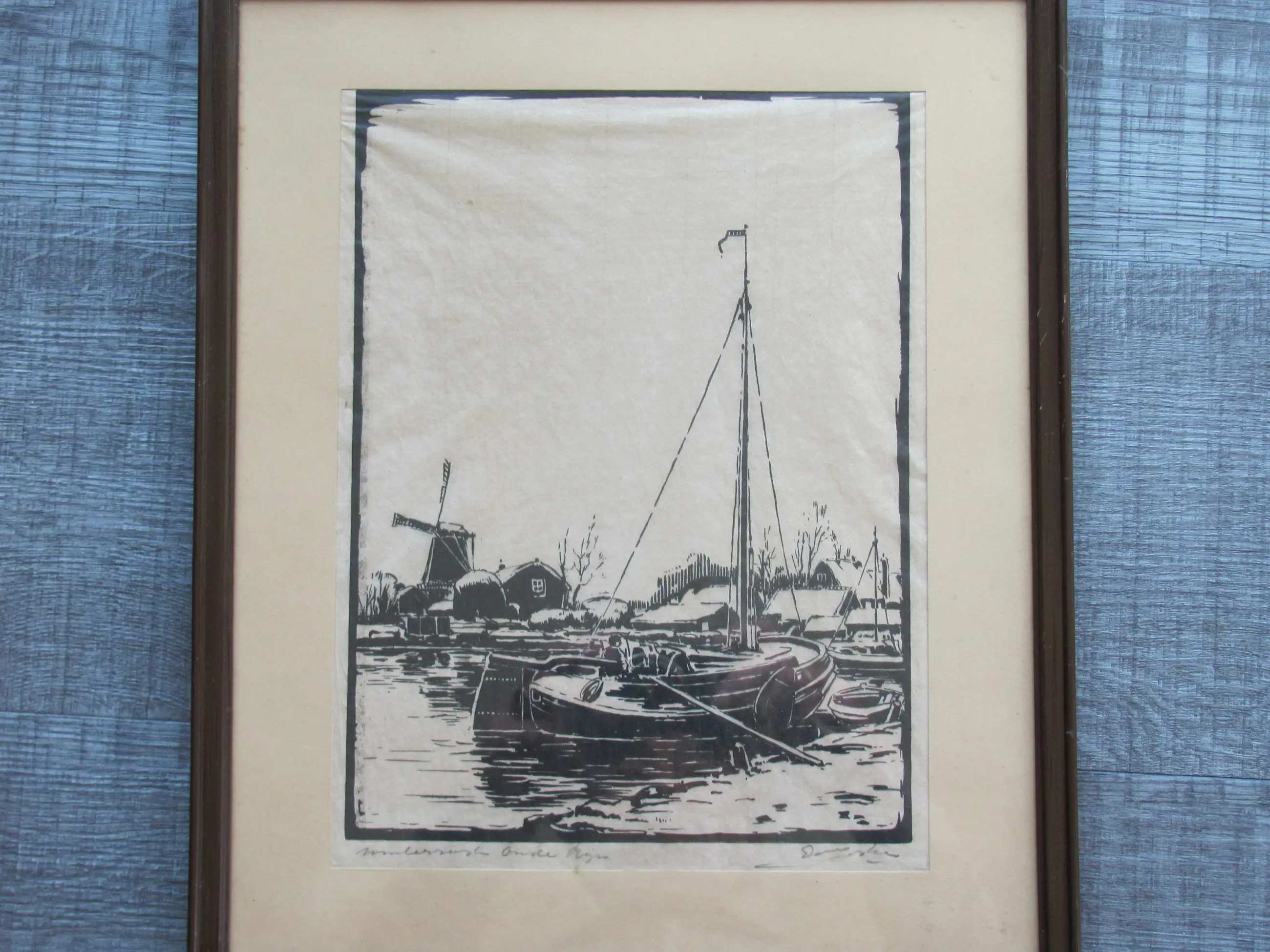 Houtsnede van Ed Jeska op dun rijstpapier. Rechtsonder gesigneerd. Linksonder getiteld. Voor mij niet helemaal duidelijk wat er staat. Ik denk Wintermorgen (?) Oude Rijn (zie de 4e foto).
