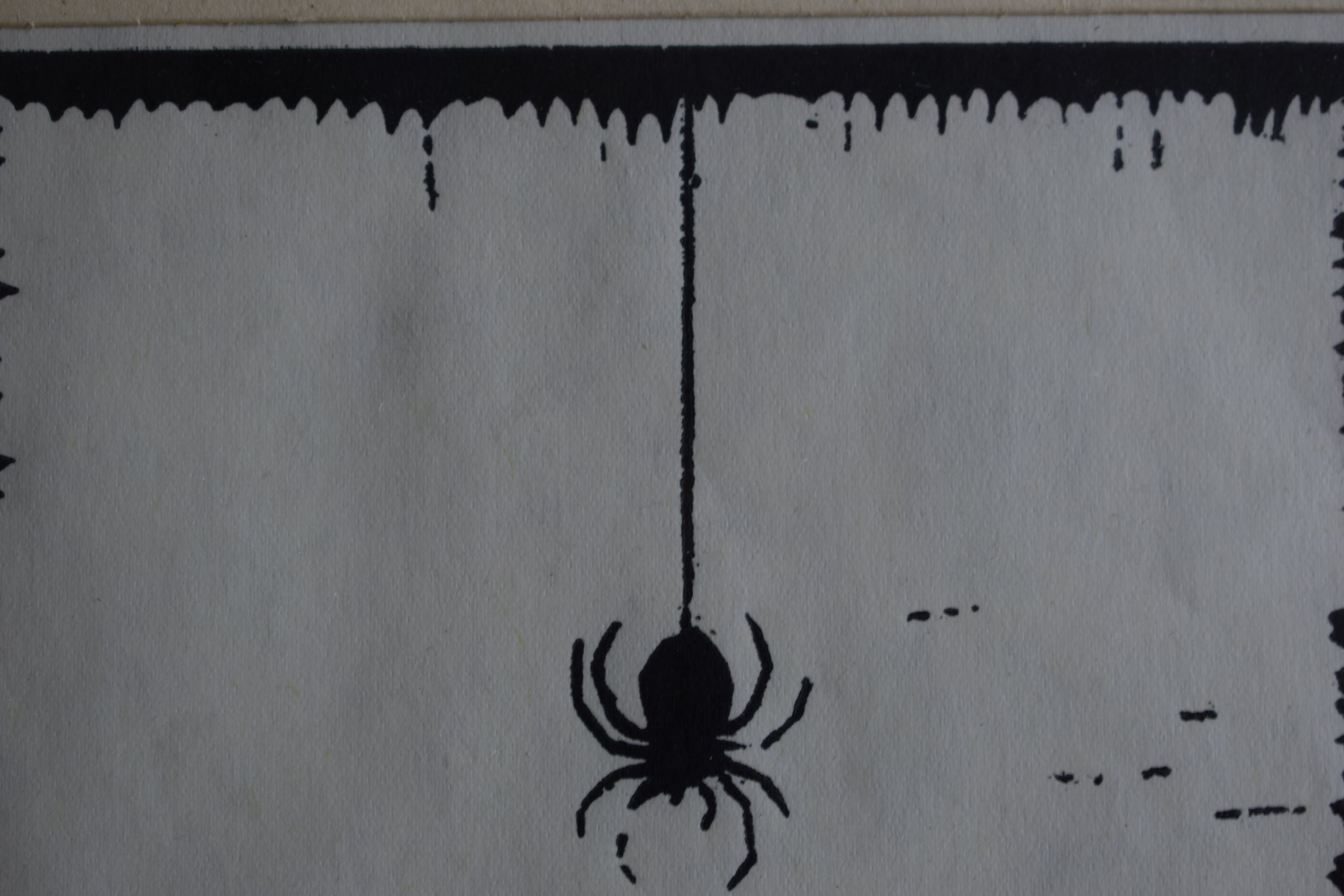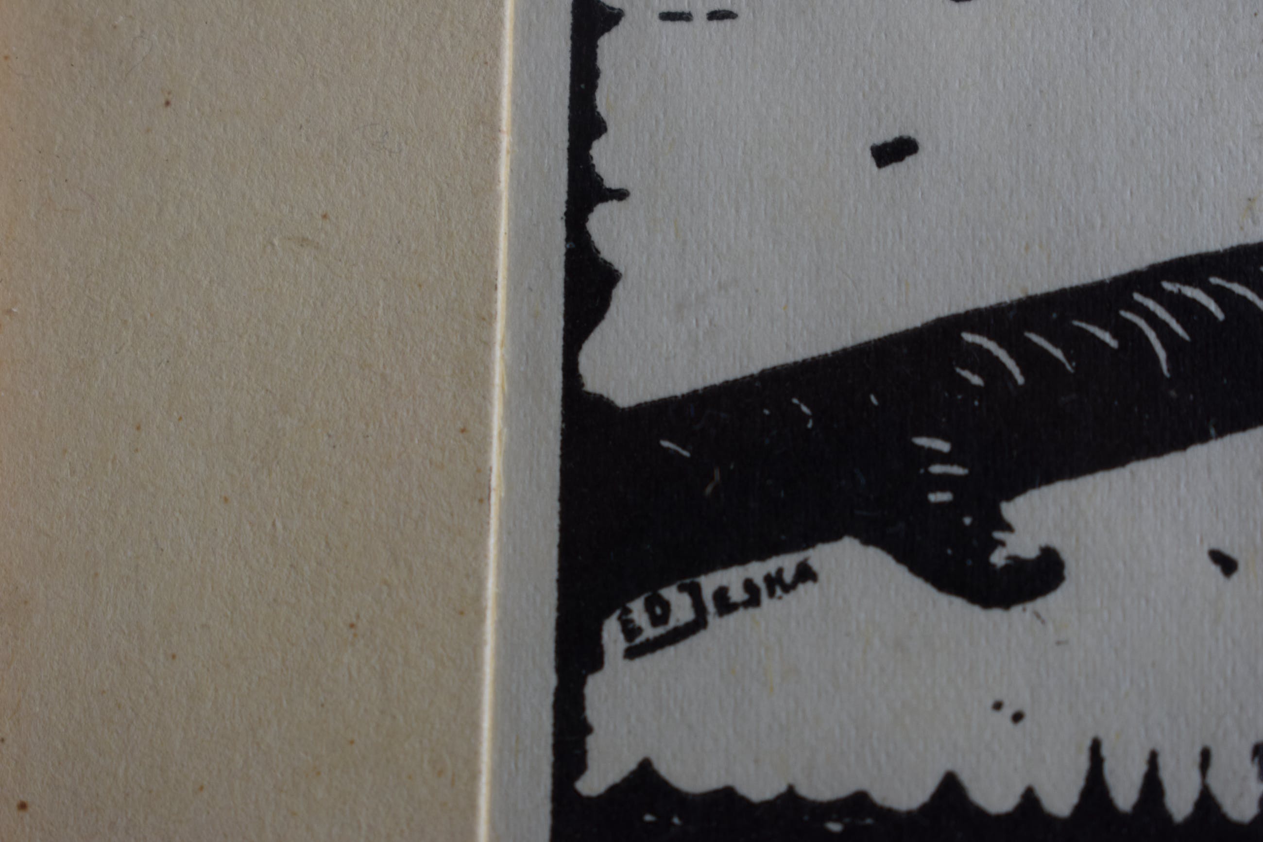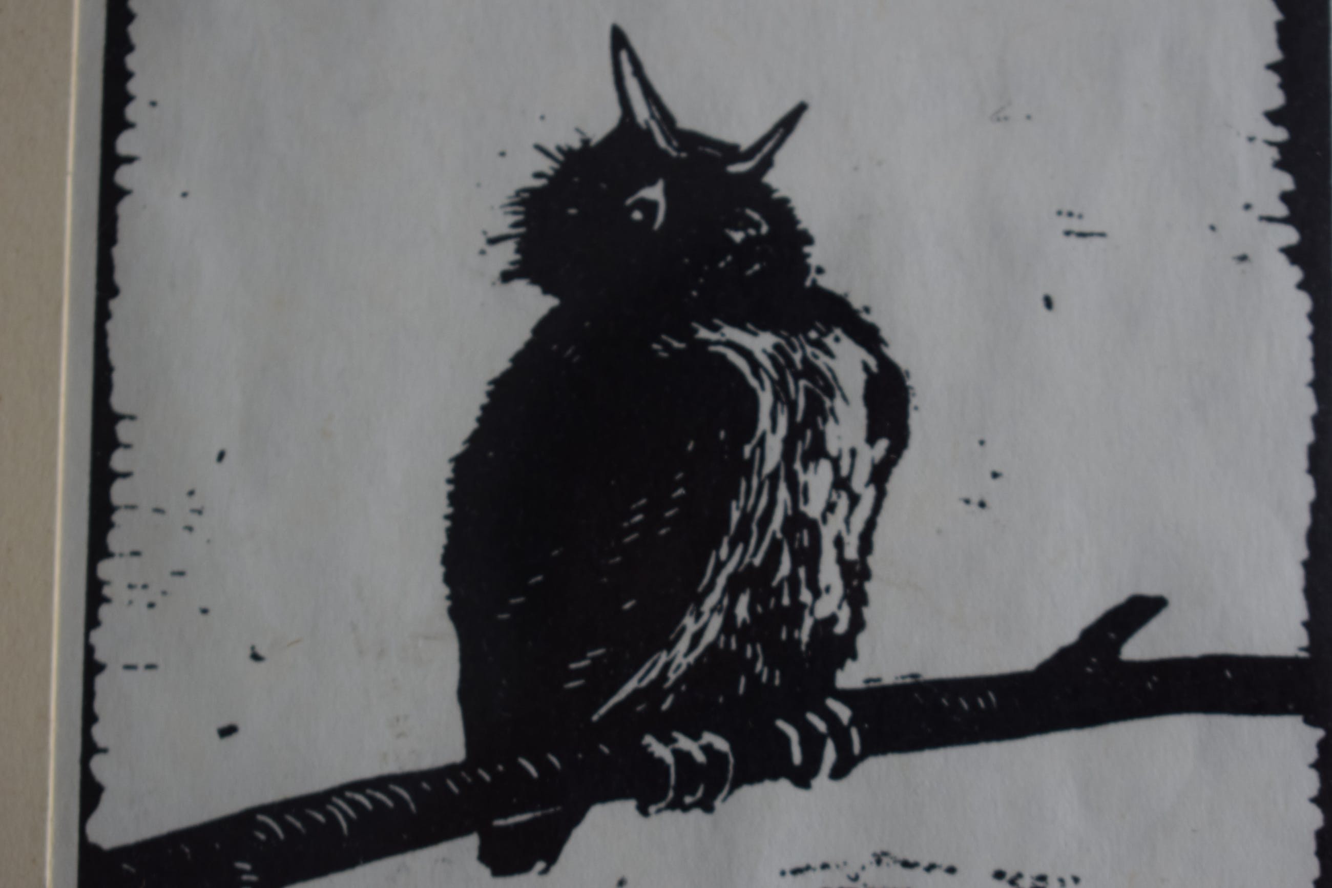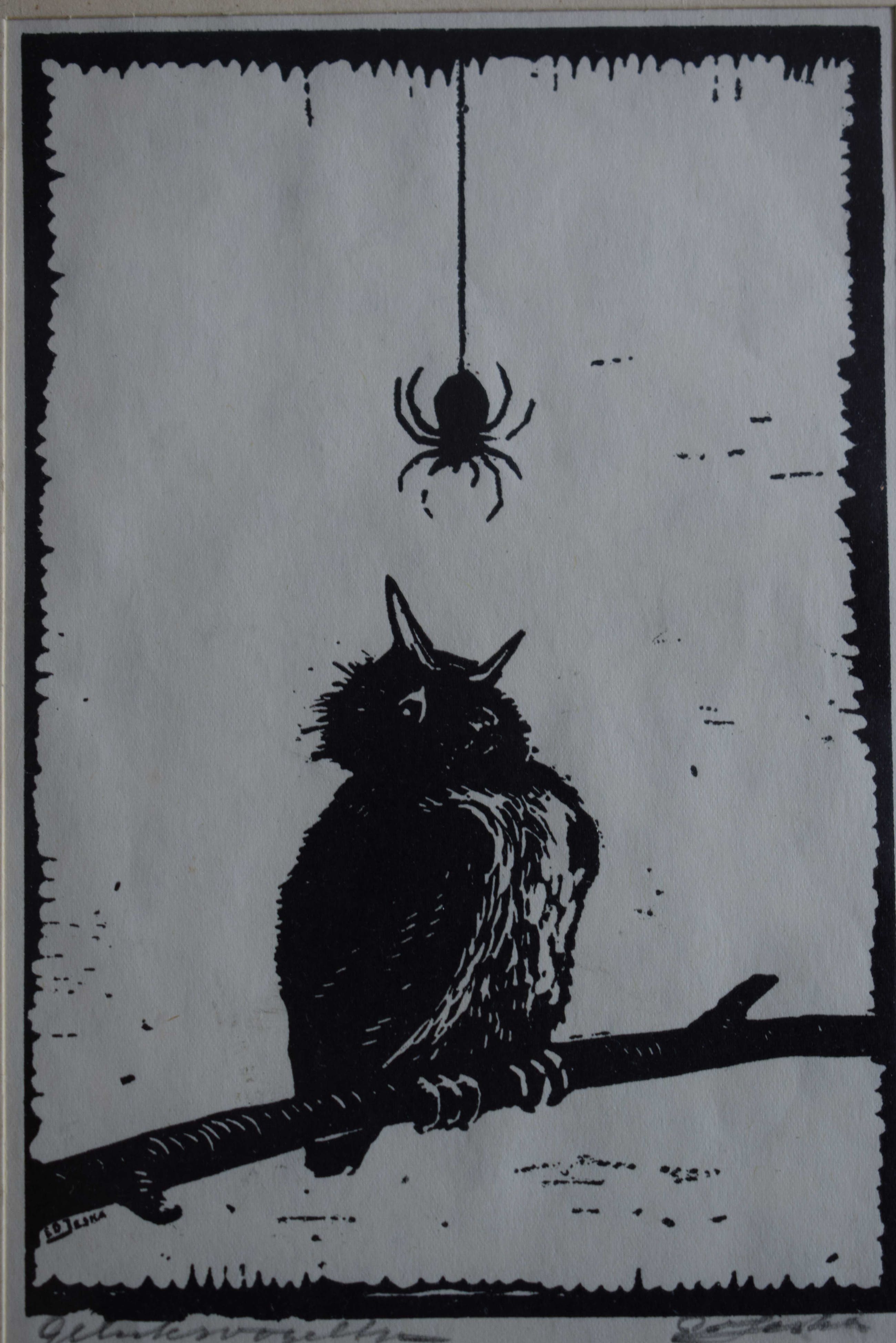 Mooie houtsnede van een jong vogeltje, dat het geluk heeft dat er zo meteen een spin in zijn bek z. al verdwijnen. Vandaar getiteld : "Geluksvogeltje"