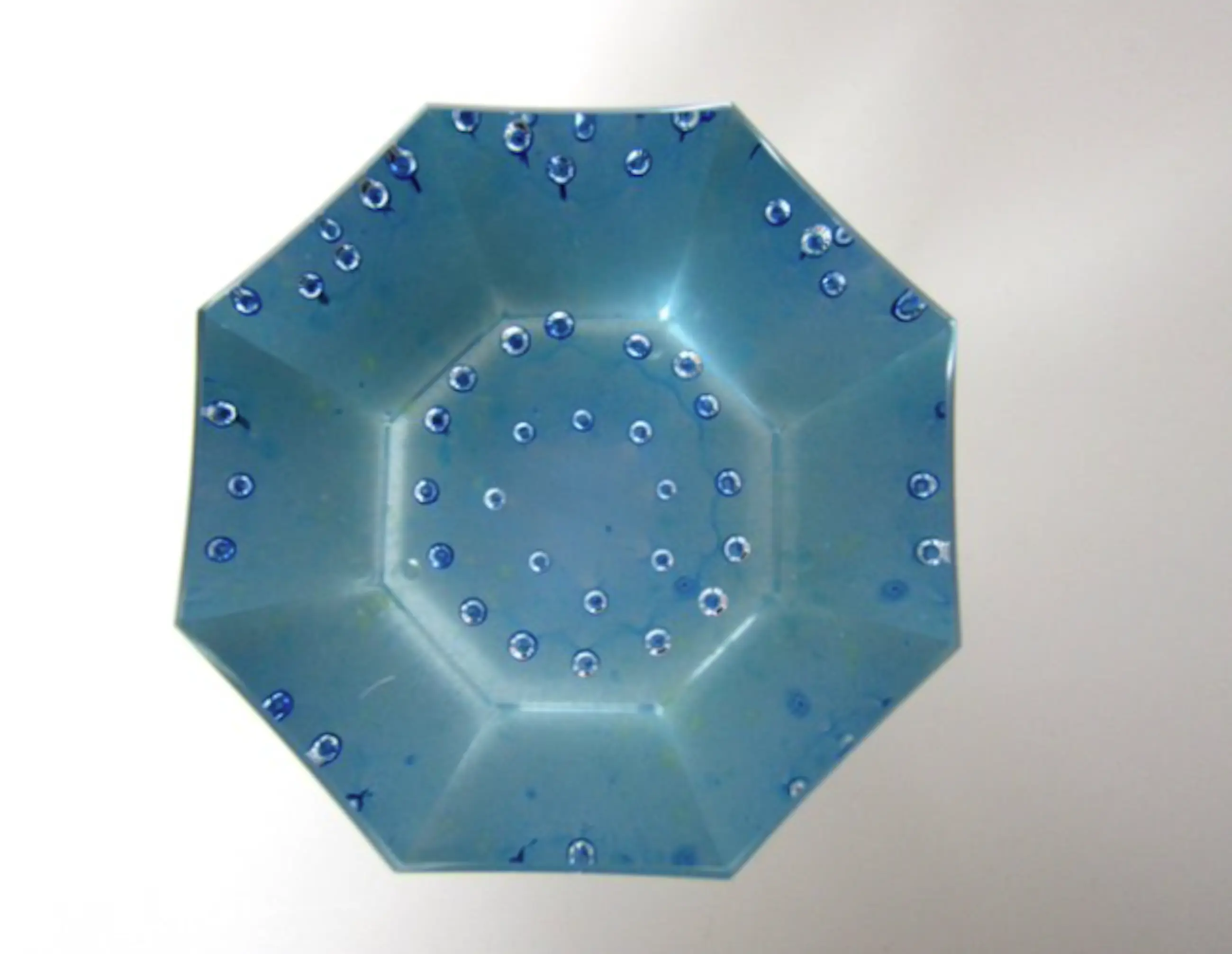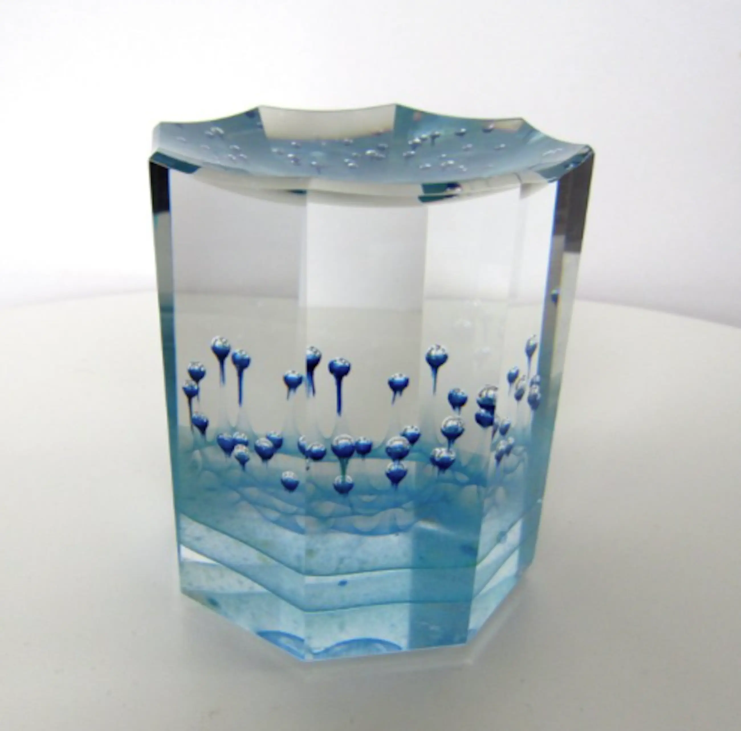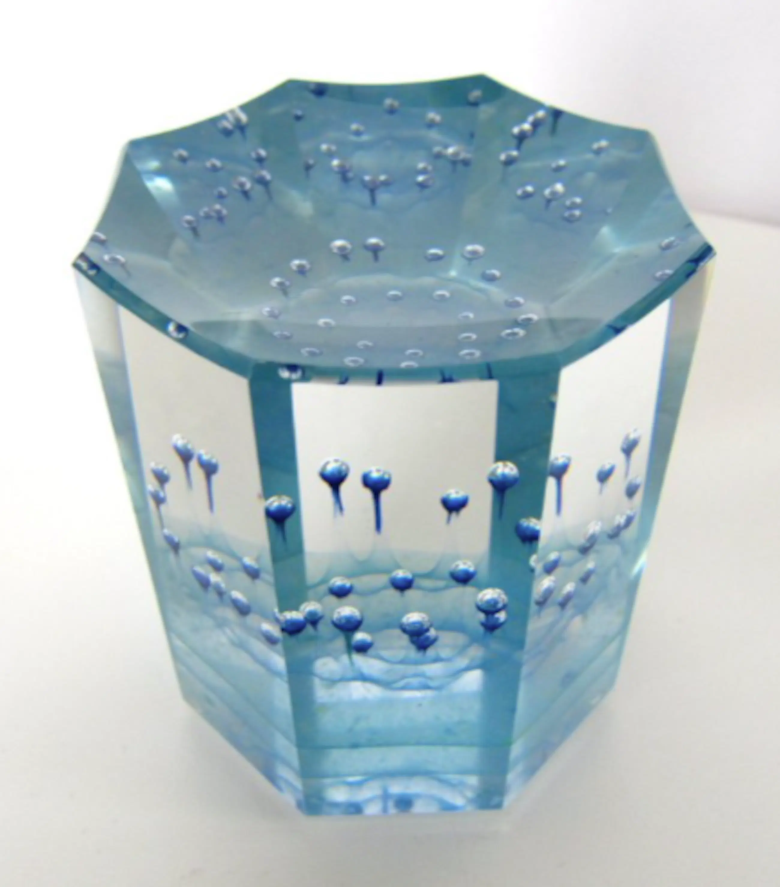 Fraai gemaakt 8-zijdig glazen object van Studio Jan Stohanzl Helder optisch glas met blauwe lagen en donker blauw ingesloten luchtbelletjes Gesigneerd 2006