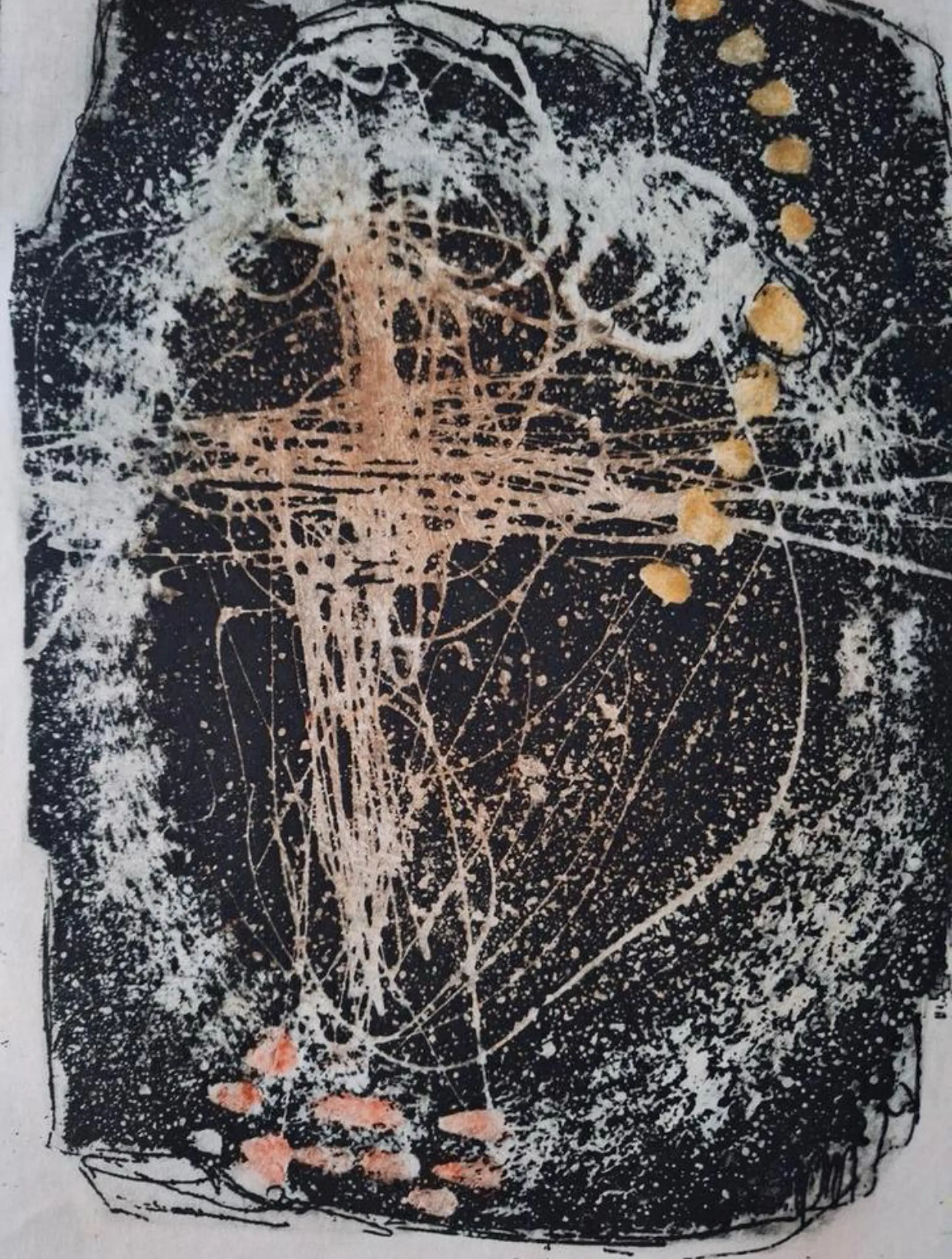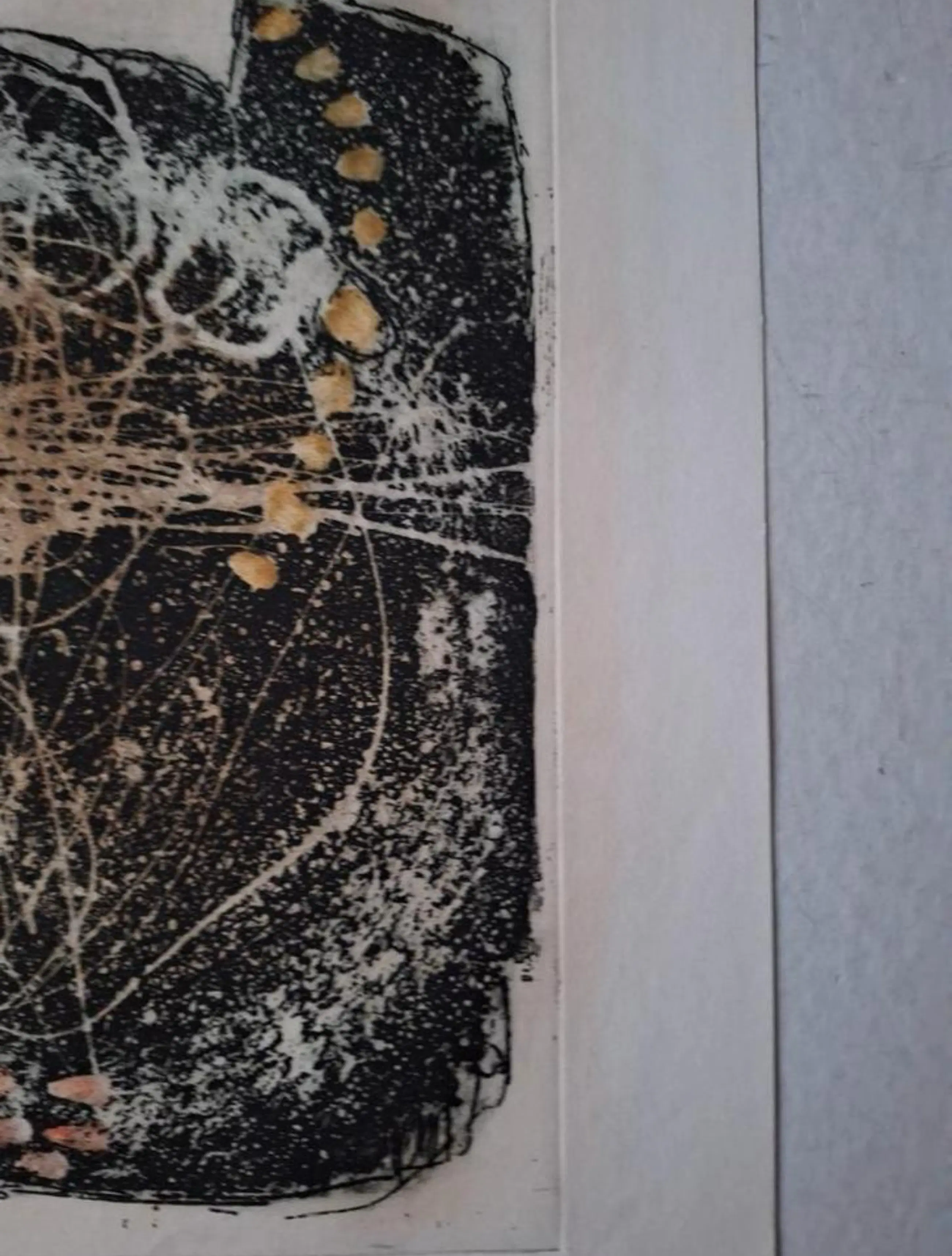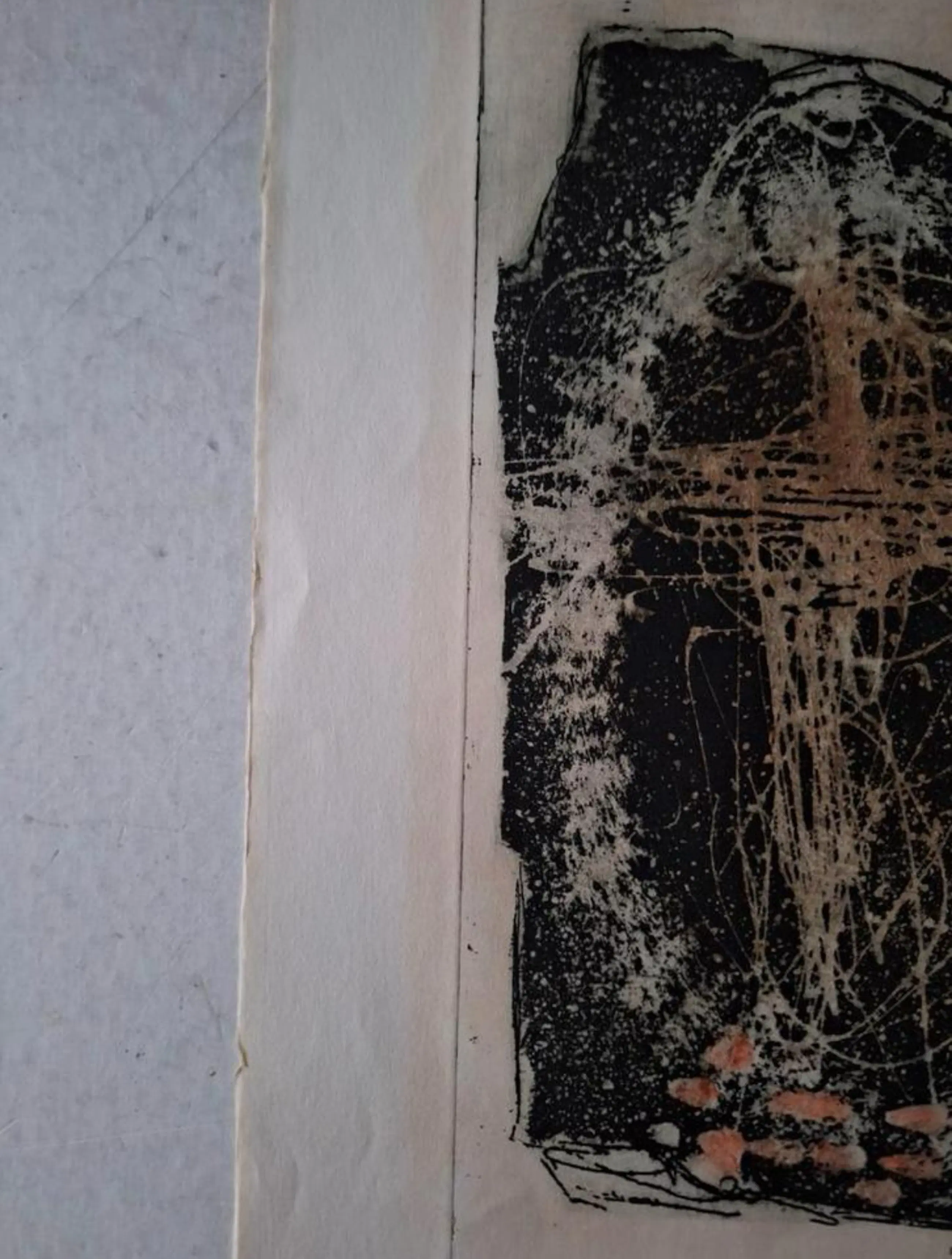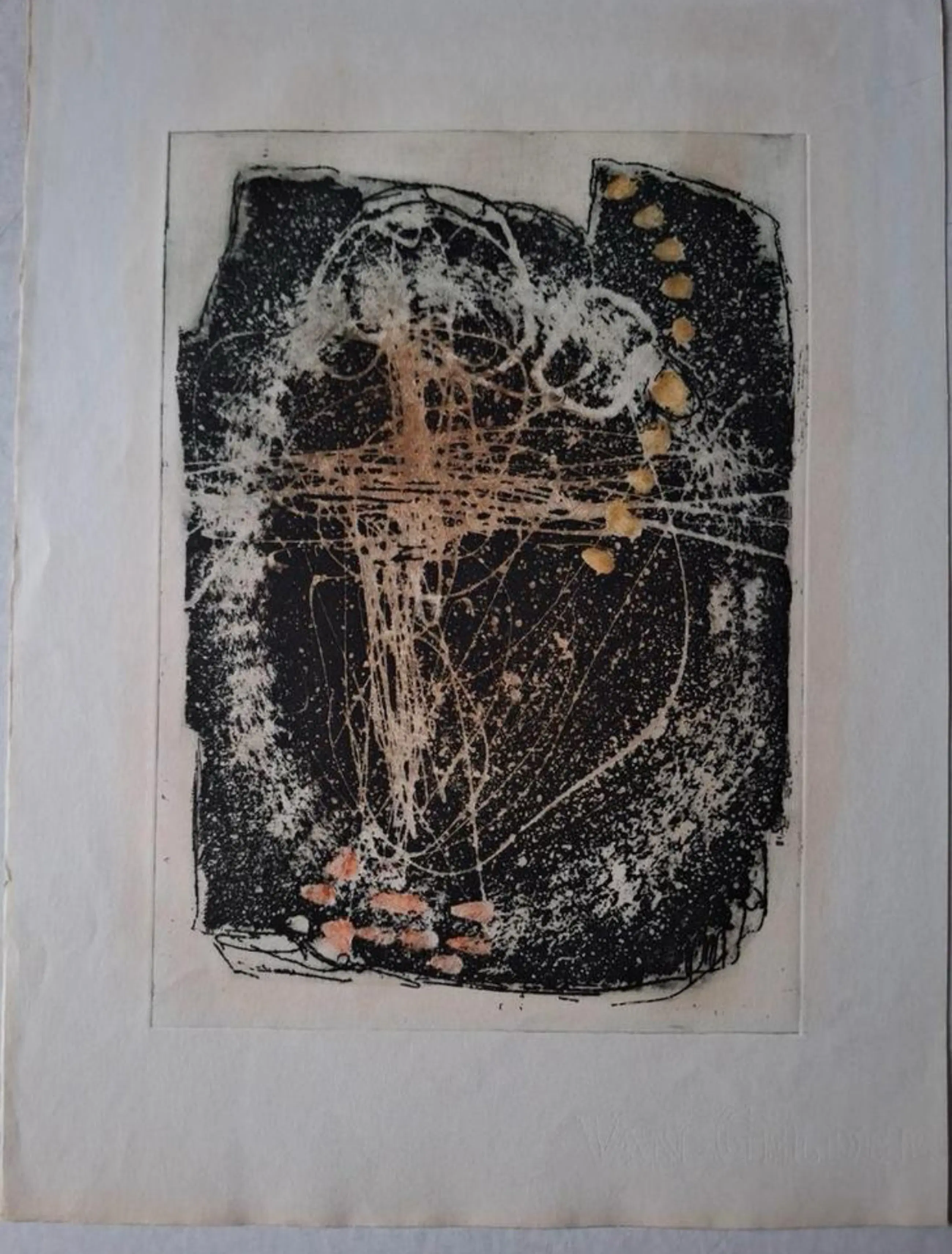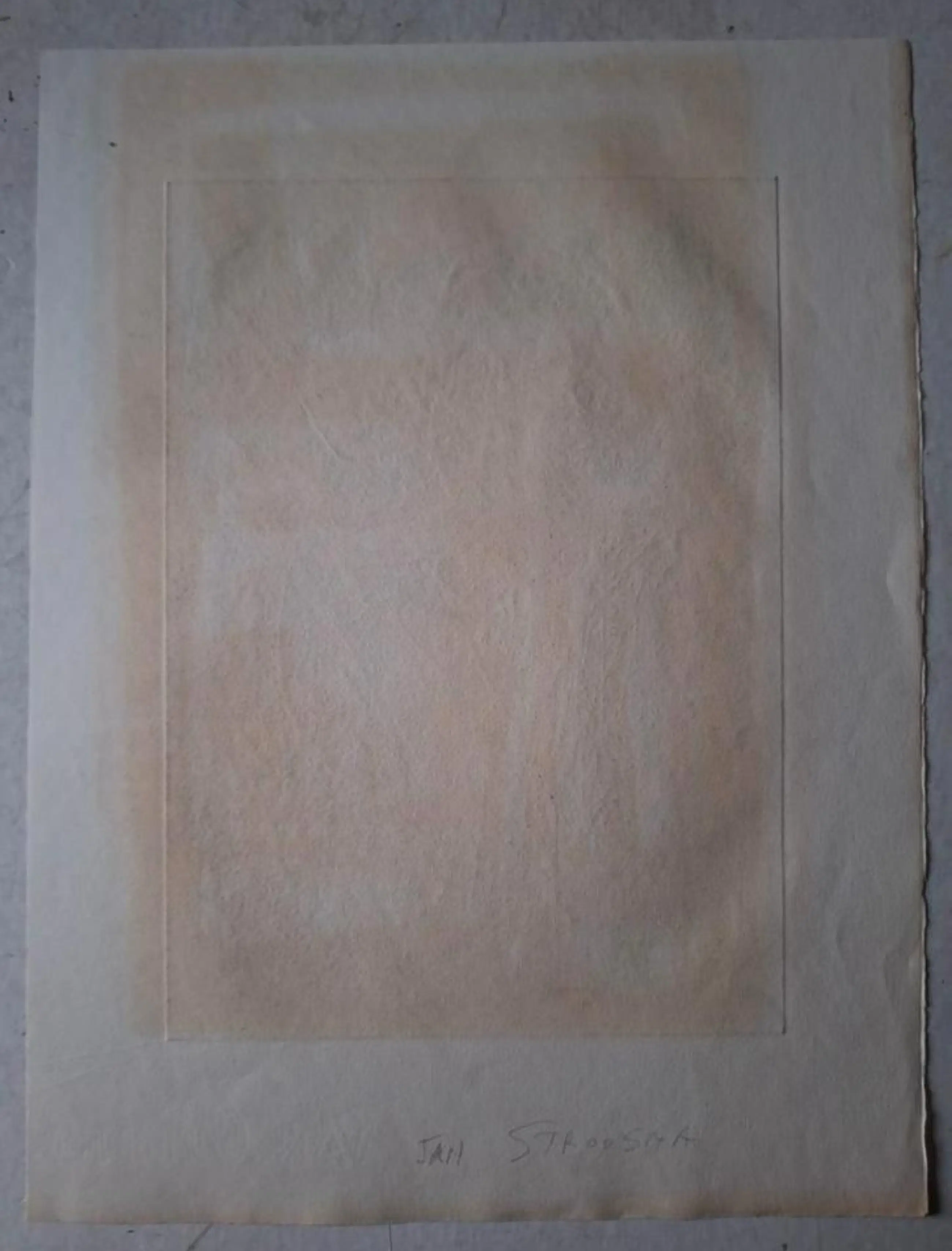 Mooie kleurets van de Nederlandse kunstenaar Jan Stroosma met een lyrisch abstracte compositie. De ets die niet is ingelijst werd gedrukt op handgeschept papier. Ze is niet gesigneerd, maar op de achterkant staat in potlood geschreven Jan Stroosma.