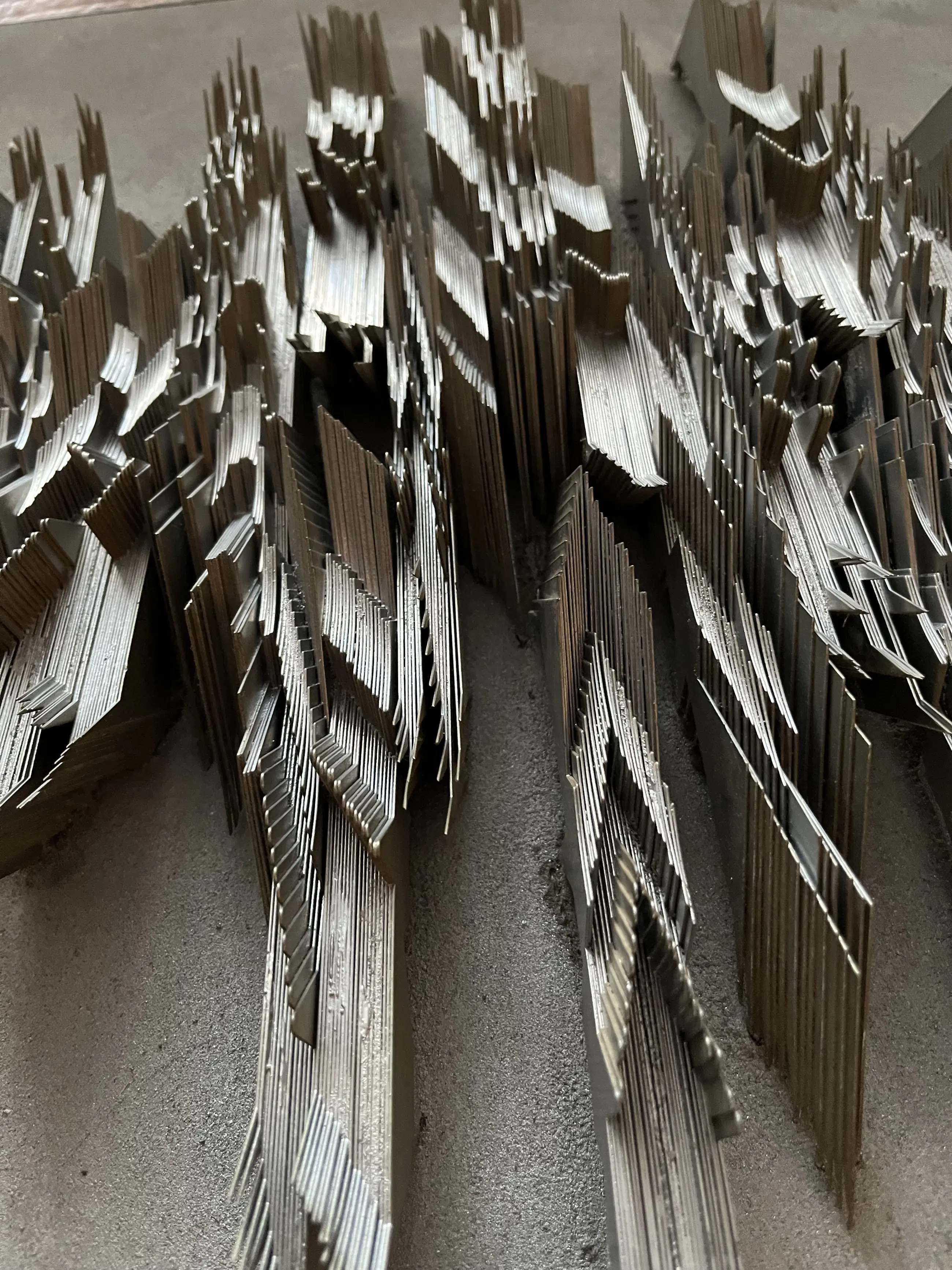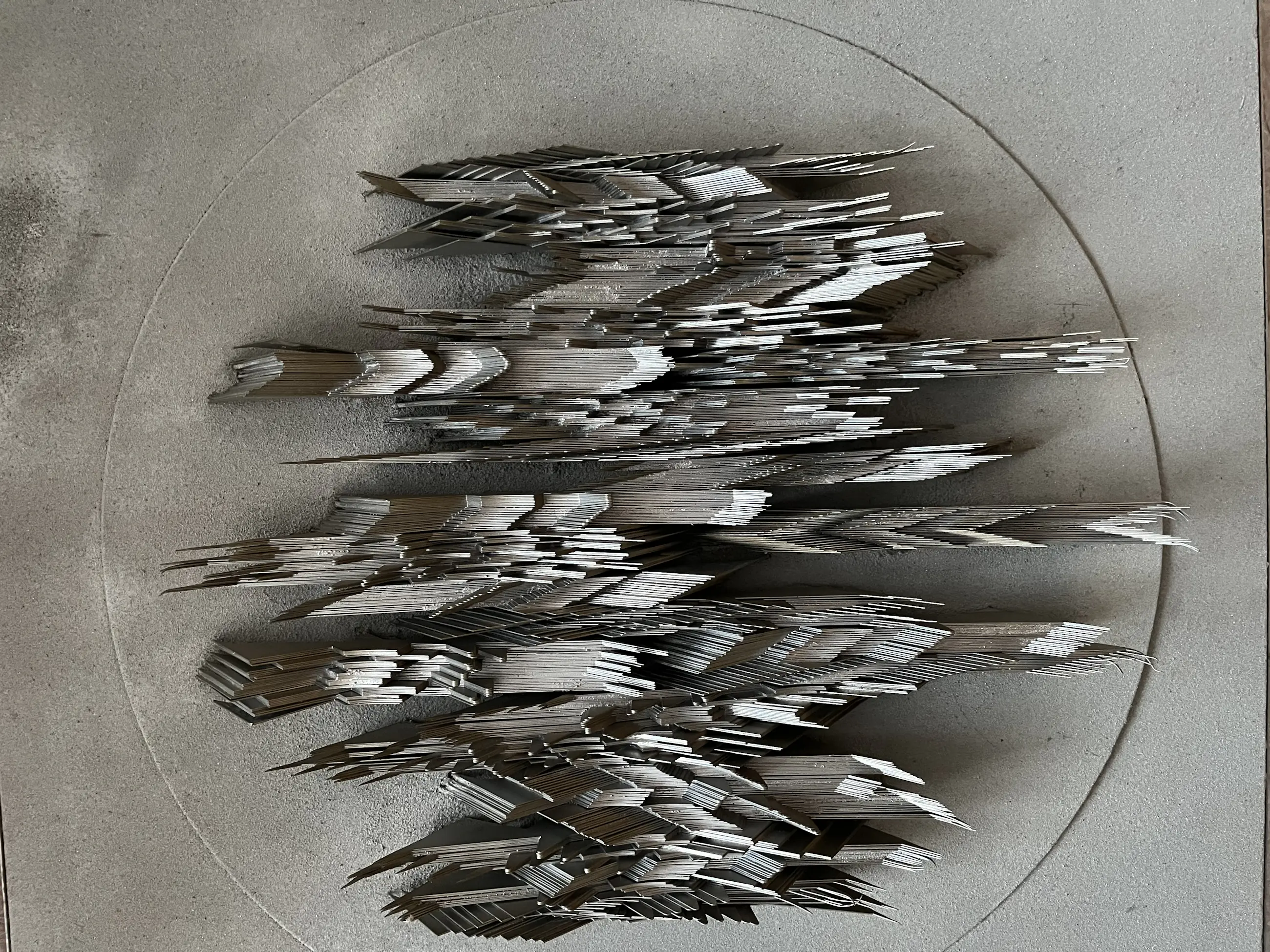 Dit werk komt uit een serie geïnspireerd op hedendaagse muziek. Fraai minimalistich wandsculptuur. Scherpe ijzeren plaatjes in een repeterende vorm geplakt op paneel. Afmeting onderplaat 60 x 60 cm. Diagonaal van de ronde waarin kunstwerk zit verwerkt is 50 cm. Afmeting kunstwerk zelf 34 x 44 x 5 cm. Totale kunstwerk weegt 13 kg.