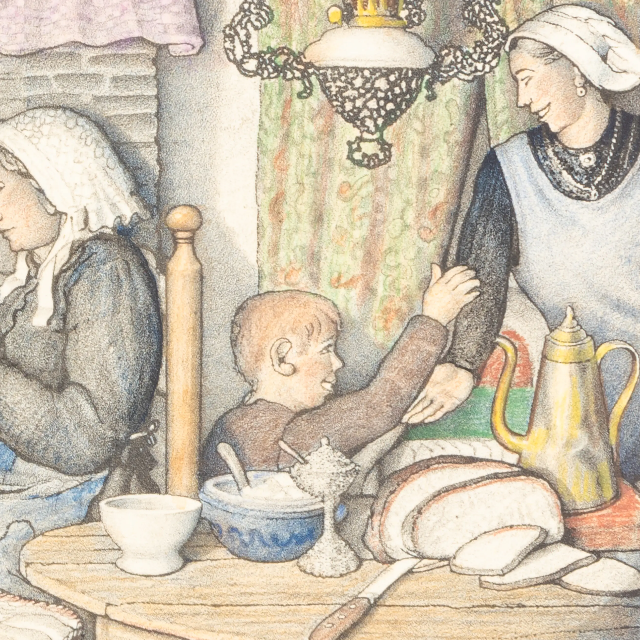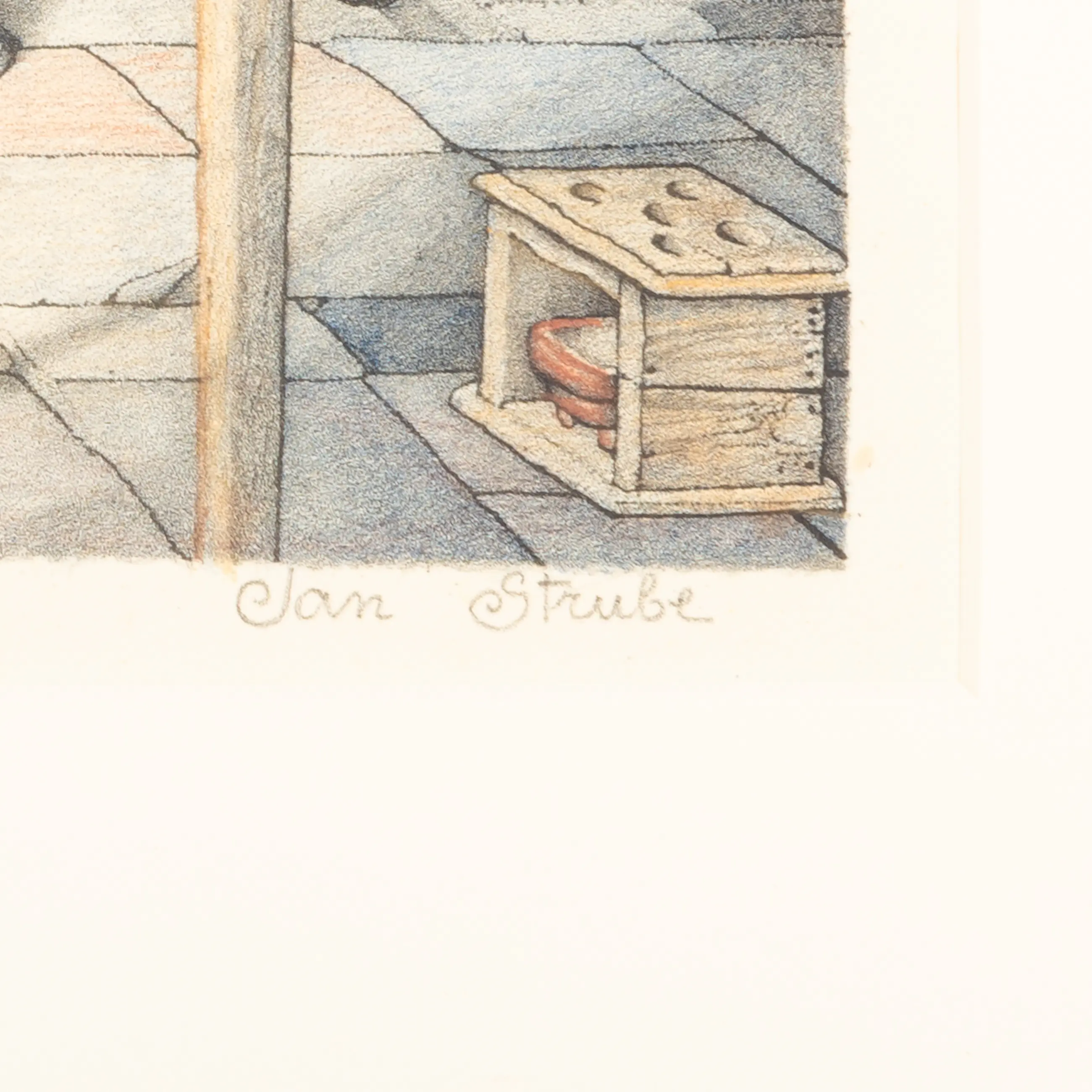 Dit is een druk van de Nederlandse kunstschilder Jan Strube (Amsterdam, 20 september 1892 – Lies, 9 november 1985), die een boereninterieur in Noord-Brabant rond 1900 verbeeldt. Strube woonde het grootste deel van zijn leven in Noord-Brabant en groeide uit tot een bekend kunstenaar in en rond Breda. In 1933 was hij medeoprichter van de Bredasche Kunstkring, samen met Gerrit de Morée, Dio Rovers en Paul Windhausen. Door zijn regionale betrokkenheid en herkenbare thematiek ontving hij in de loop der jaren steeds meer opdrachten.