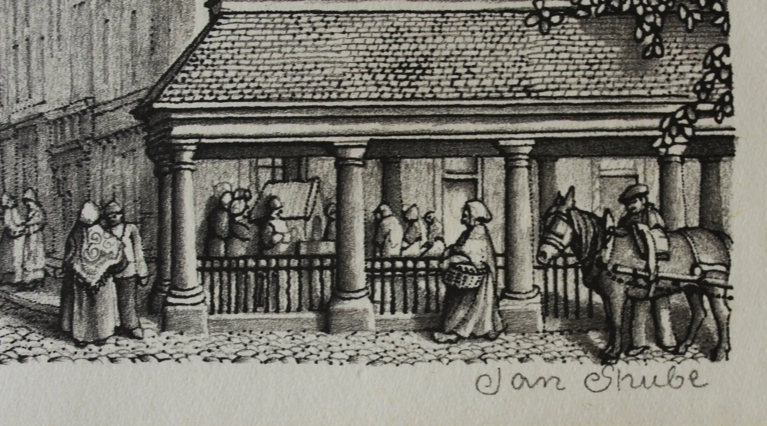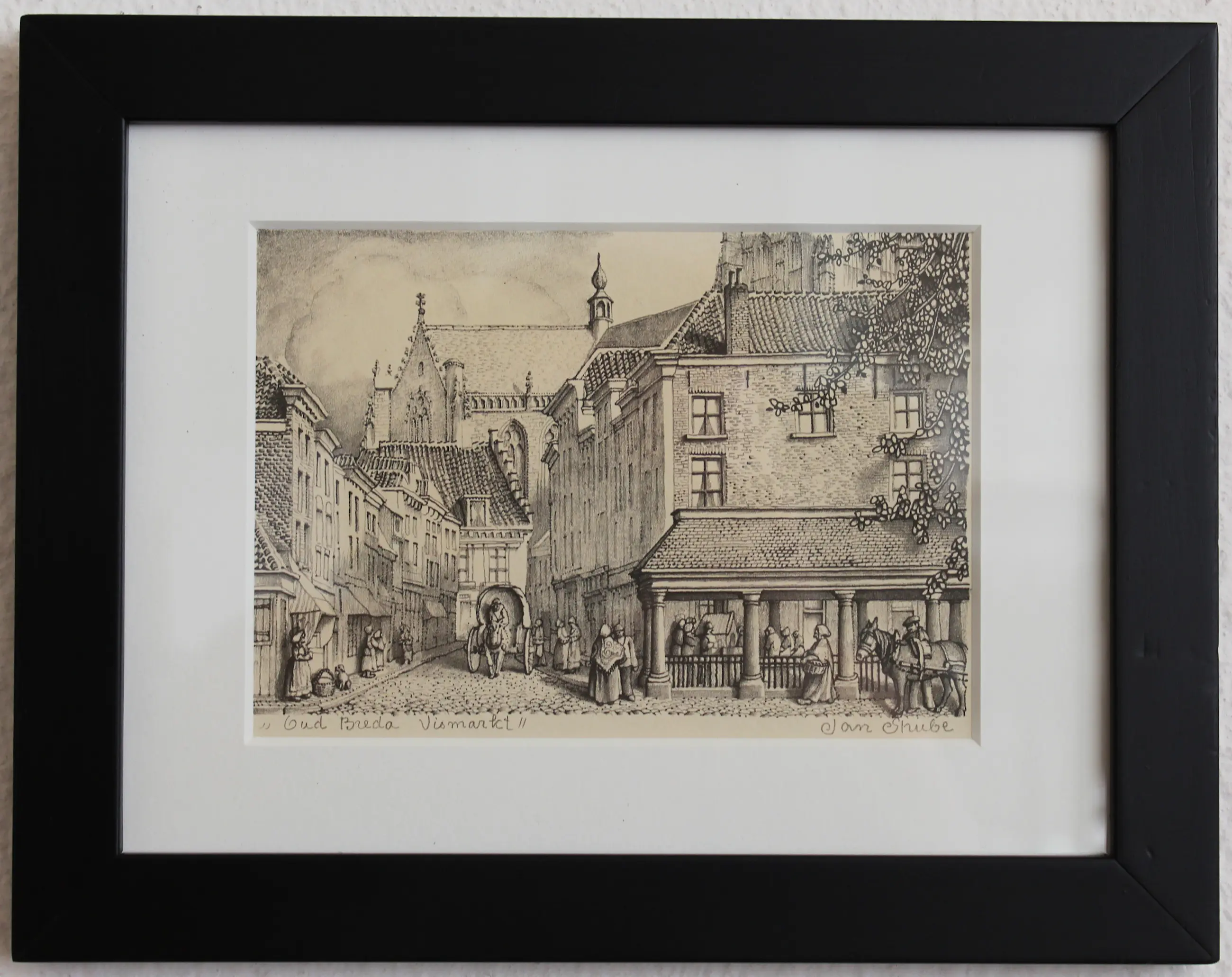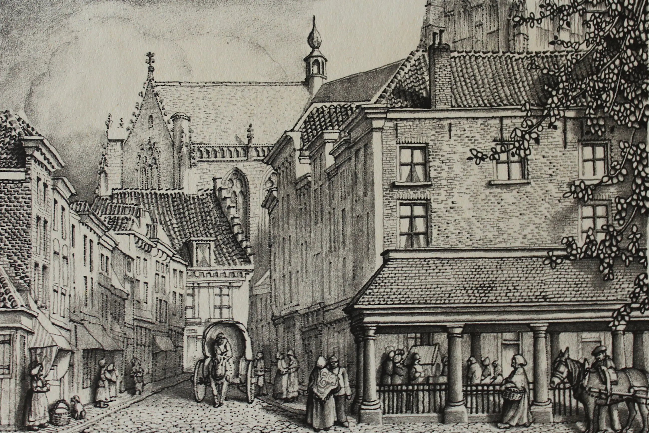 Bekende litho van de Brabantse kunstenaar Jan Strube. Litho met zeer veel details. Voorstelling van de oude vismarkt in Breda, wat nog steeds in deze vorm bestaat.