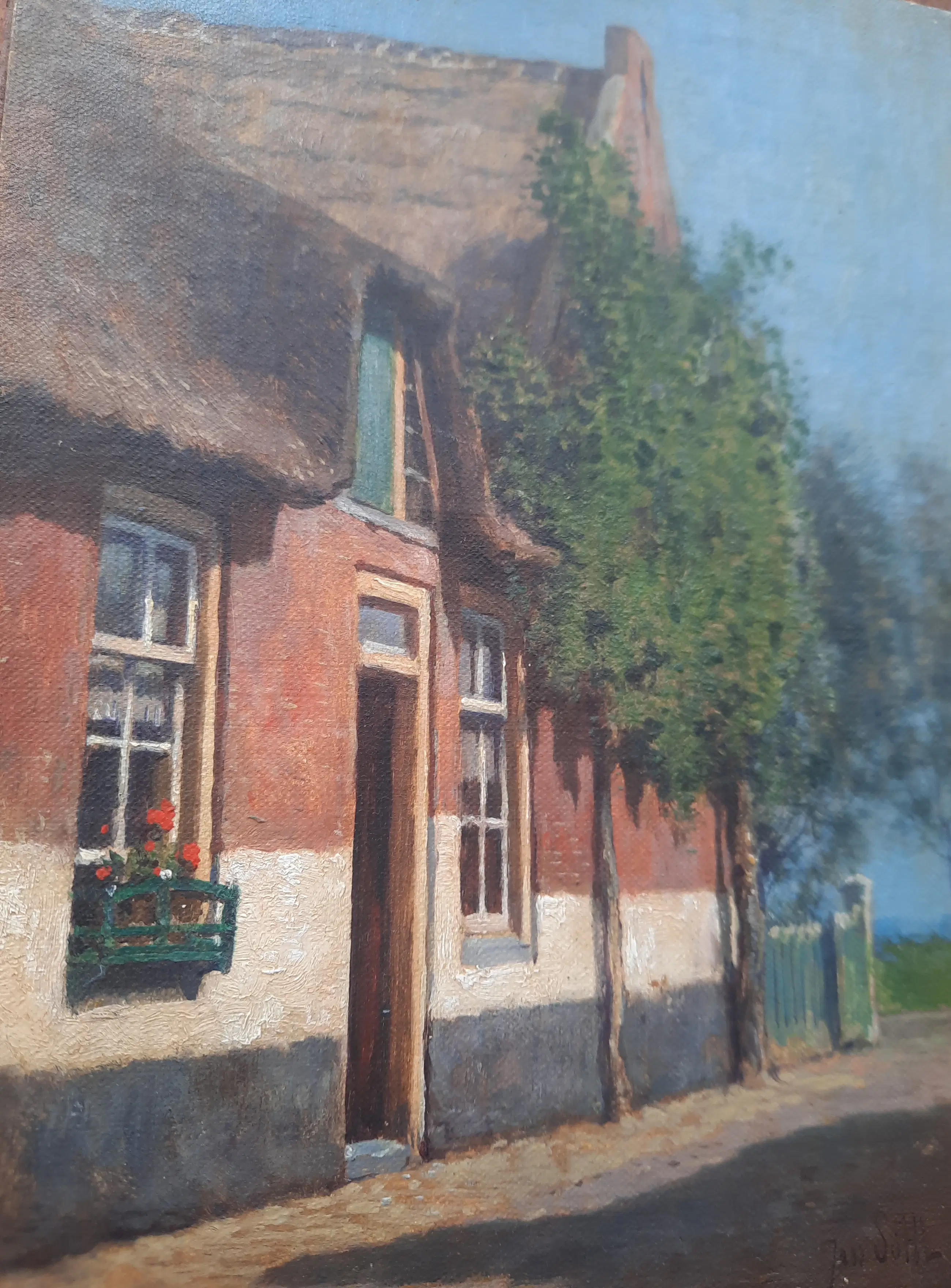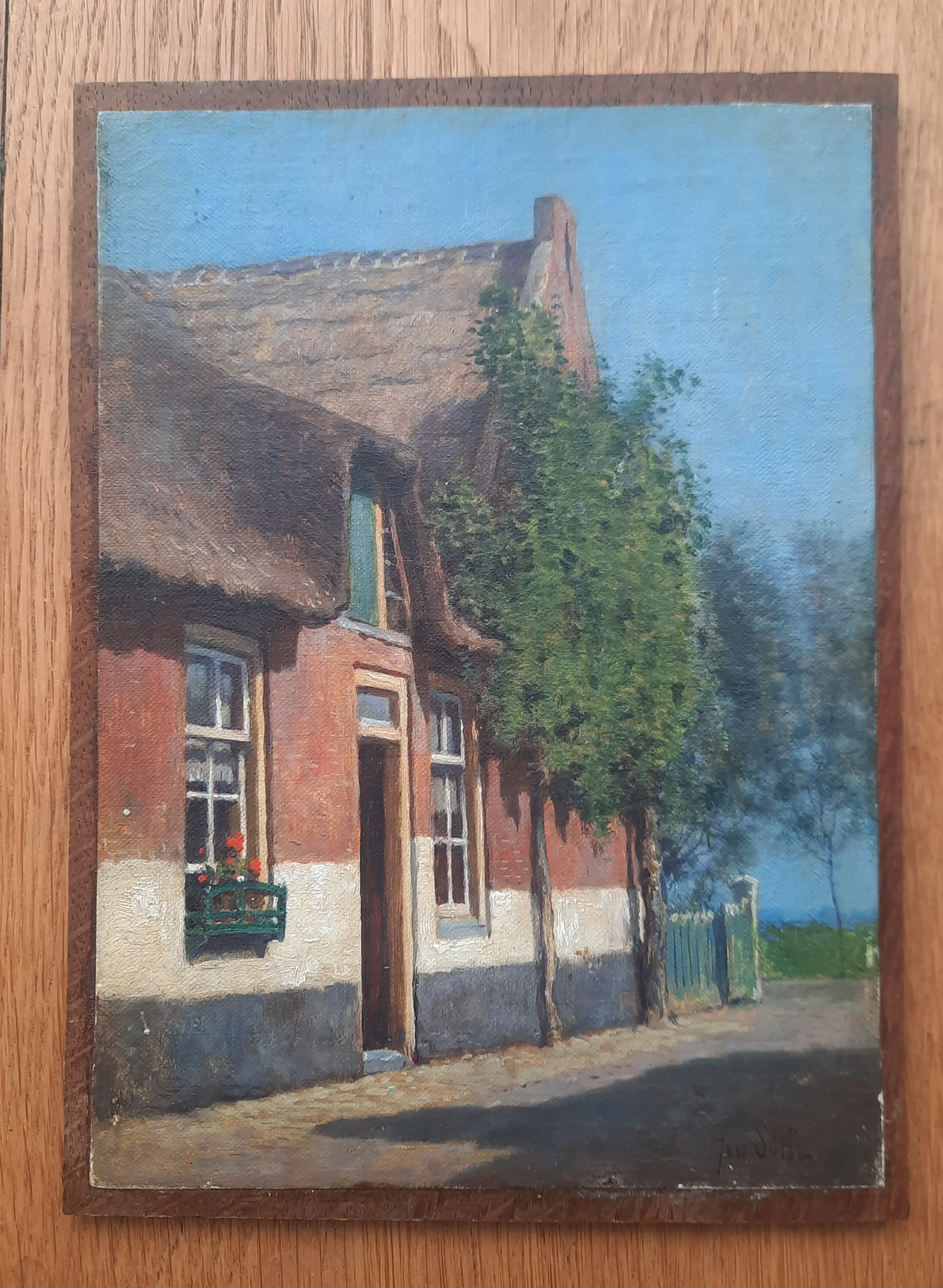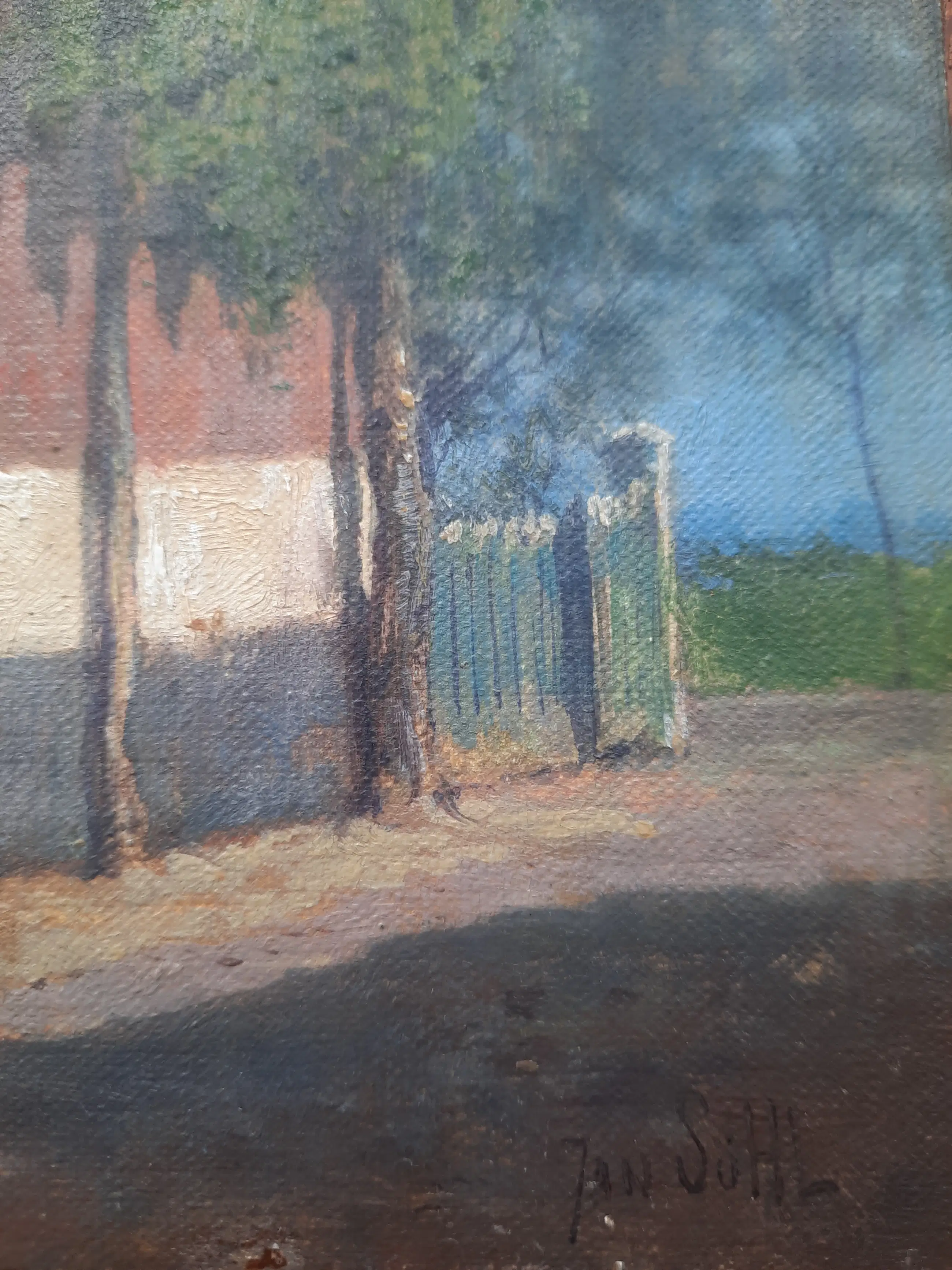 Fraai werk van Jan Sühl 1868 -1945 Een olieverf schilderij, geplakt door Sühl zelf op een eikenhouten paneel. Gesigneerd met de hand rechtsonder. Achterop het paneel met potlood geschreven :