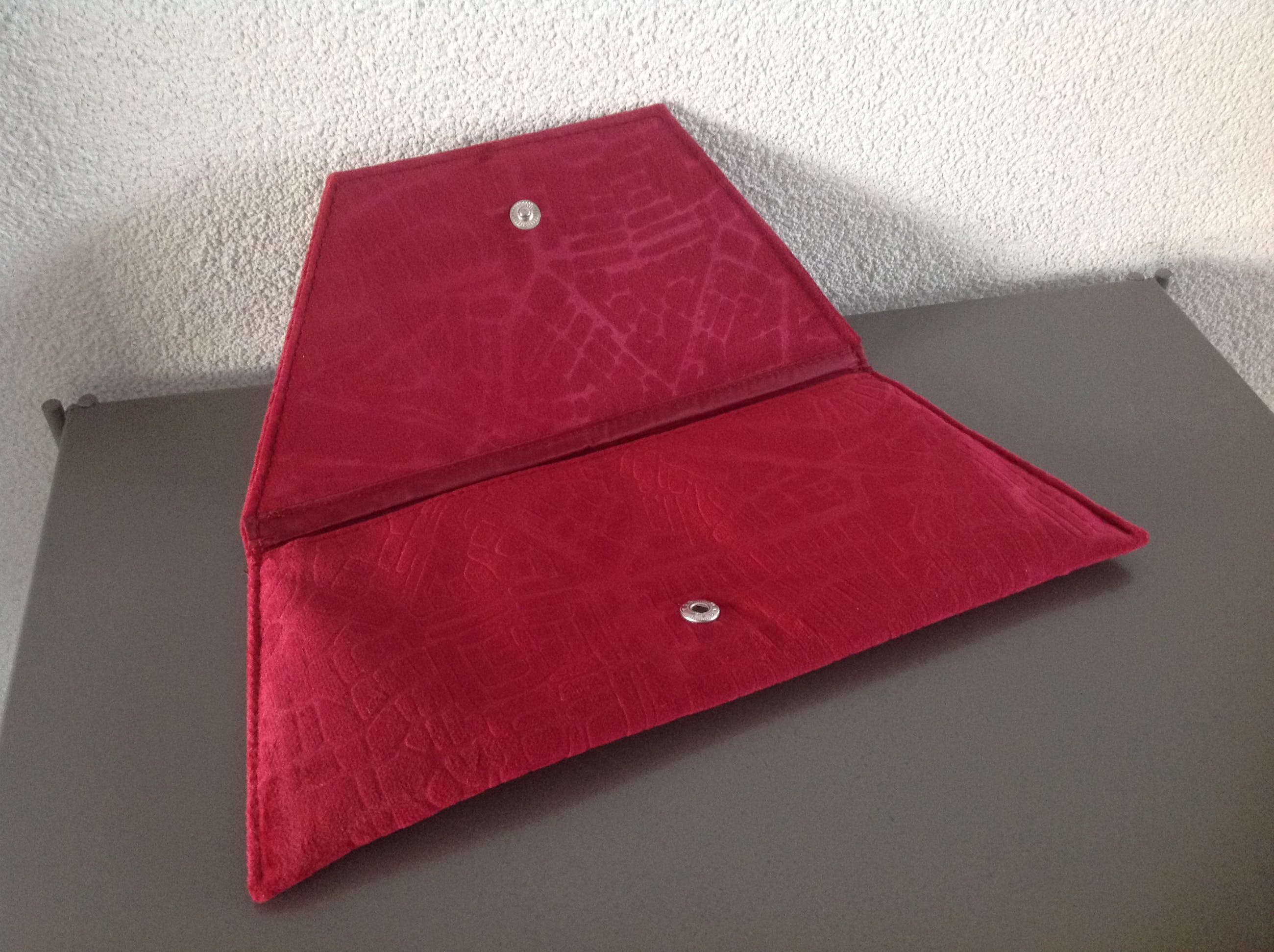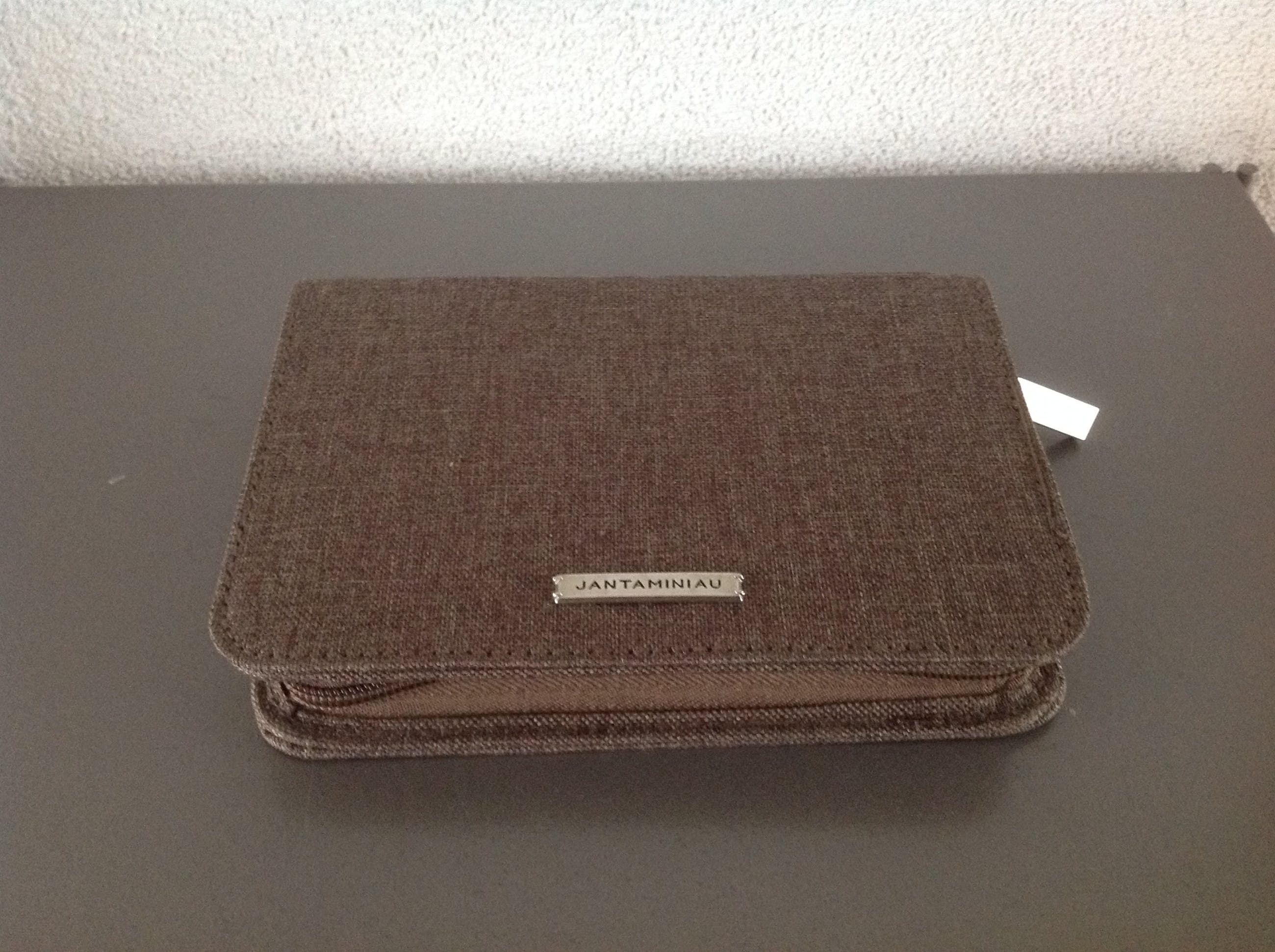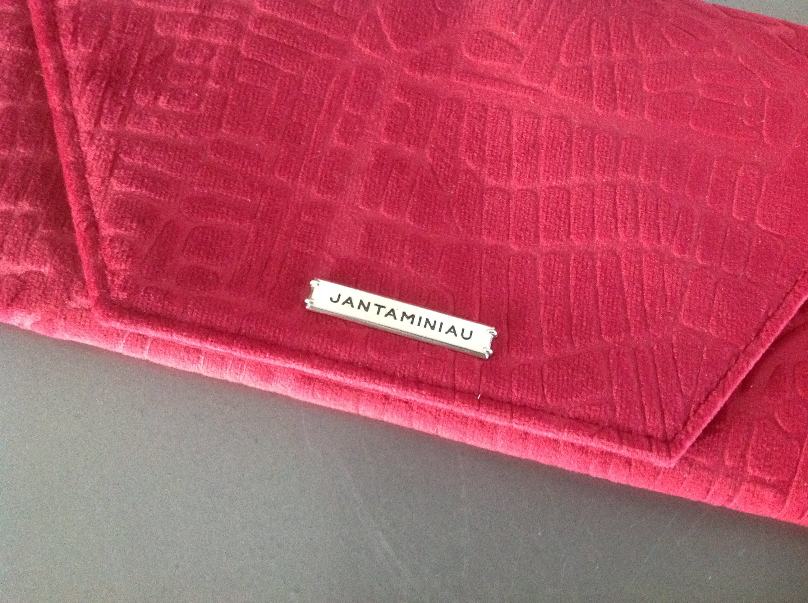 Het etui heeft op de buitenzijde een plaatje met de naam Jan Taminiau. In de binnenzijde een paar insteekvakjes en de gekroonde letters KLM.Het enveloptasje is van velours met motief en is aan de binnenkant gevoerd. Ook dit tasje heeft aan de buitenkant een plaatje met Jan Taminiau.Het tasje heeft de vorm van een trapeze. Lengte onderzijde 28cm, bovenzijde 23 cm en de hoogte 11,5 cm.