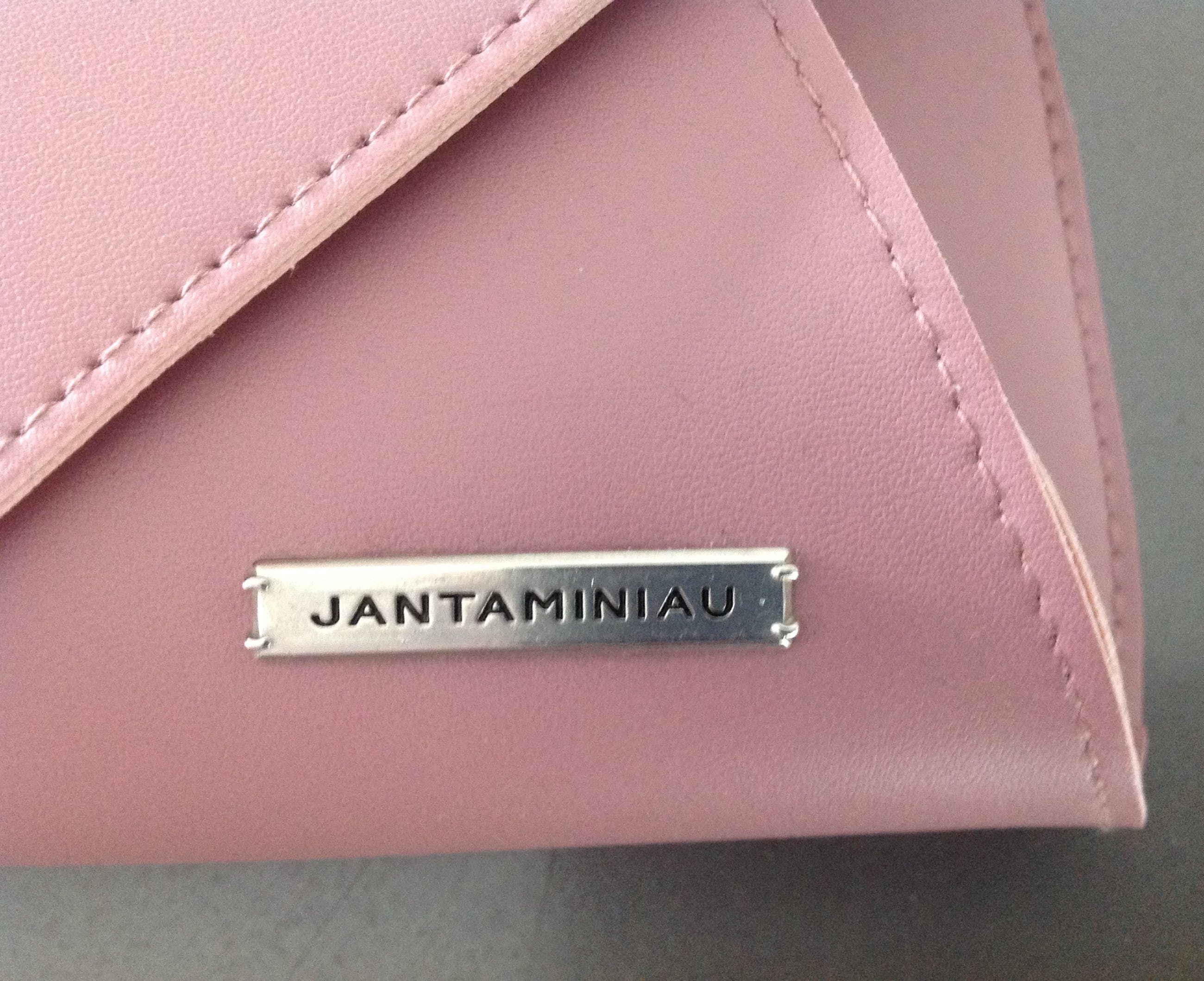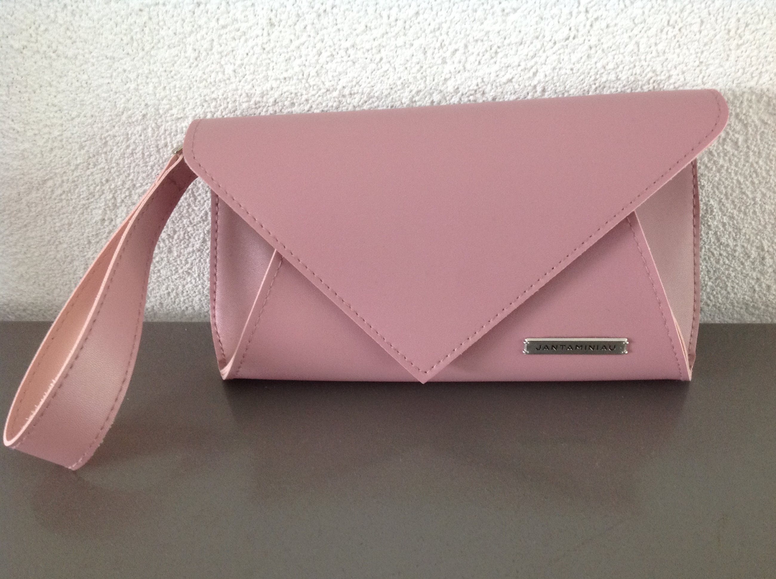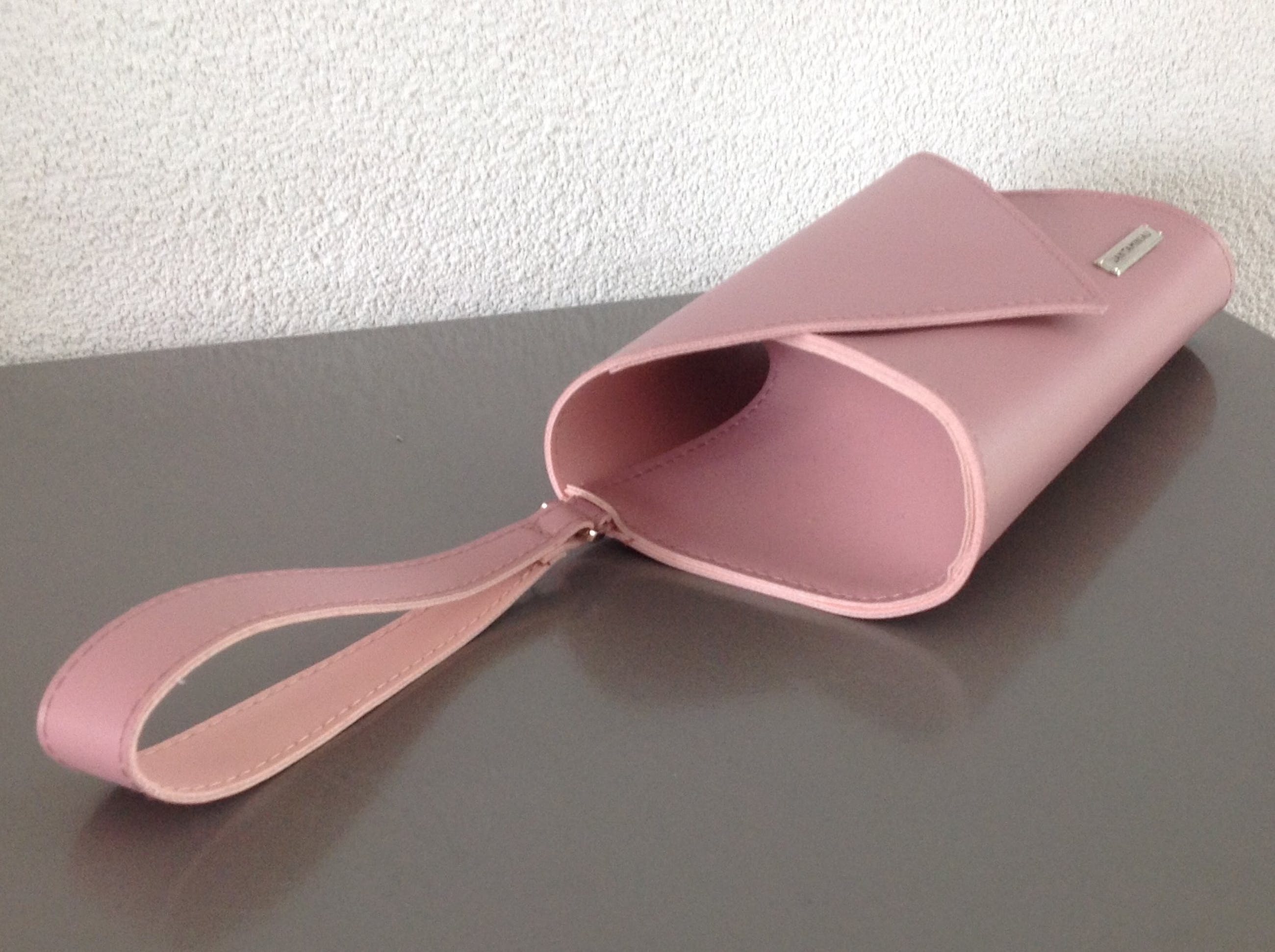 Een oud-rose KLM-etui in de vorm van een envelop. Met draagriempje en magnetische sluiting.