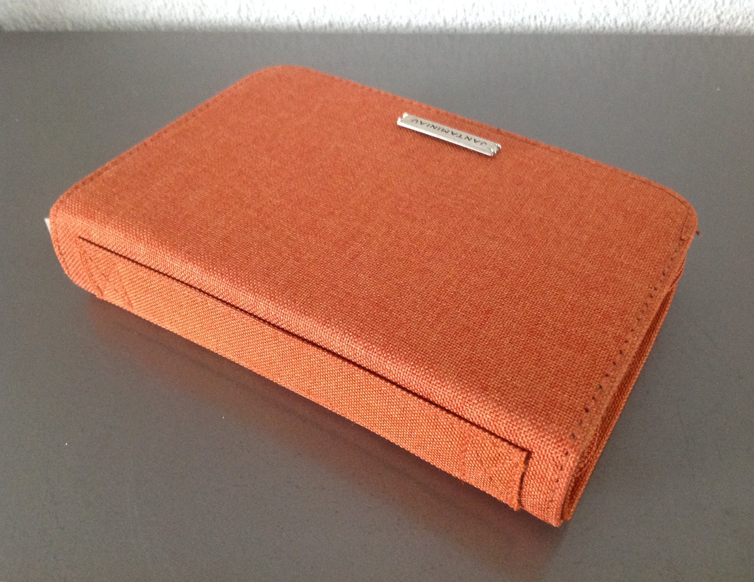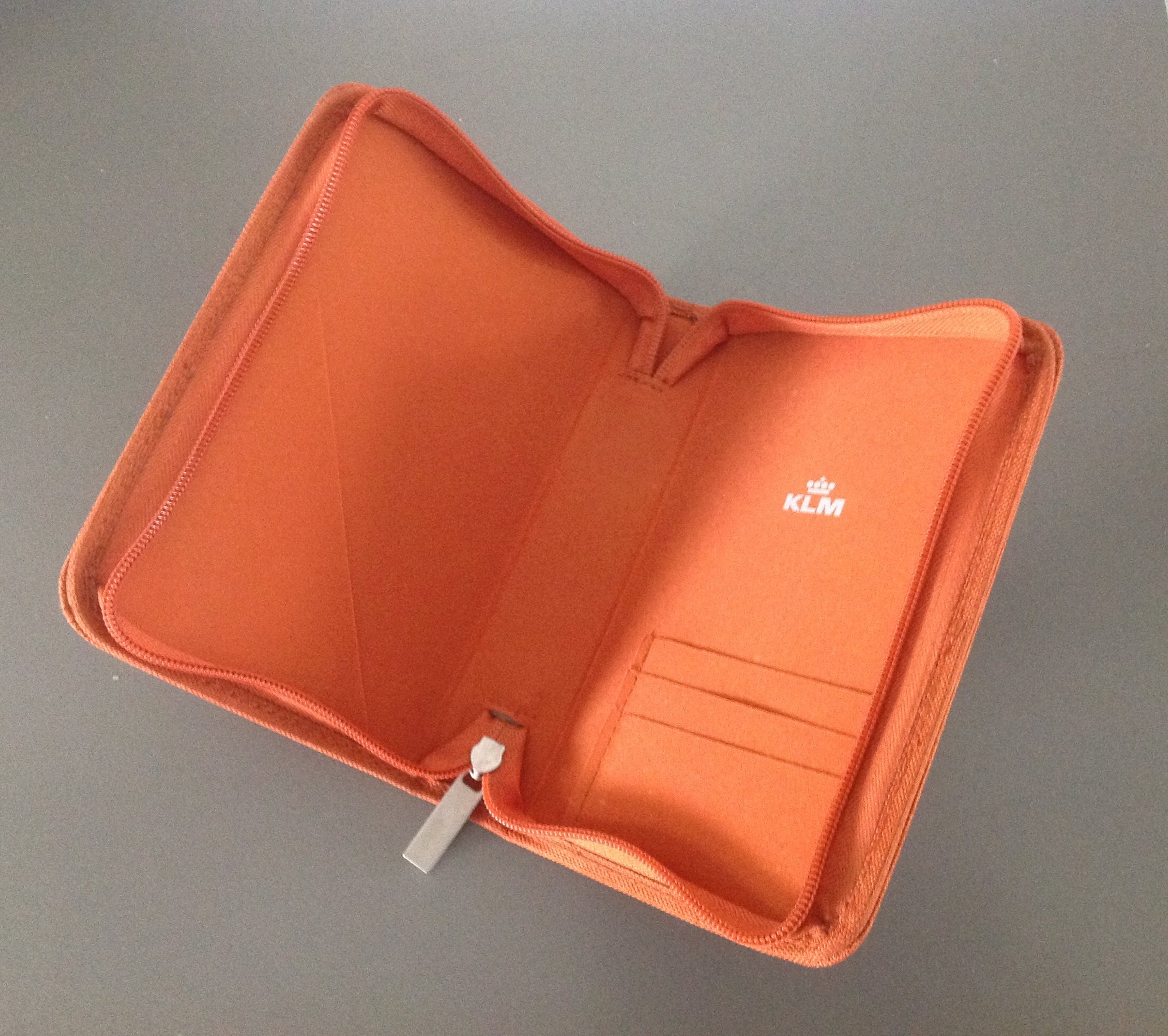 Een Jan Taminiau-etui in een mooie oranje kleur. Op de buitenzijde een plaatje met zijn naam. In de binnenzijde een paar insteekvakjes en de gekroonde letters KLM.