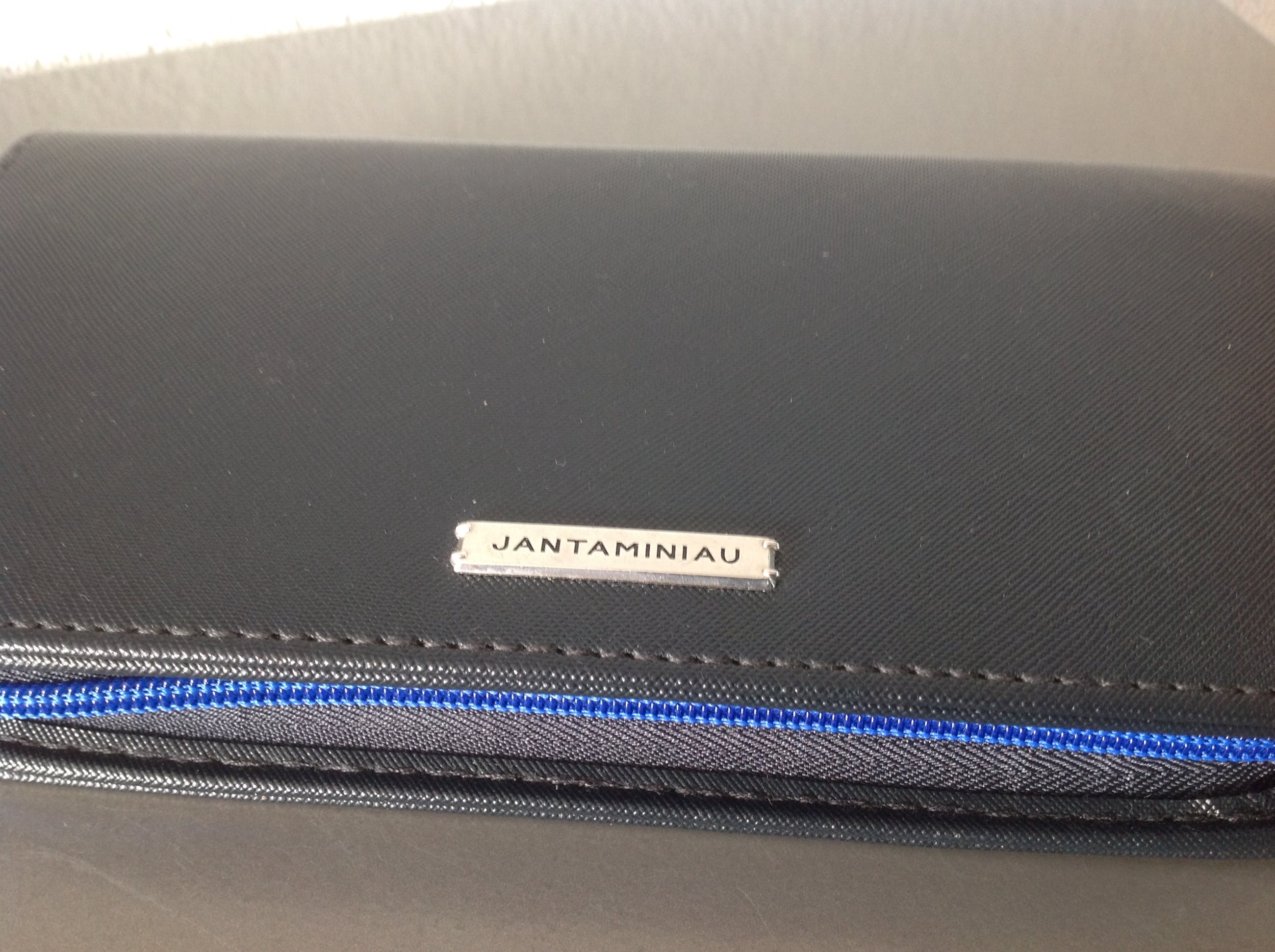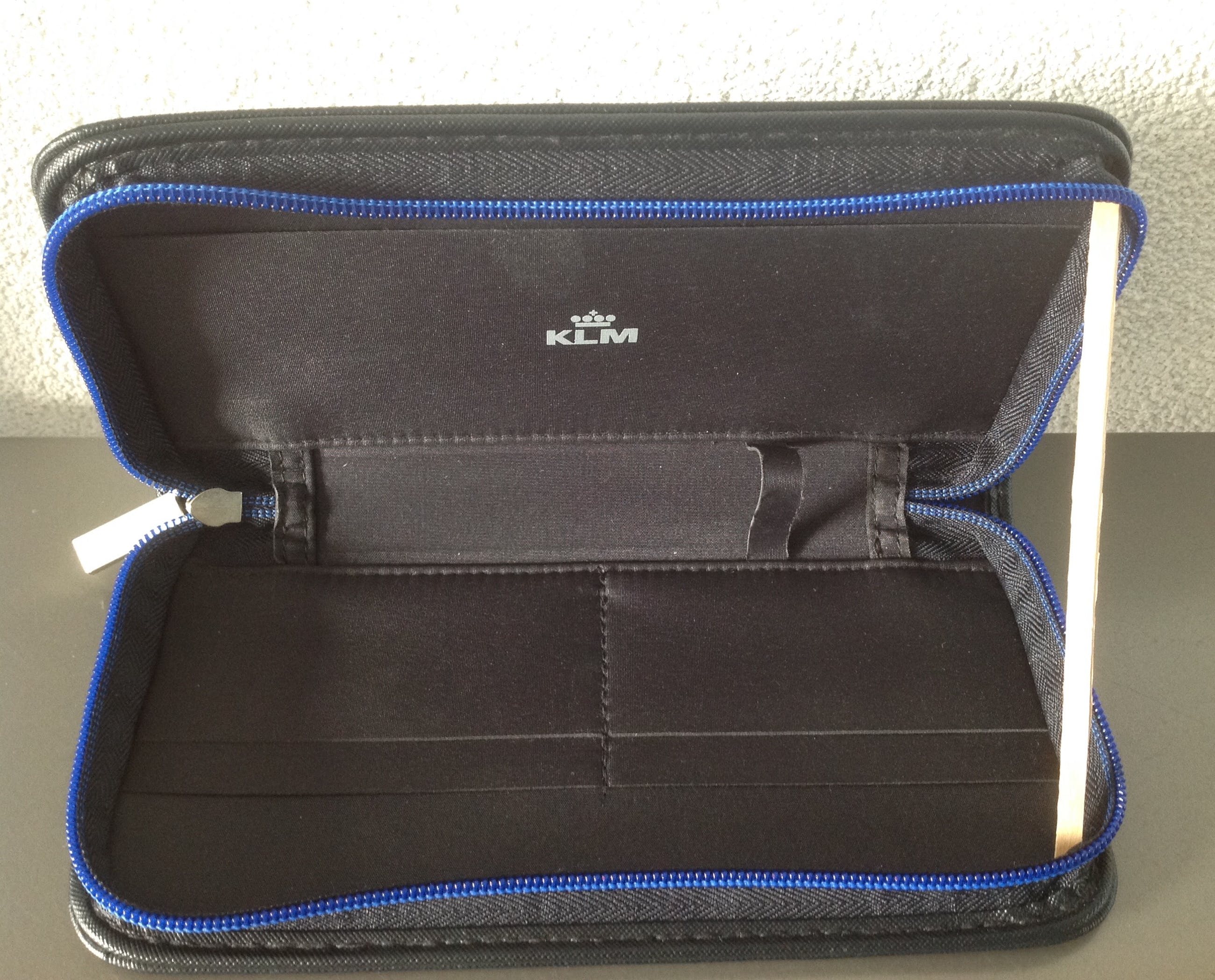 Een zwart etui met blauwe rits.Op de buitenzijde een metalen plaatsen met Jan Taminiau.De binnenzijde heeft insteekvakjes en het logo van de KLM.