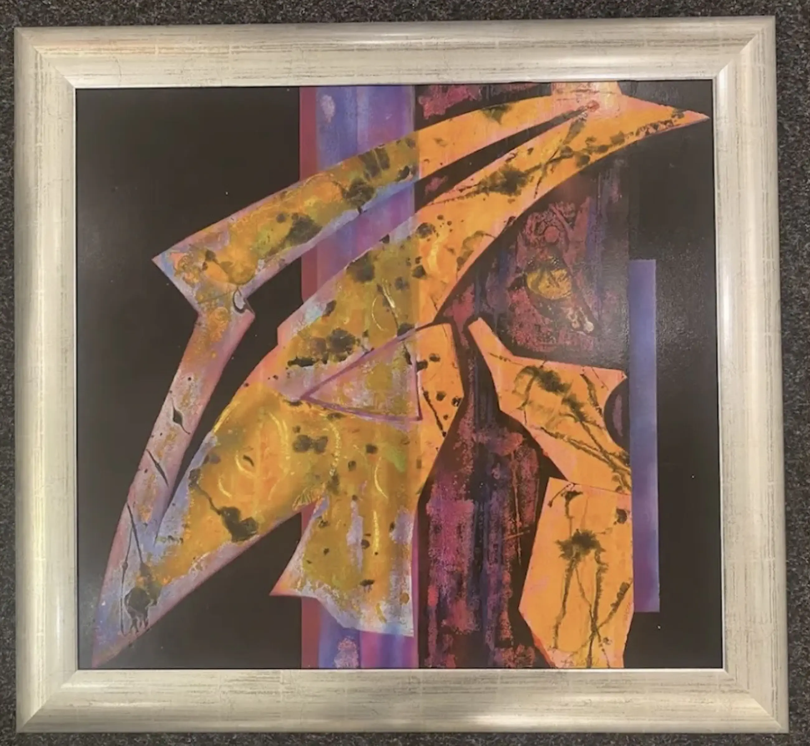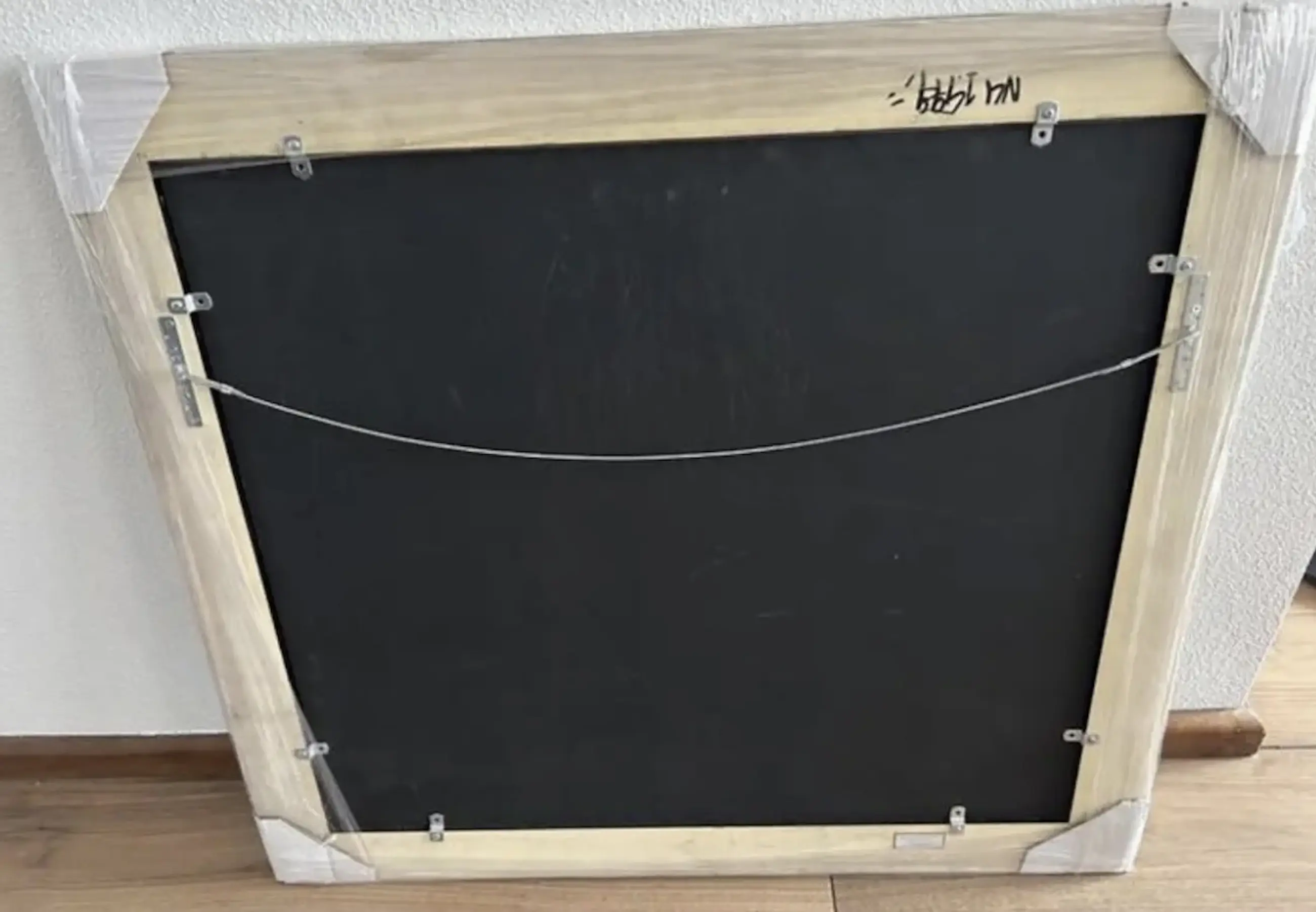 Het werk is nieuw ingelijst in een zilverkleurige houten lijst, totale formaat 83 x 77 cm.