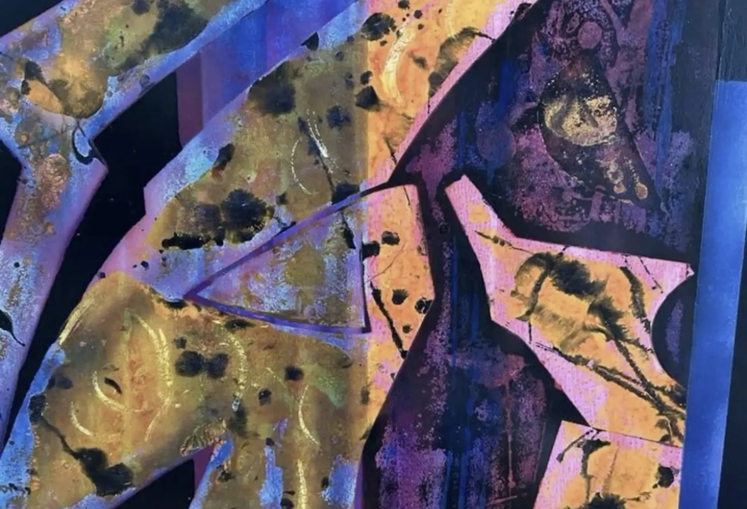 Het betreft een gemengde techniek op paneel van zijn vroege textiel en behang ontwerpen.