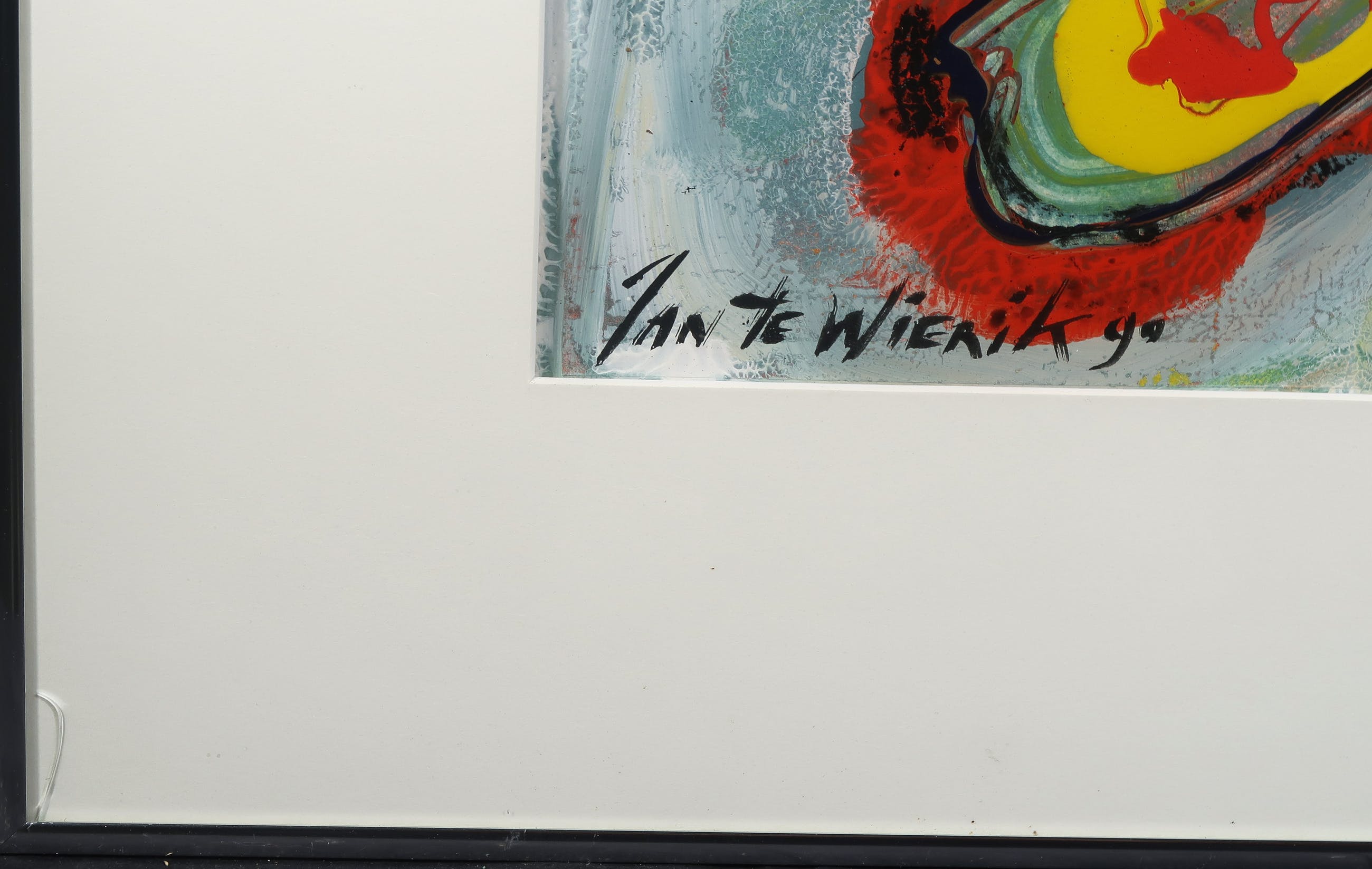 | Het beeld is in zeer goede staat. Tussen het werk en het glas lijkt wat vuil te zitten. Het glas heeft een kleine breuk linksonder | |