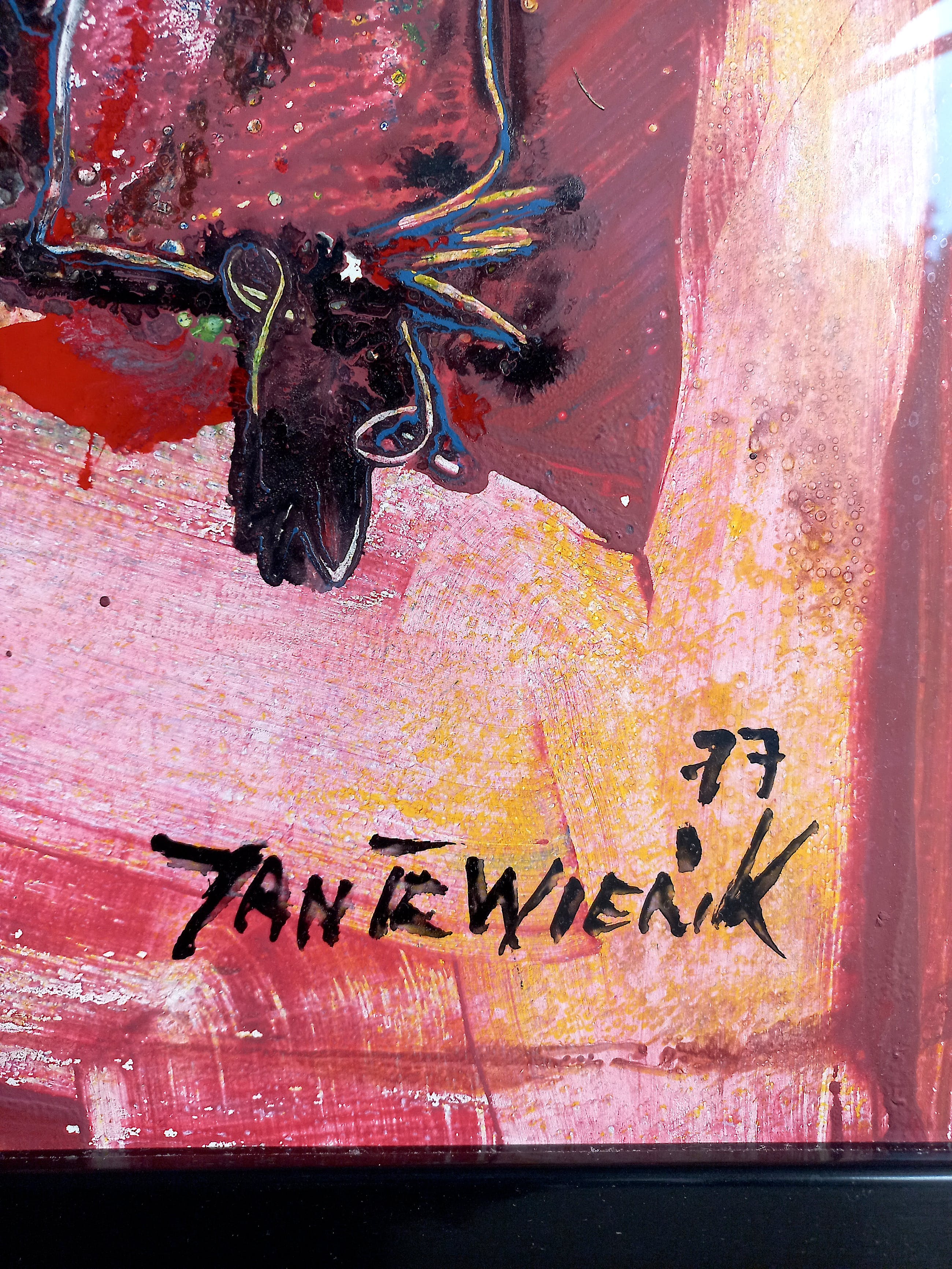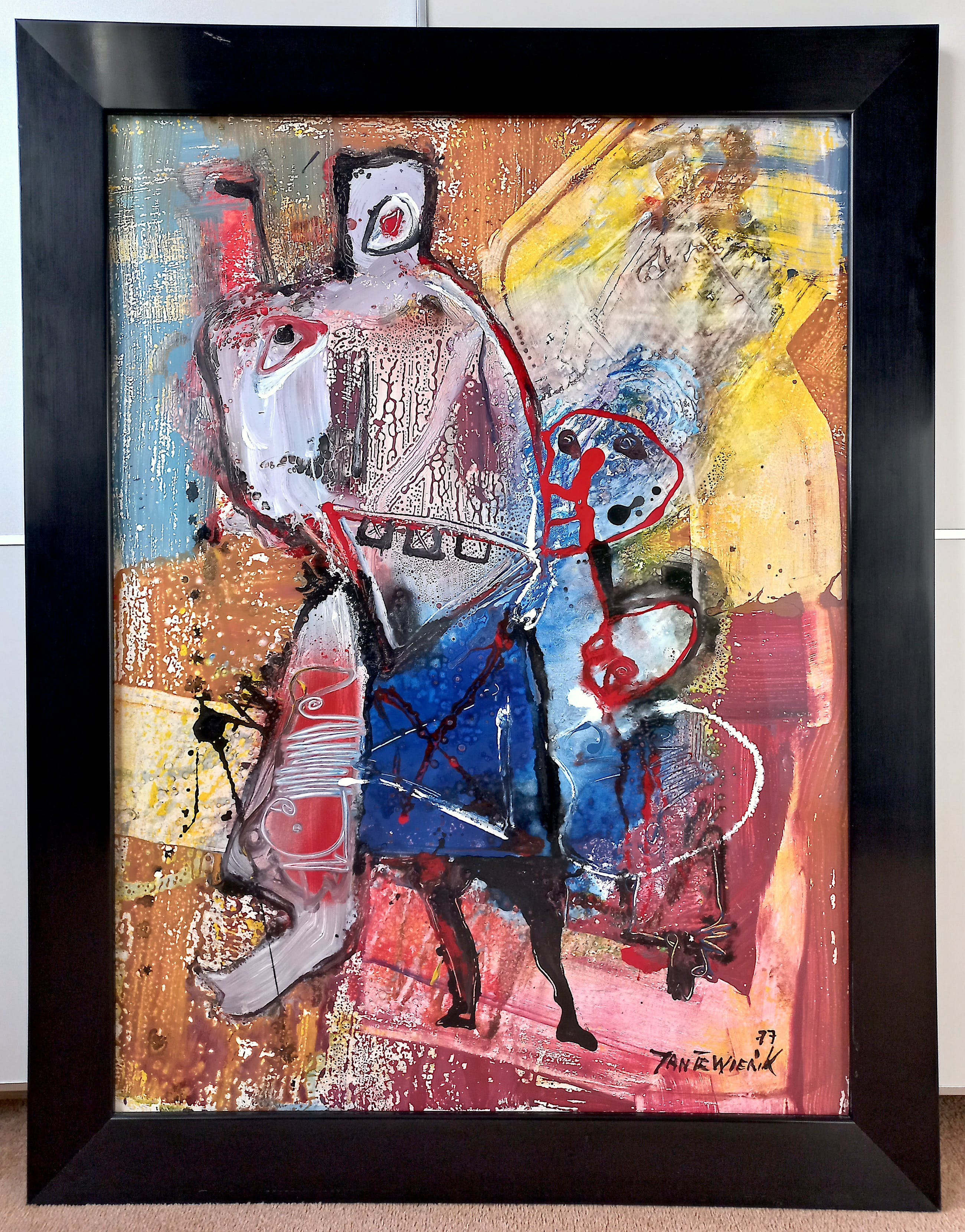 Mooi, karakteristiek werk van Jan te Wierik. Gemengde techniek (olieverf, acrylverf, gouache) op karton of dik papier, gesigneerd en gedateerd (’97). Zeer mooi (professioneel) ingelijst, achter museumglas. Alles in zeer goede conditie.