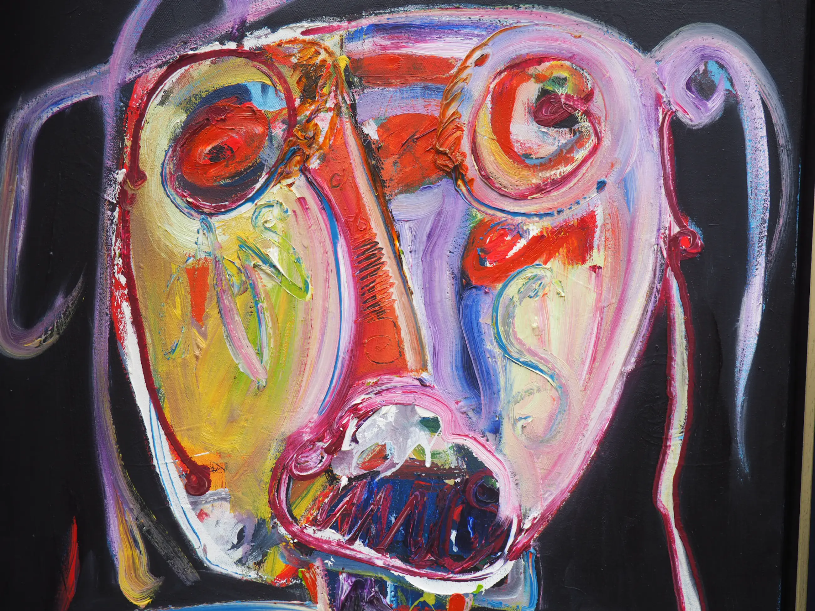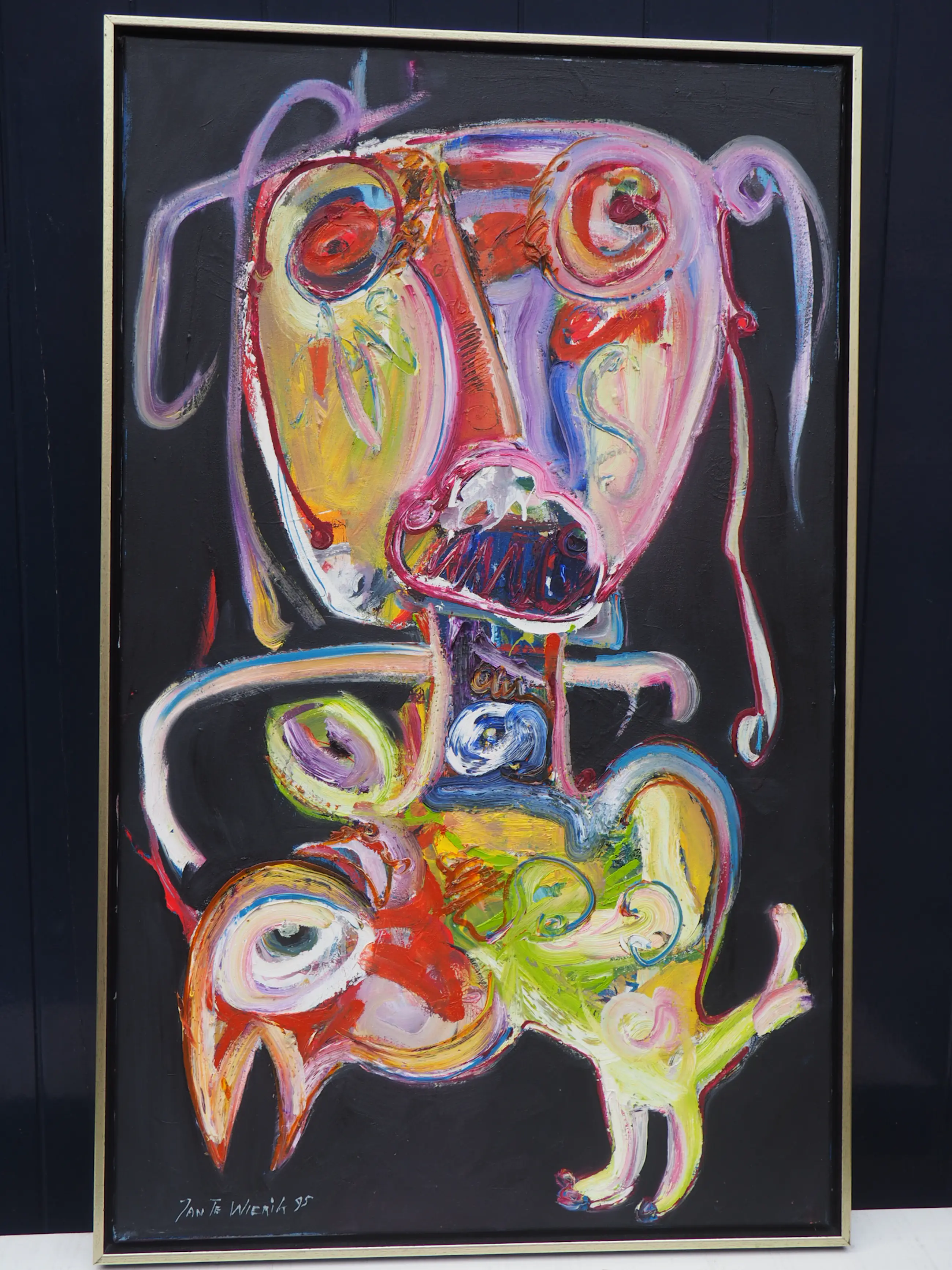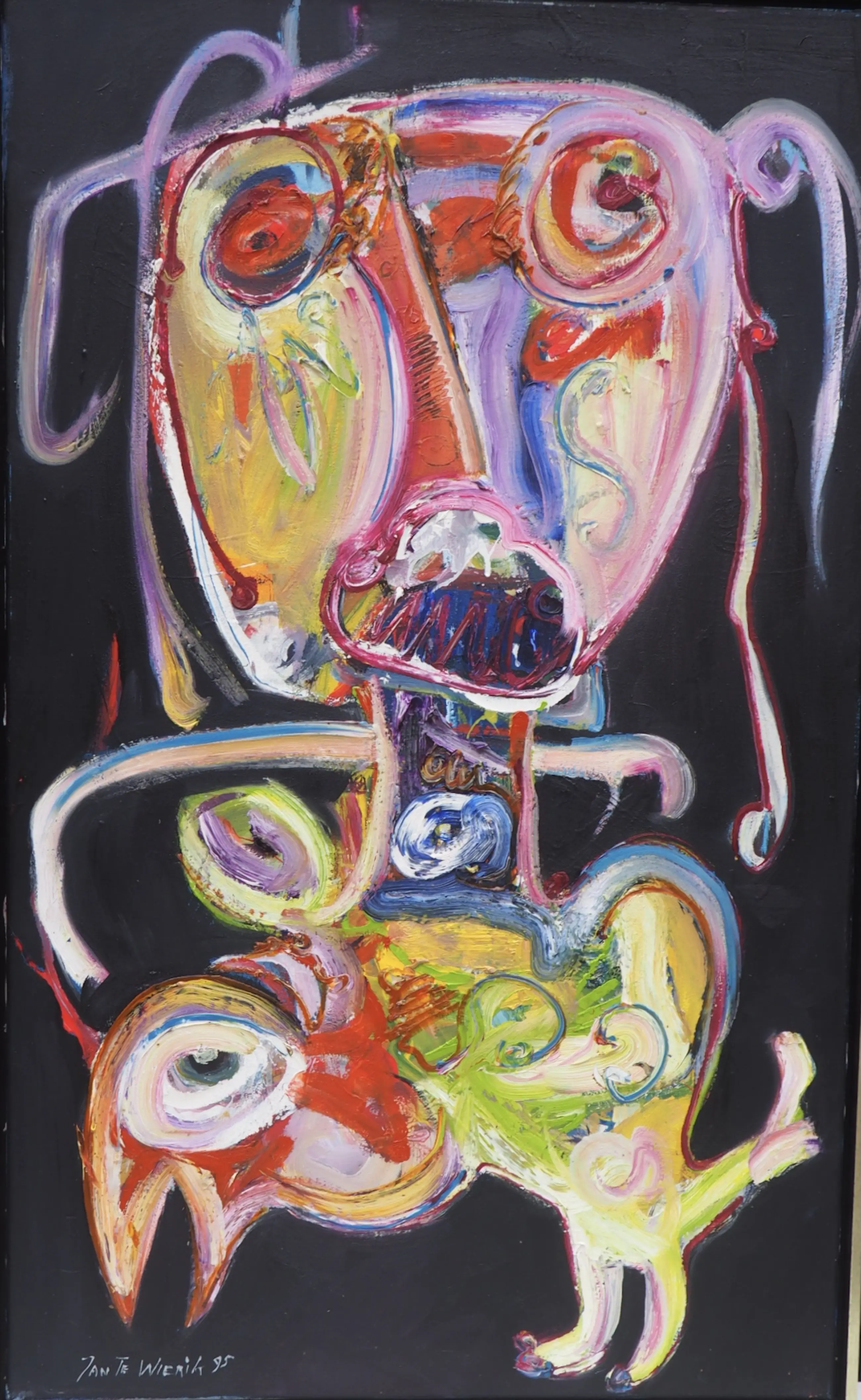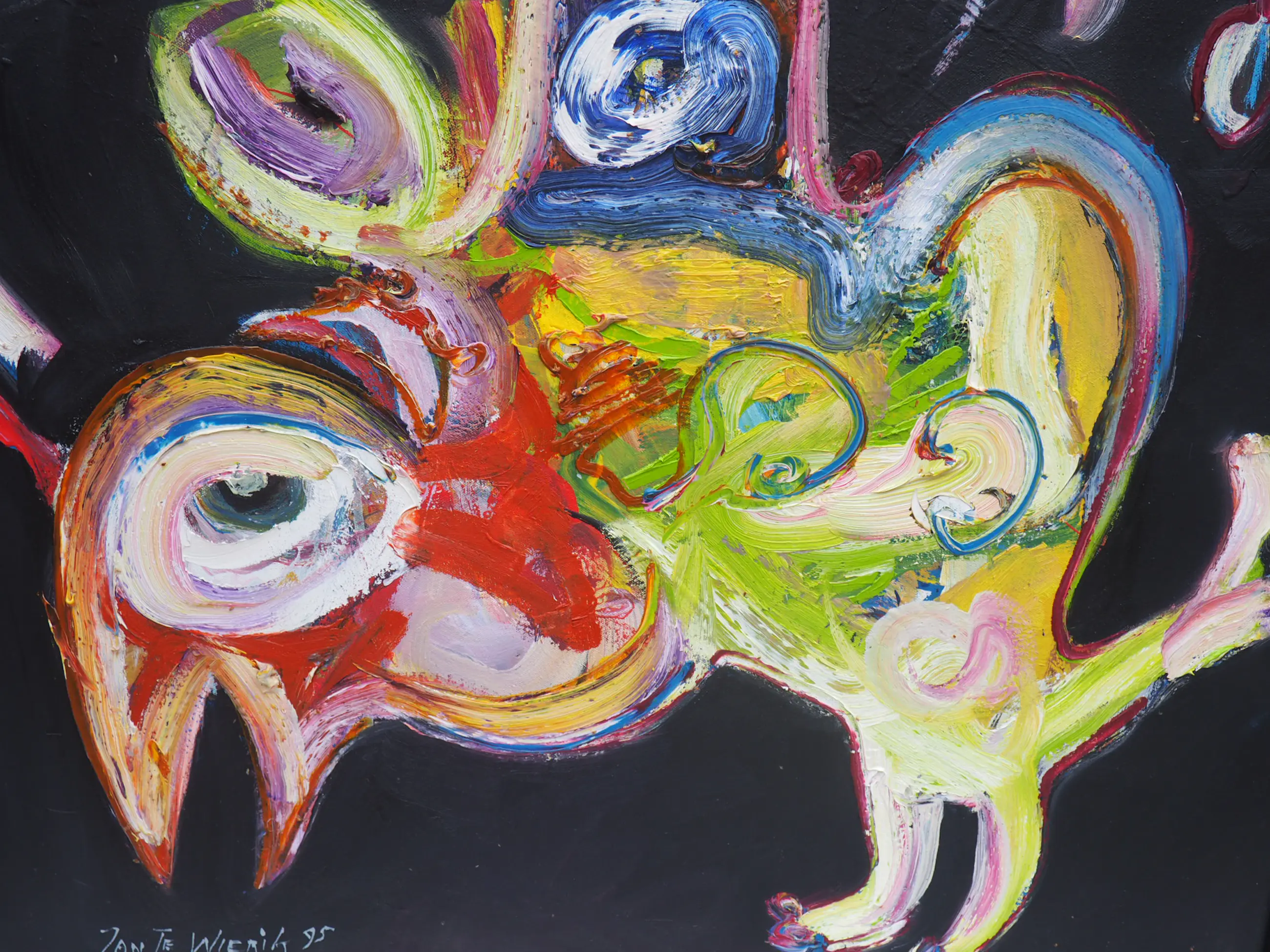 Dit prachtige kleurrijke werk van Jan te Wierik spat van het doek. De felgekleurde - en voor Te Wierik zo kenmerkende - fabeldieren zijn met gemengde technieken aangebracht op het doek. De dikke klodders verf en de snelle streken op de zwarte achtergrond geven het werk diepte en zorgen er bijna voor dat de fabeldieren tot leven komen.