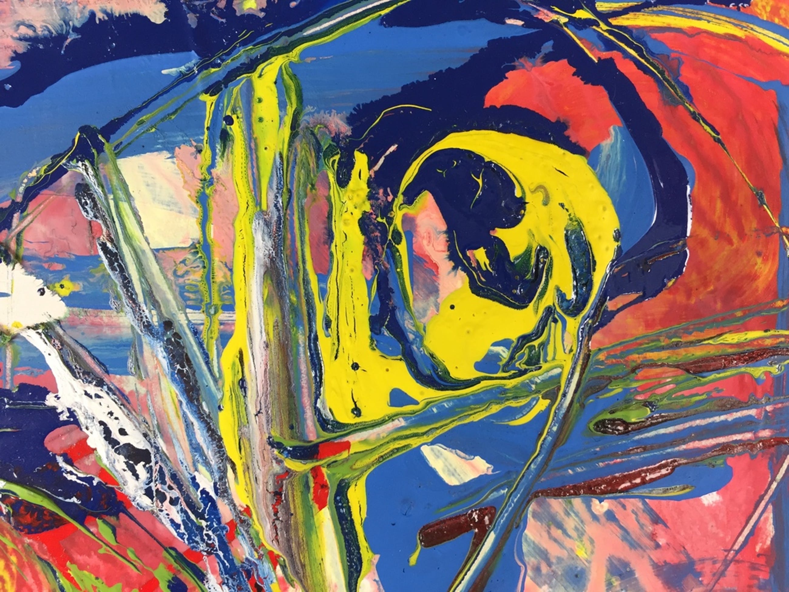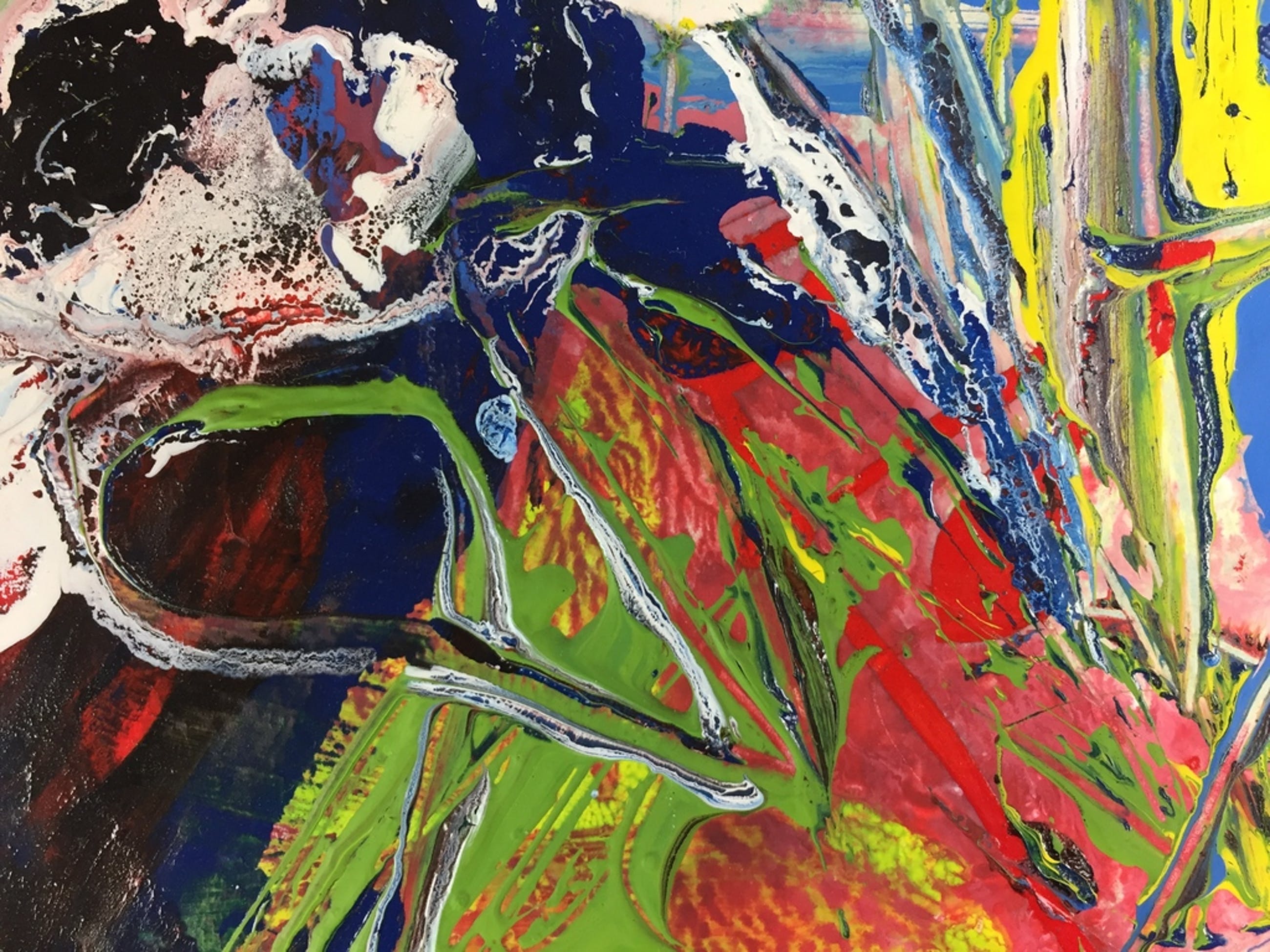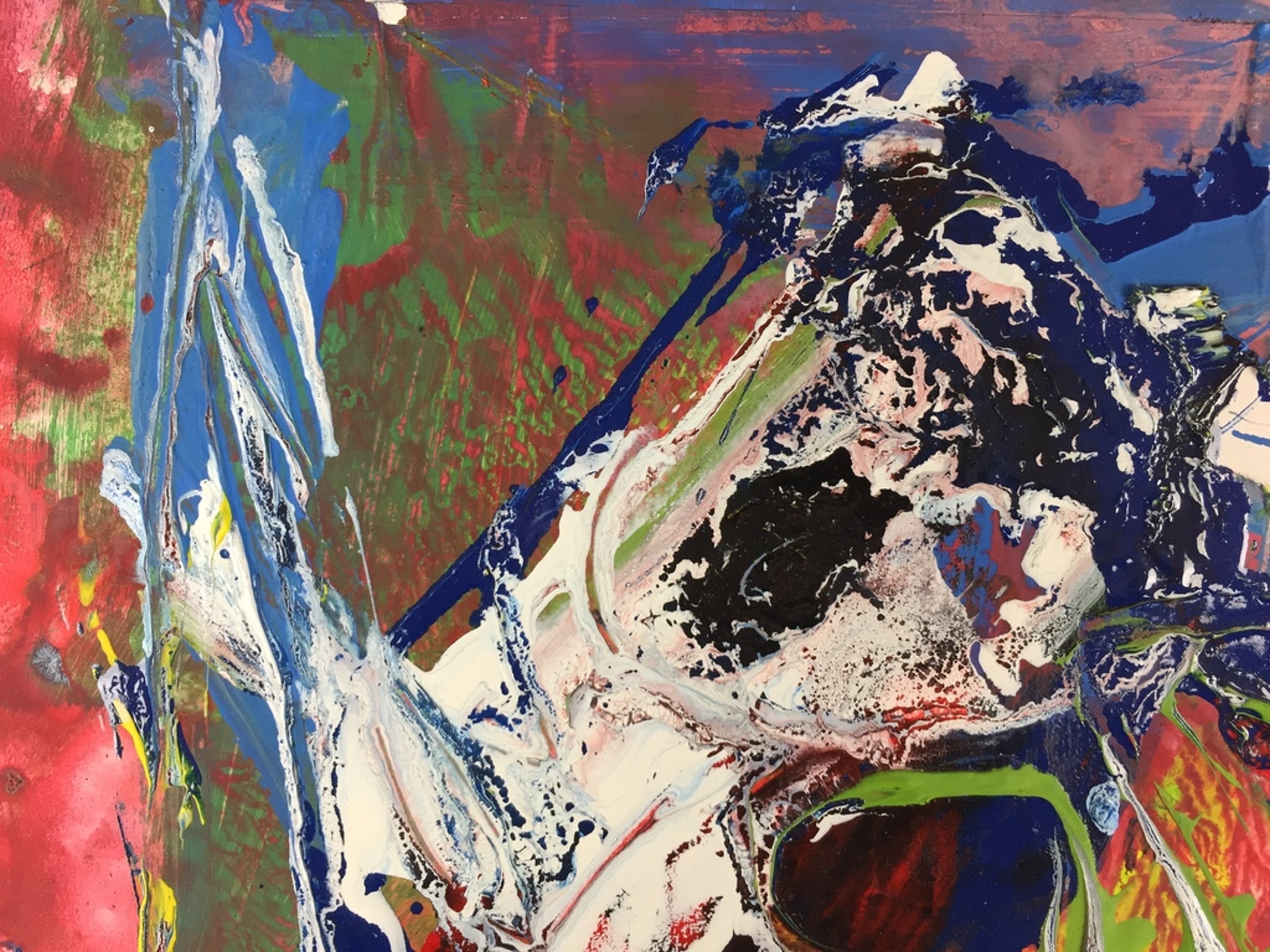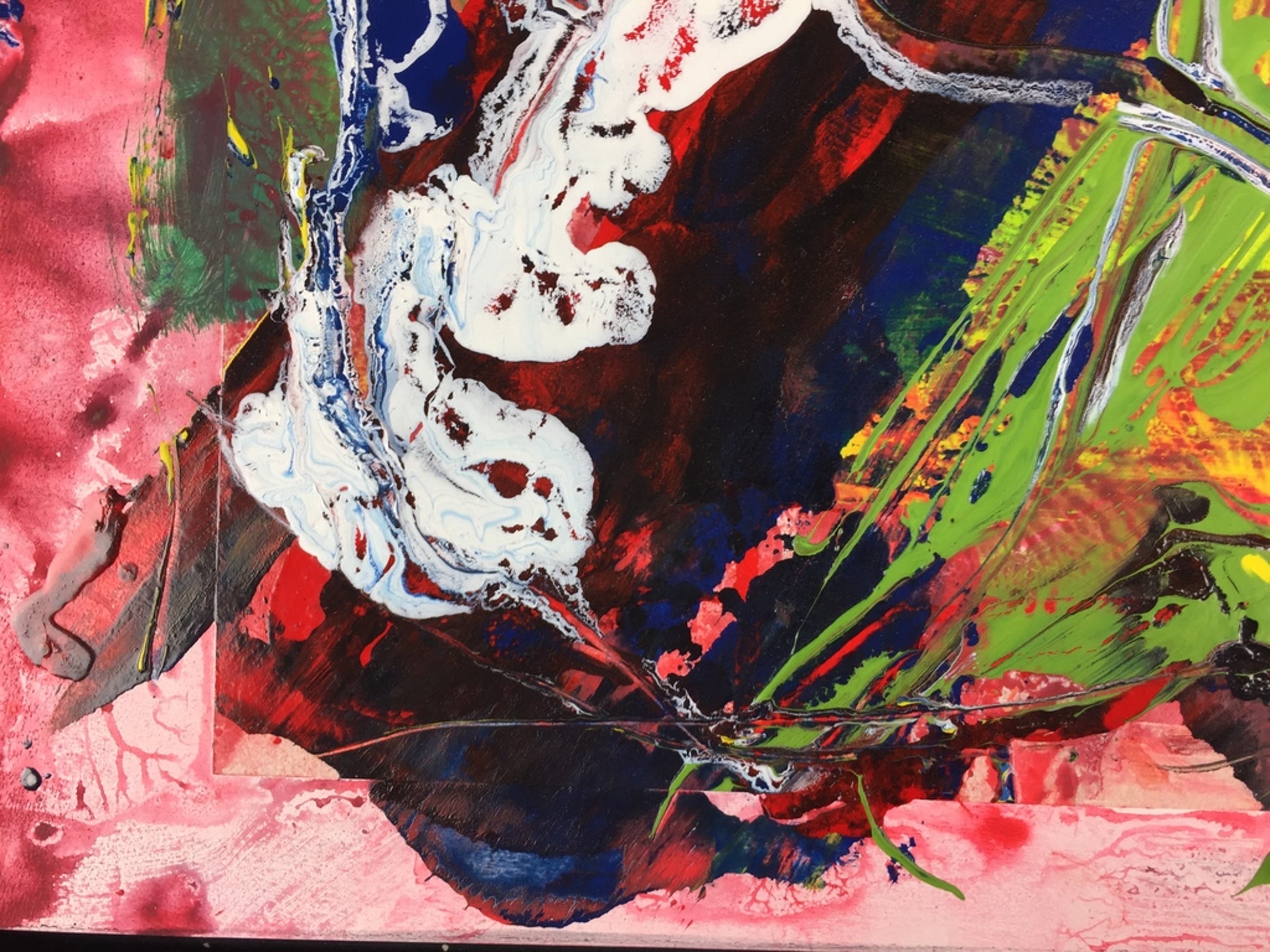 Olieverf, lakverf en acrylverf met collage, op een dik paneel.