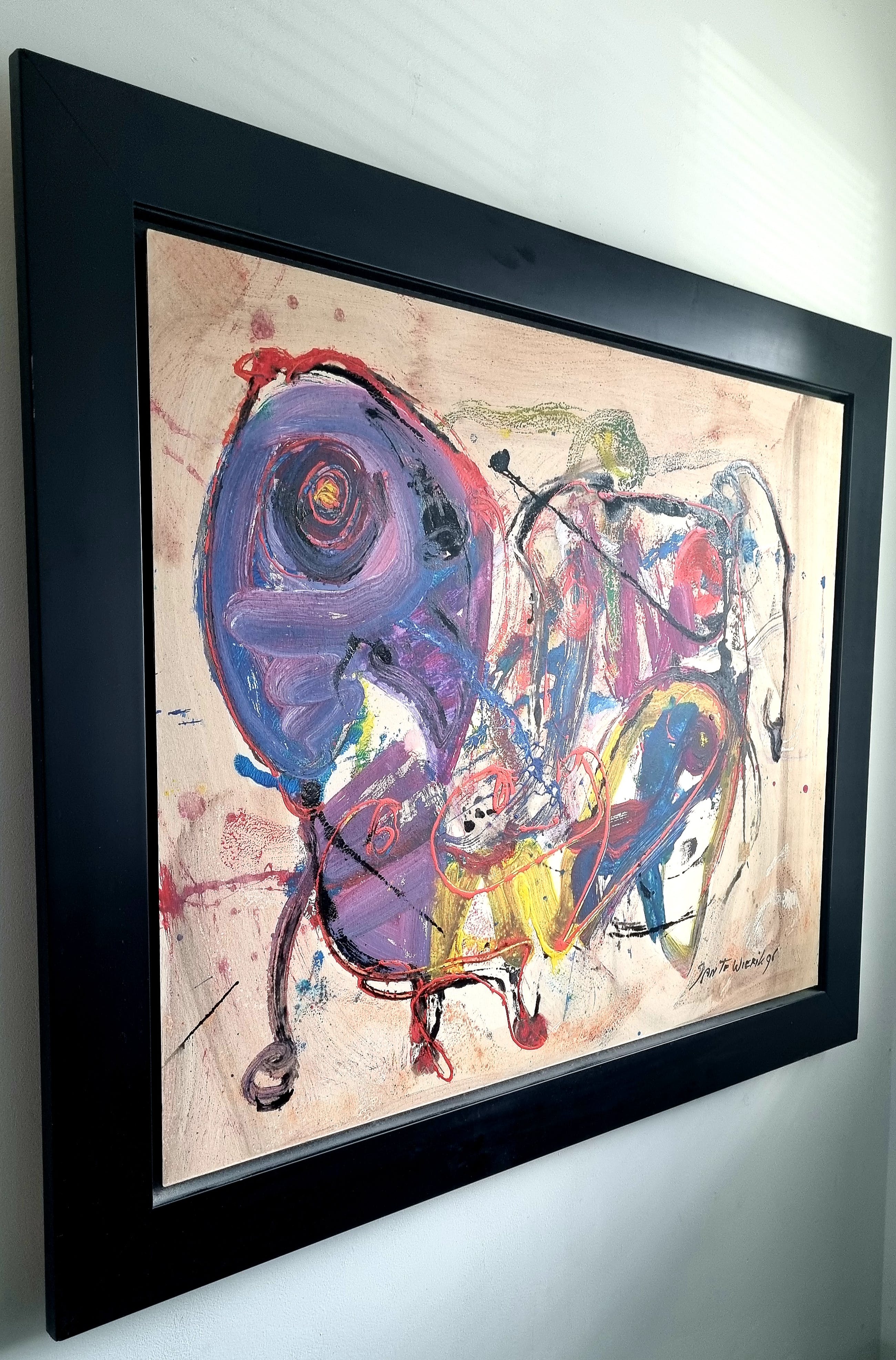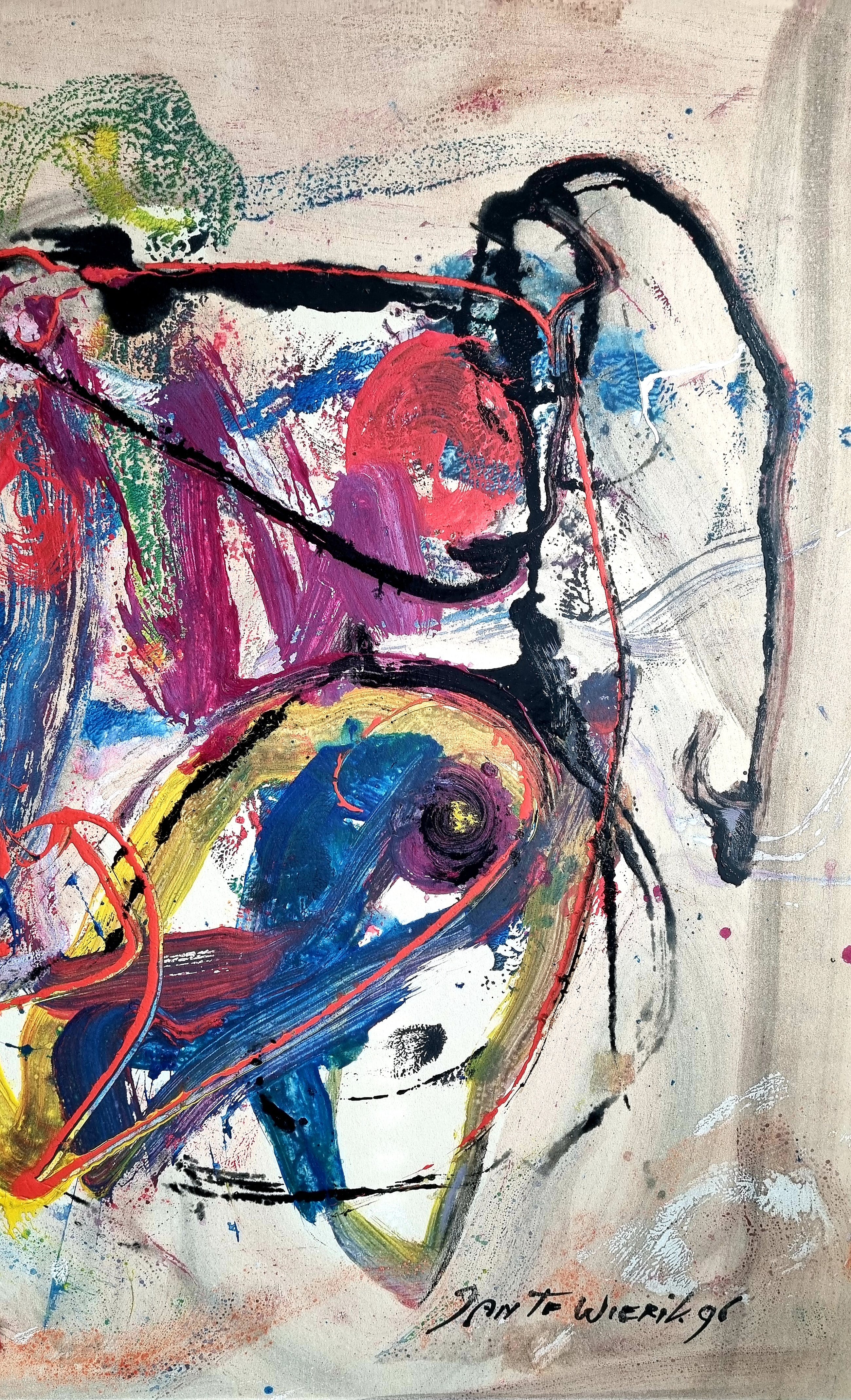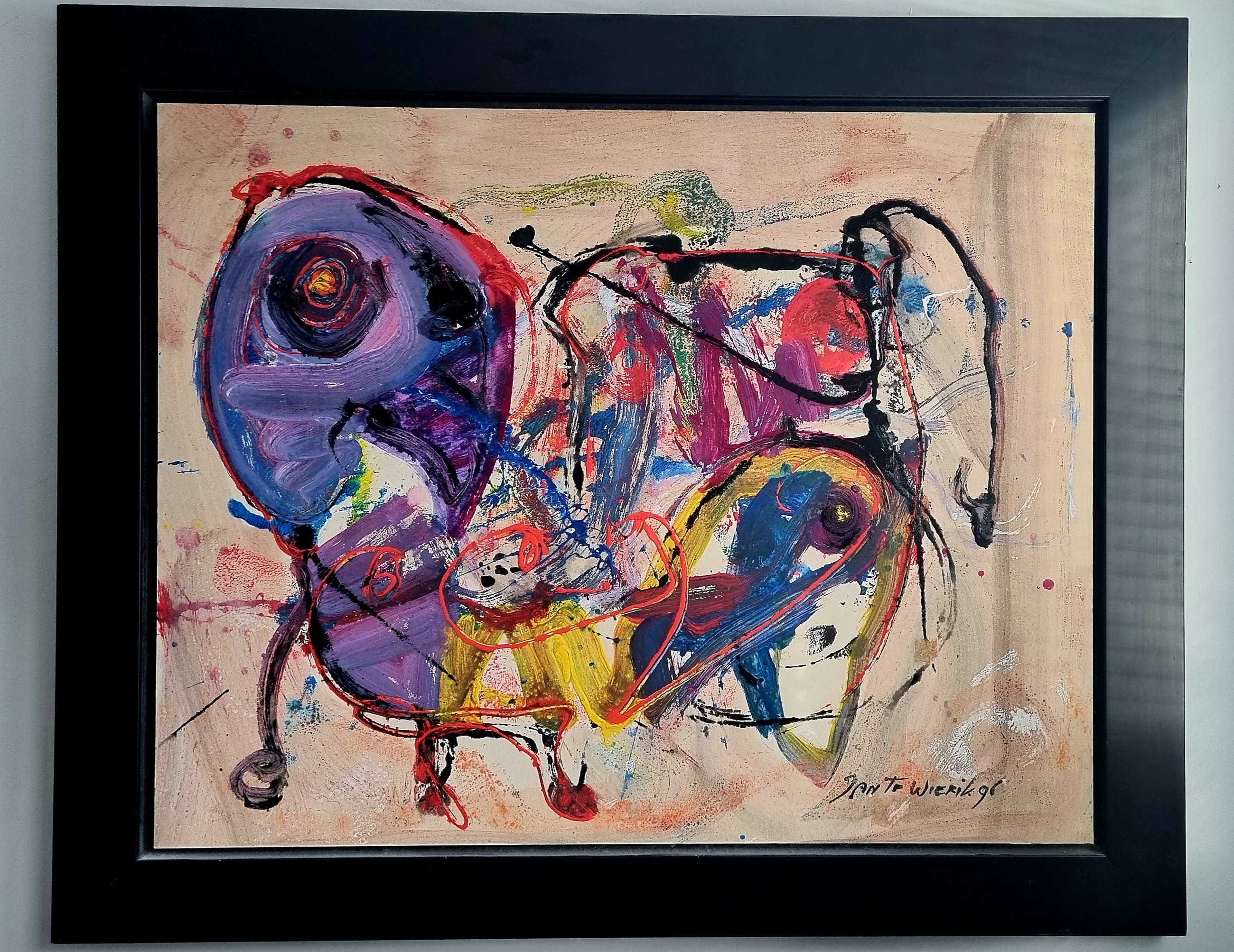 Prachtig origineel werk van Jan te Wierik uit 1996. Techniek: Olieverf/lakverf op papier gemaroufleerd op paneel. Ingelijst in zwarte baklijst.