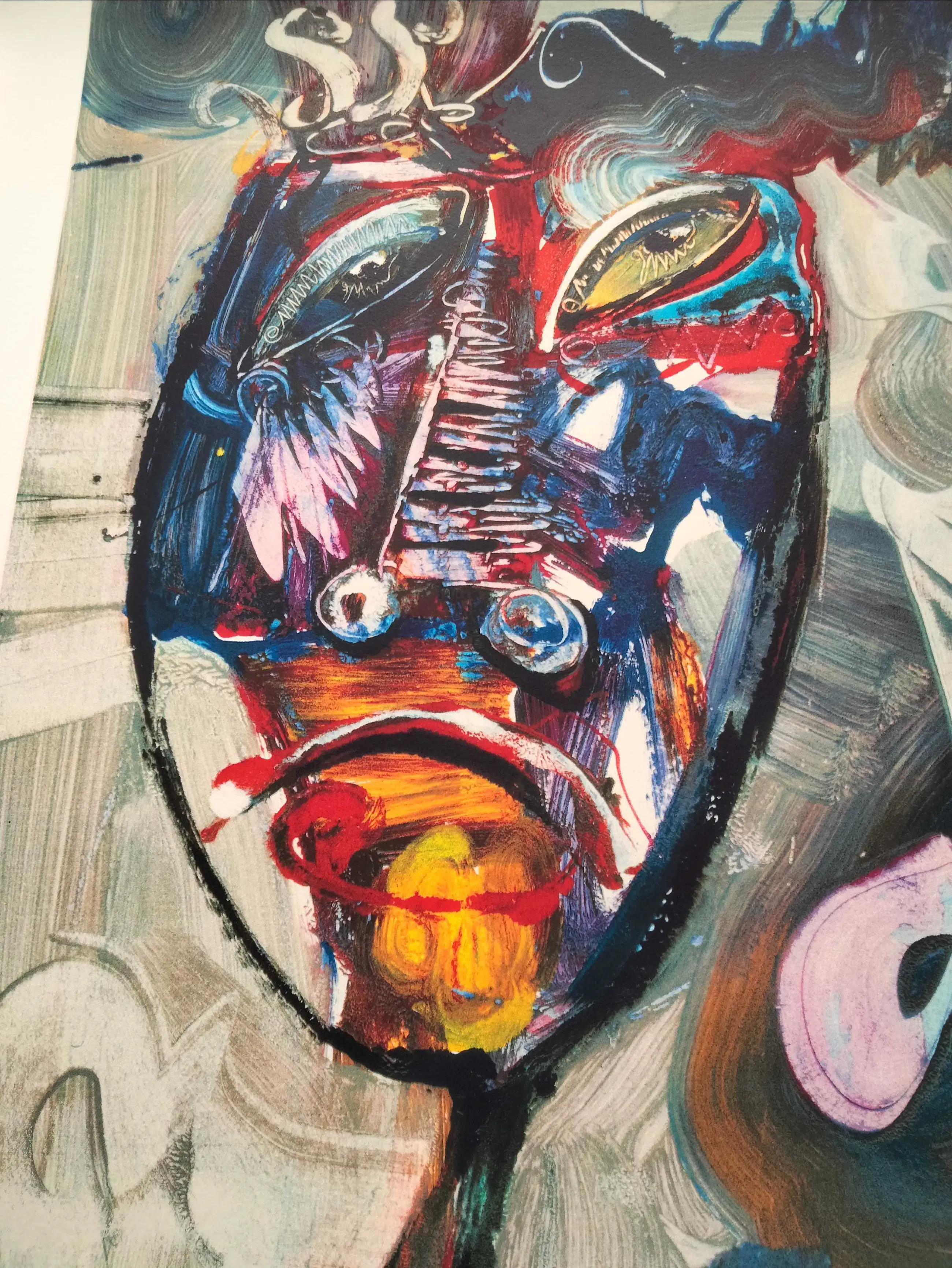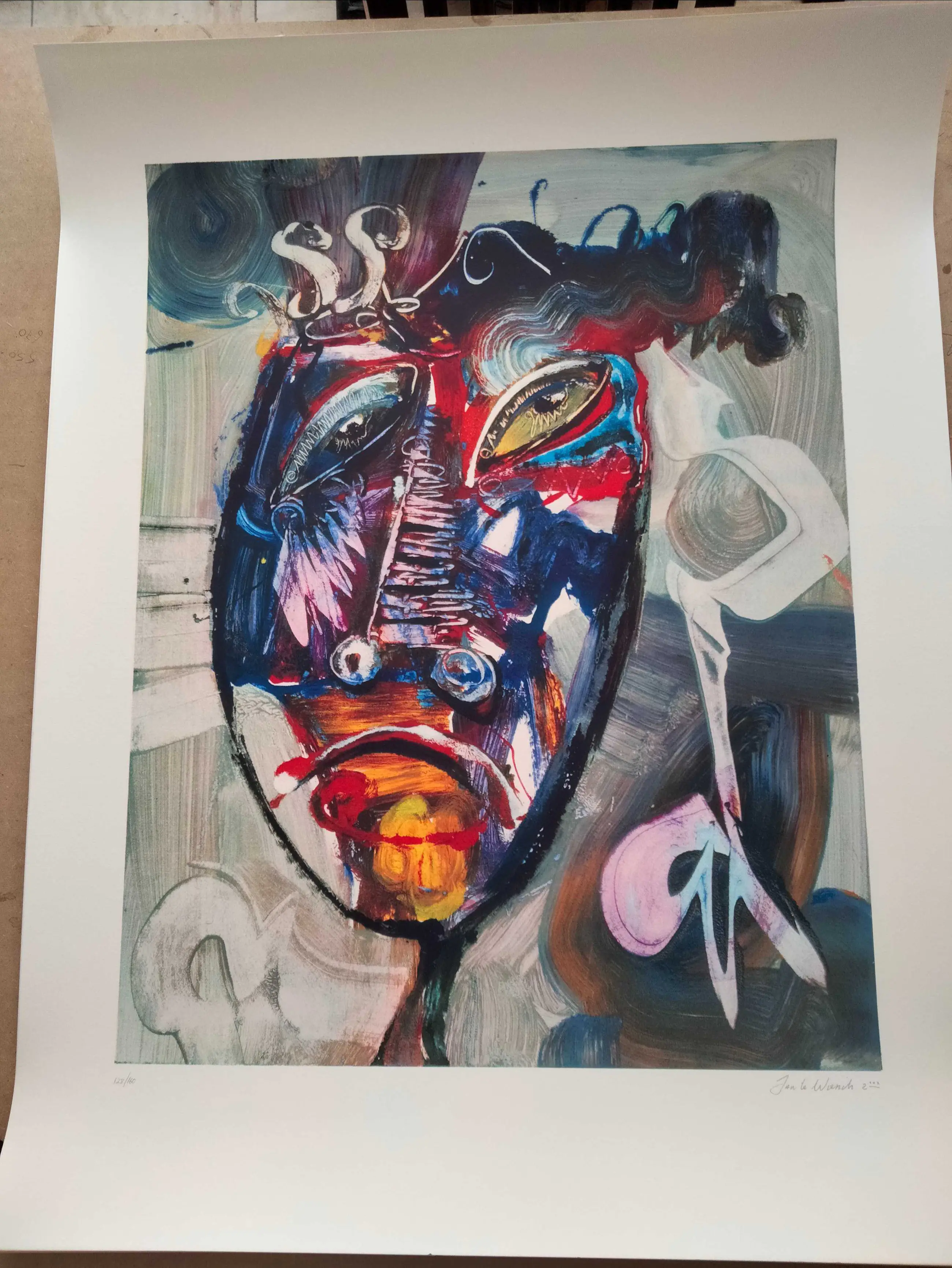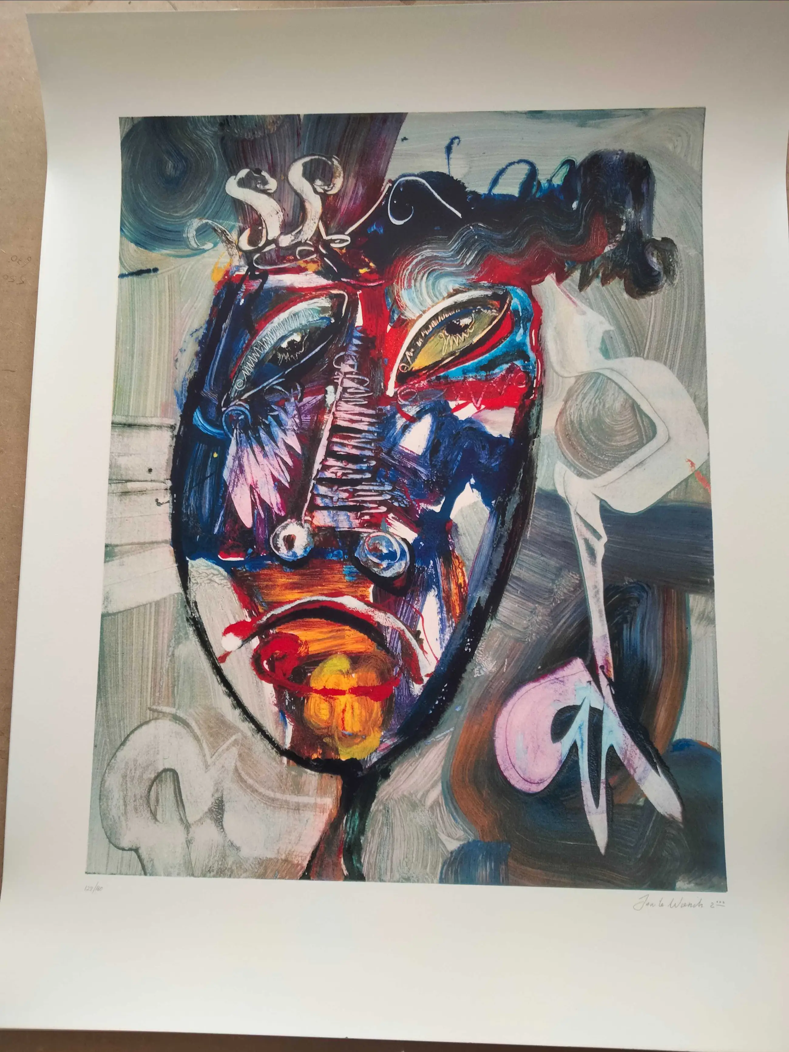 Fraaie in nieuwstaat verkerende zeefdruk van jan te wierik uit 2002 getiteld:mask Oplage nummer 128/160 Nog nooit ingelijst geweest. Uiteraard handgesigneerd gedateerd en genummerd door te wierik.