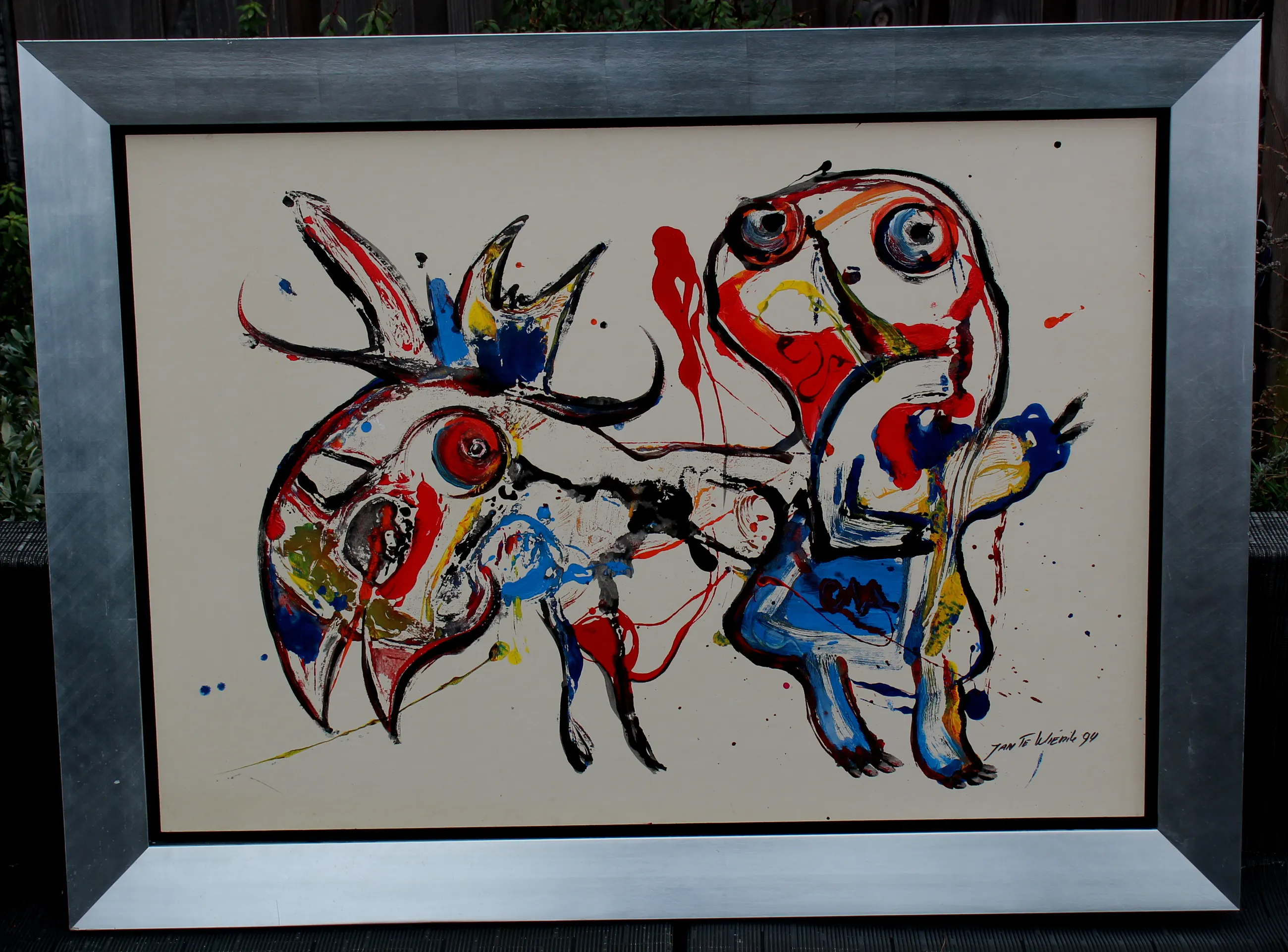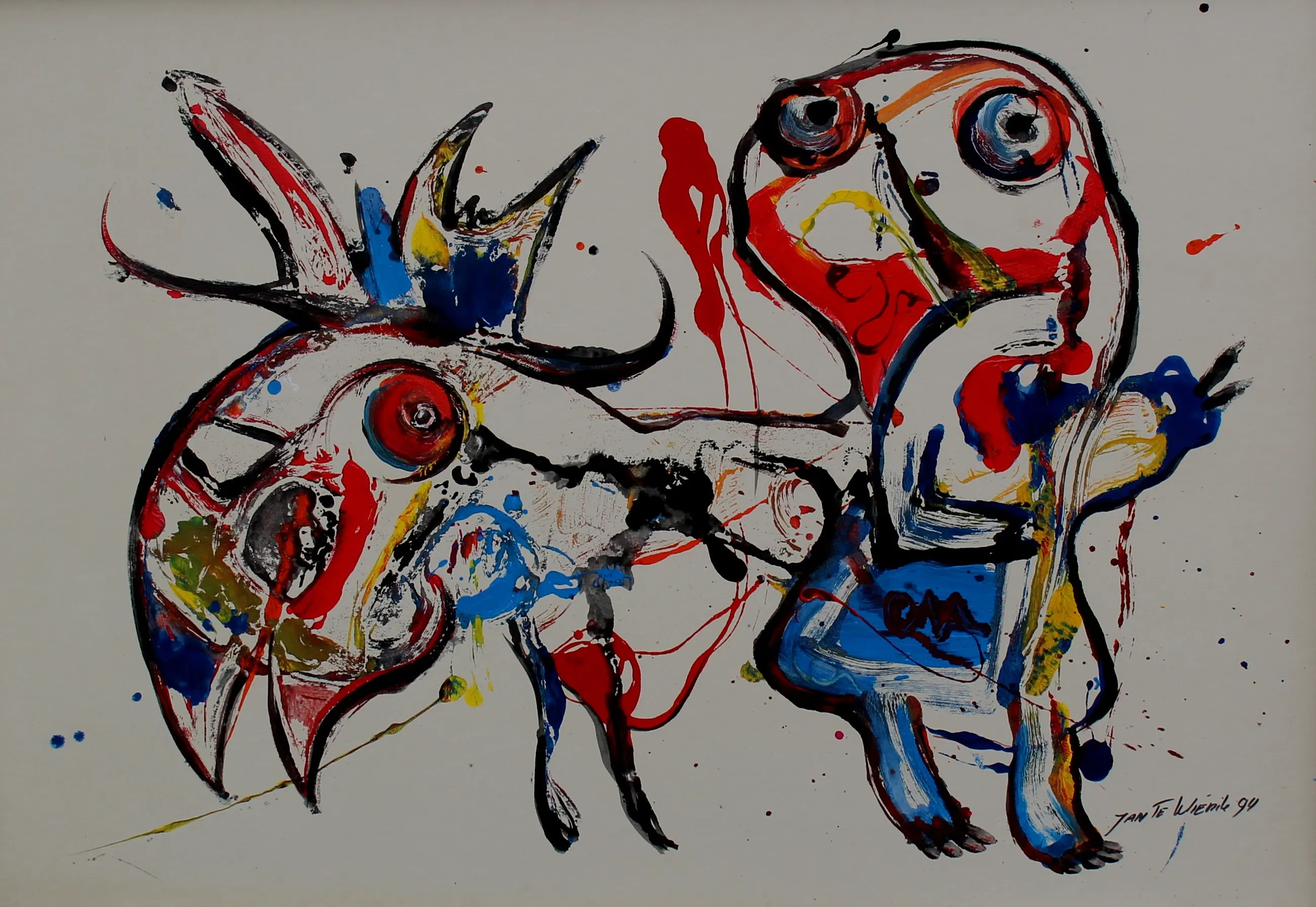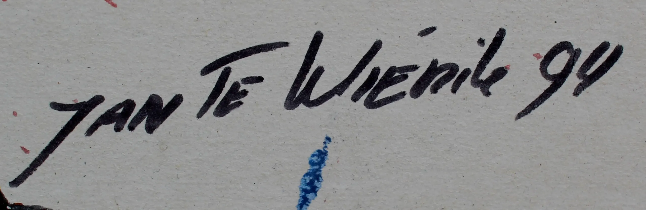 Acryl op board van Jan te Wierik. Jaar: 1994. Afmetingen incl lijst: H88 x b118cm. Afmetingen voorstelling: H70 x b100cm. Het werk is, rechts onderaan, gesigneerd en gedateerd. De authenticiteit van het aangeboden werk wordt volledig gegarandeerd. Een certificaat van echtheid kan, op aanvraag, worden gemaild.