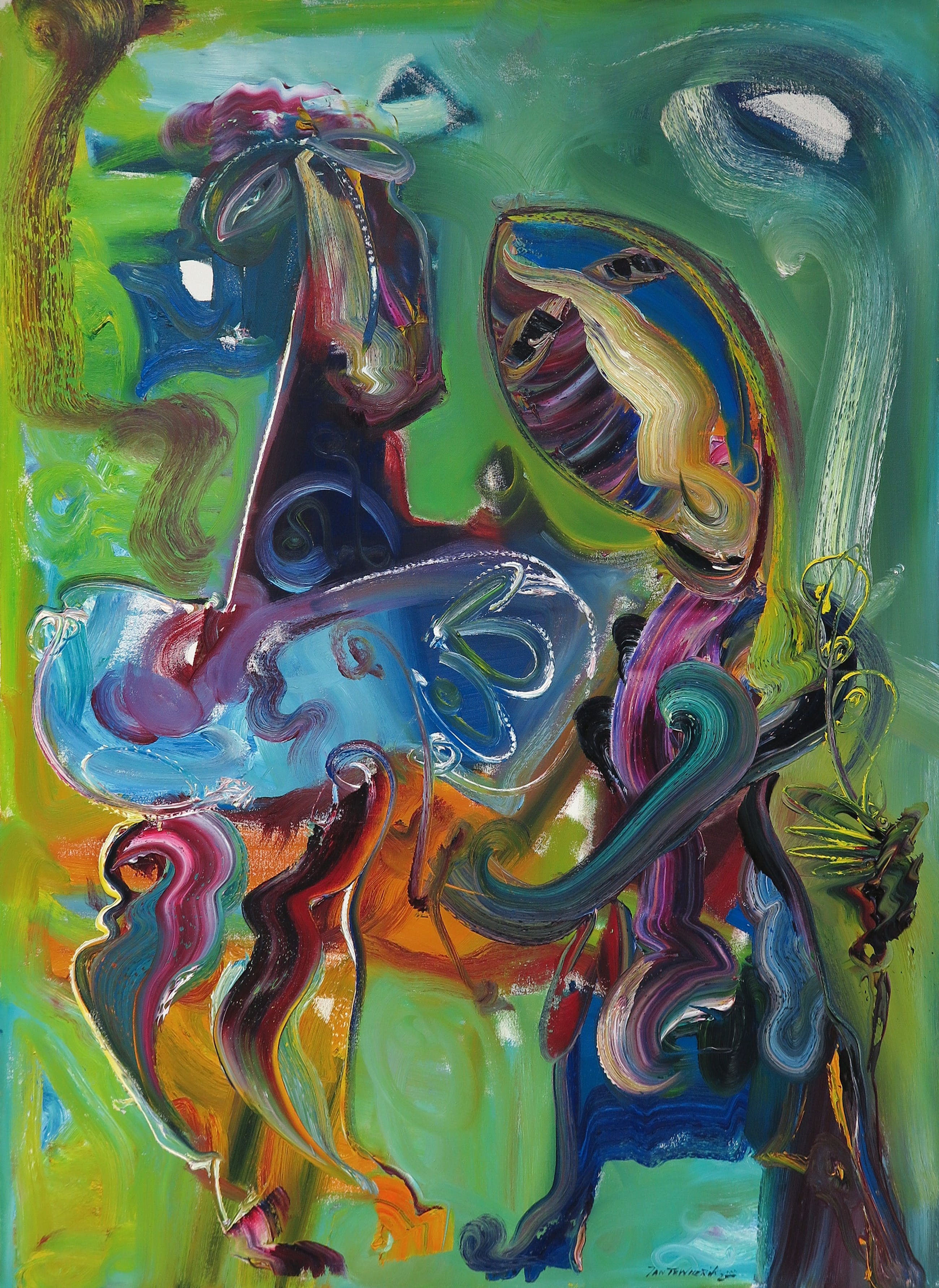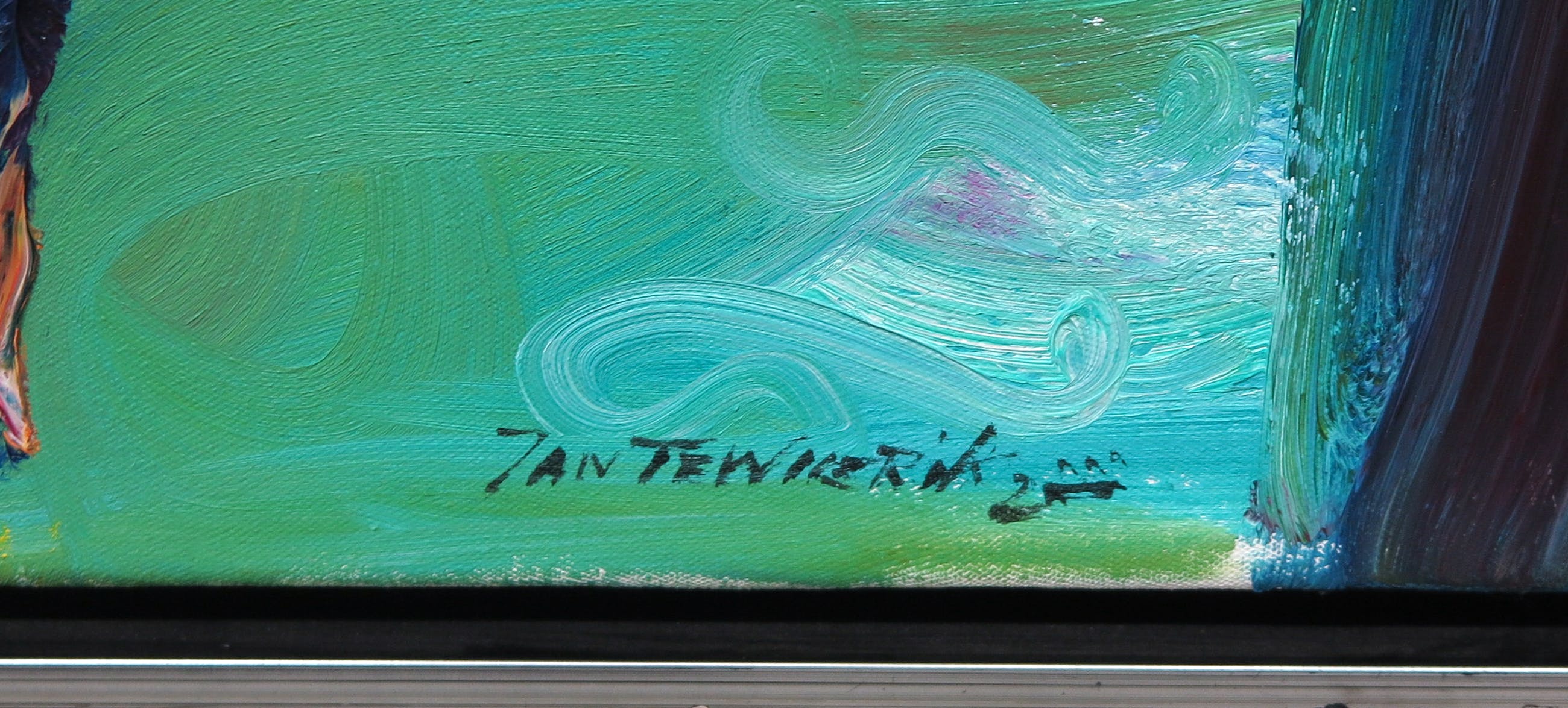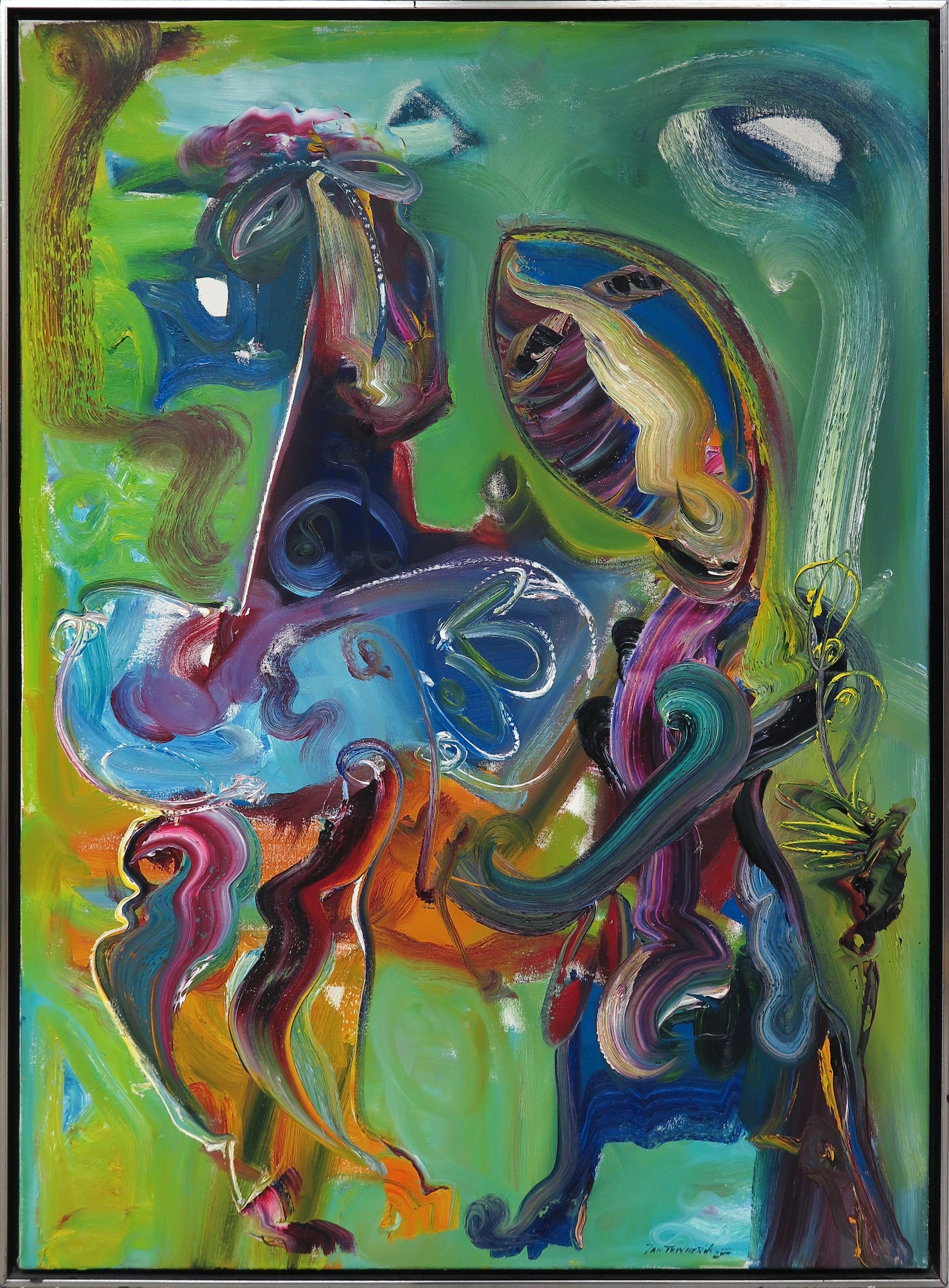 Prachtig groot schilderij door Jan te Wierik, in de kenmerkende figuratief abstracte stijl met fantasiewezens in heldere vloeiende kleuren. Langs de onderste rand gesigneerd en gedateerd.