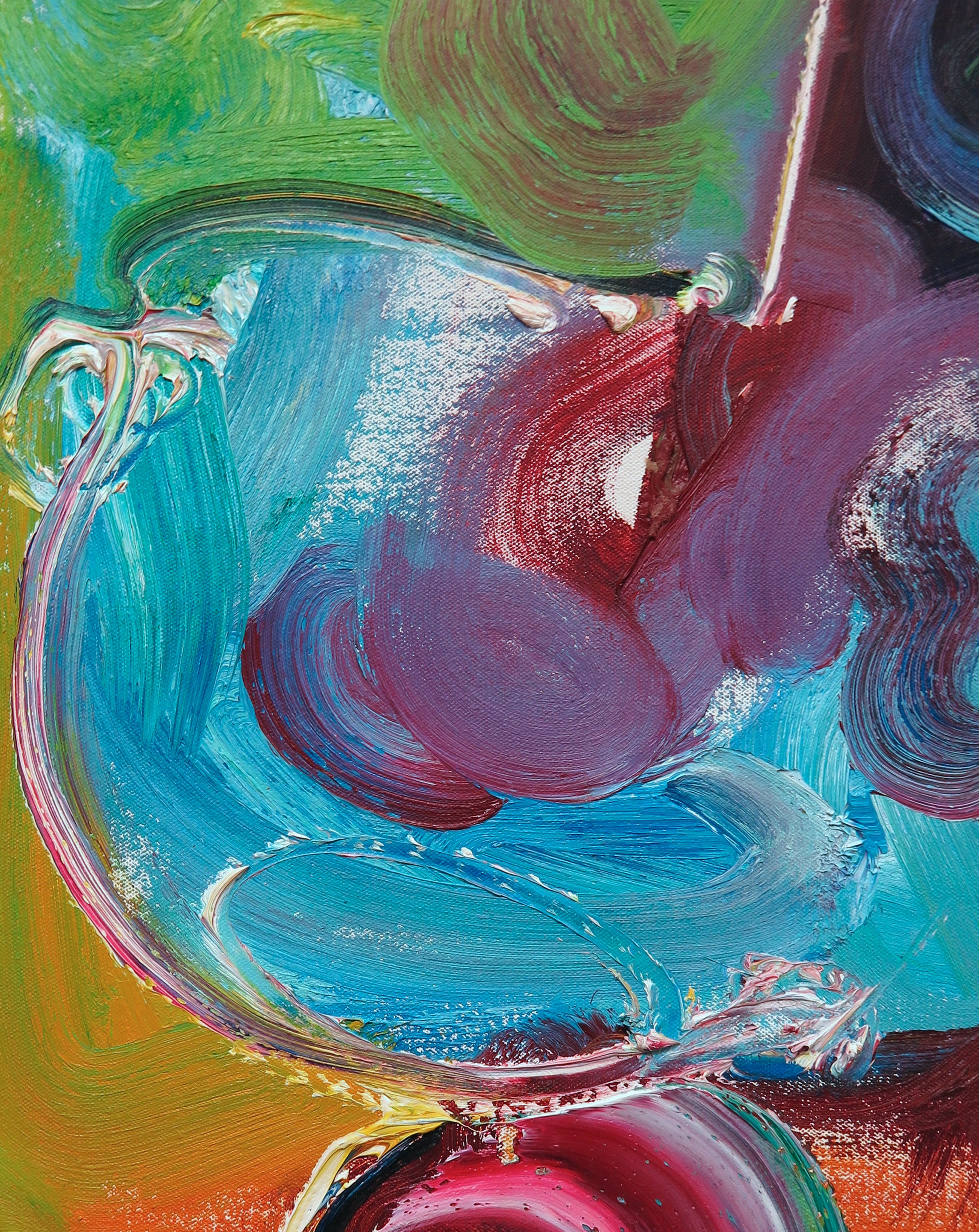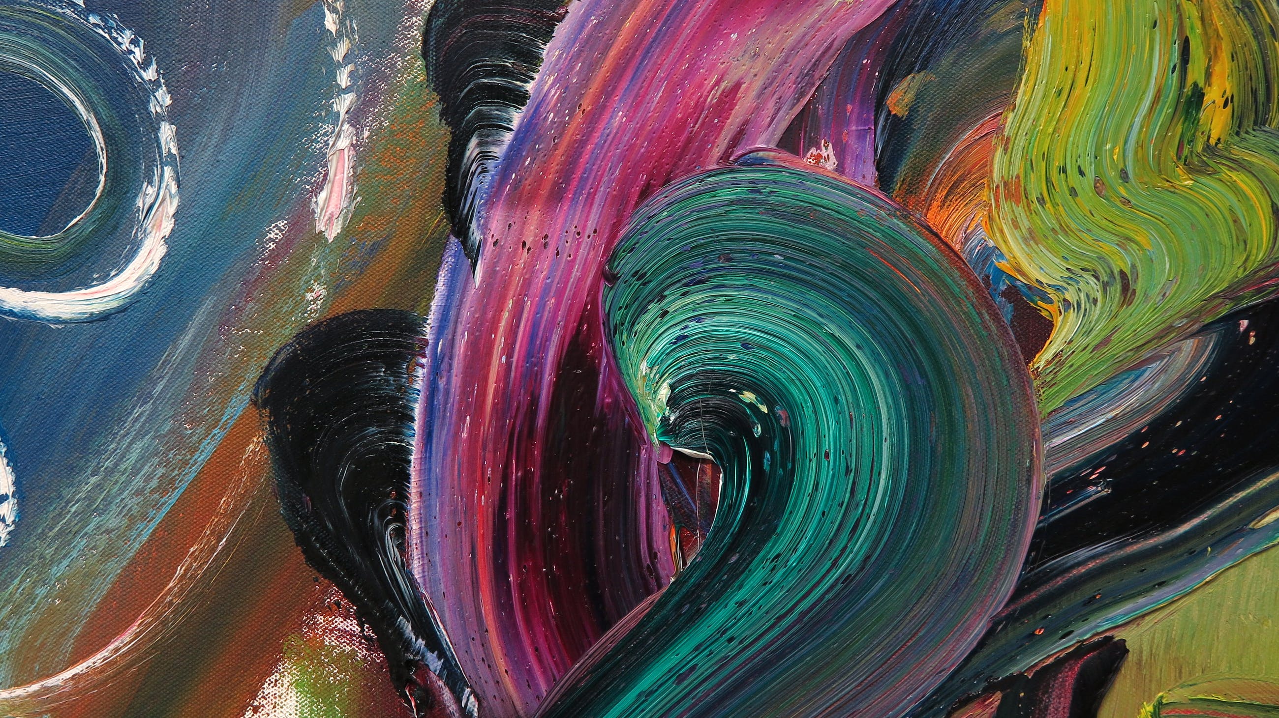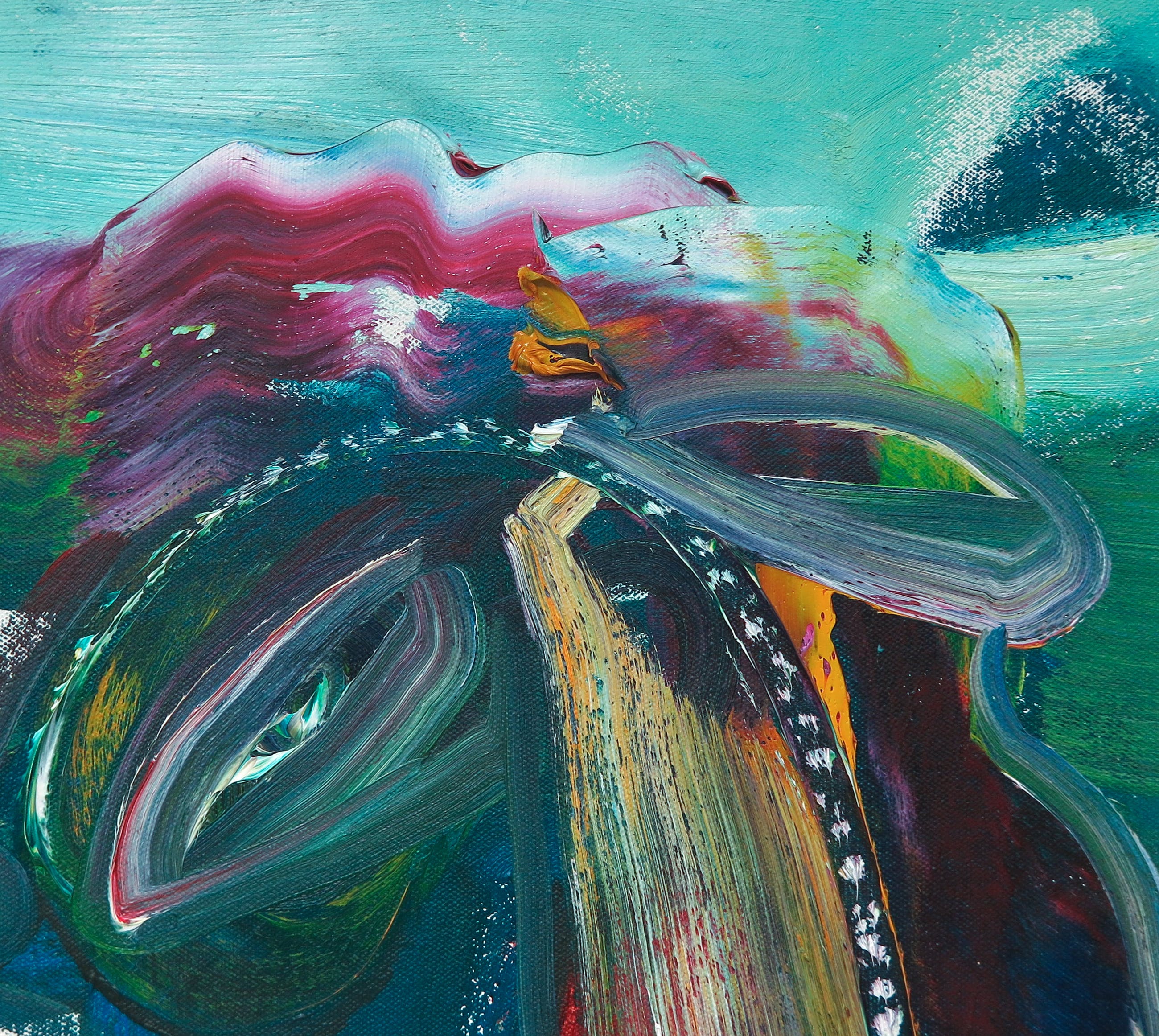 Prachtig groot schilderij door Jan te Wierik, in de kenmerkende figuratief abstracte stijl met fantasiewezens in heldere vloeiende kleuren. Langs de onderste rand gesigneerd en gedateerd.