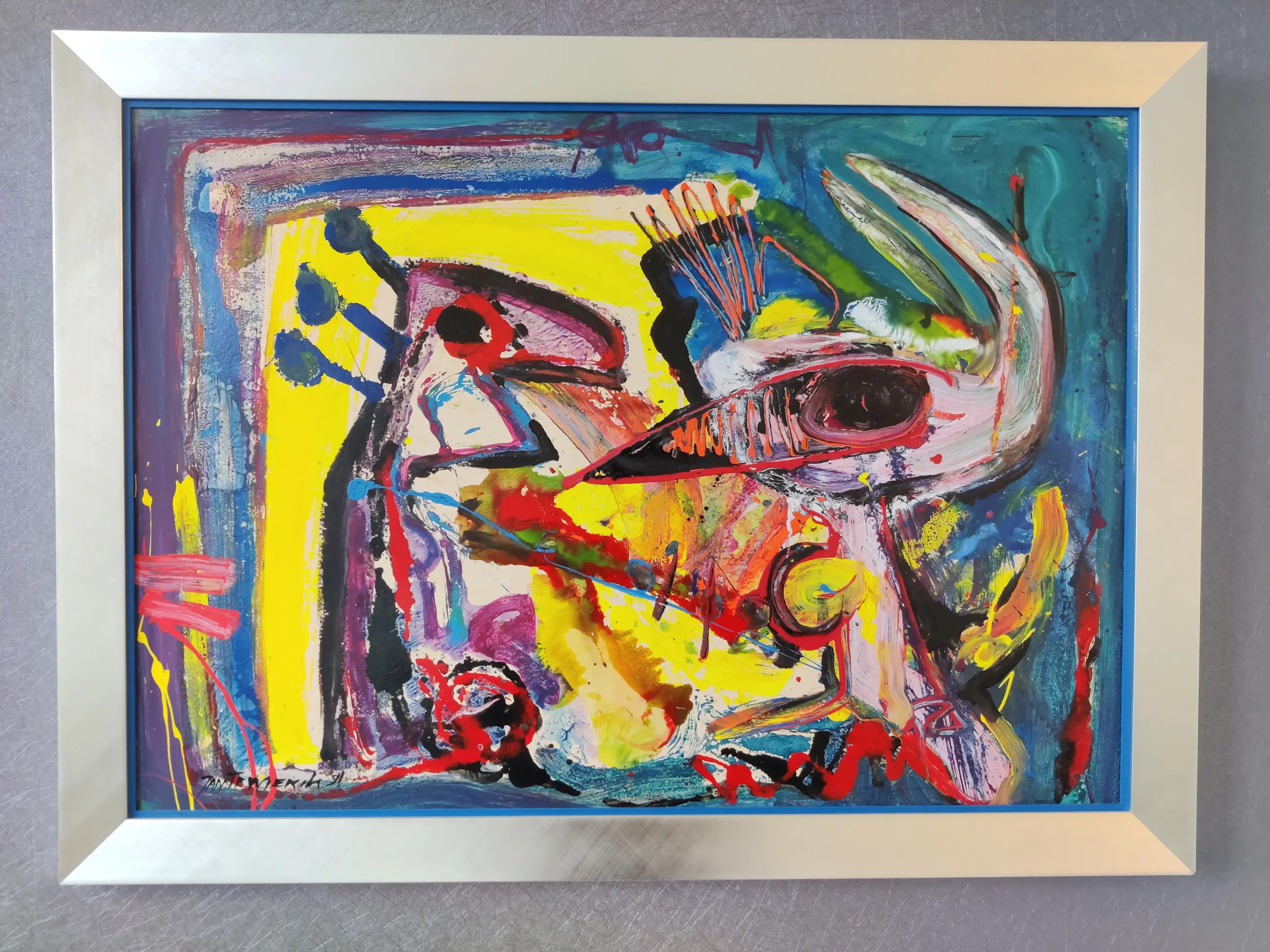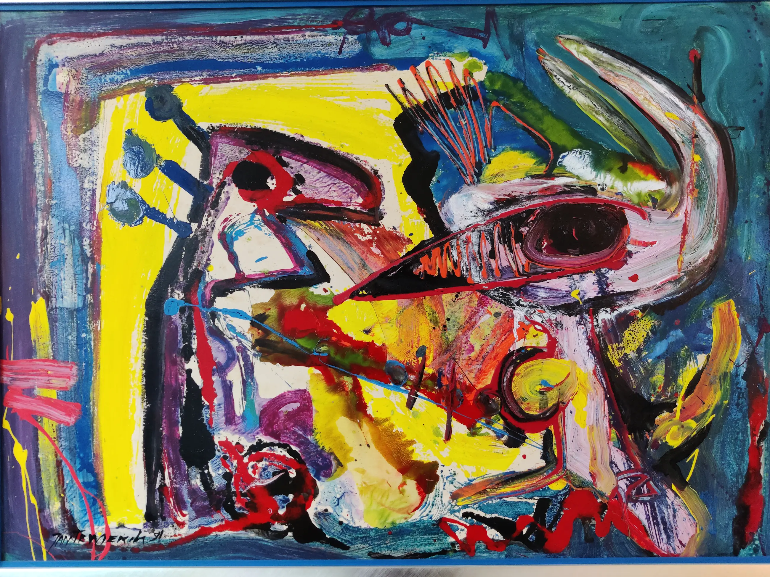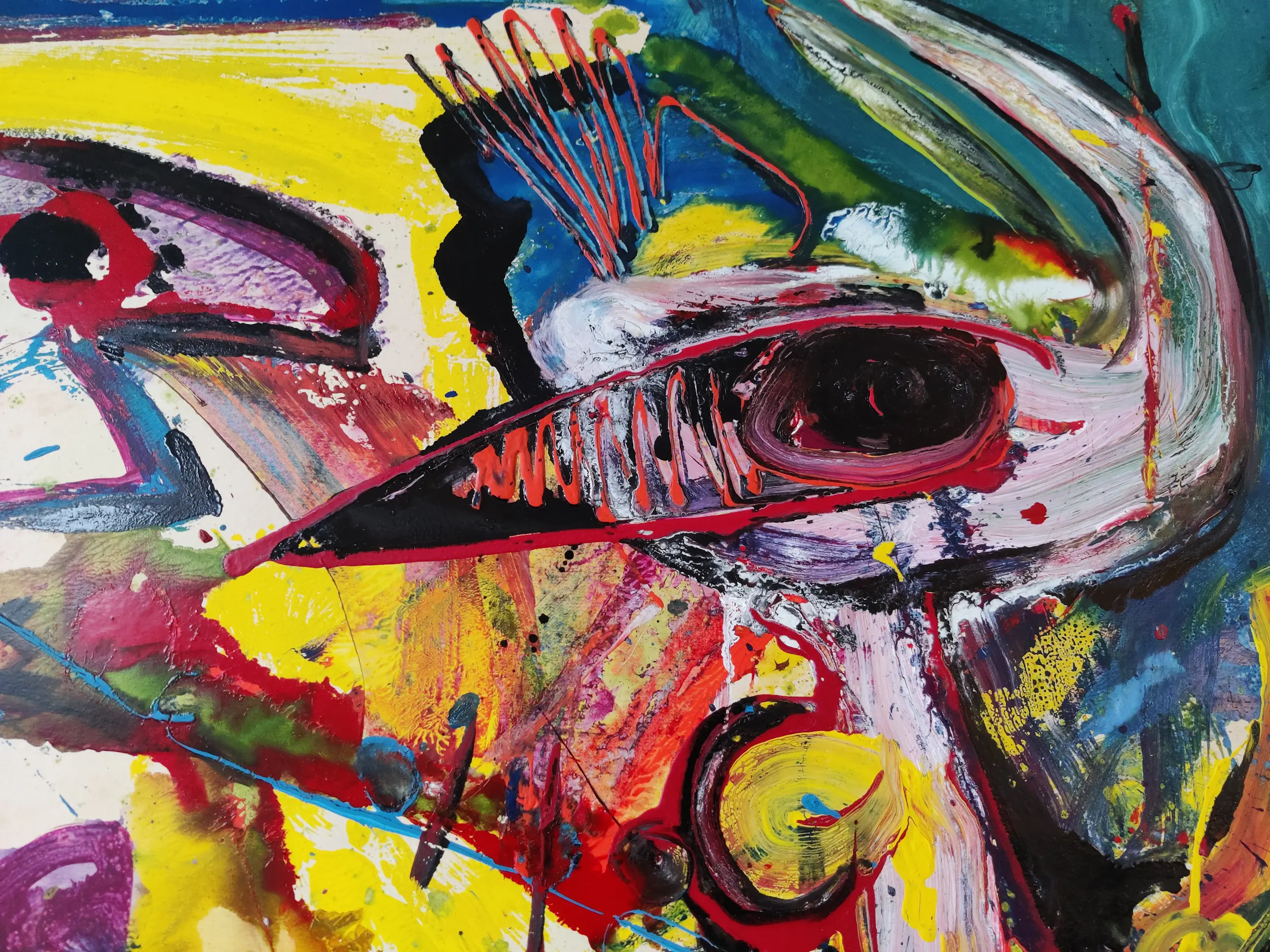 Dit prachtige kleurrijke werk van Jan te Wierik spat van het doek. De felgekleurde - en voor Te Wierik zo kenmerkende - fabeldieren zijn met gemengde technieken aangebracht op het doek. De dikke klodders verf en de snelle streken op de zwarte achtergrond geven het werk diepte en zorgen er bijna voor dat de fabeldieren tot leven komen.