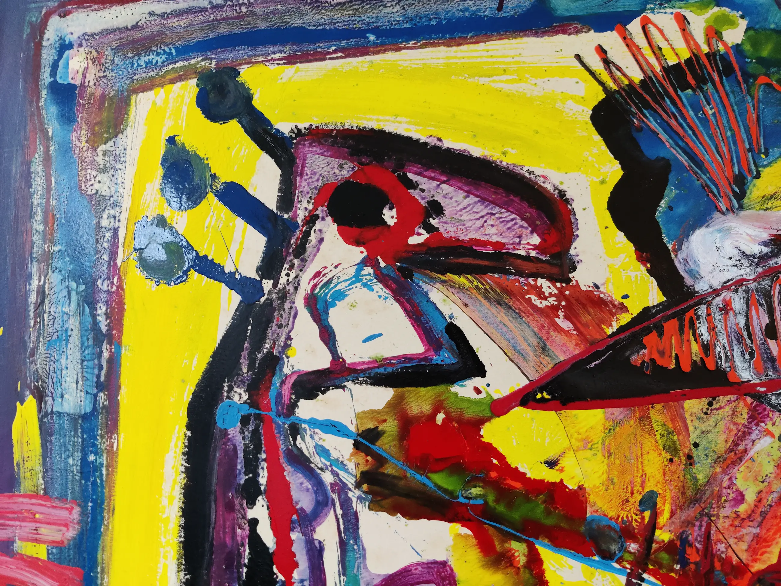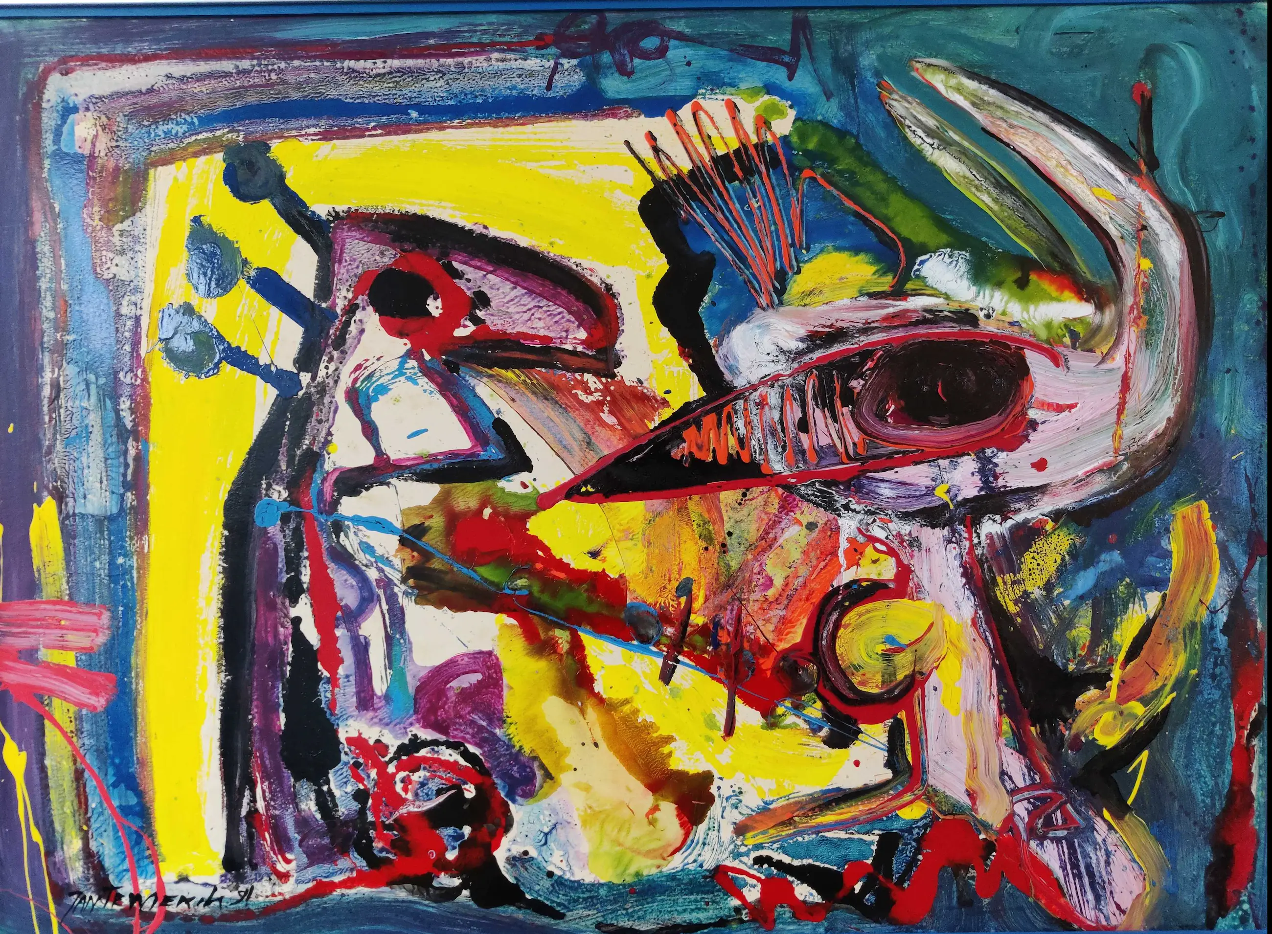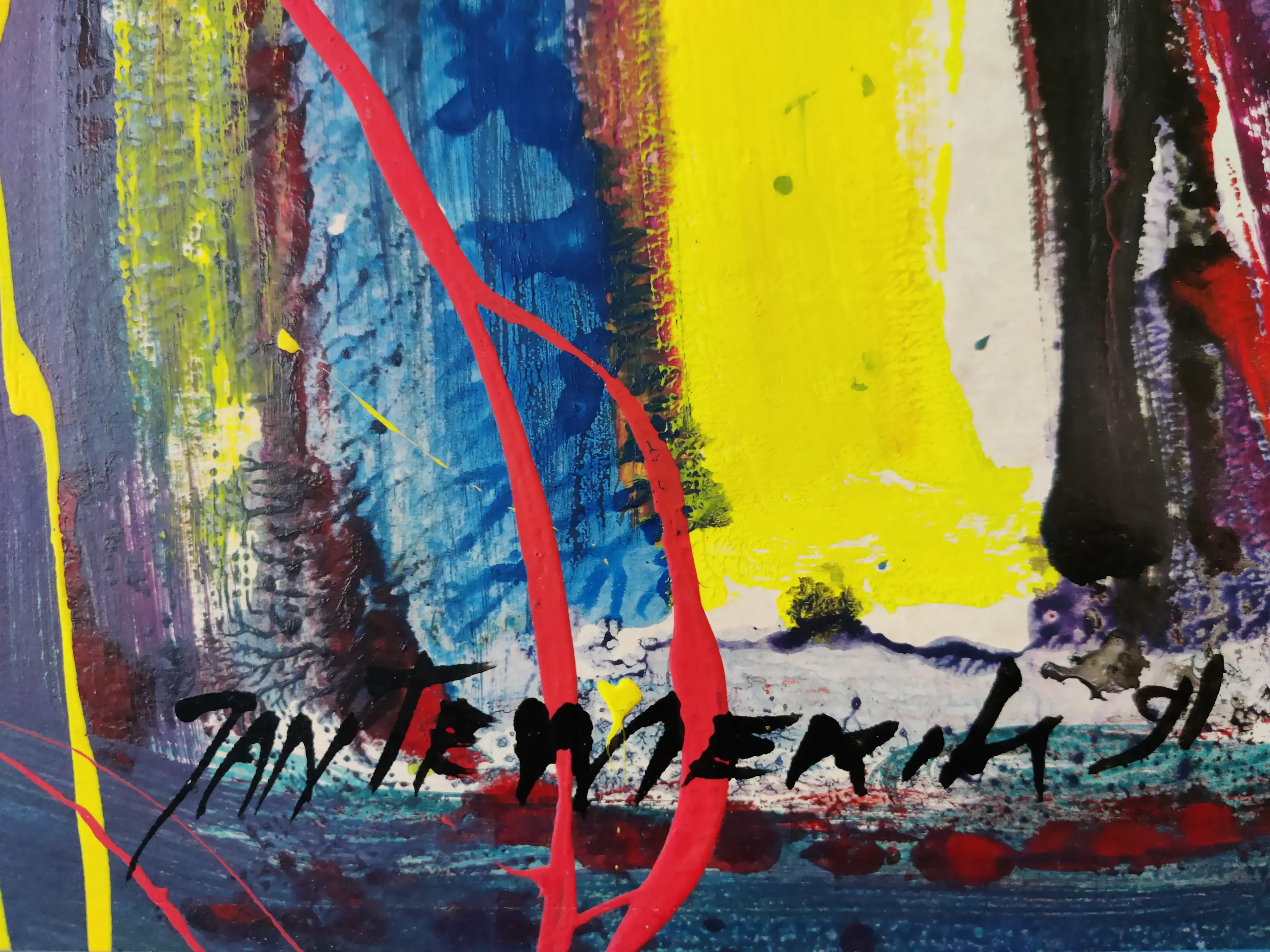 Dit prachtige kleurrijke werk van Jan te Wierik spat van het doek. De felgekleurde - en voor Te Wierik zo kenmerkende - fabeldieren zijn met gemengde technieken aangebracht op het doek. De dikke klodders verf en de snelle streken op de zwarte achtergrond geven het werk diepte en zorgen er bijna voor dat de fabeldieren tot leven komen.