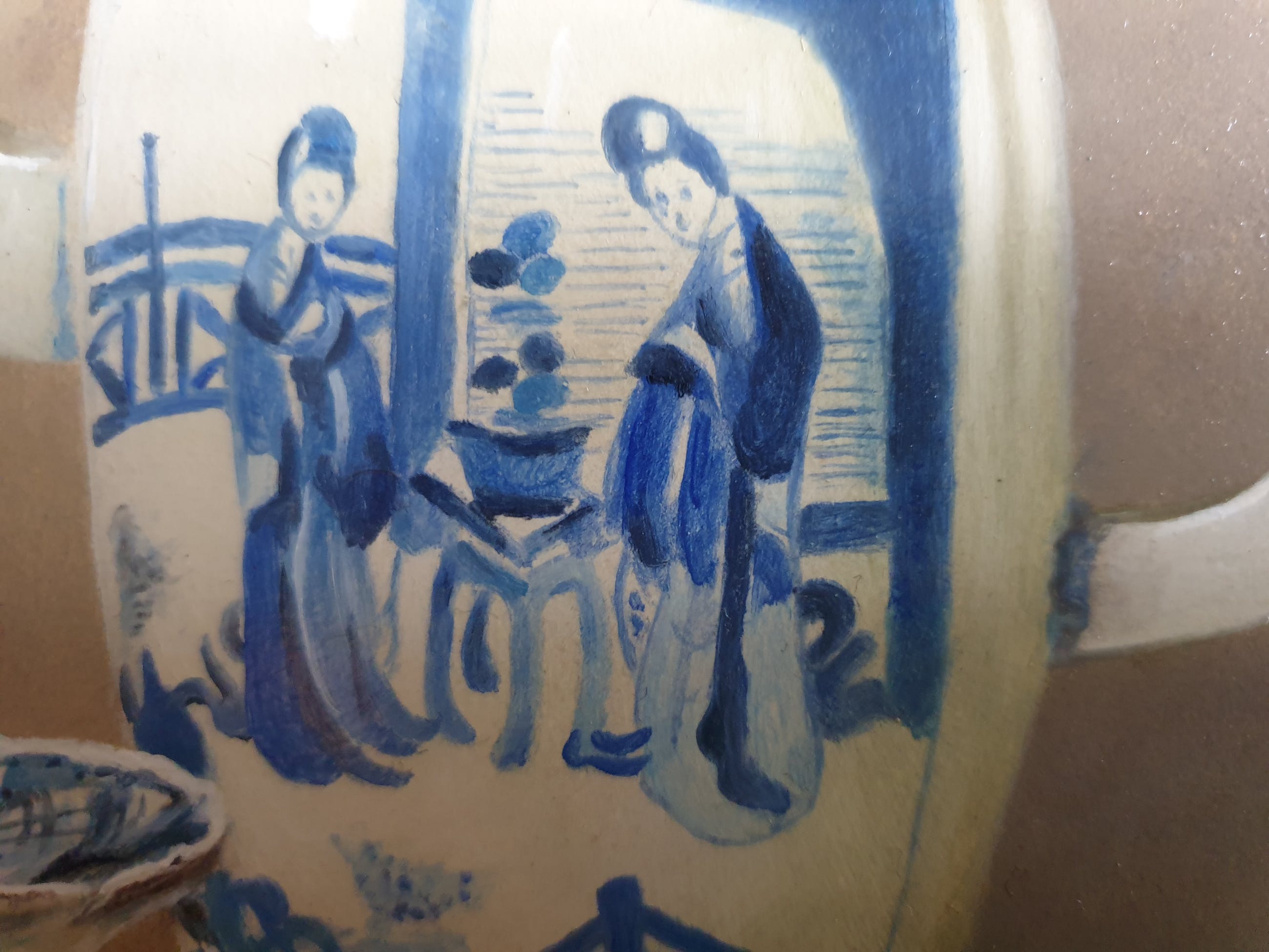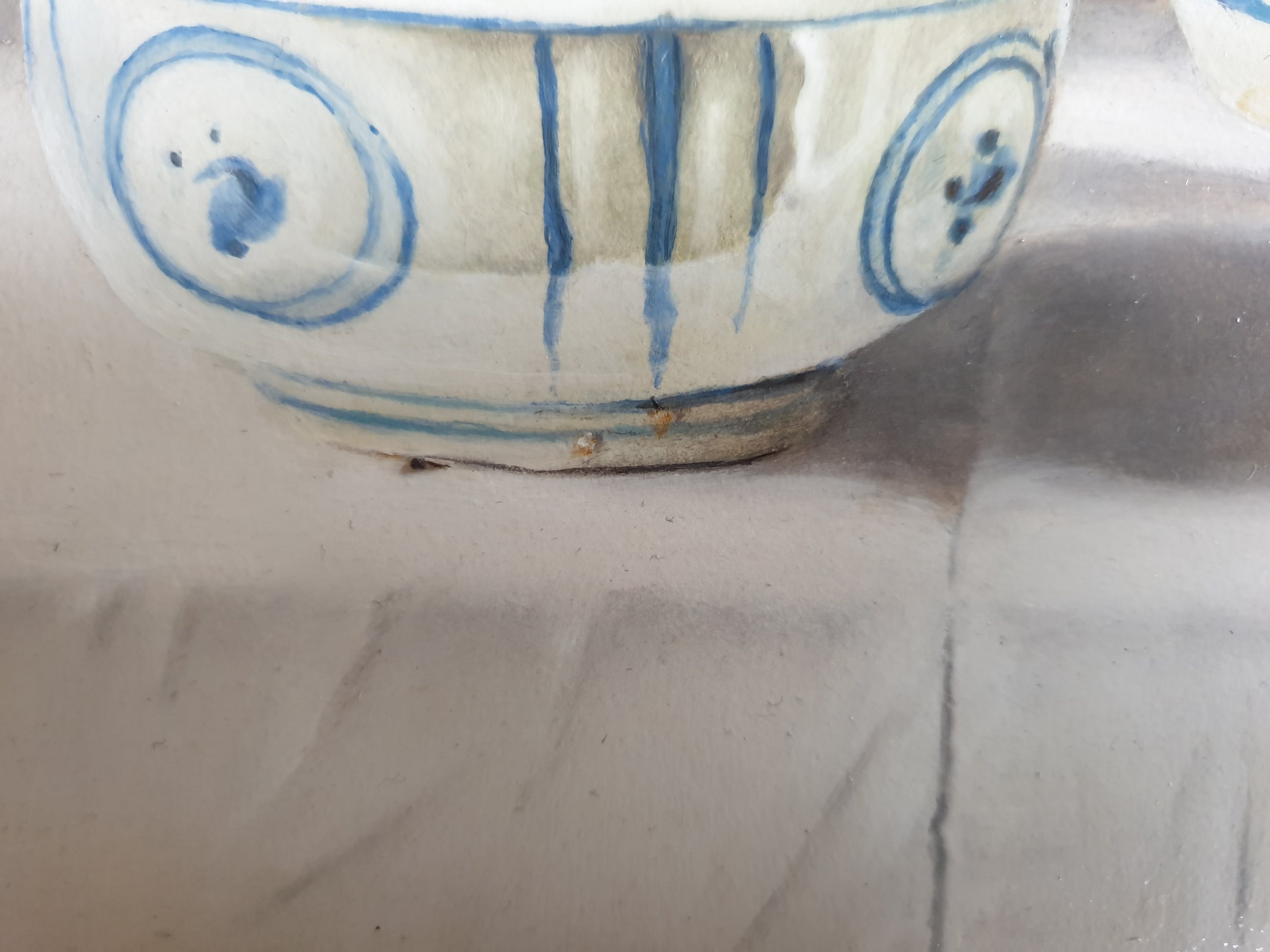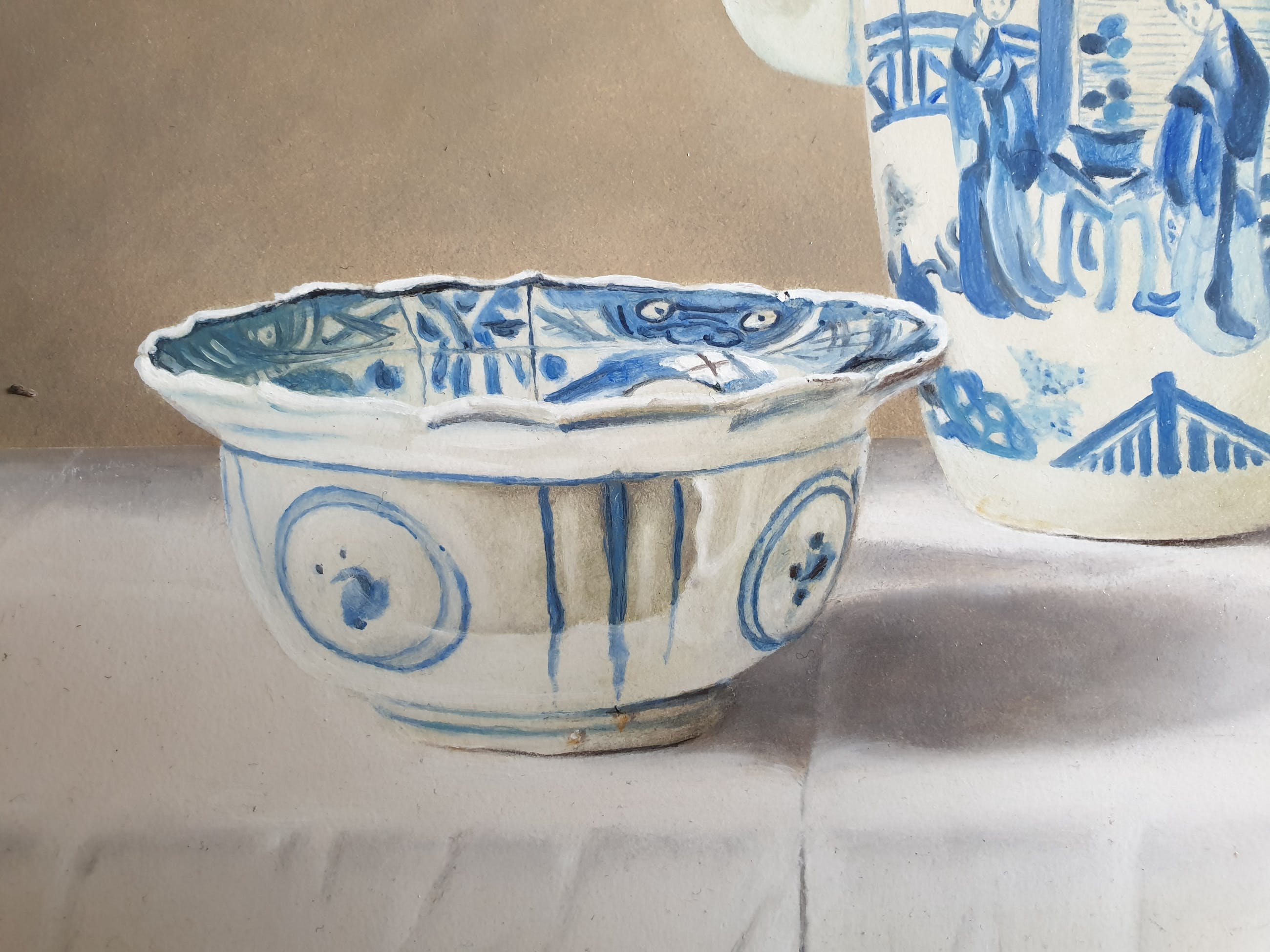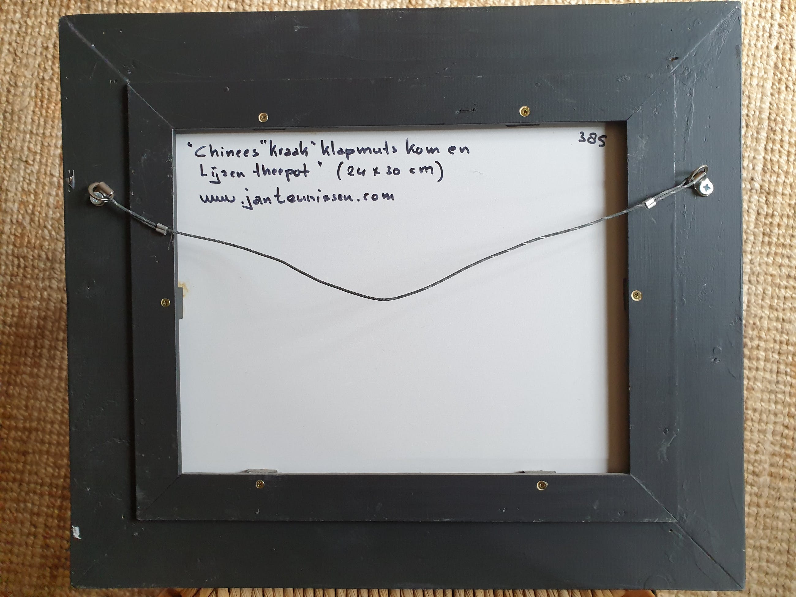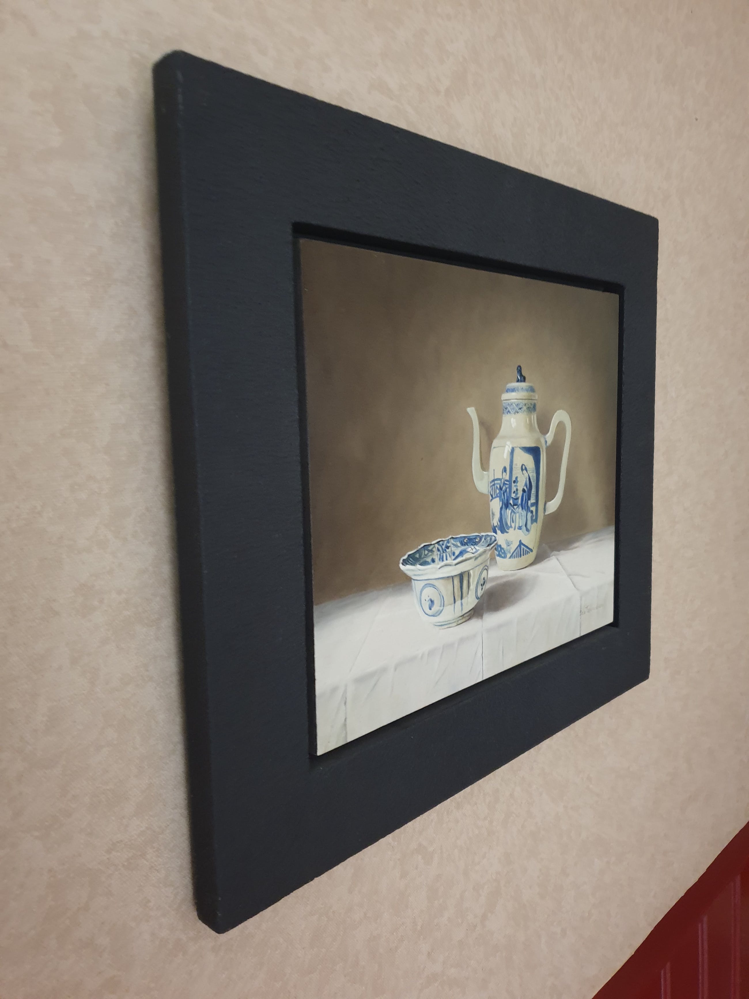 Mooi stilleven met de afbeelding van kostbaar Chinees porselein geplaatst tegen een lichte achtergrond op een wit gestreken lafelkleed. Het schilderijtje is zweven ingelijst in een matzwarte overhoeks afgewerkte houten lijst.