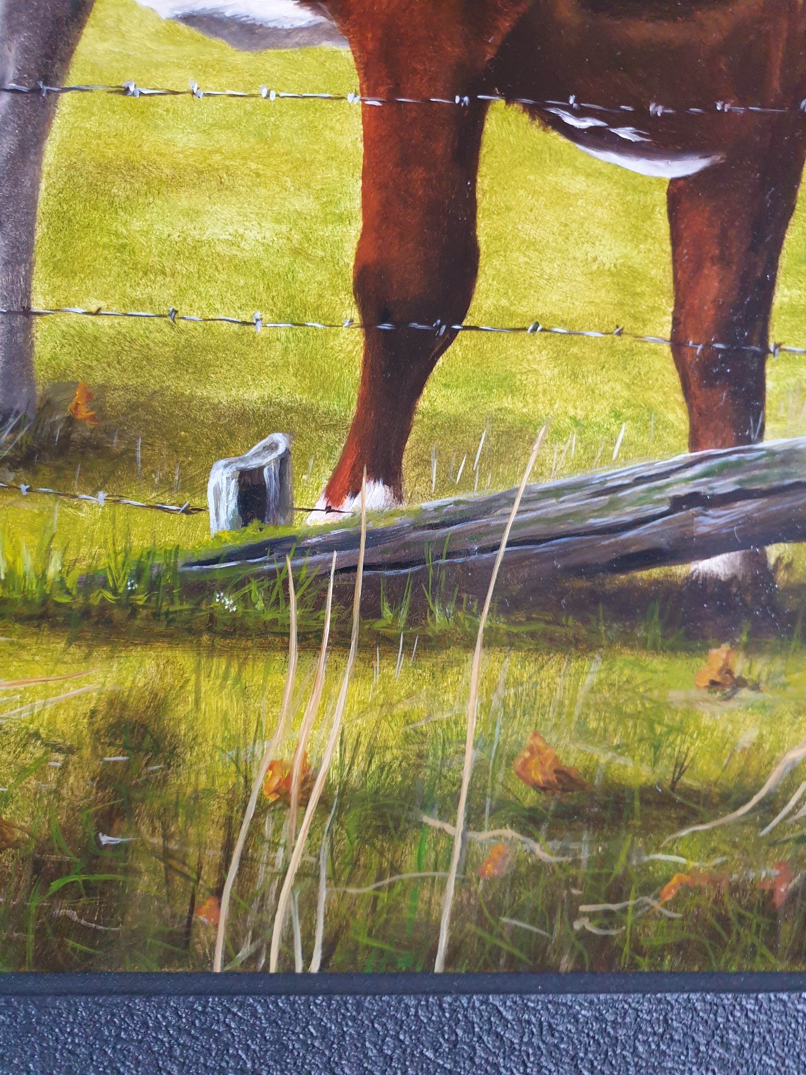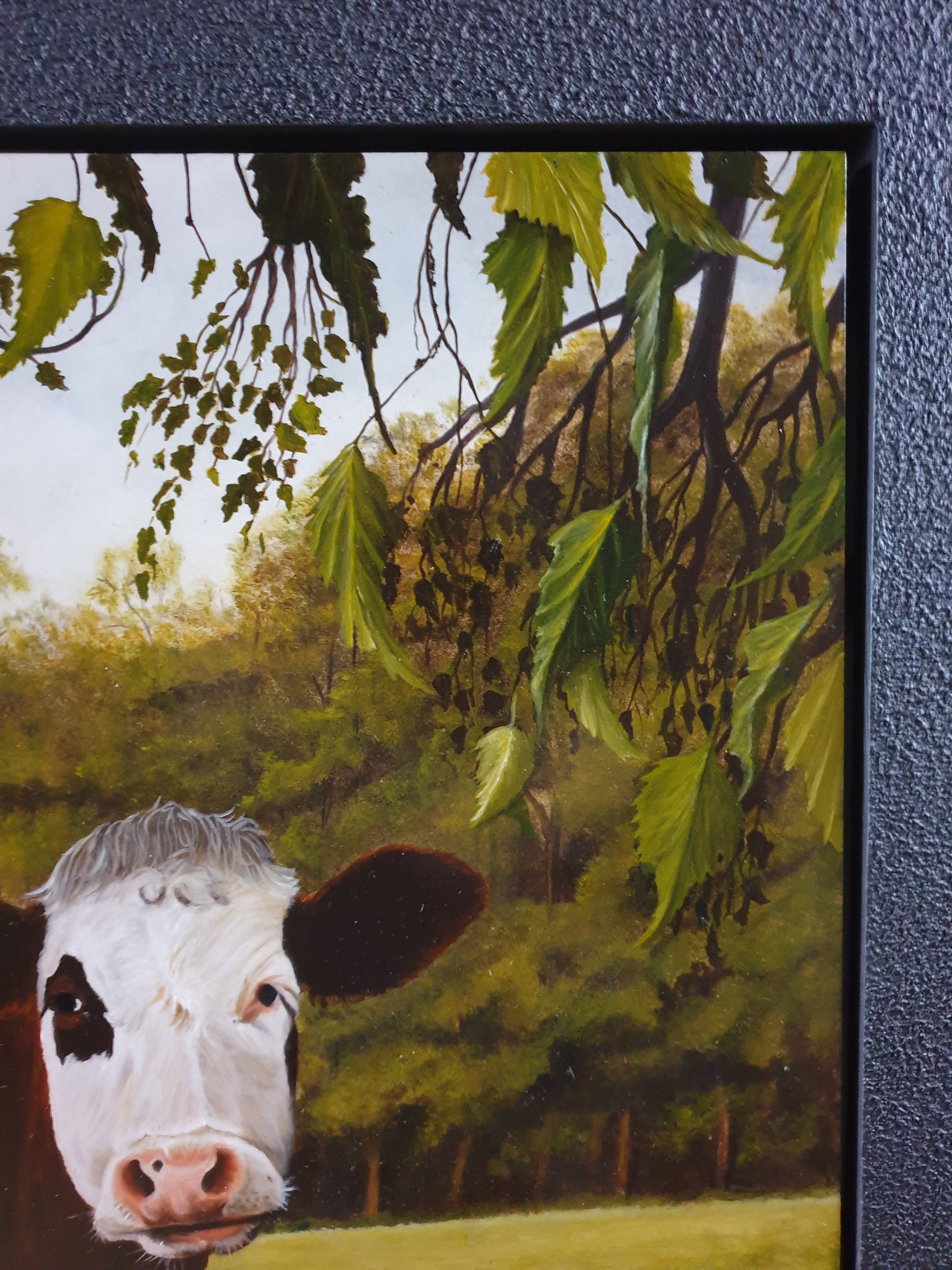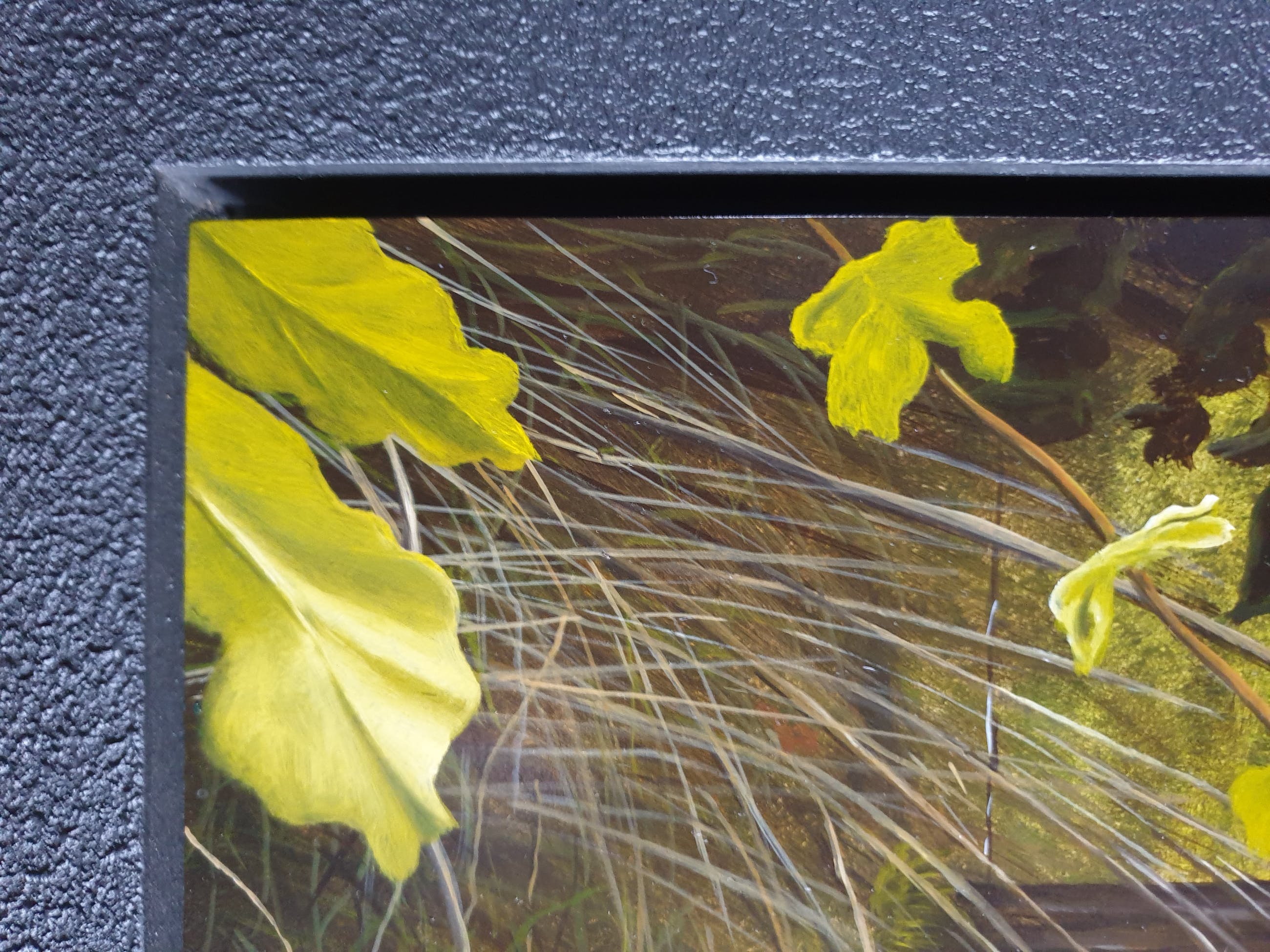 Schilderij is in prima staat, zwevend ingelijst in een overhoeks afgewerkte matzwarte baklijst