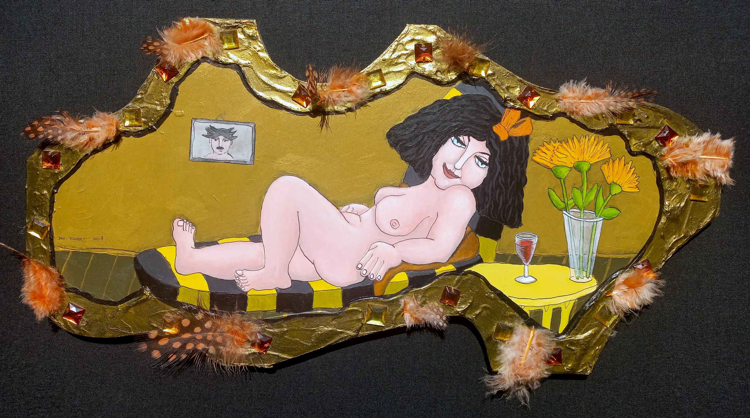 Gemengde techniek (olieverf, neprobijnen en veertjes) op hout, links gesigneerd en gedateerd (2008). In handgeschilderde “lijst” die enigszins de vorm van Australië heeft (zeg ik als iemand ergens in het spectrum, *kuch*). In zeer goede conditie.