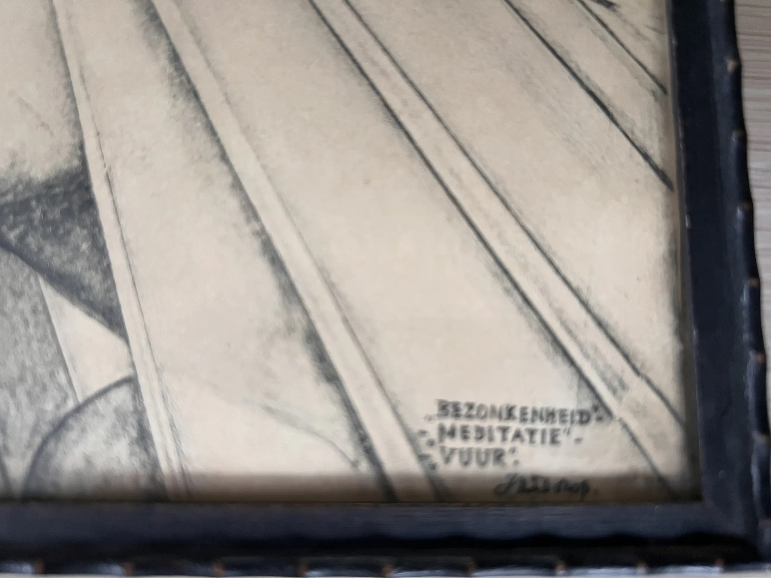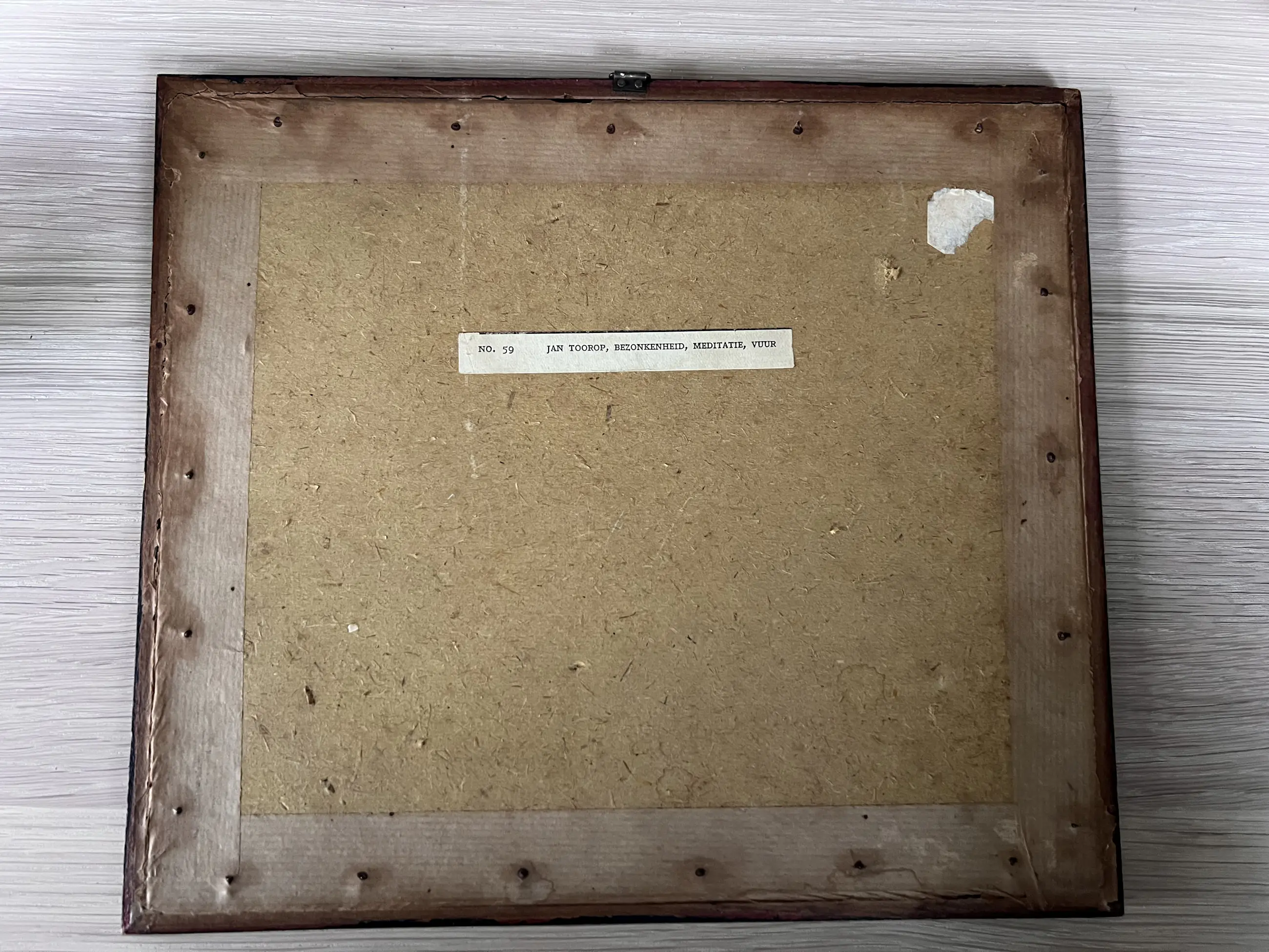 Uit erfenis verkregen een ingelijste Prent van de Nederlandse kunstenaar Jan Toorop (1858-1928) uit 1923 getiteld 'Bezonkenheid, meditatie, vuur'. Uitgegeven door Felix Anrahamson te Amsterdam.