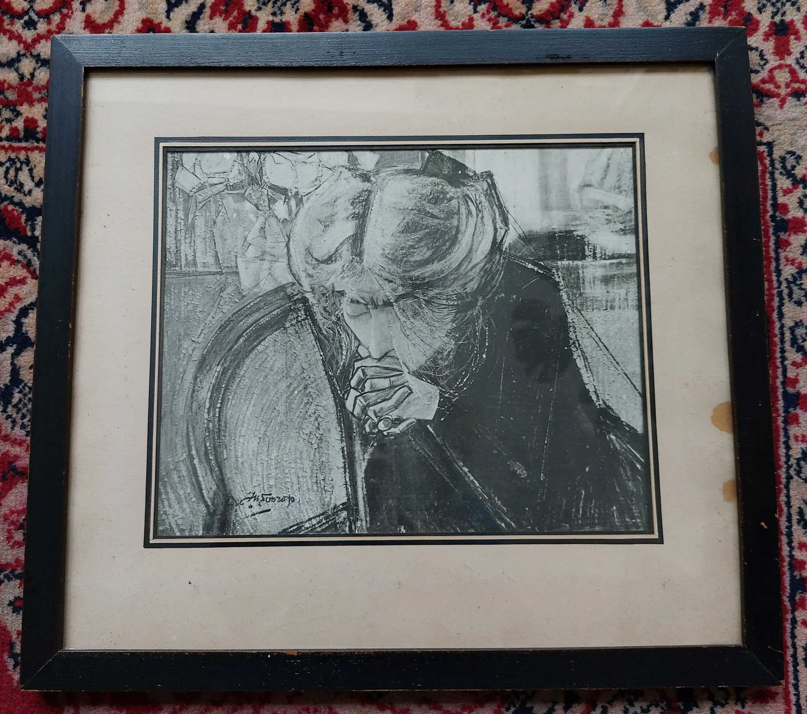 De litho is in zeer goede staat maar er zijn 3 vlekken rechts op het passe-partout.