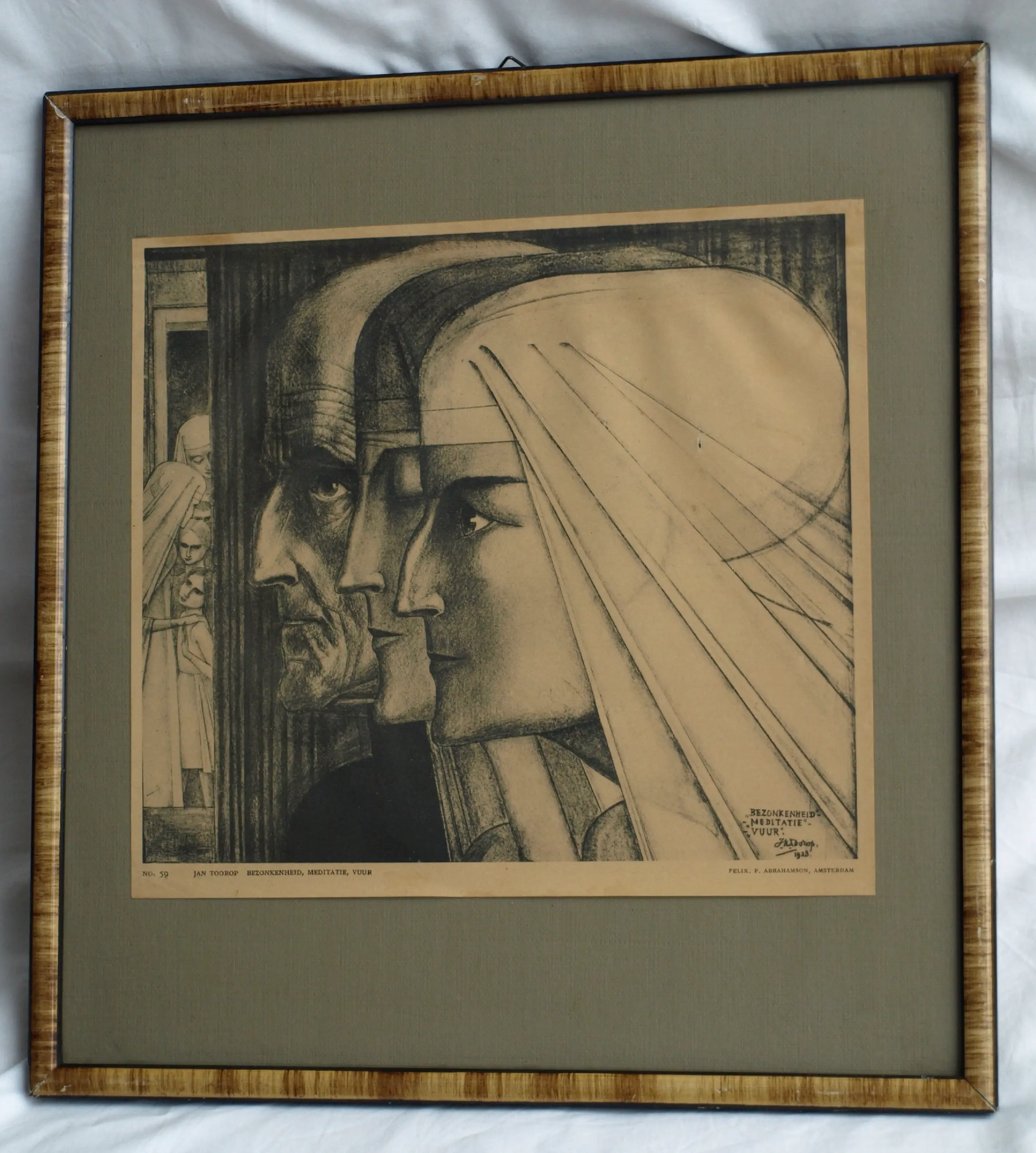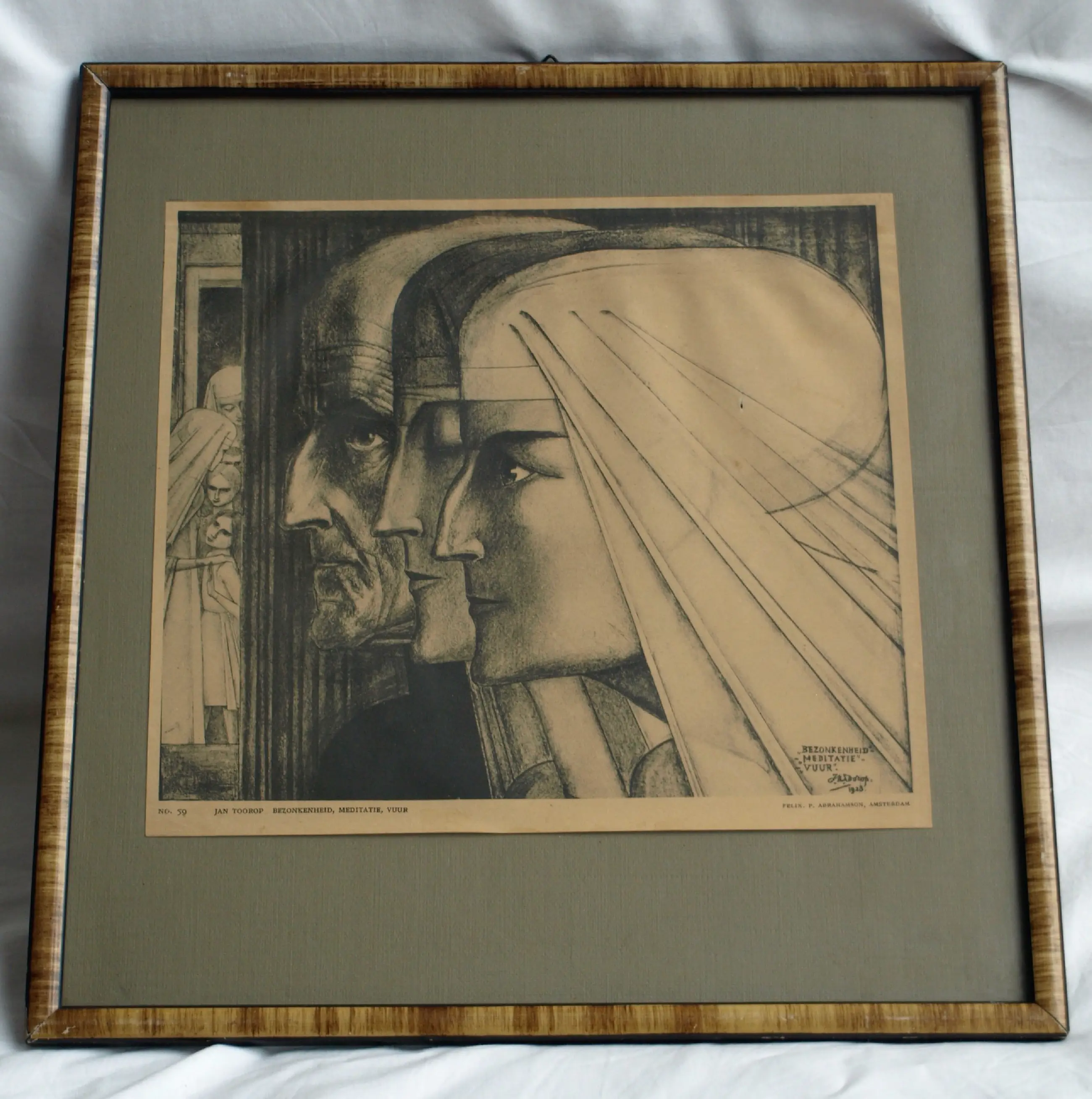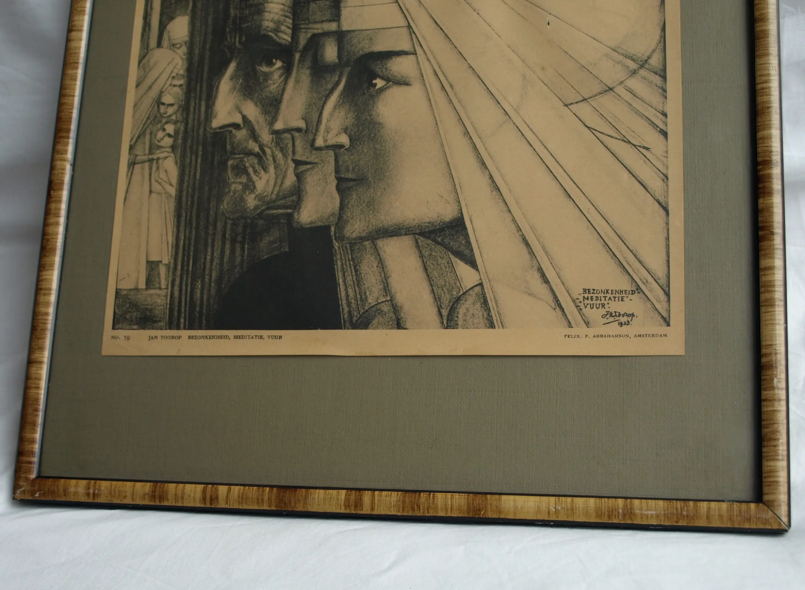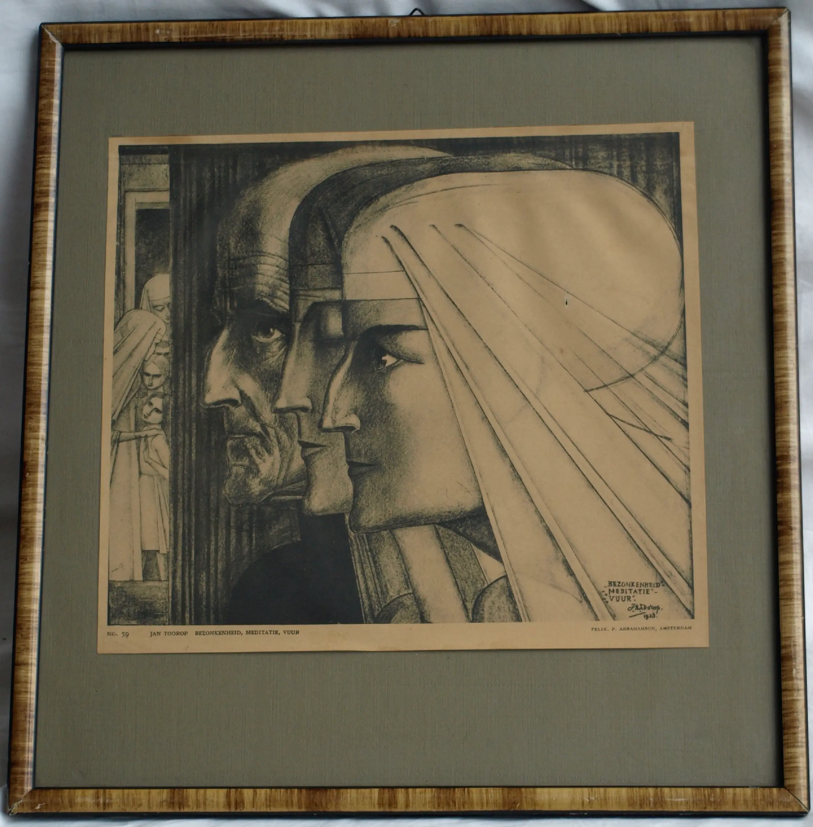 Een ingelijste prent uit 1923 van de Nederlandse kunstenaar Jan Toorop (1858-1928), getiteld “Bezonkenheid, Meditatie, Vuur”. Uitgegeven door Felix P. Abrahamson, Amsterdam.