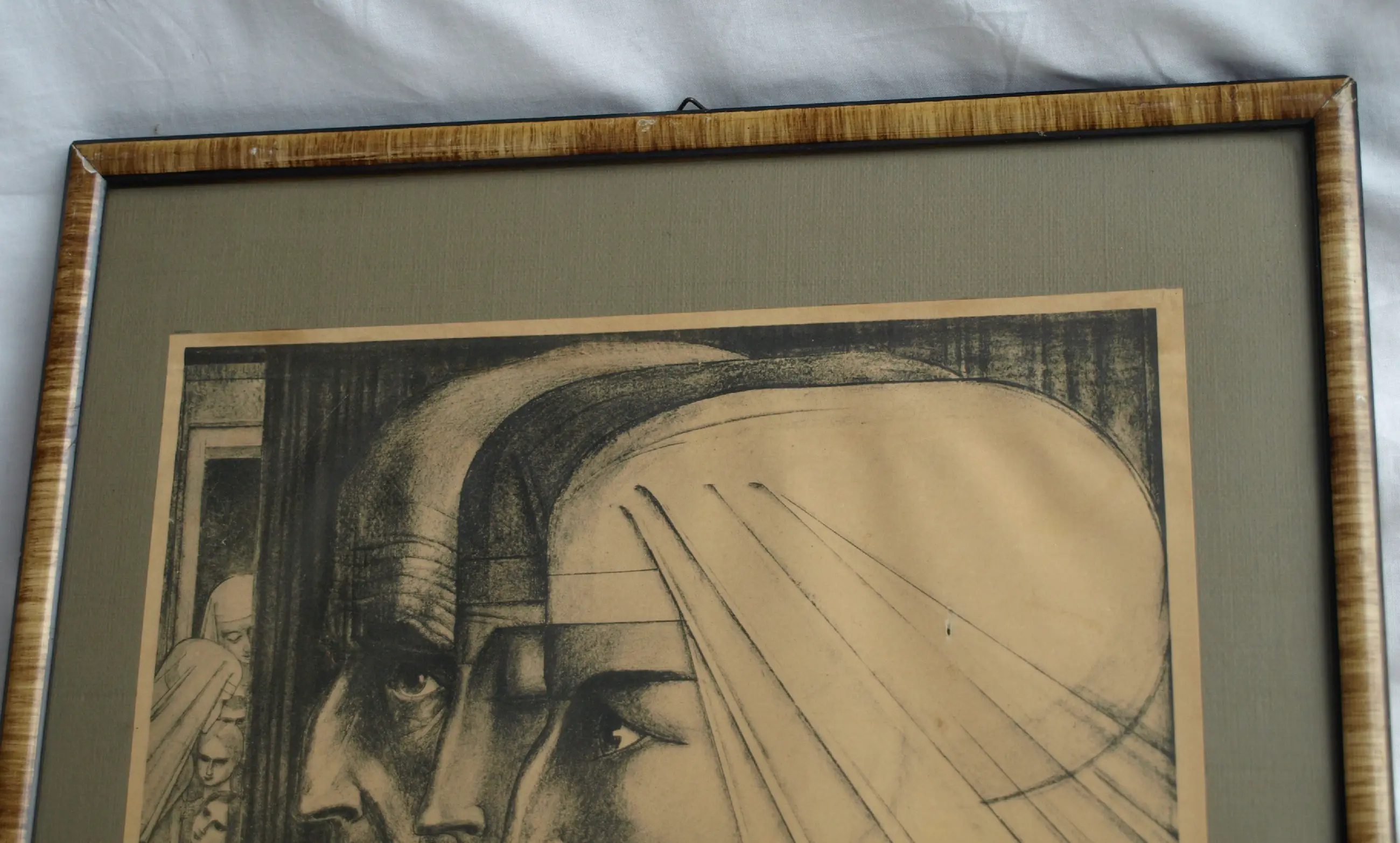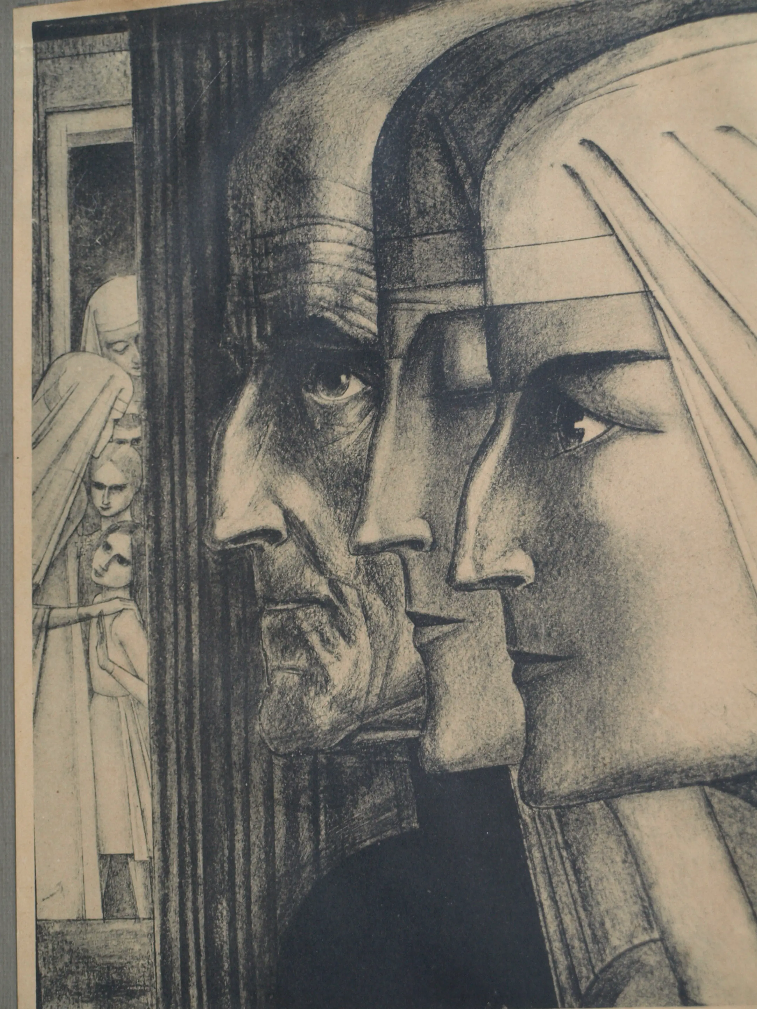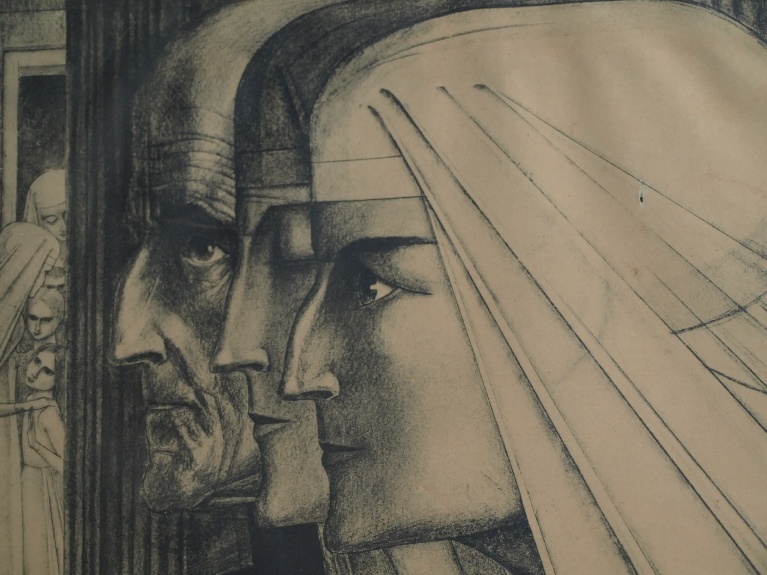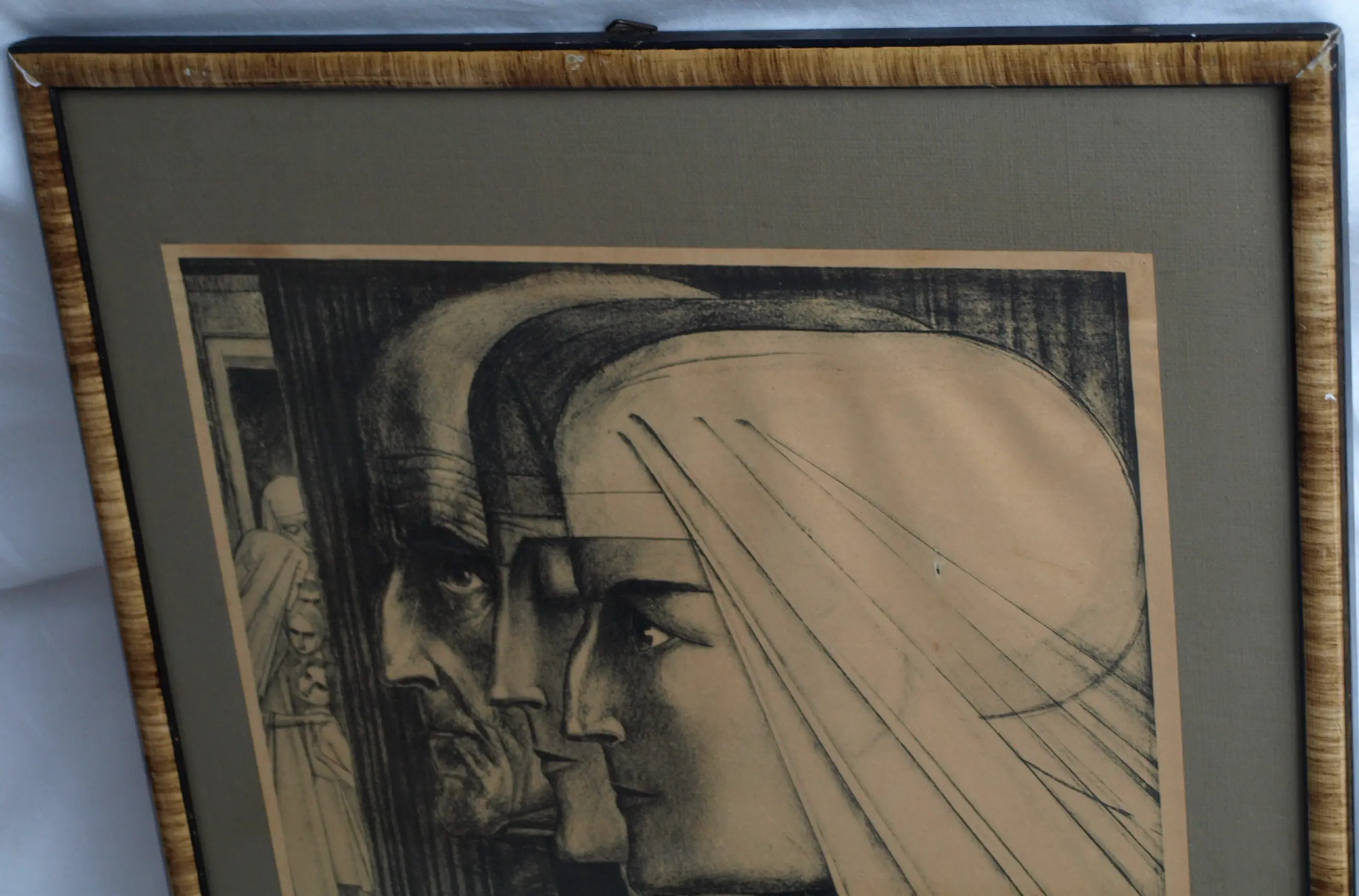 Een ingelijste prent uit 1923 van de Nederlandse kunstenaar Jan Toorop (1858-1928), getiteld “Bezonkenheid, Meditatie, Vuur”. Uitgegeven door Felix P. Abrahamson, Amsterdam.