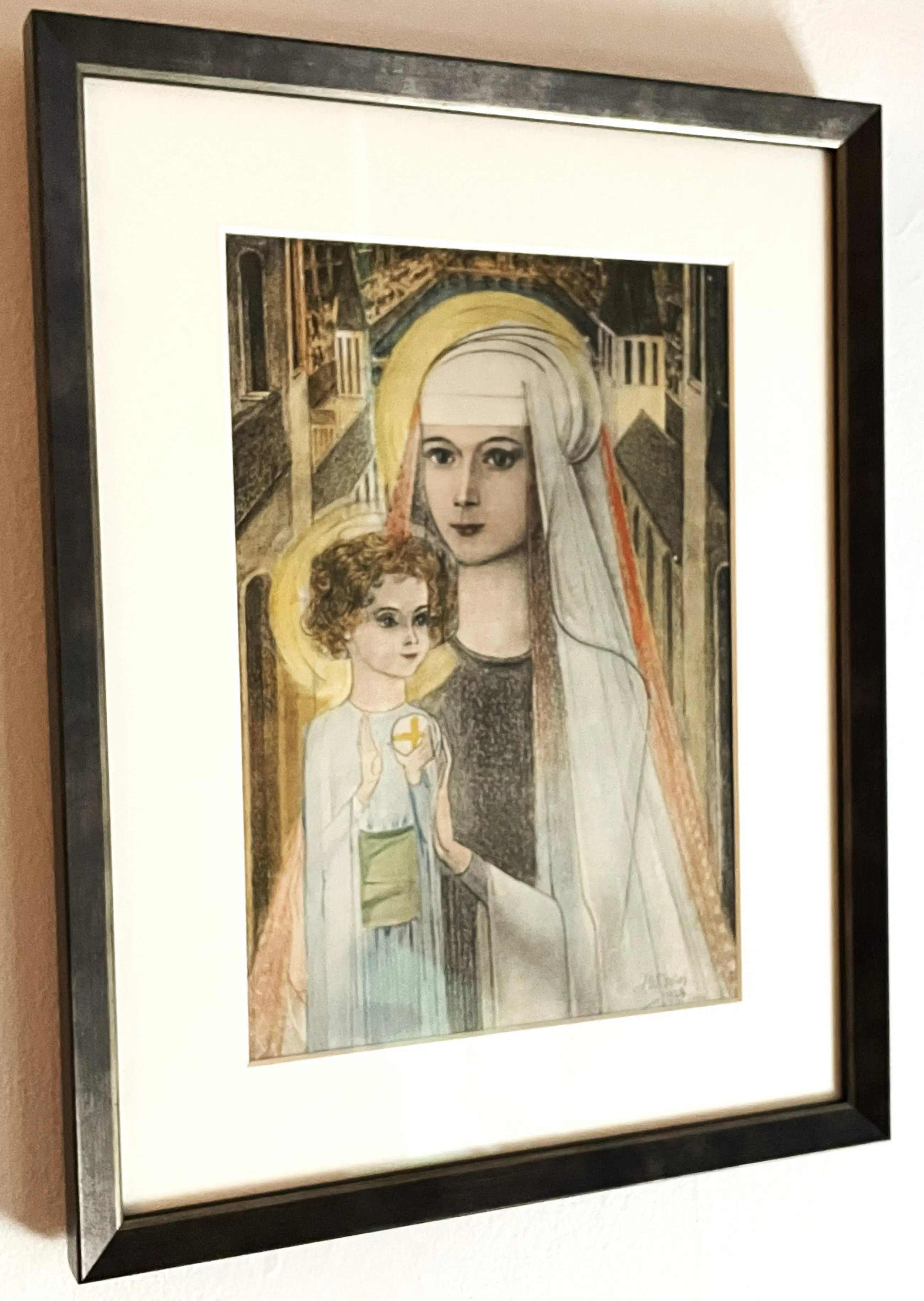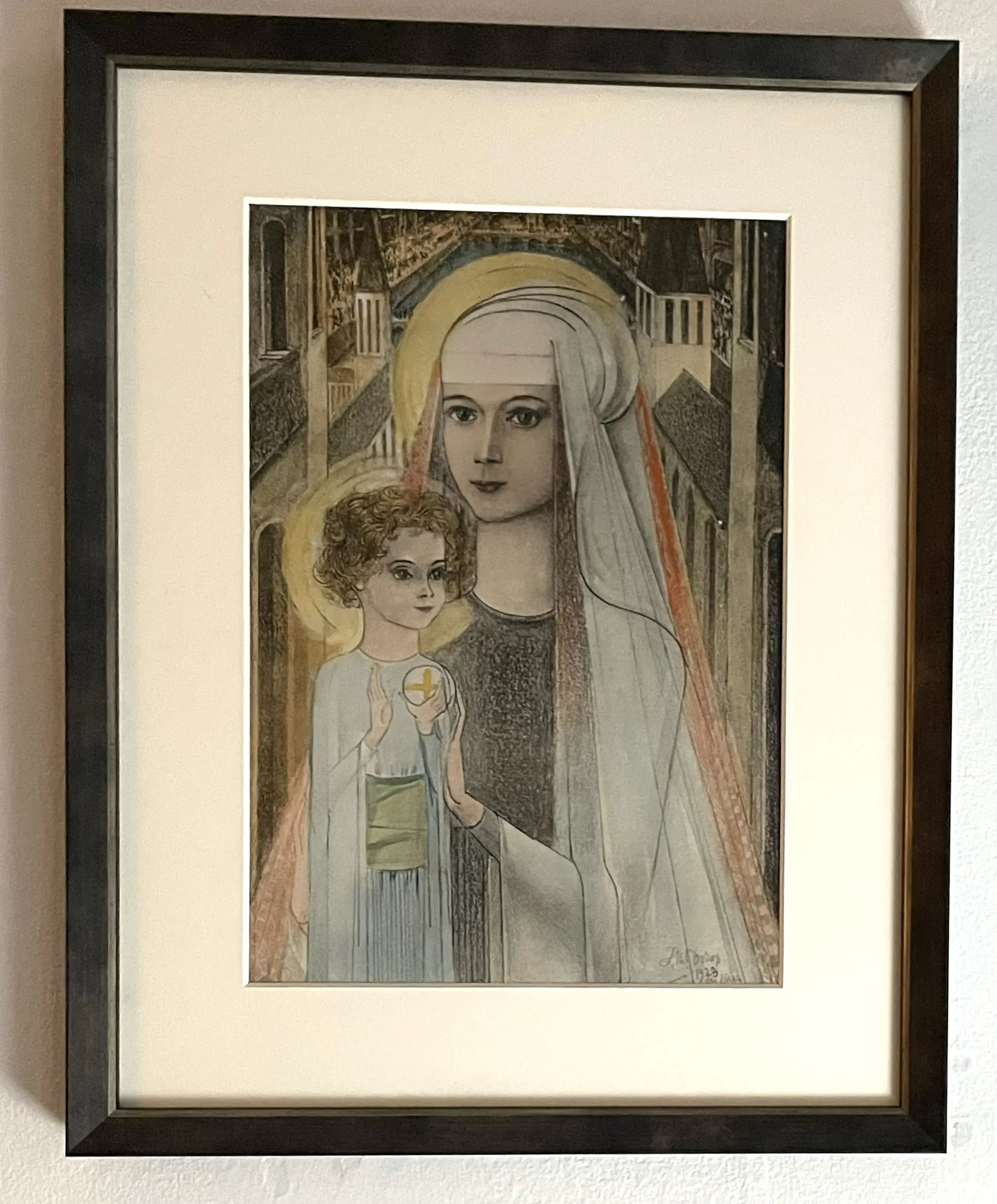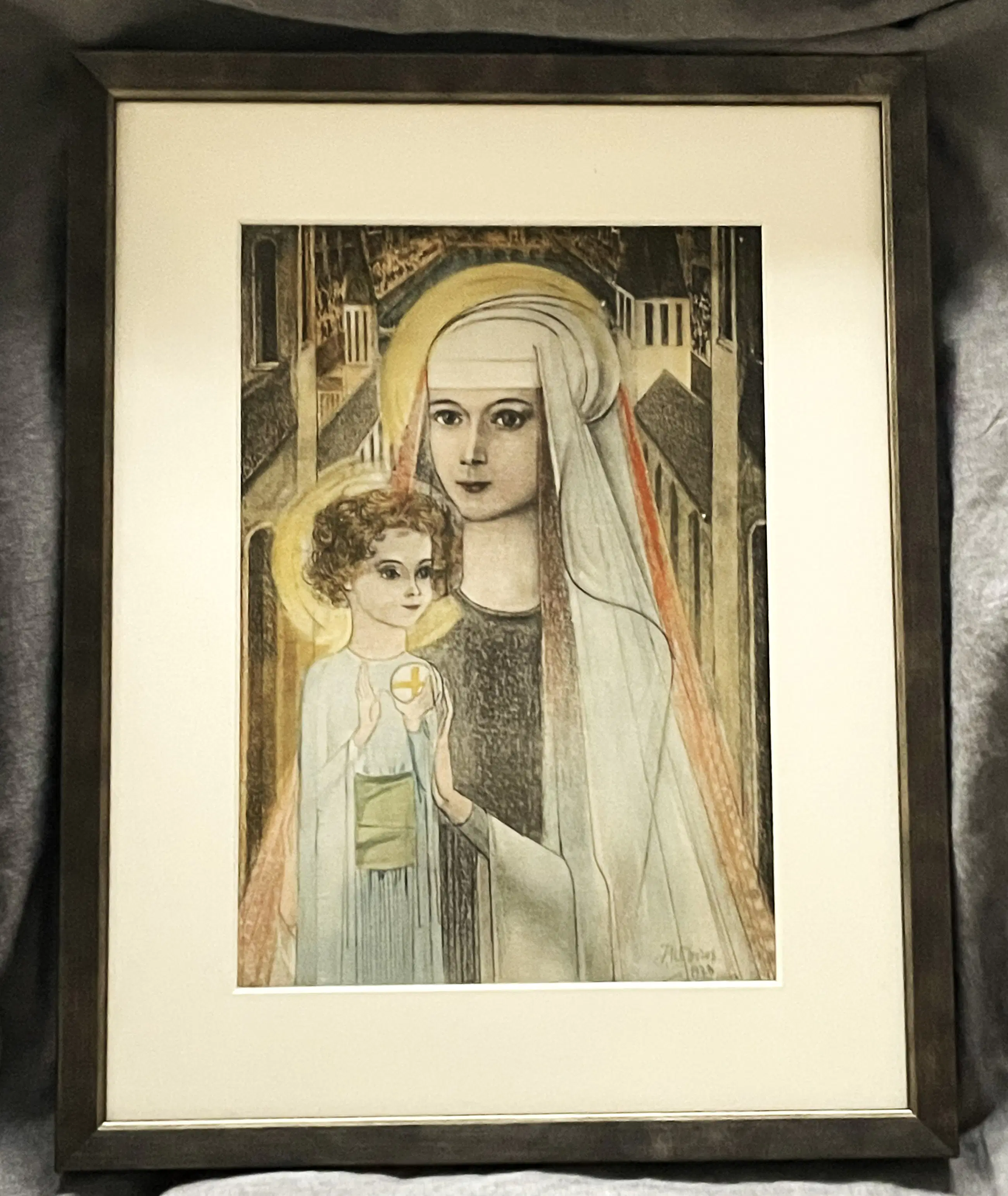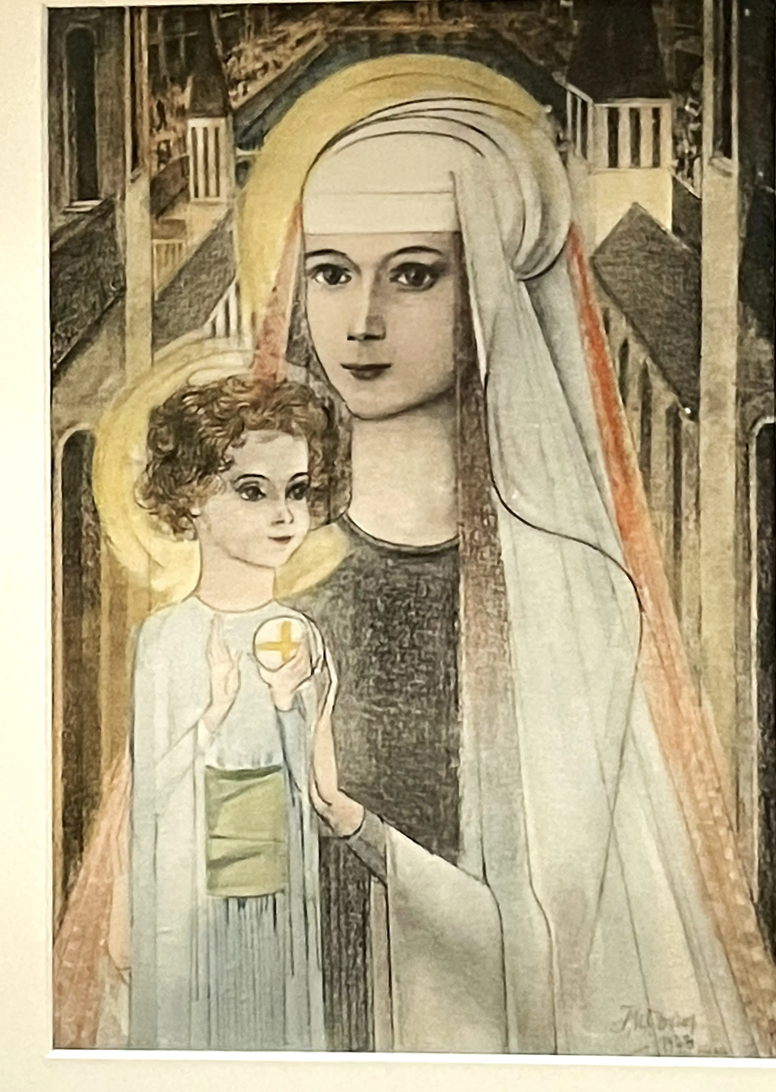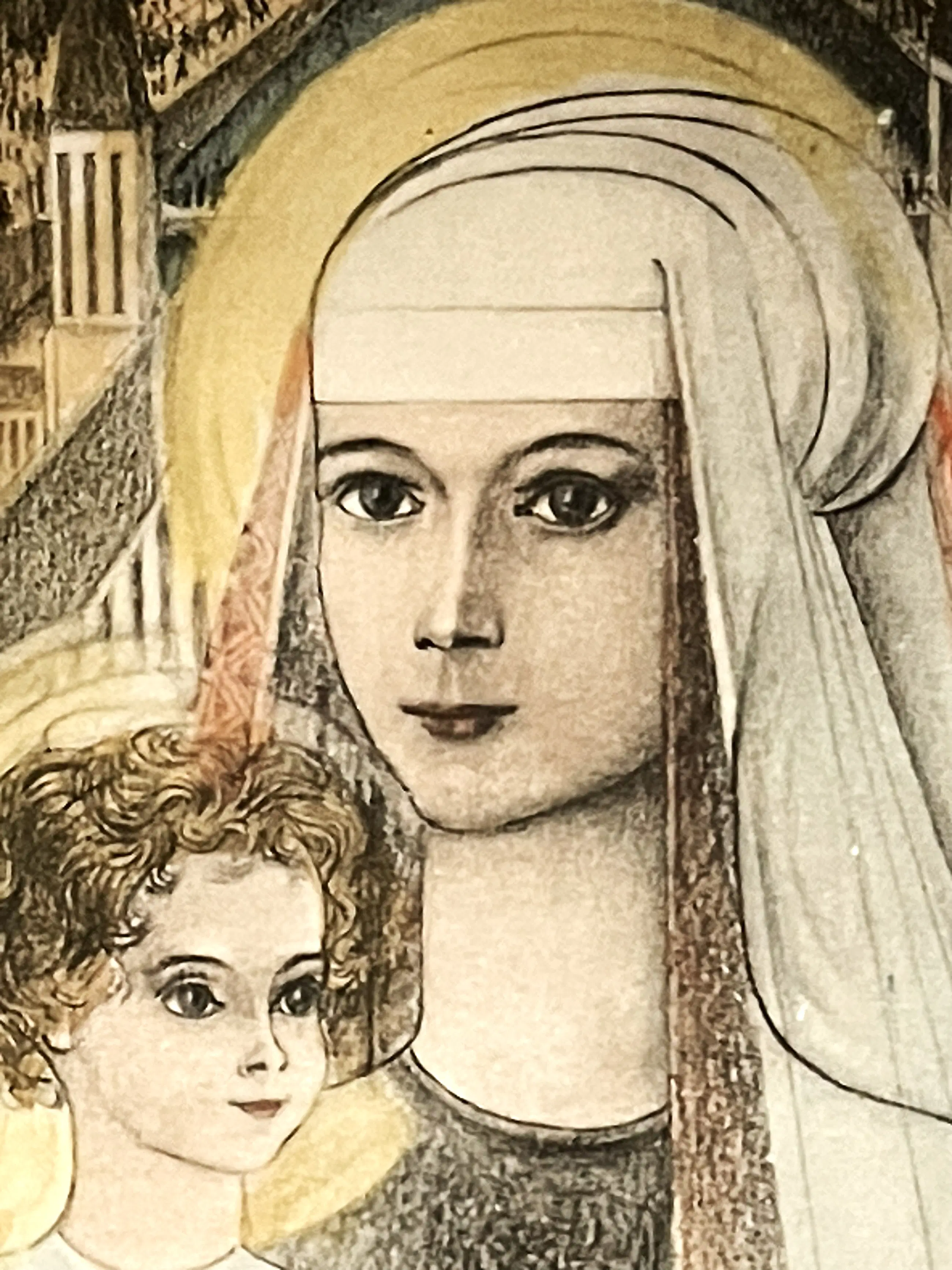 Deze hand-ingekleurde litho is gebaseerd op Jan Toorops beroemde krijttekening Maria met Kind, die hij in 1923 in Den Haag vervaardigde.