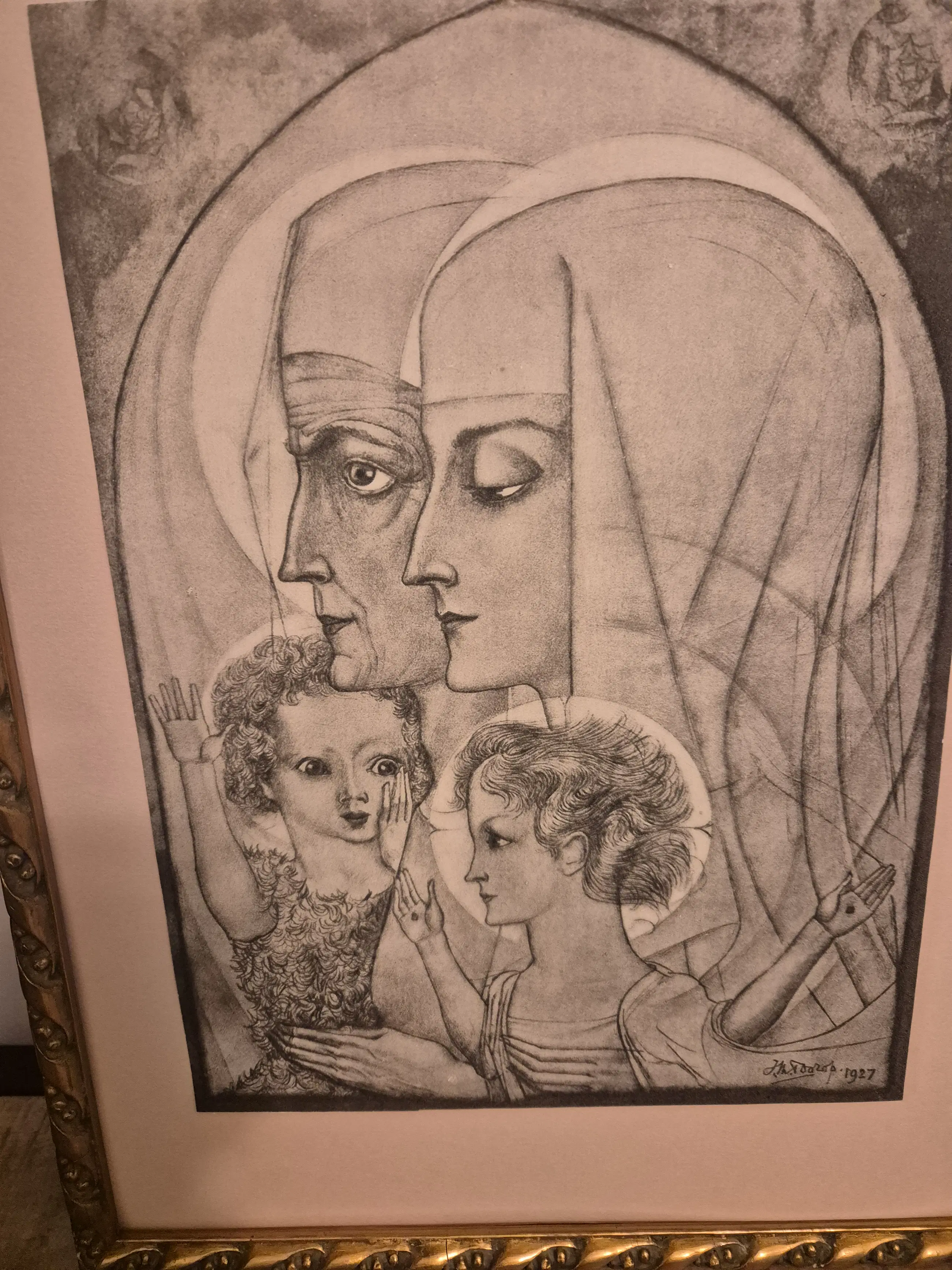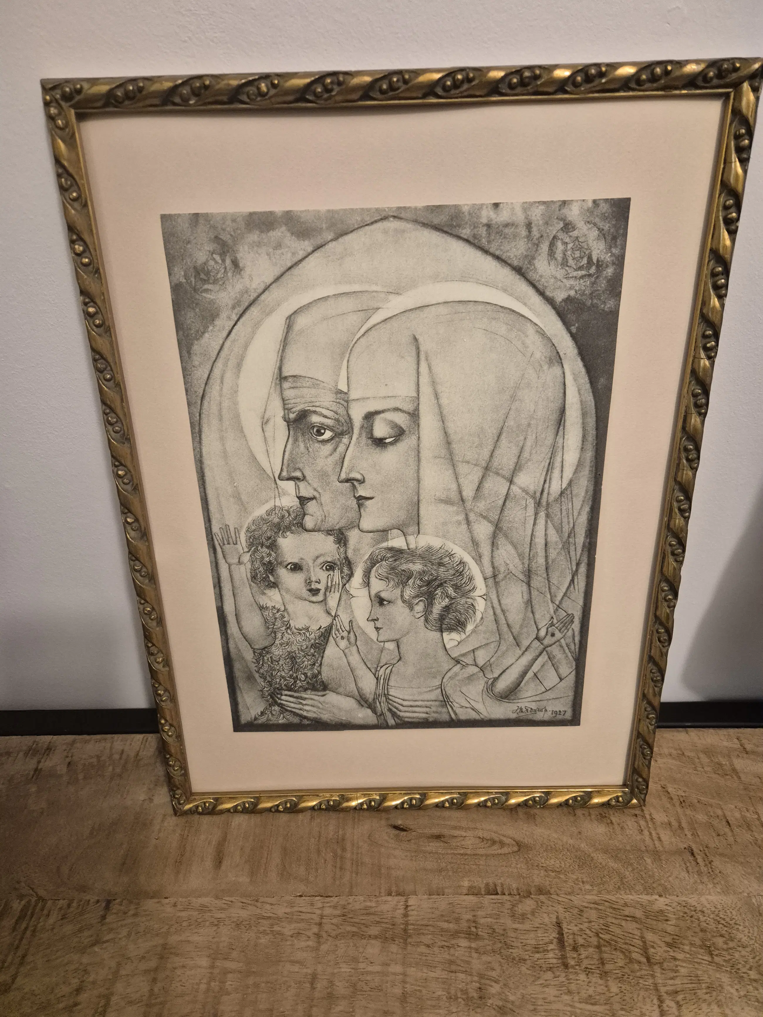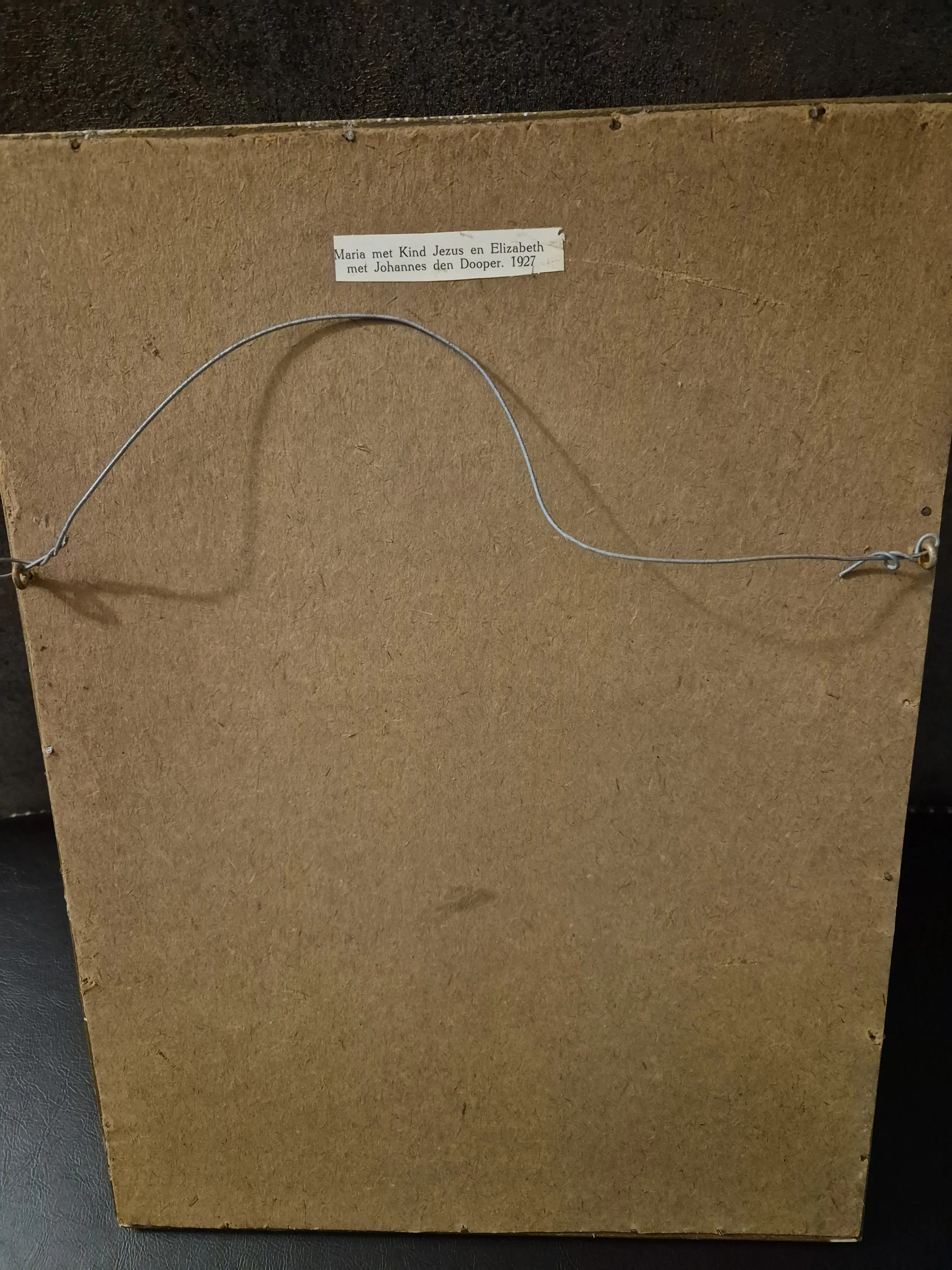 Jan Toorop (1858-1928) was een van de beste Nederlandse Kunstenaars met van Gogh en Mondriaan in periode rond 1900 Toorop werkte in veel Nederlandse Plaatsen BV in Winterswijk Domburg en een aantal jaren in Katwijk aan Zee en Nijmegen ook vaak in het Buitenland het echte werk van deze afbeelding ook Steendruk genoemd maakte Toorop een jaar voor zijn dood,Maria met Kind Jezus en Elizabeth met Johannes Den Dooper in 1927 Deze afbeelding en zeer mooien oude lijst zijn in perfecte staat.