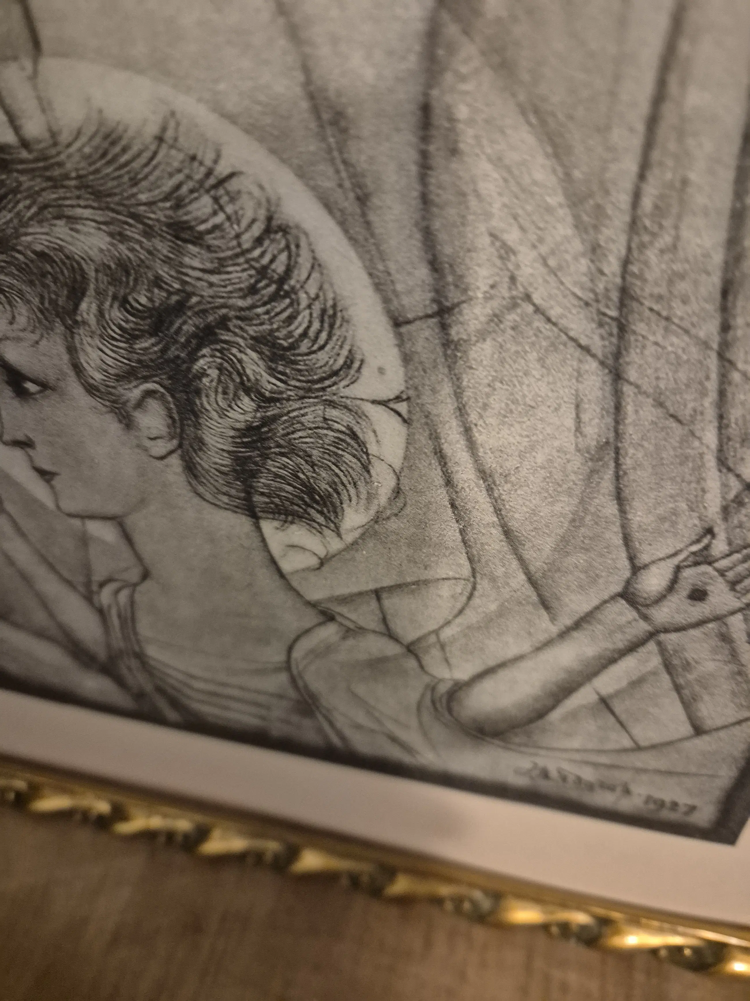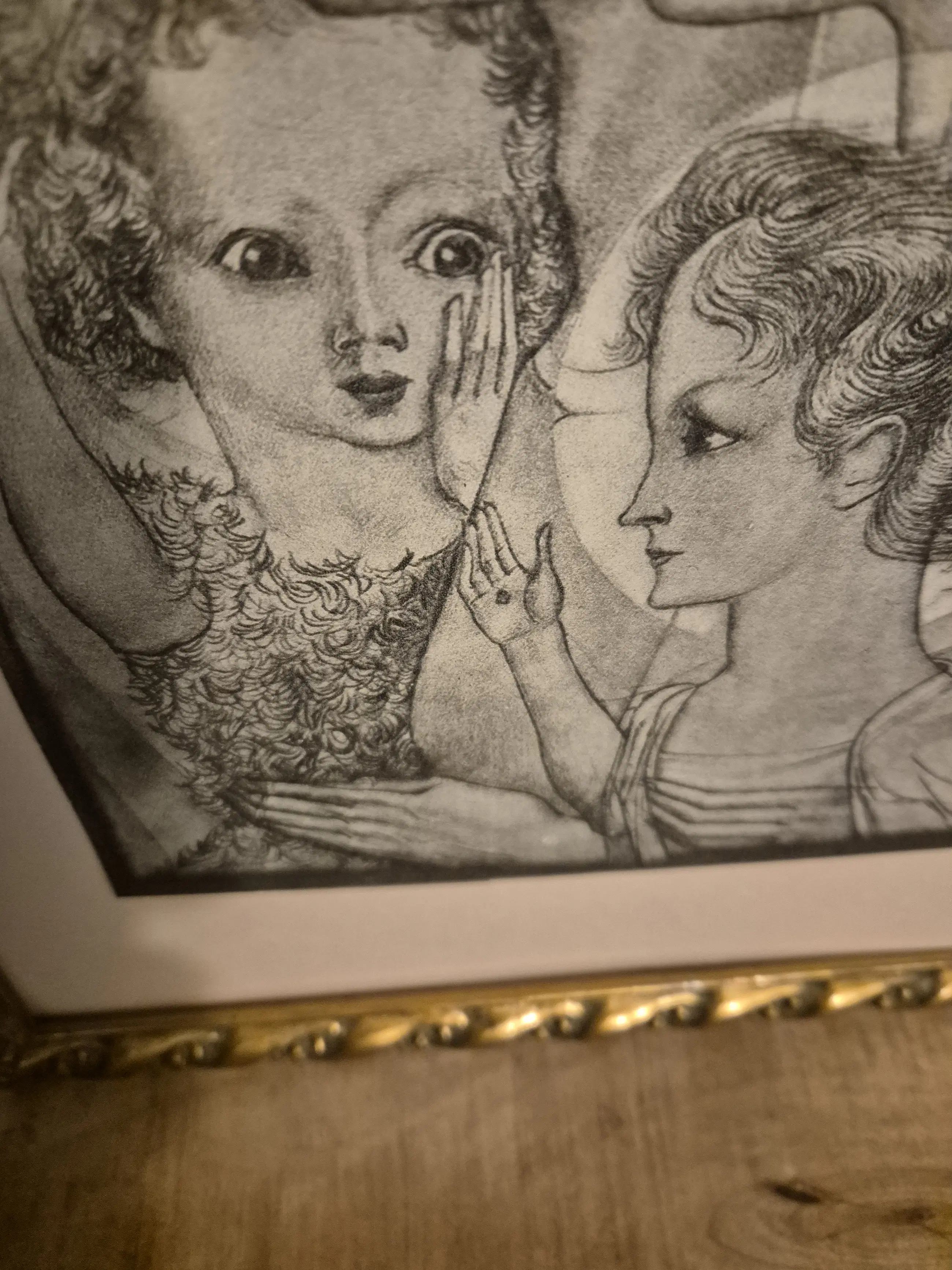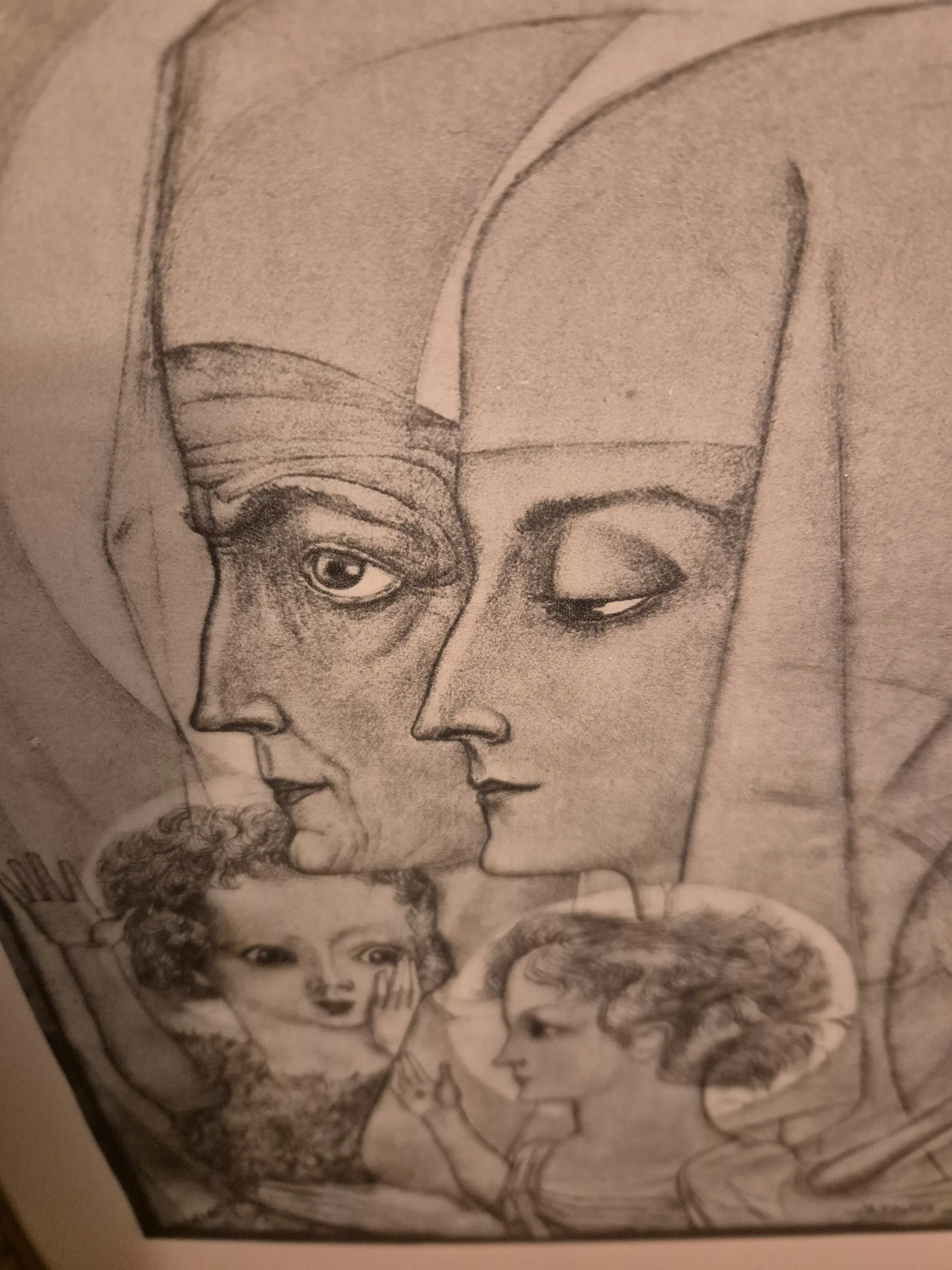 Jan Toorop (1858-1928) was een van de beste Nederlandse Kunstenaars met van Gogh en Mondriaan in periode rond 1900 Toorop werkte in veel Nederlandse Plaatsen BV in Winterswijk Domburg en een aantal jaren in Katwijk aan Zee en Nijmegen ook vaak in het Buitenland het echte werk van deze afbeelding ook Steendruk genoemd maakte Toorop een jaar voor zijn dood,Maria met Kind Jezus en Elizabeth met Johannes Den Dooper in 1927 Deze afbeelding en zeer mooien oude lijst zijn in perfecte staat.