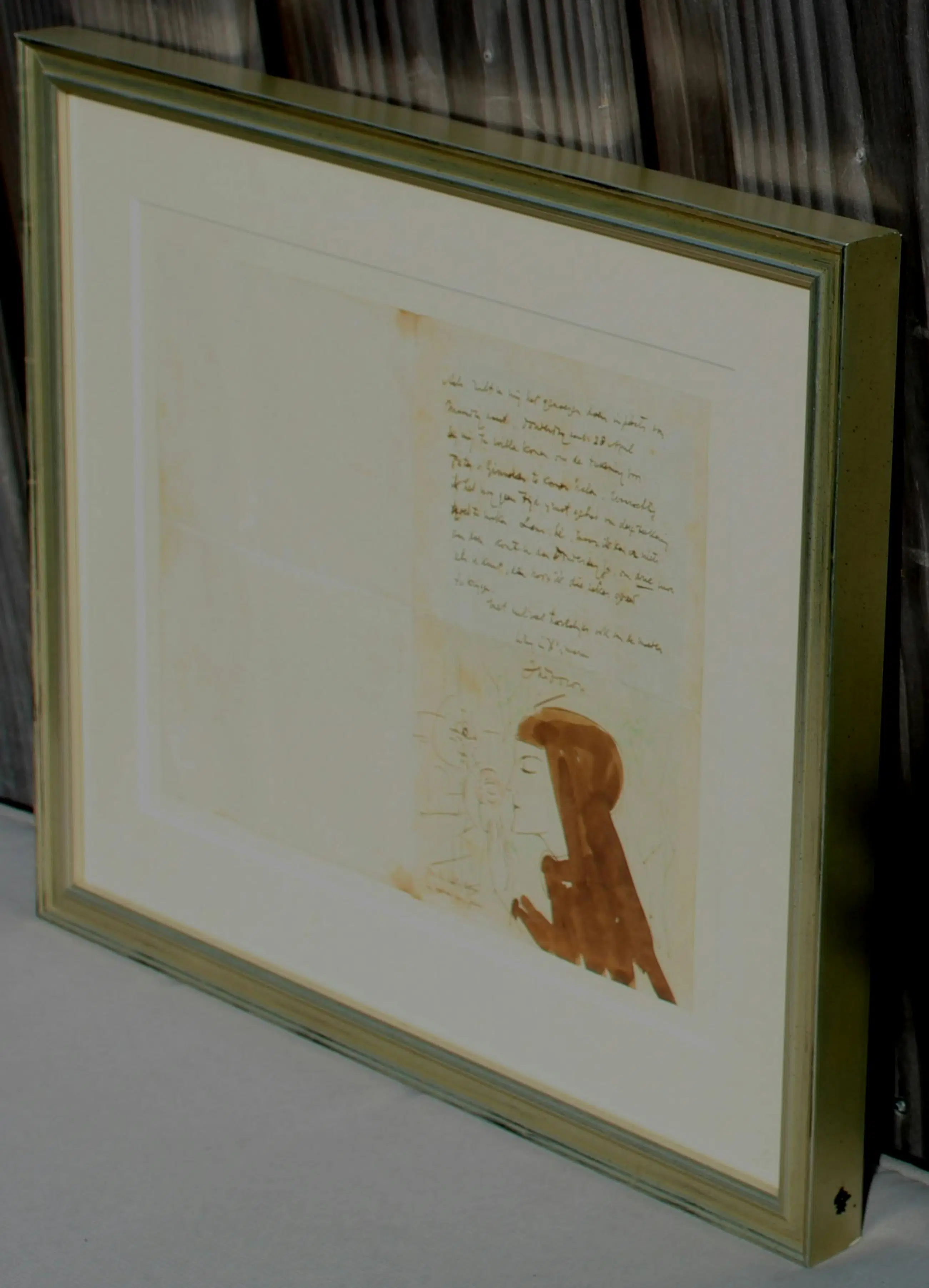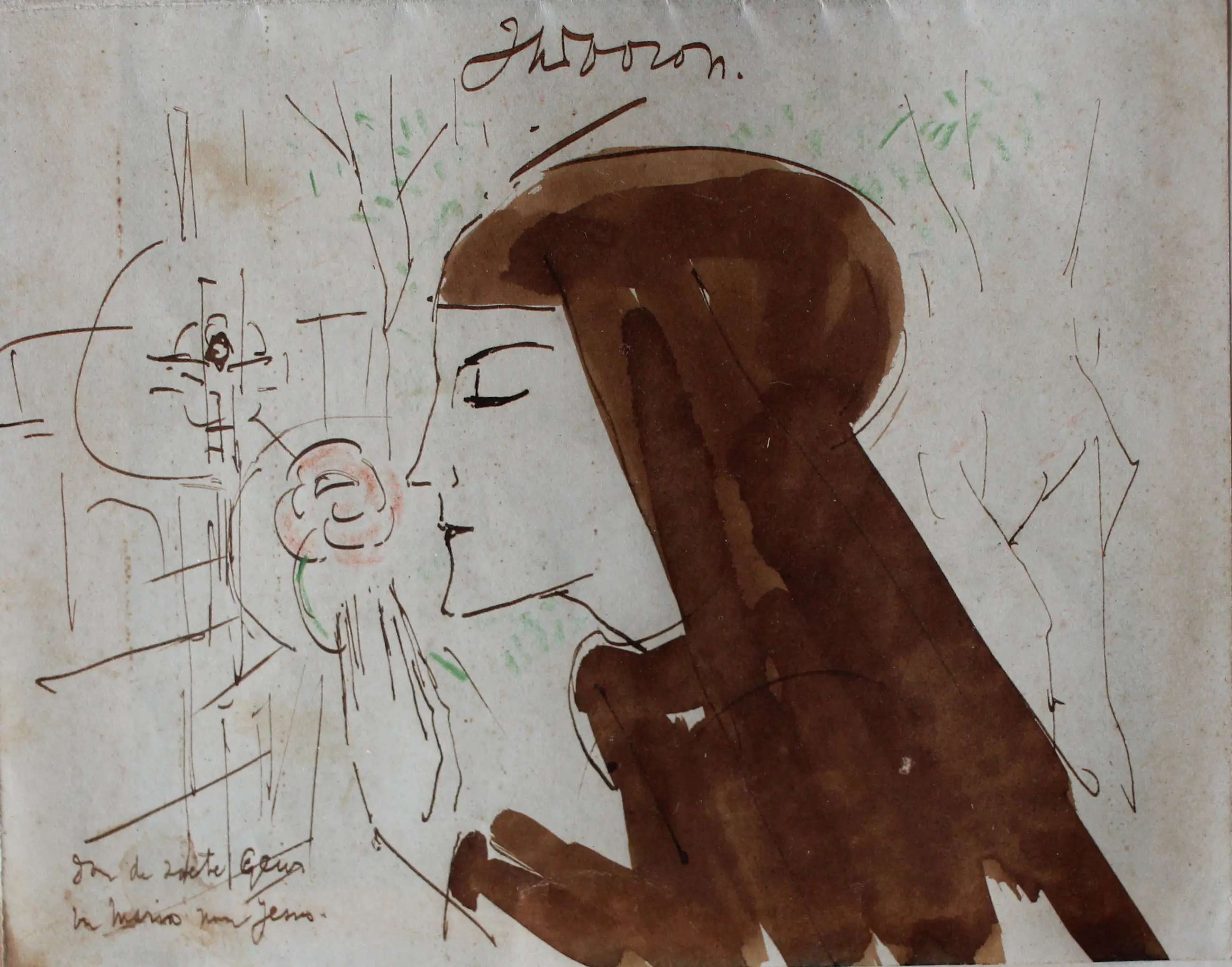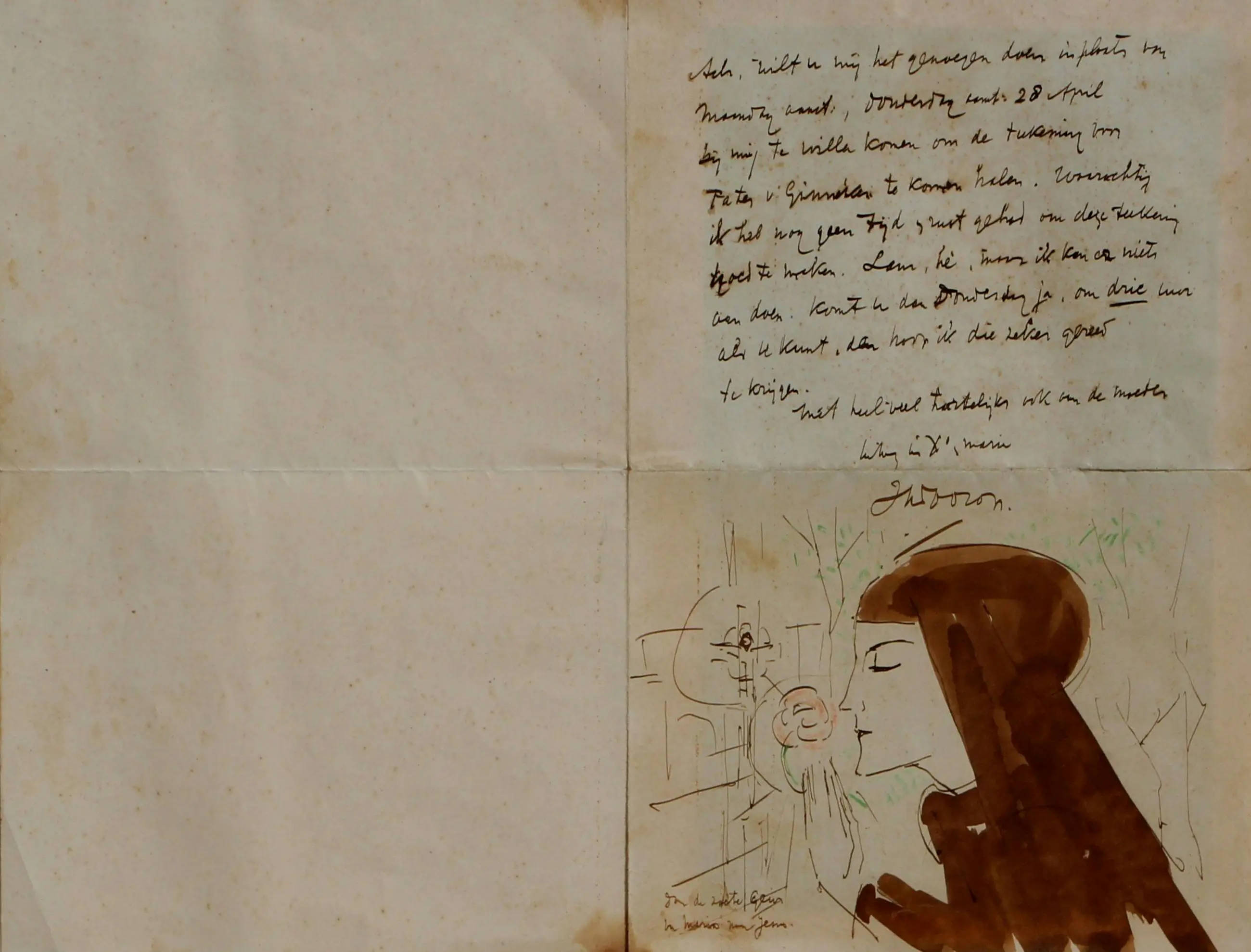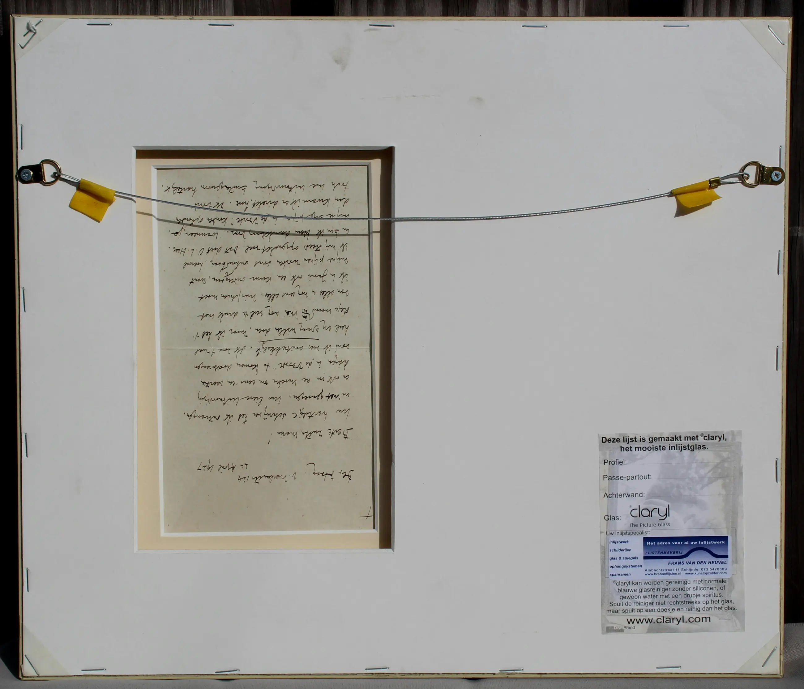 Ingelijste sepia tekening van Jan Toorop. Jaar: 22 april 1927. Onderaan de brief(aan beide zijden beschreven en gericht aan zuster Maria( heeft hij een originele sepiatekening gemaakt met de titel: "door de zoete geur van Maria voor Jezus". De ingelijste brief aan beide zijden zichtbaar. Afmetingen incl lijst: H34 x b40cm. Afmetingen voorstelling tekening: H13,5 x b10,7 cm. Gesigneerd boven de tekening door de kunstenaar. De authenticiteit van het aangeboden werk wordt volledig gegarandeerd. Een certificaat van echtheid kan, op aanvraag worden gemaild.