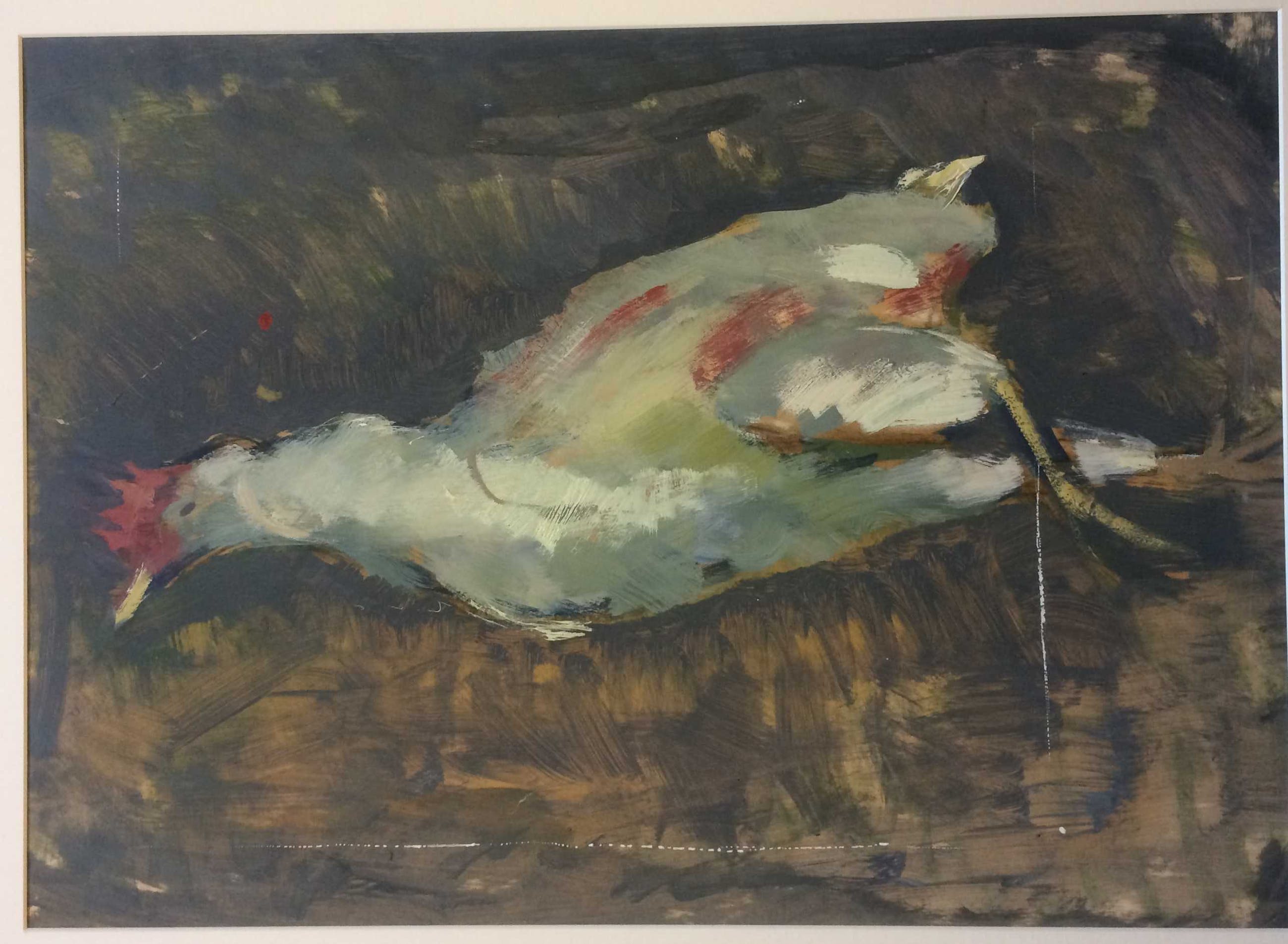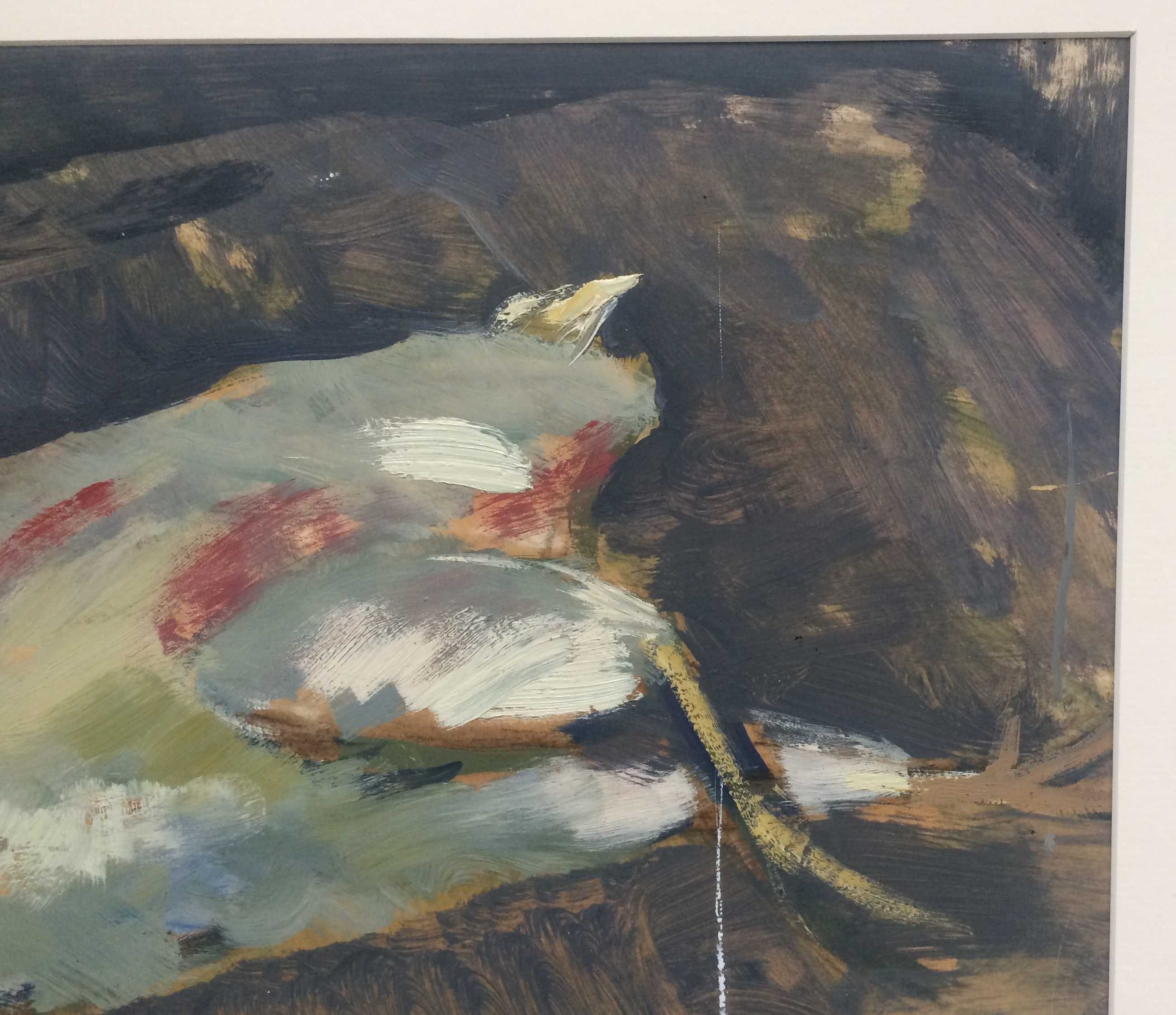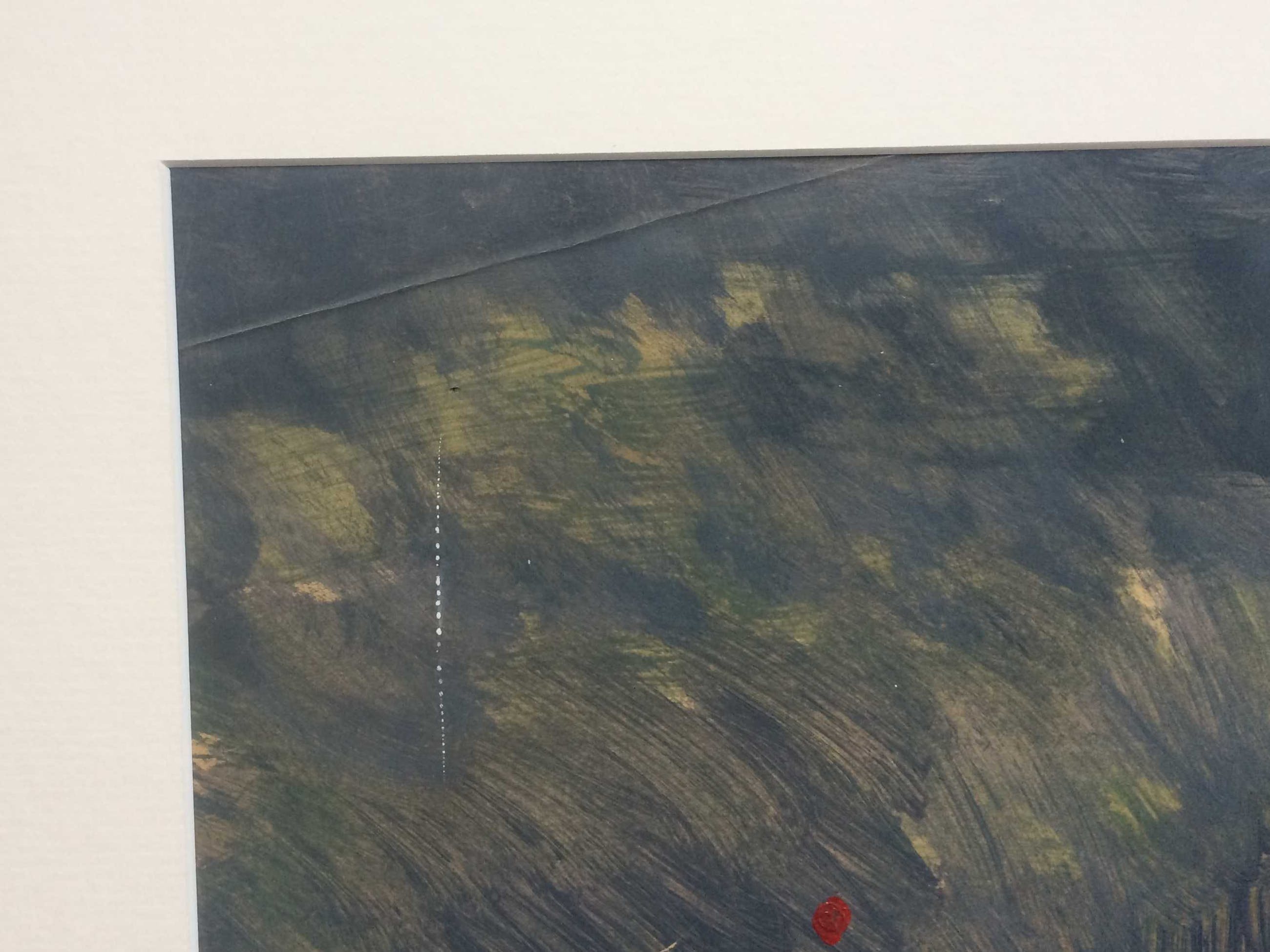 zijn werk: een vouwtje en een enkel gerepareerd scheurtje in het papier, niet storend. Witte verfstreep is afkomstig van een ander werk dat Tullemans er op heeft gelegd terwijl het nog nat was..