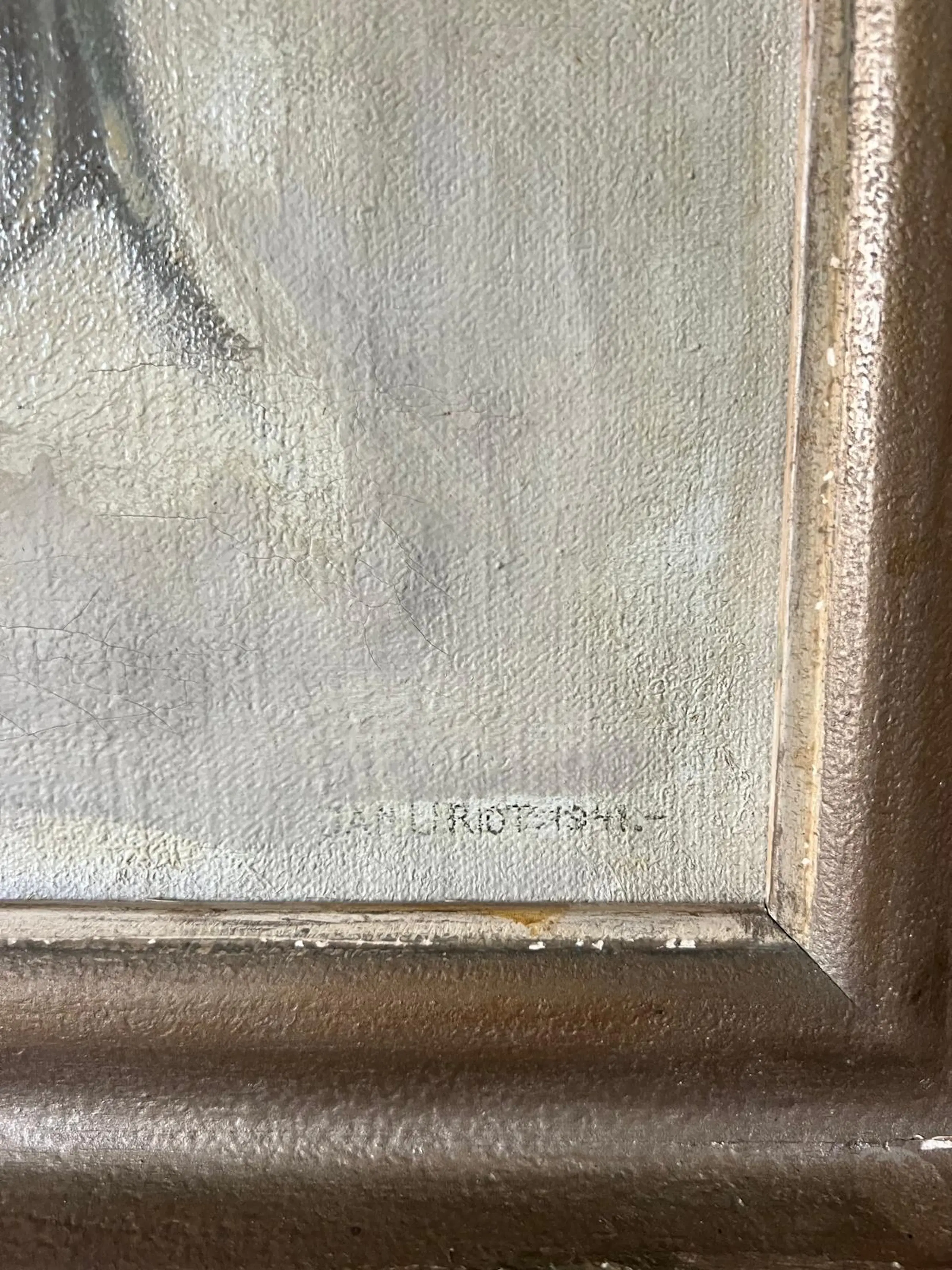 Door leeftijd lichte vervuiling op doek, lijst beschadigd.